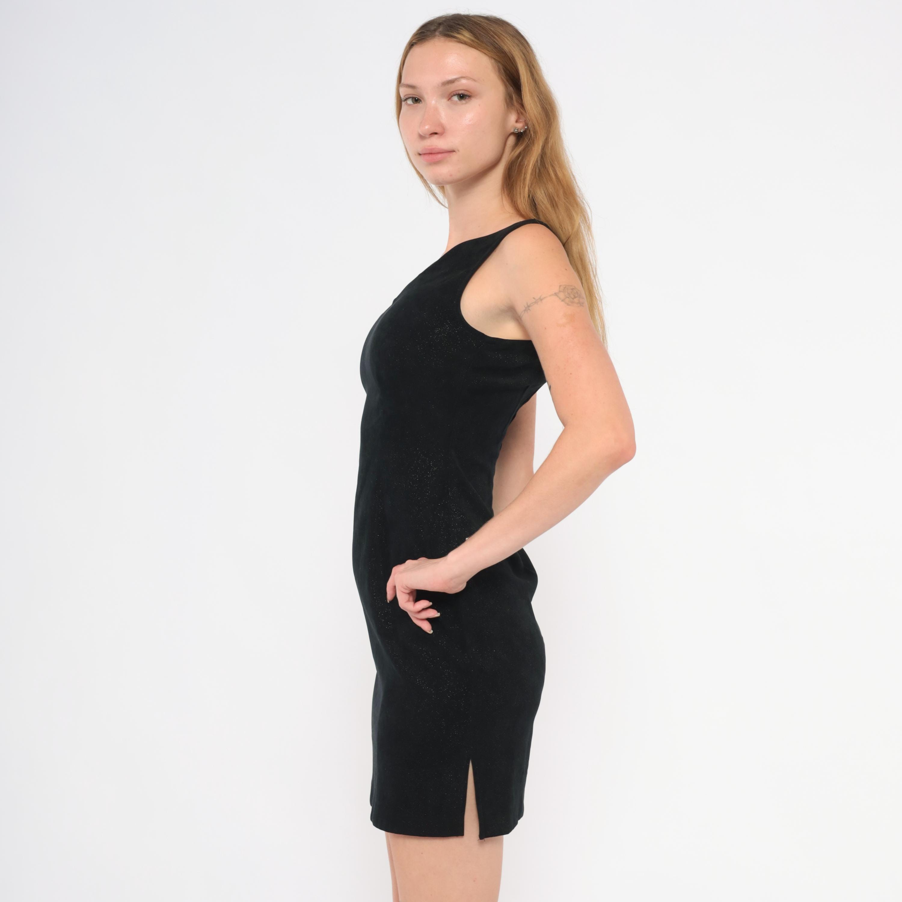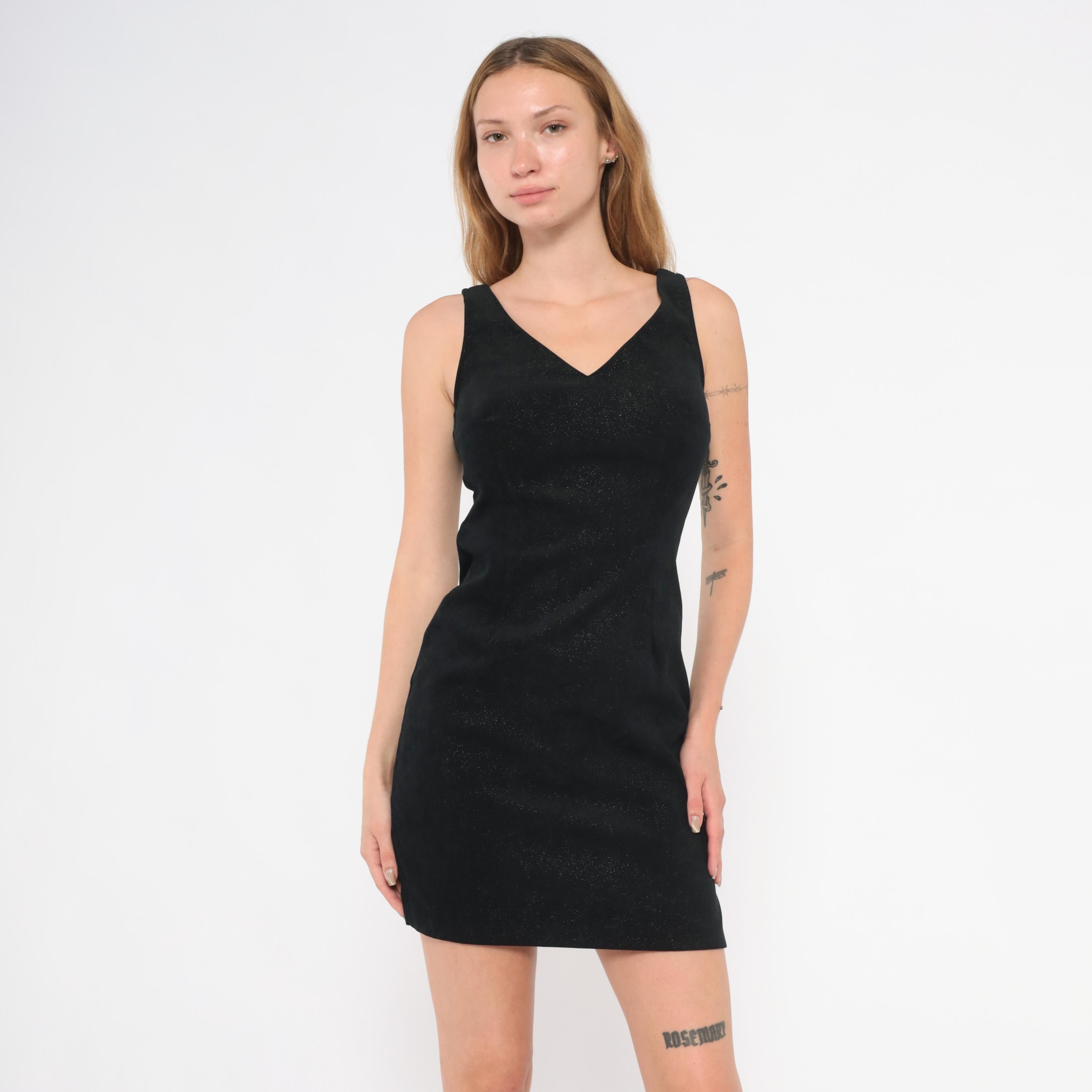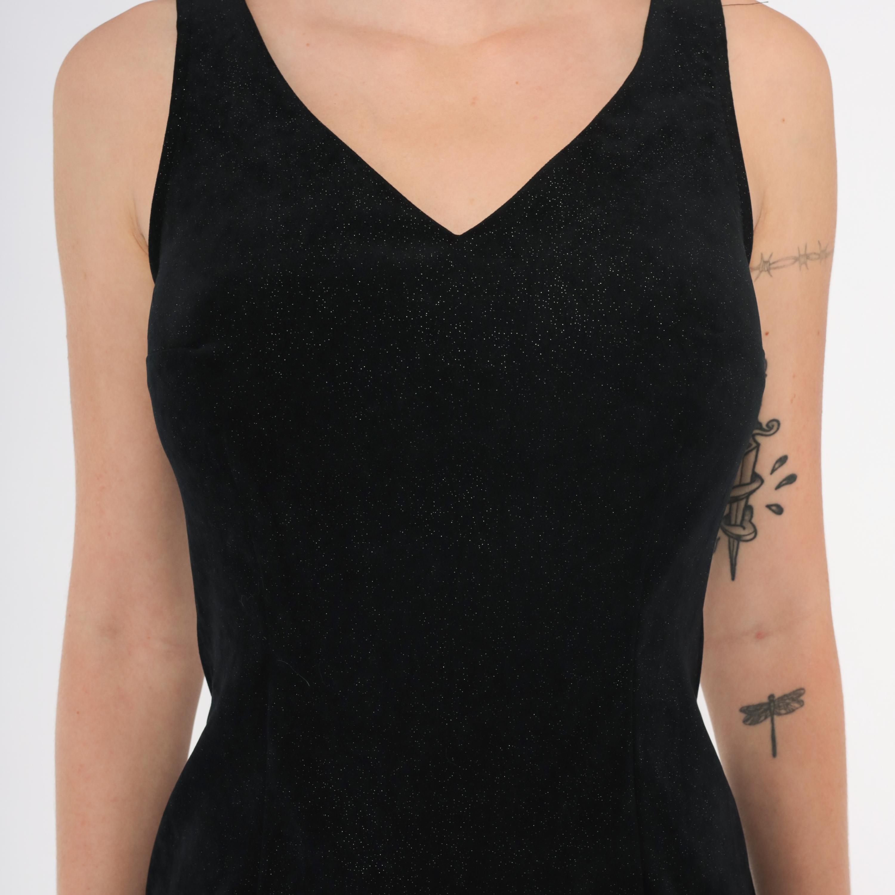 90s black glitter mini dress from Splurge with a V-neckline on both front and back, wide shoulder straps, and a fitted sheath silhouette. Subtle sparkle embedded throughout the fabric catches light across the entire surface. Back zipper closure and small side slits at the hem.