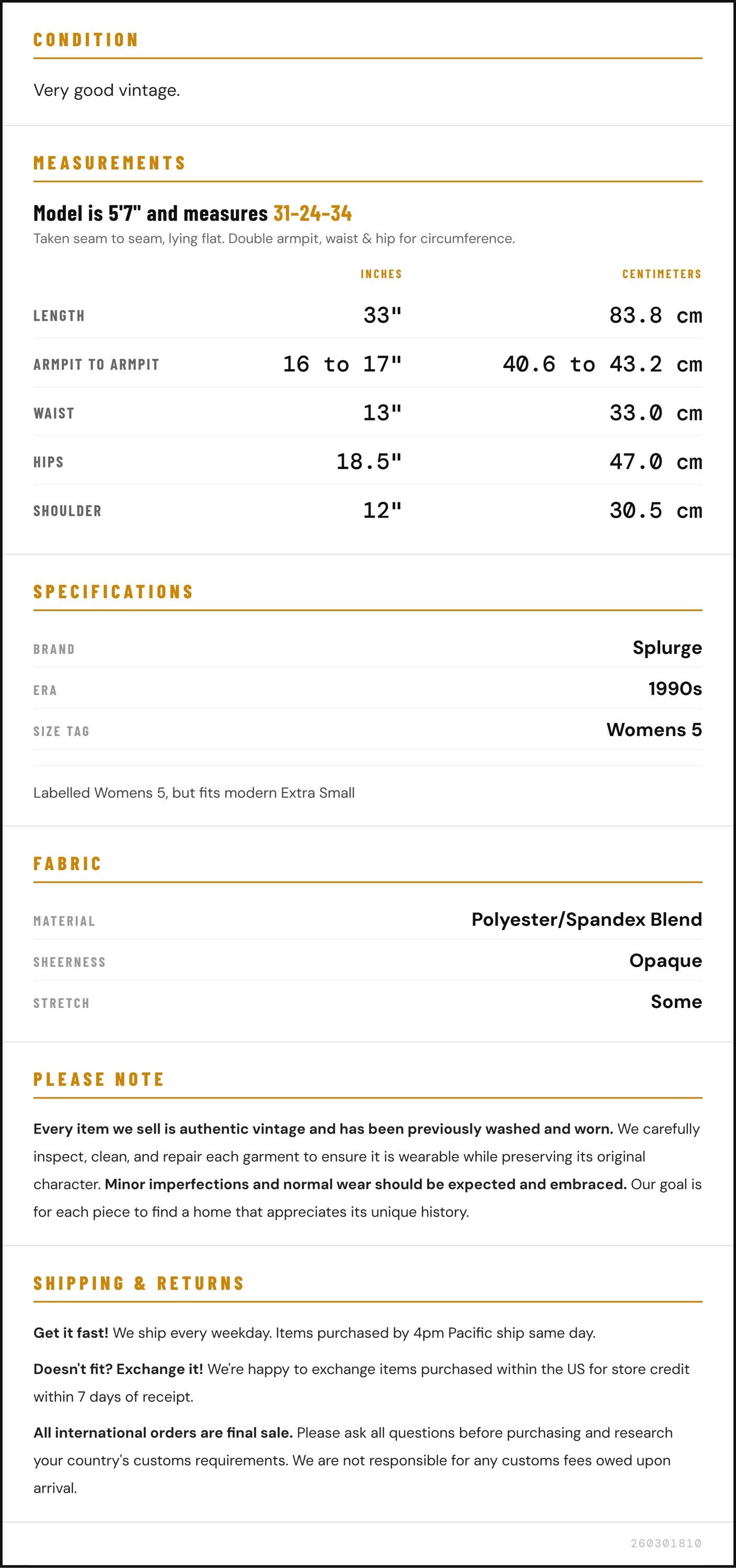 Vintage denim was usually made without any stretch, unlike modern jeans. Check the measurements to ensure proper fit, and remember to give yourself a little wiggle room in the waist and hips, depending on your preferred fit.