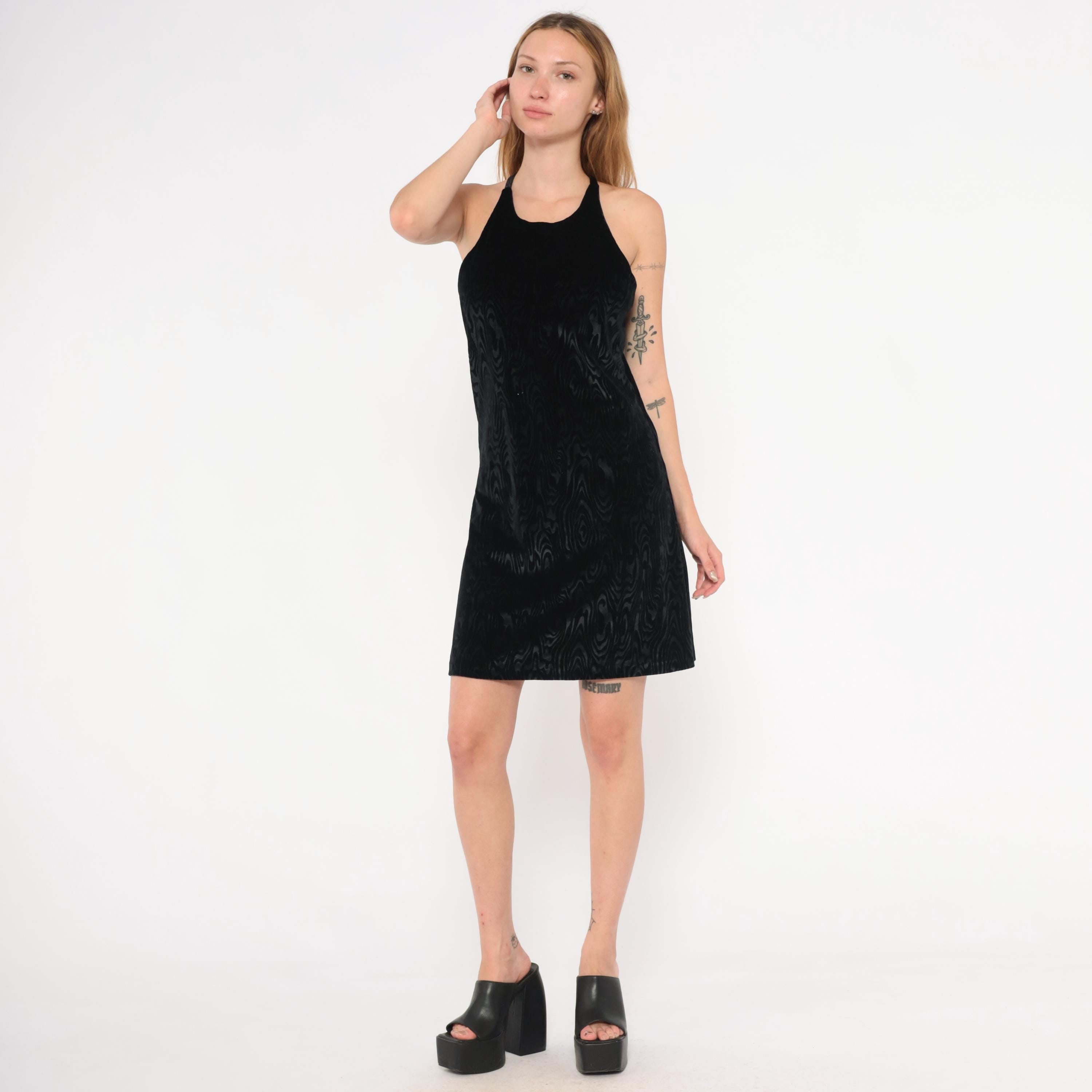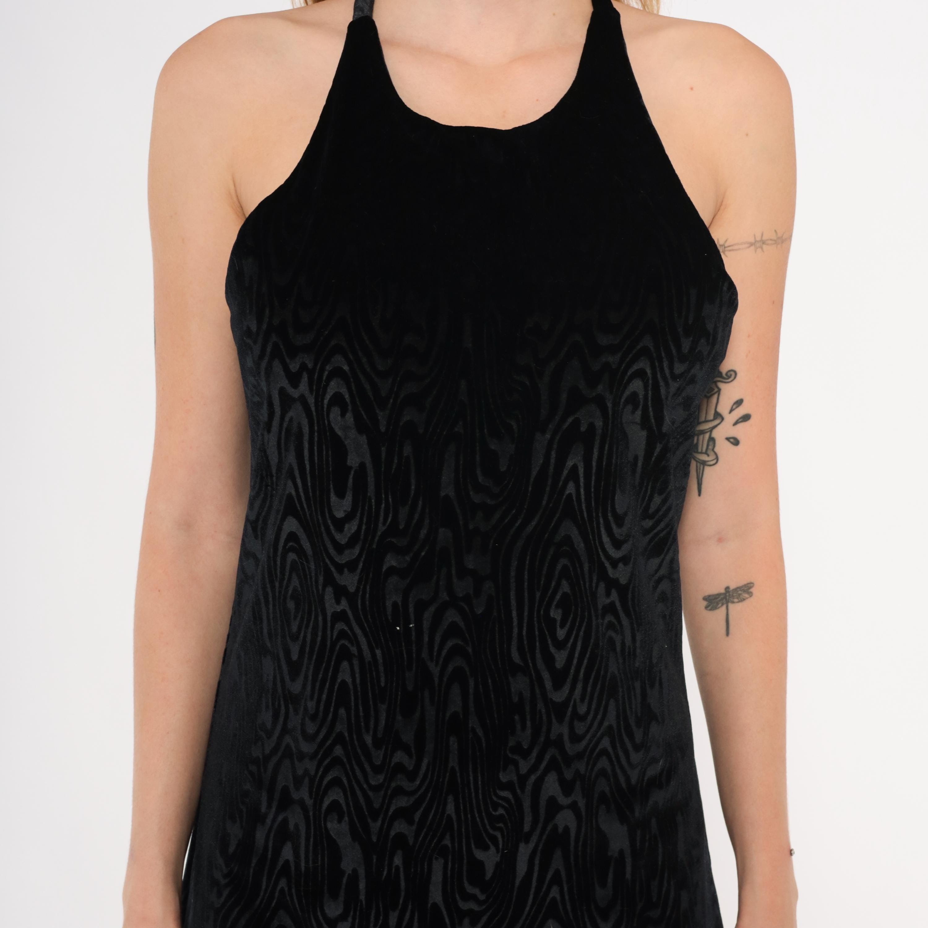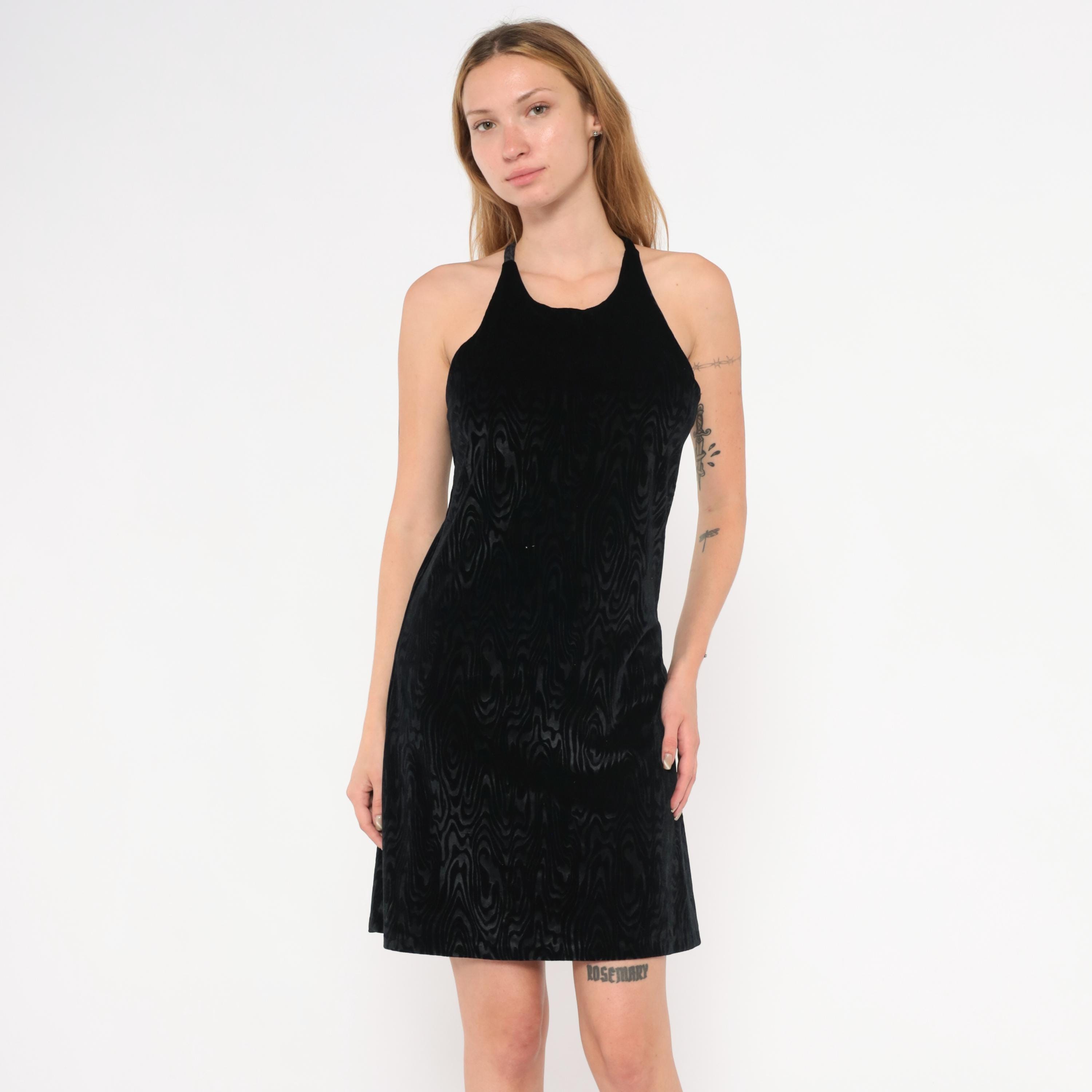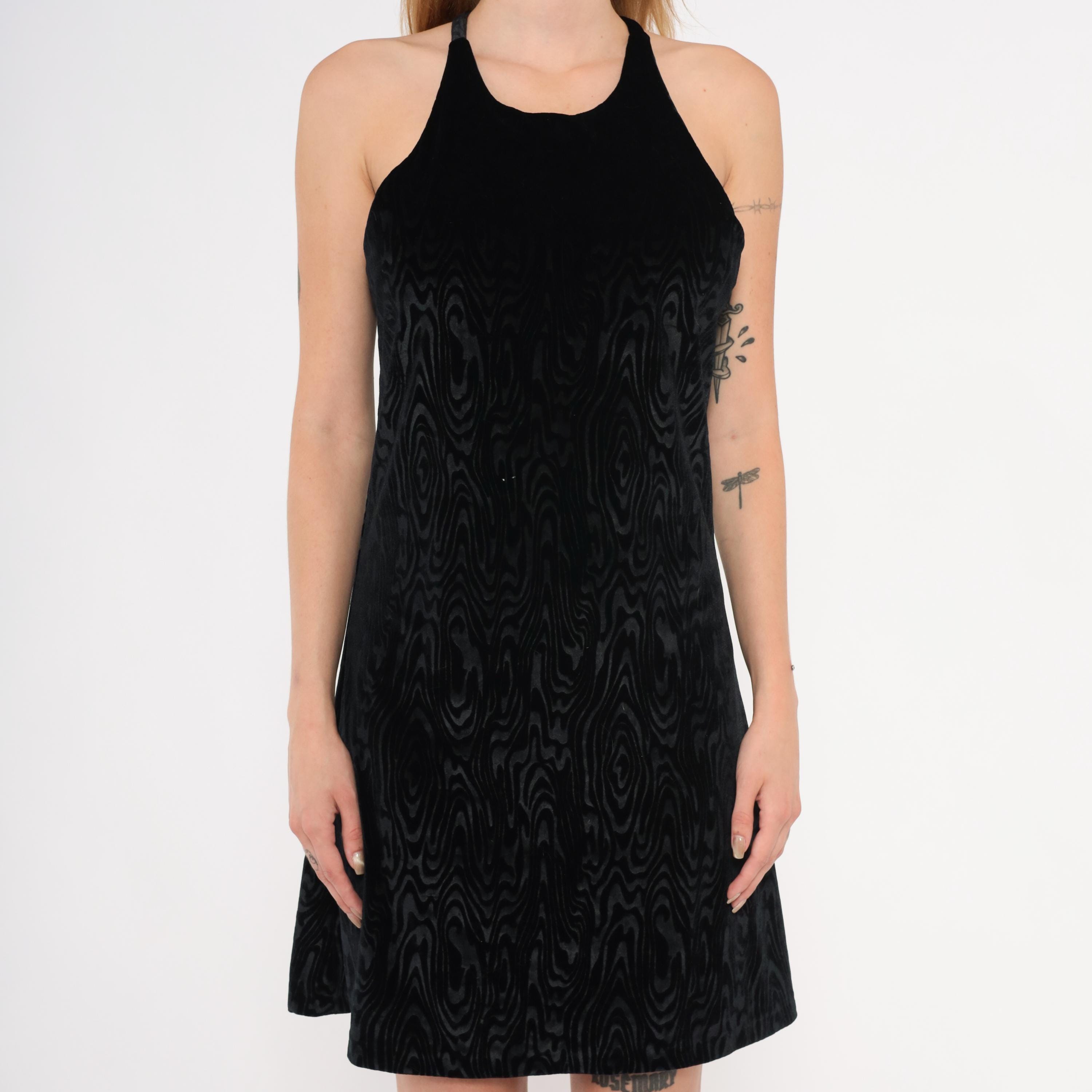 Black velvet halter dress from the 90s by Mimosa with a moiré swirl pattern across the fabric. Scoop neckline with crossback straps and a pullover closure. Fitted through the bust and waist with a slight A-line flare through the skirt, hitting above the knee.