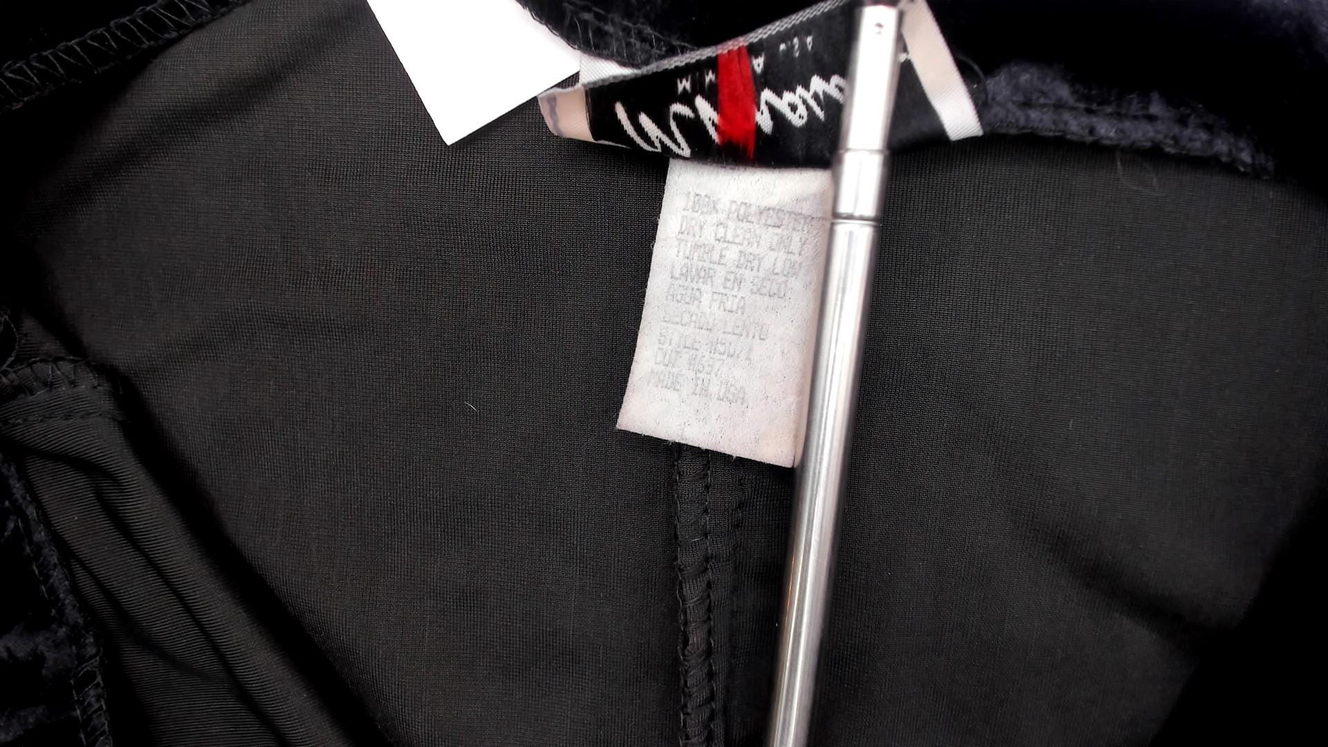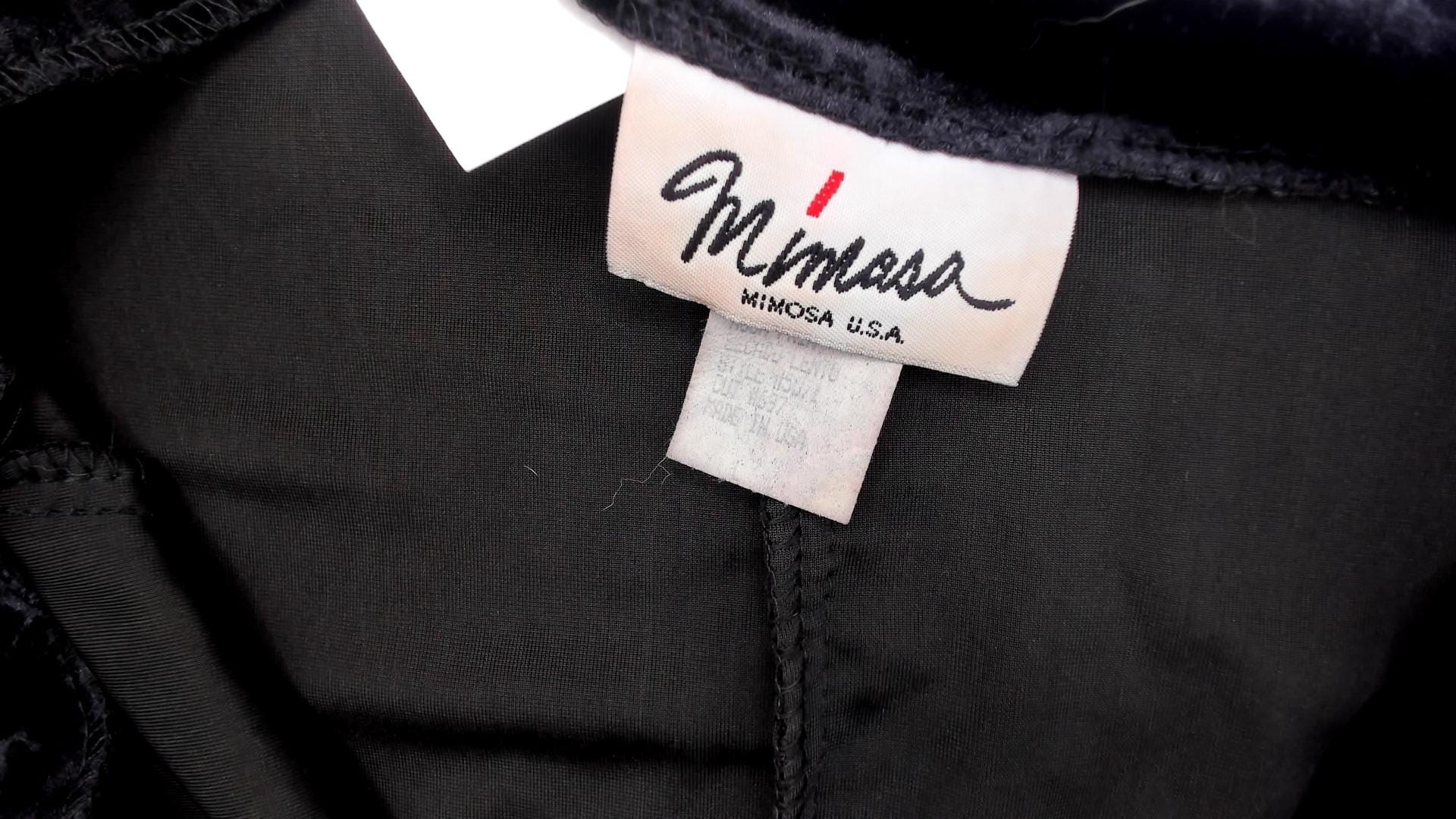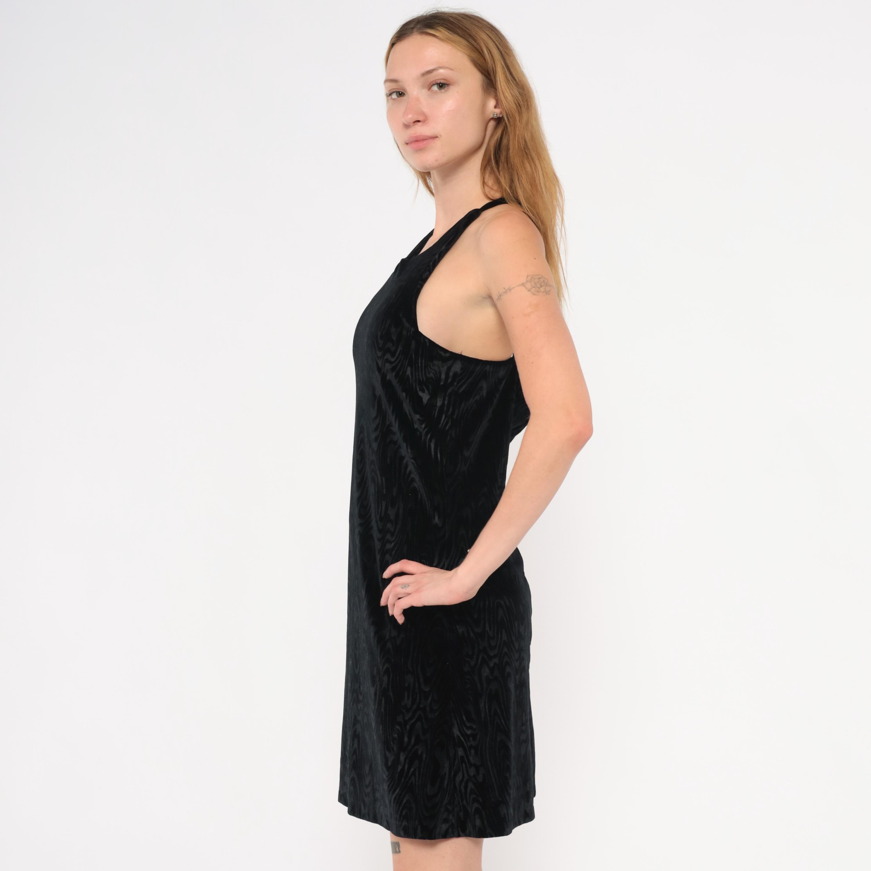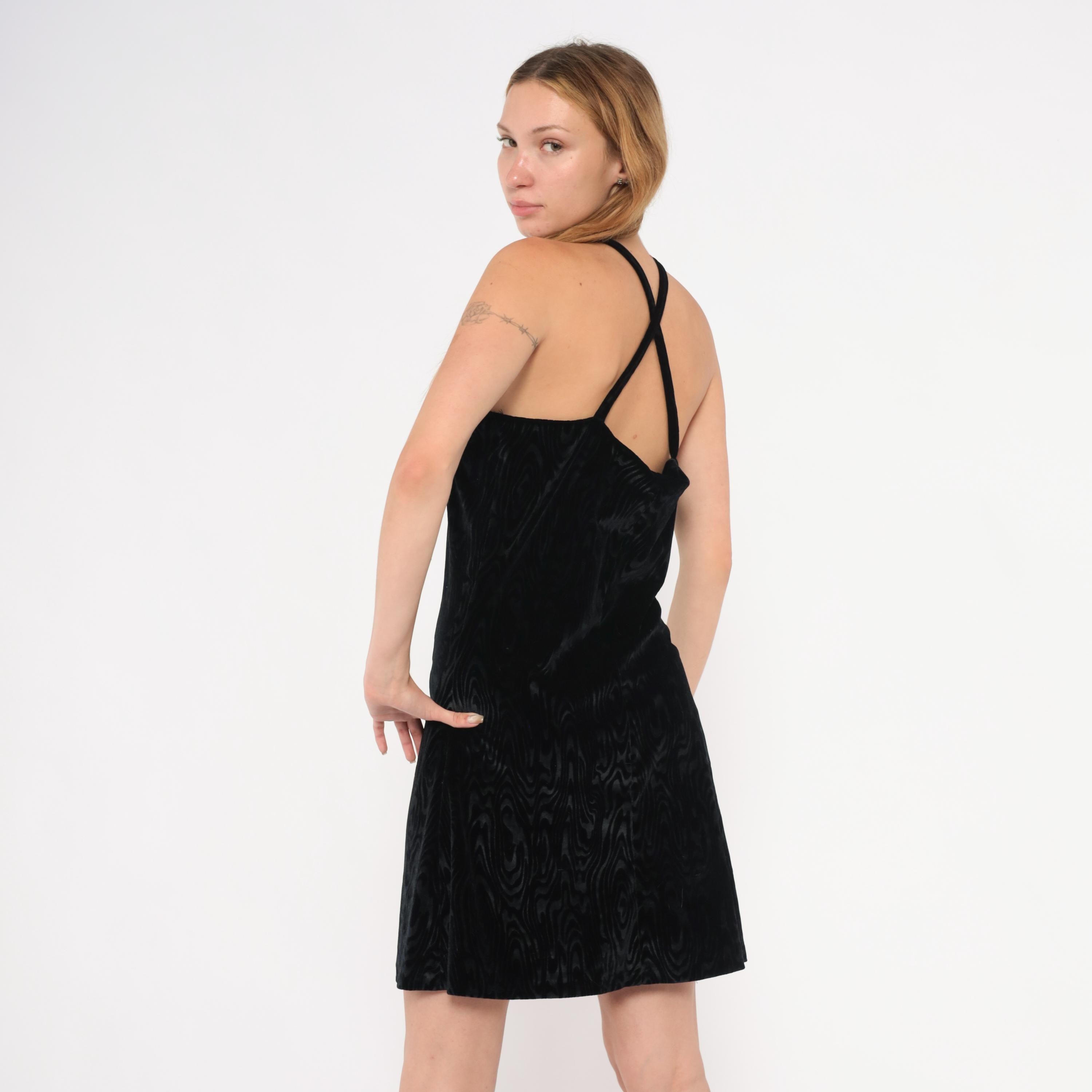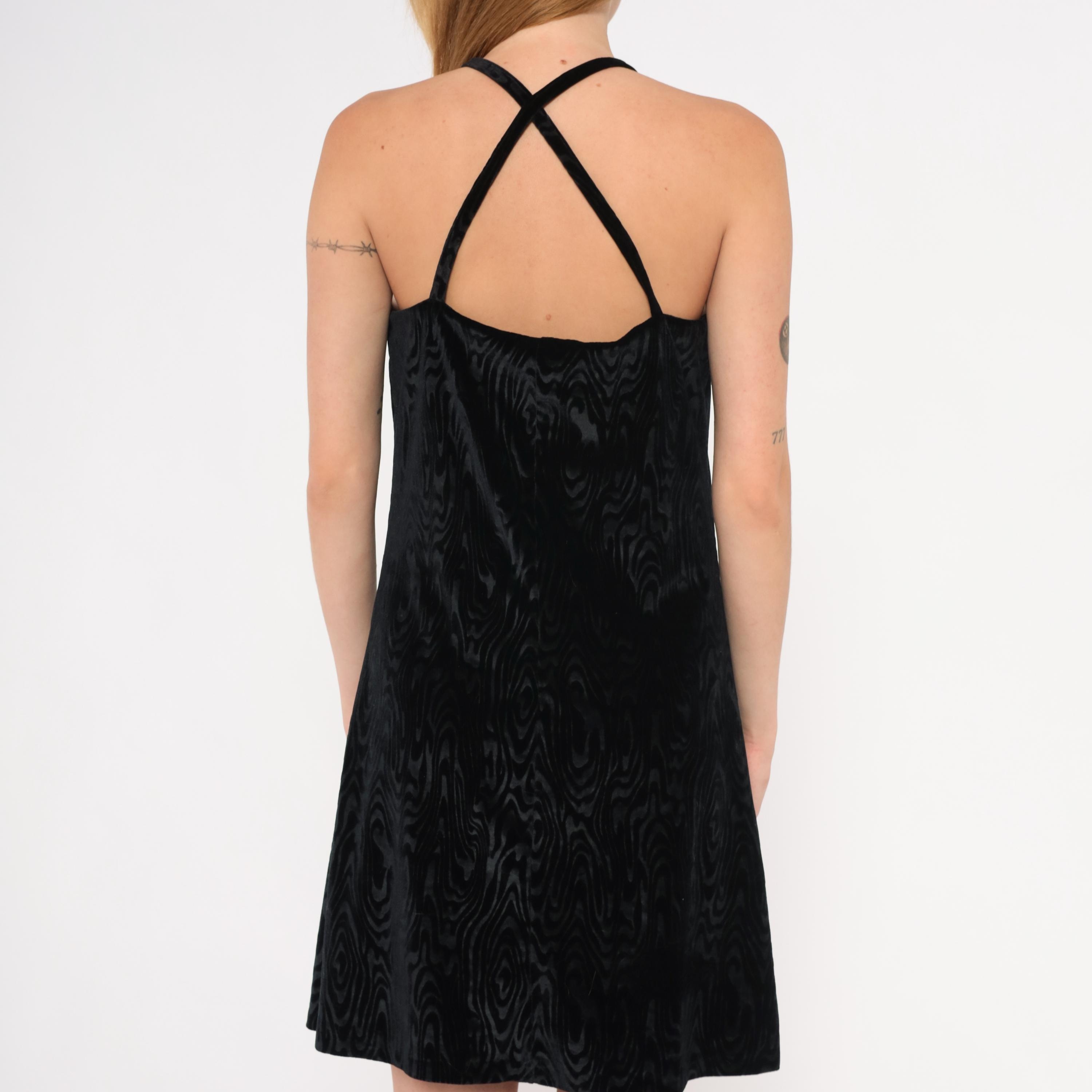 Black velvet halter dress from the 90s by Mimosa with a moiré swirl pattern across the fabric. Scoop neckline with crossback straps and a pullover closure. Fitted through the bust and waist with a slight A-line flare through the skirt, hitting above the knee.