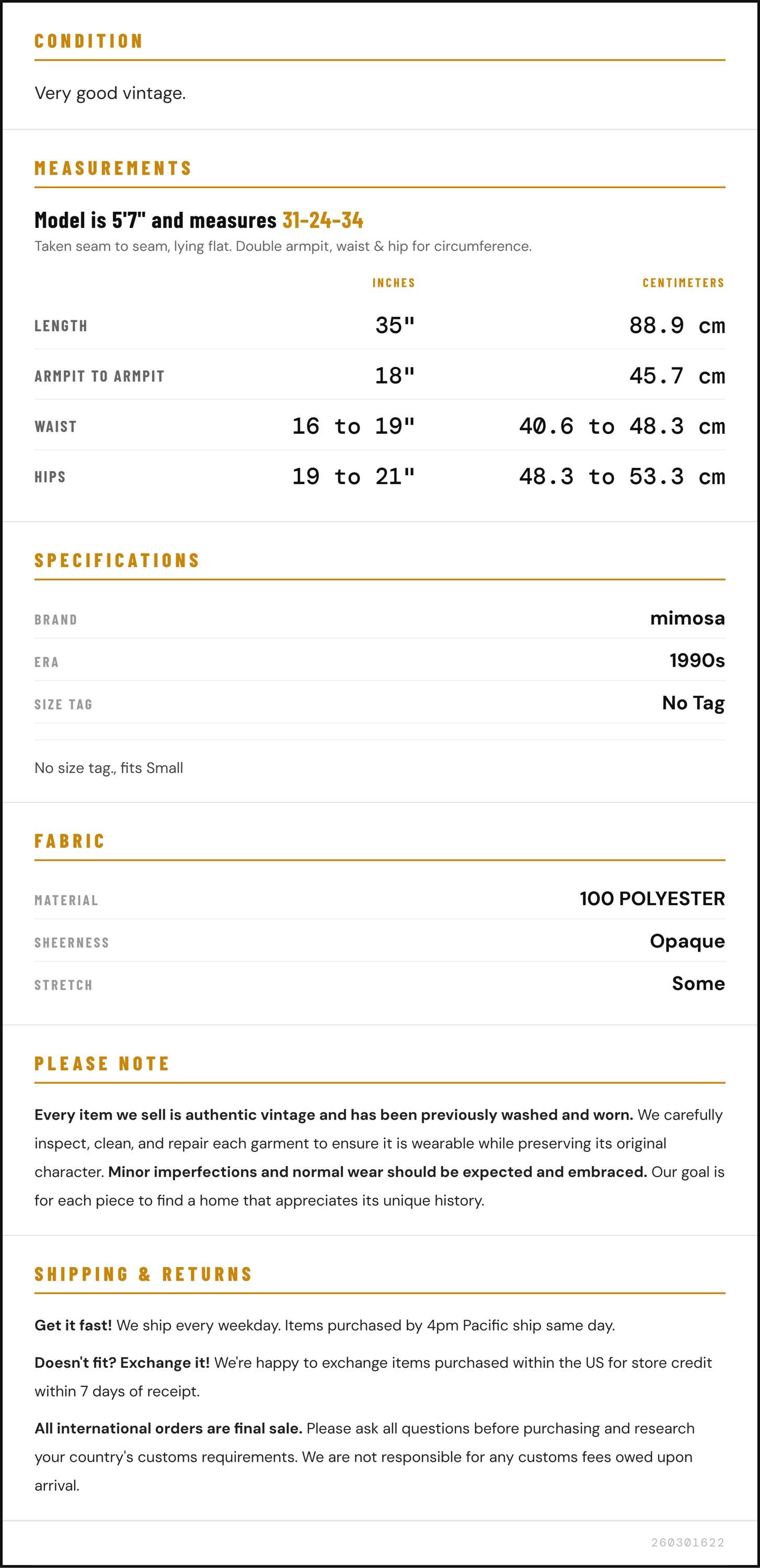 Vintage denim was usually made without any stretch, unlike modern jeans. Check the measurements to ensure proper fit, and remember to give yourself a little wiggle room in the waist and hips, depending on your preferred fit.