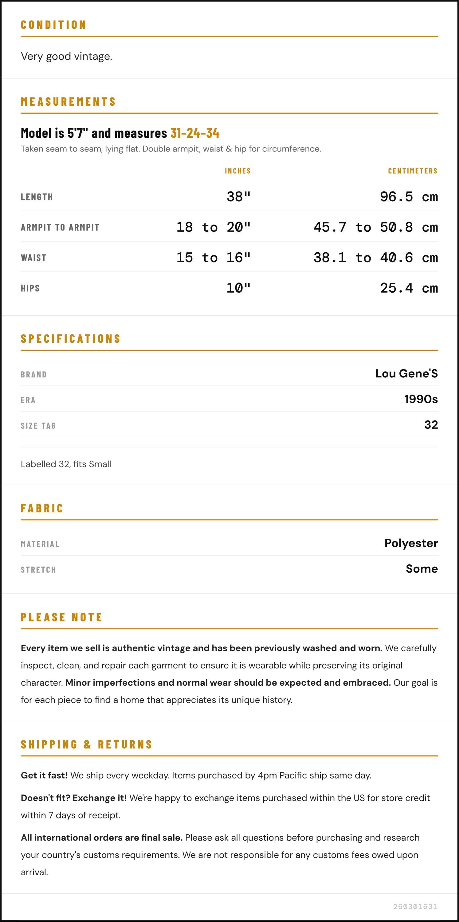 Vintage denim was usually made without any stretch, unlike modern jeans. Check the measurements to ensure proper fit, and remember to give yourself a little wiggle room in the waist and hips, depending on your preferred fit.