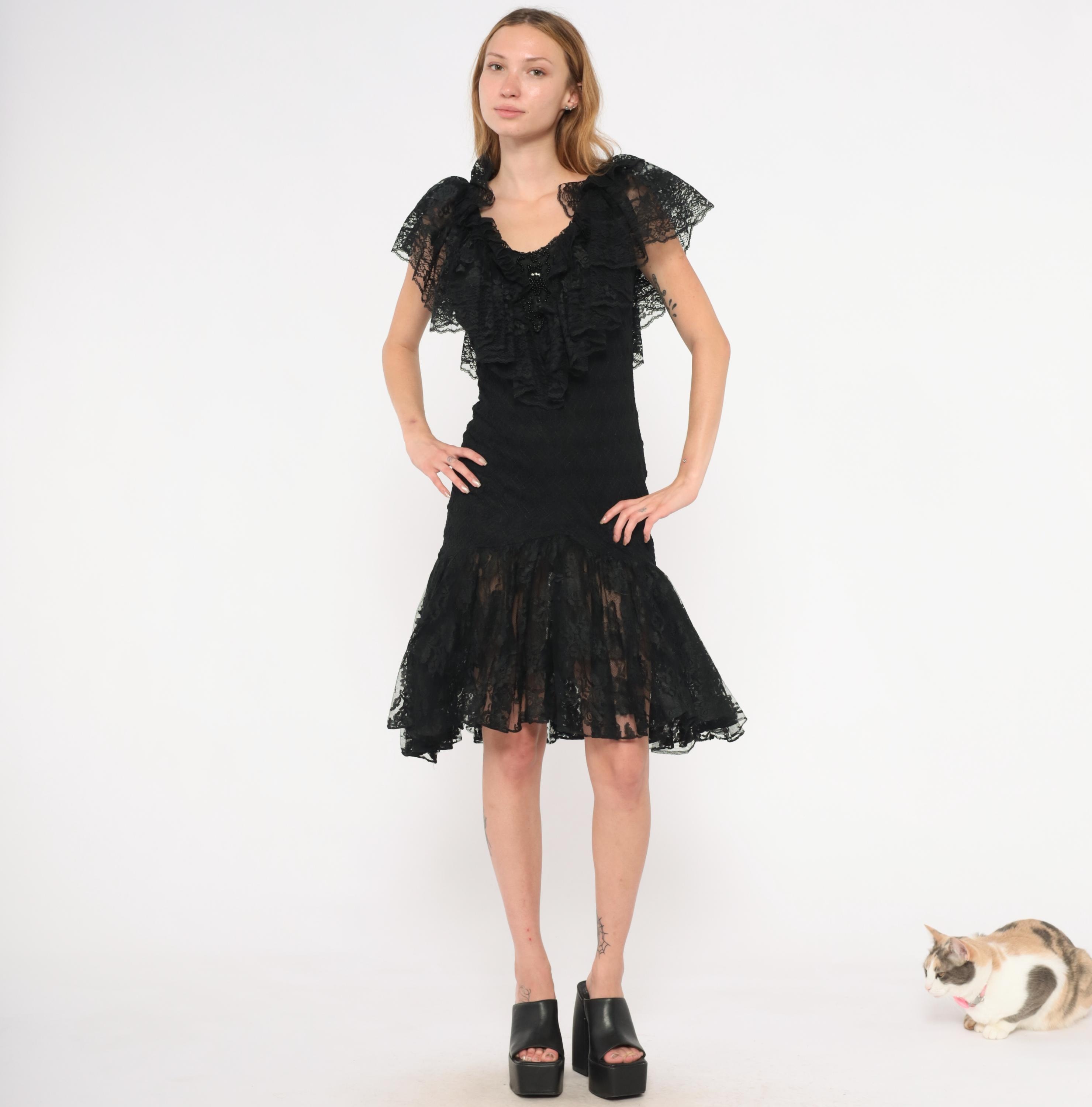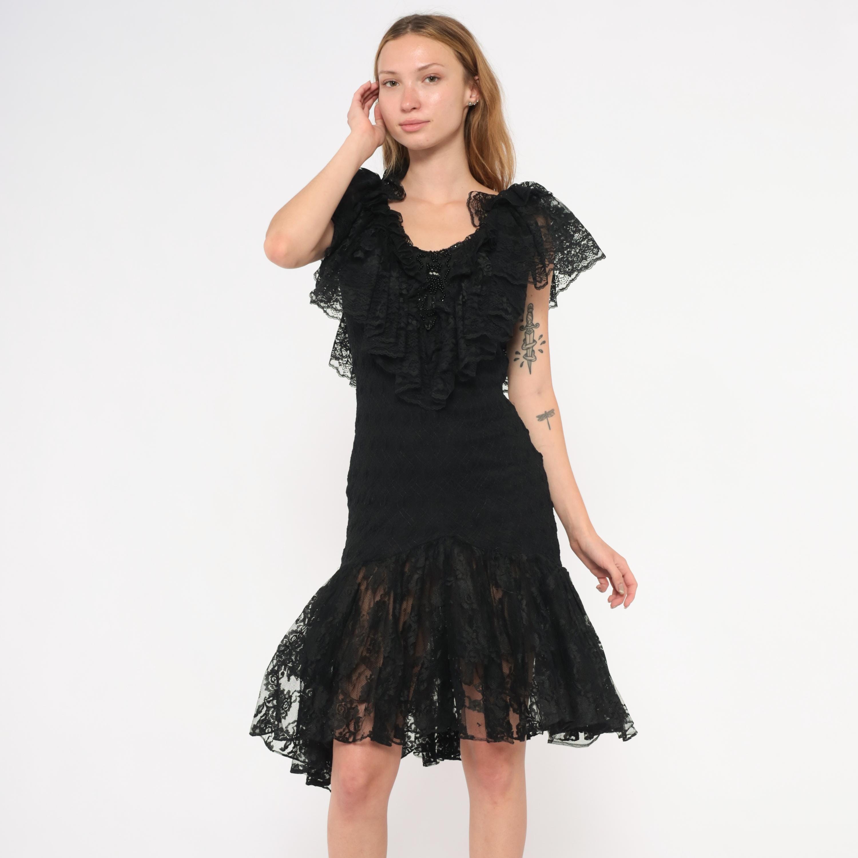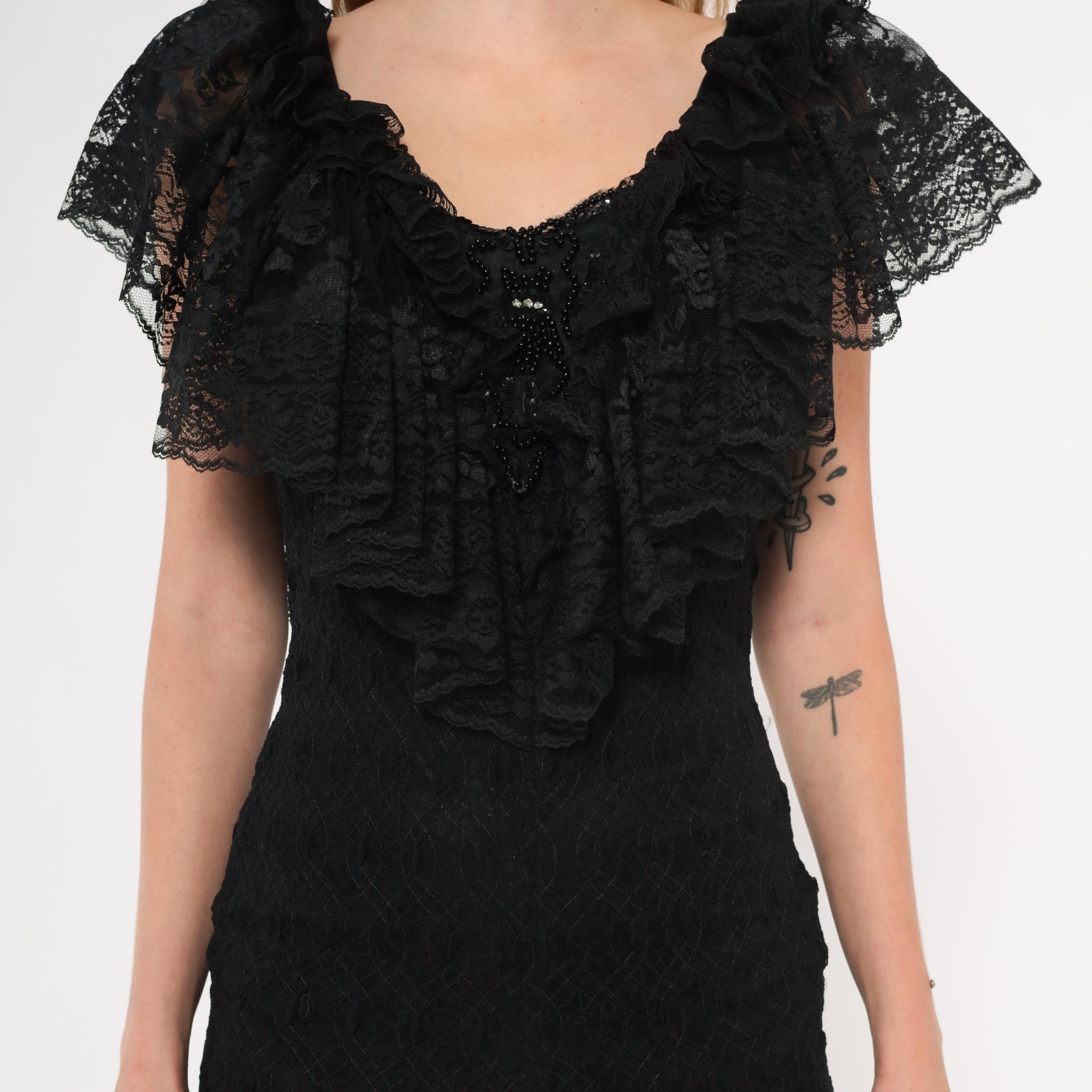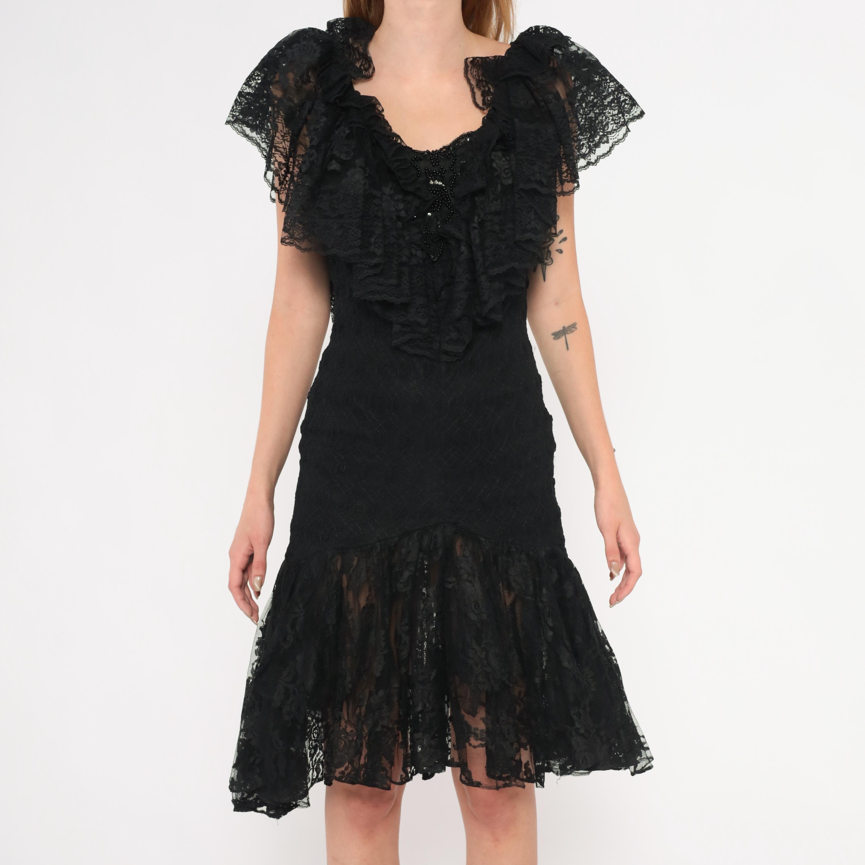 90s black lace dress from Lou Gene's with layered ruffled neckline, flutter cap sleeves, and beaded appliqué at the center front bodice. Fitted through the torso with a dropped waist and flared sheer lace flounce at the knee-length hem. Open V-back with narrow tie closure and back zipper.