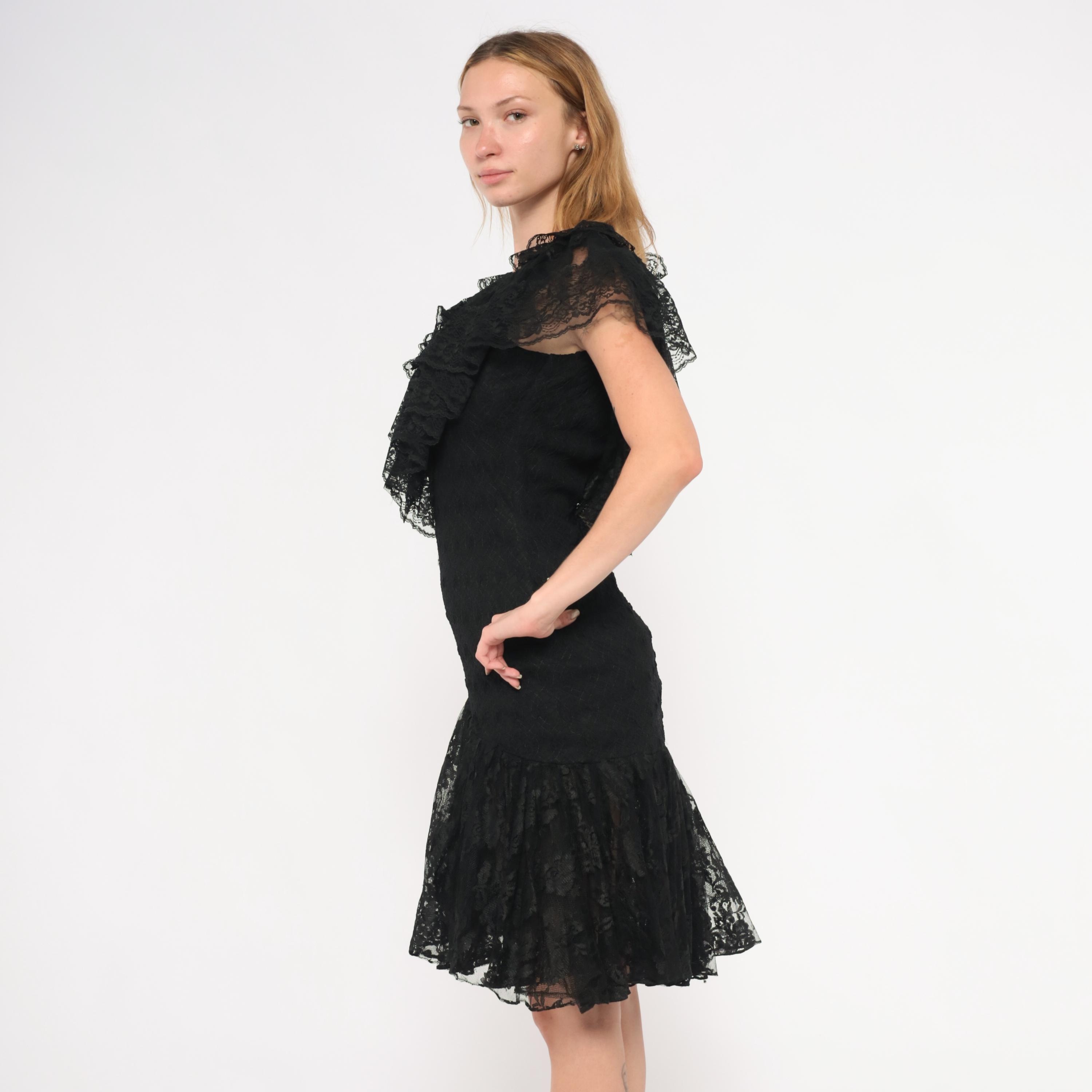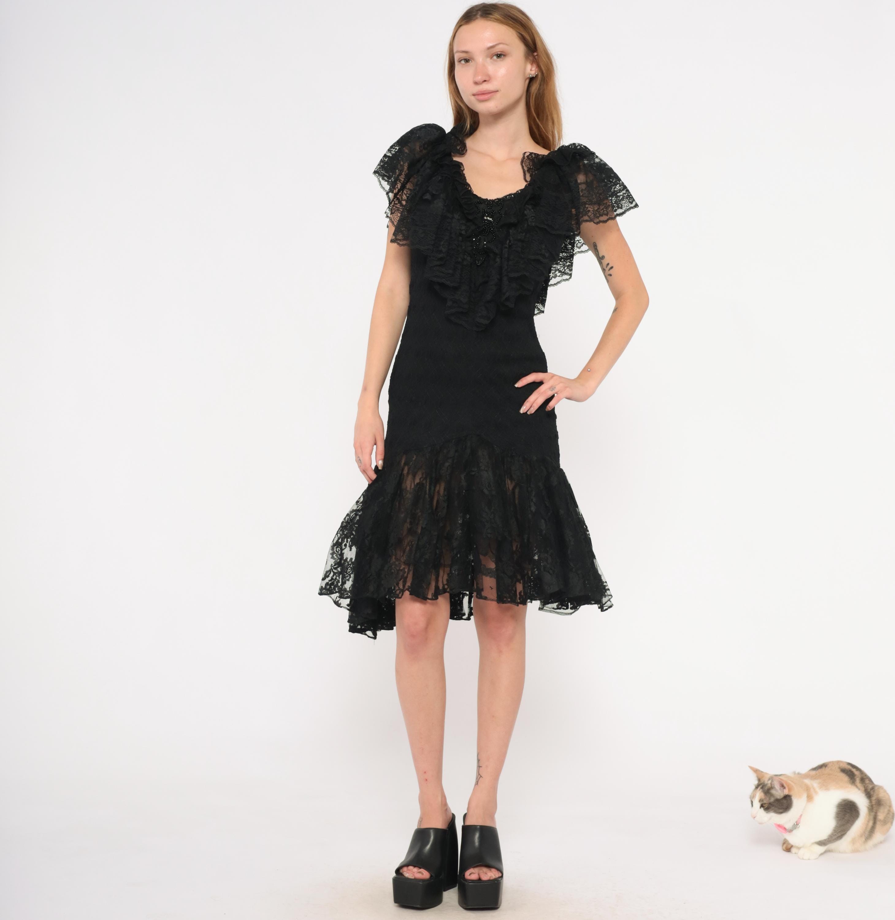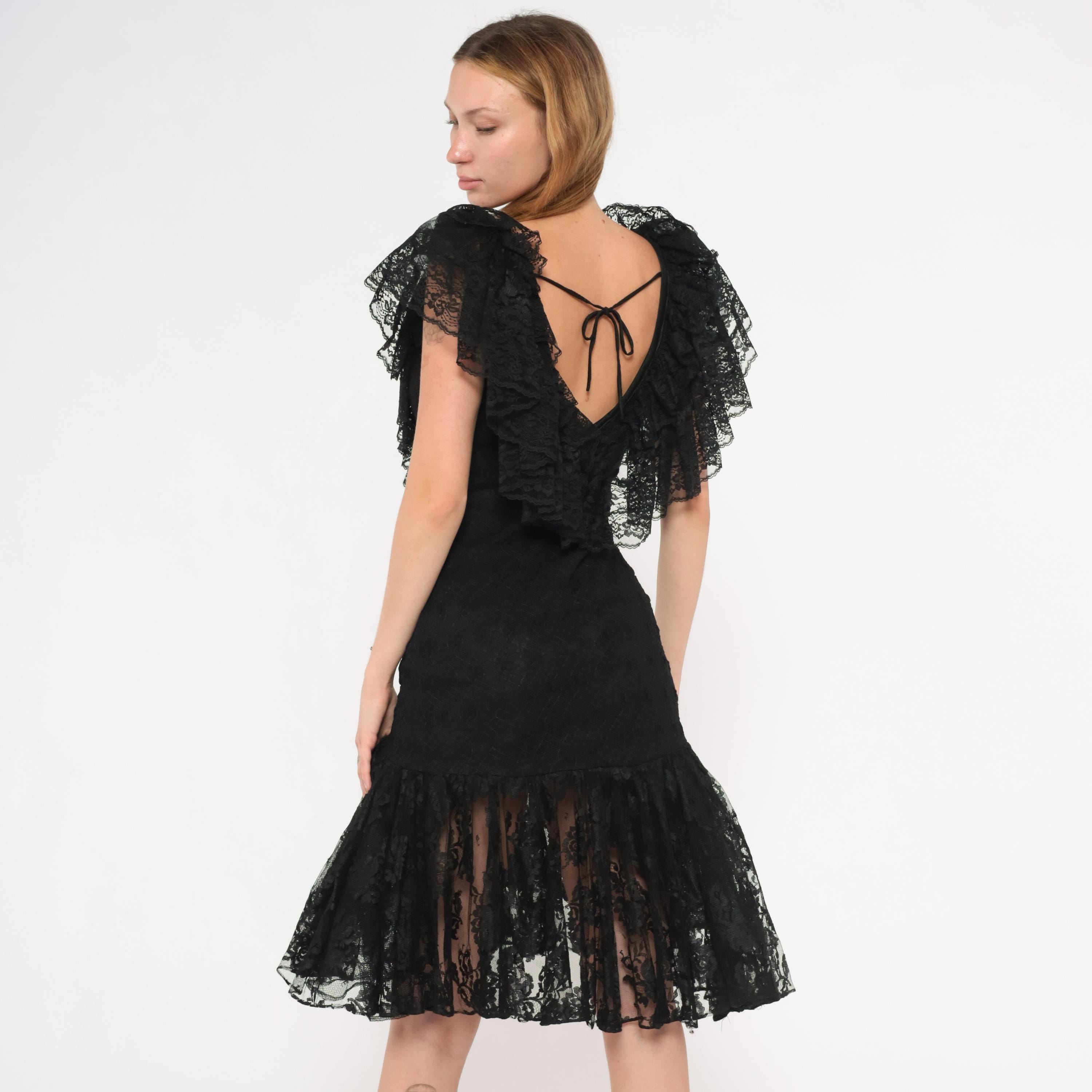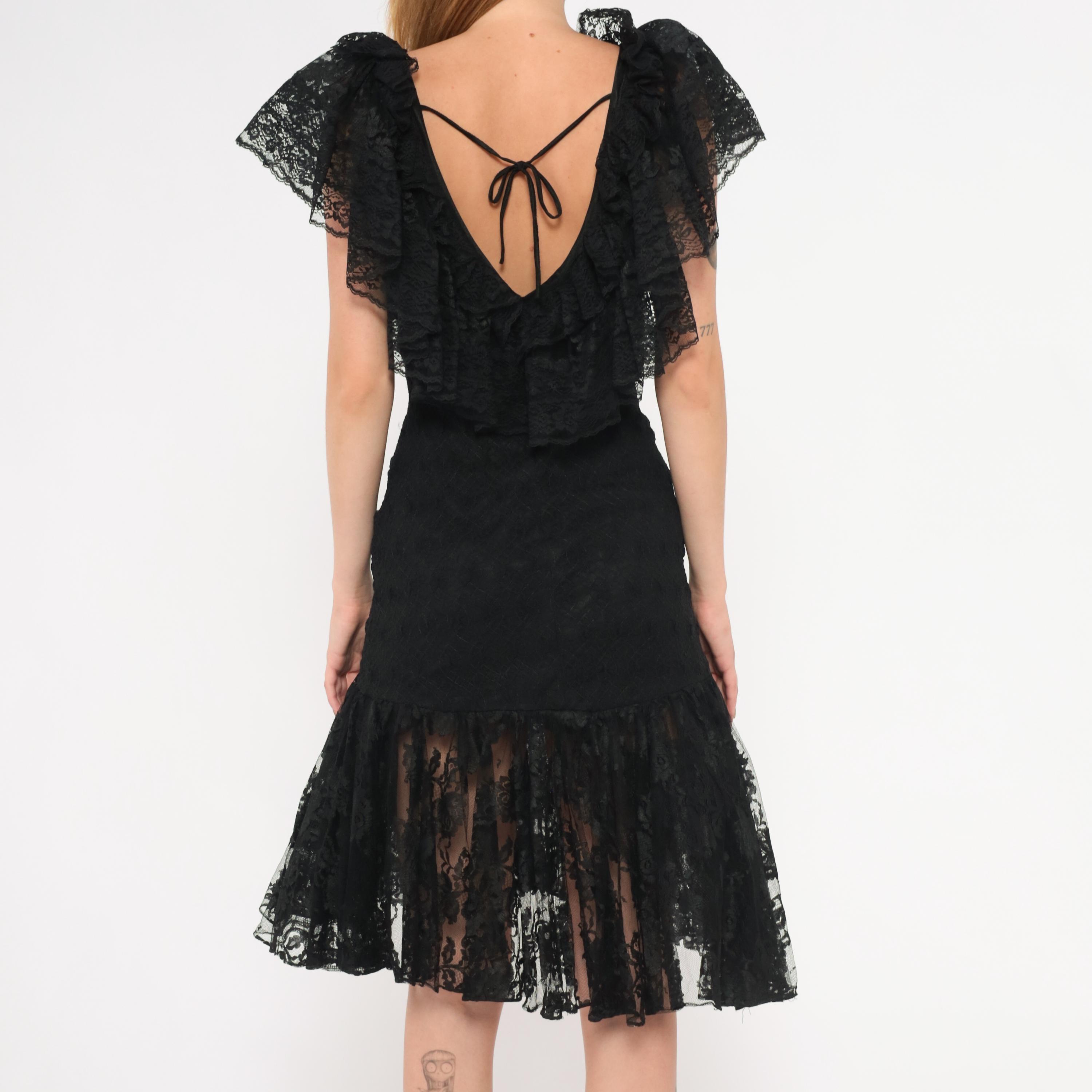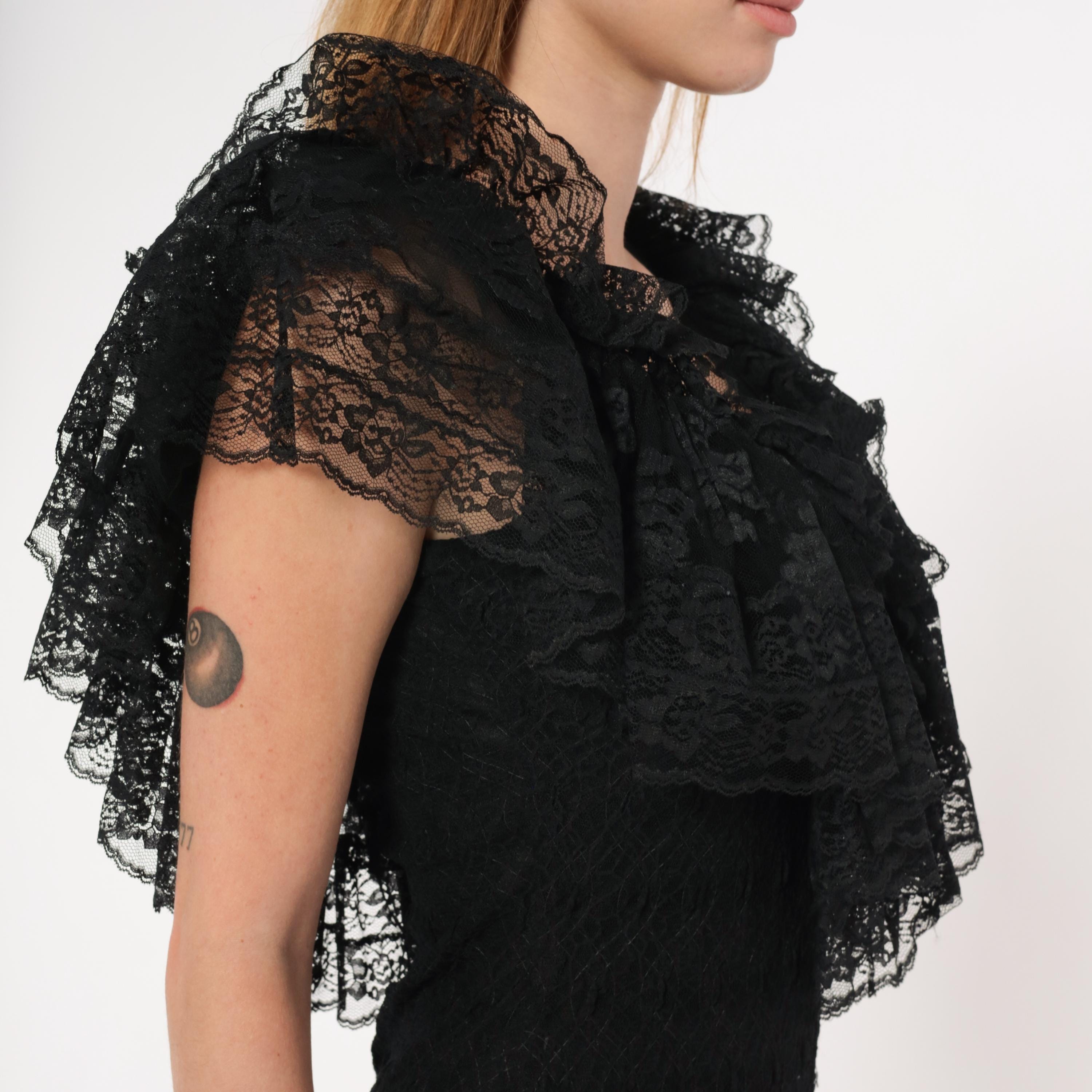 90s black lace dress from Lou Gene's with layered ruffled neckline, flutter cap sleeves, and beaded appliqué at the center front bodice. Fitted through the torso with a dropped waist and flared sheer lace flounce at the knee-length hem. Open V-back with narrow tie closure and back zipper.