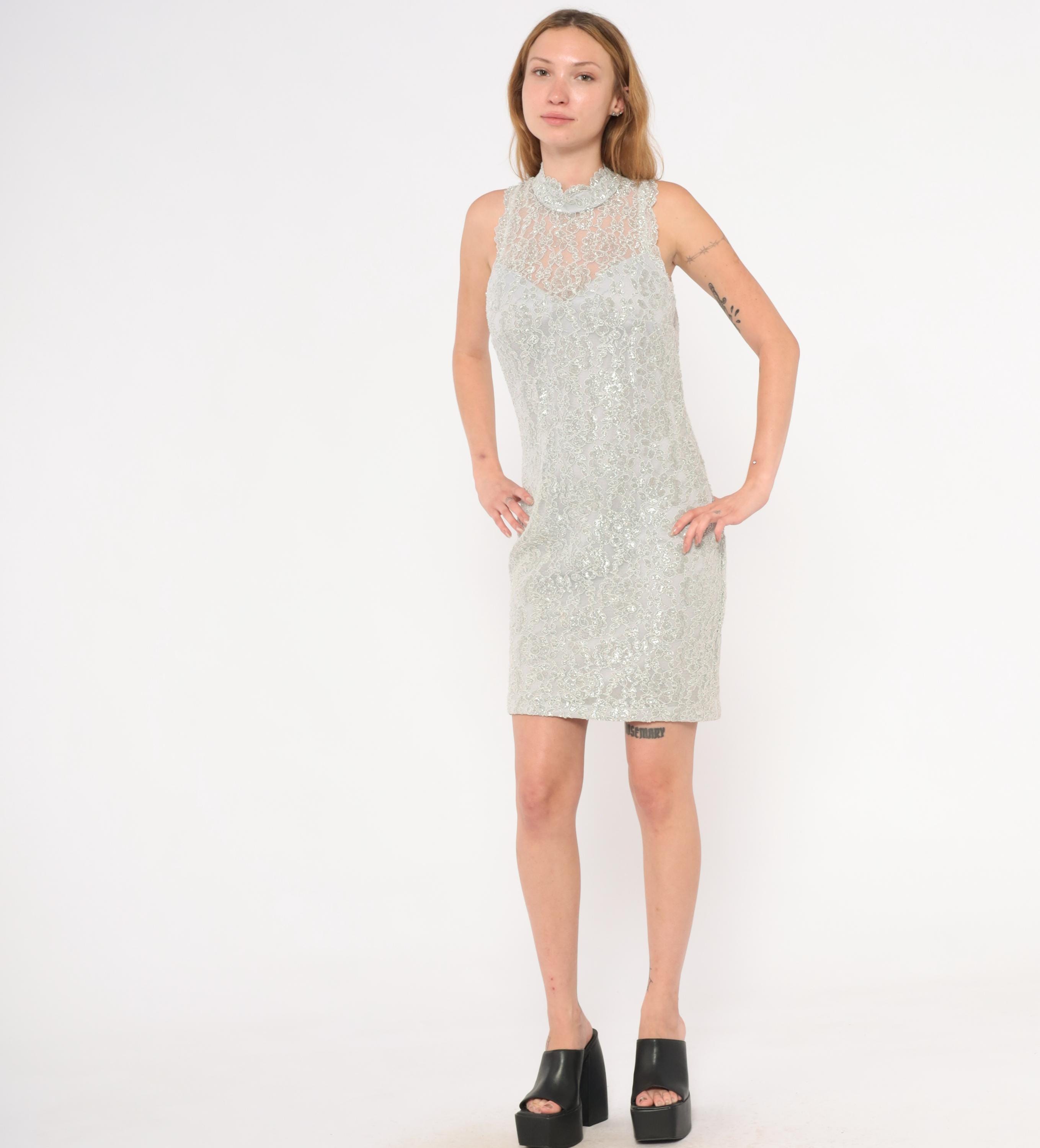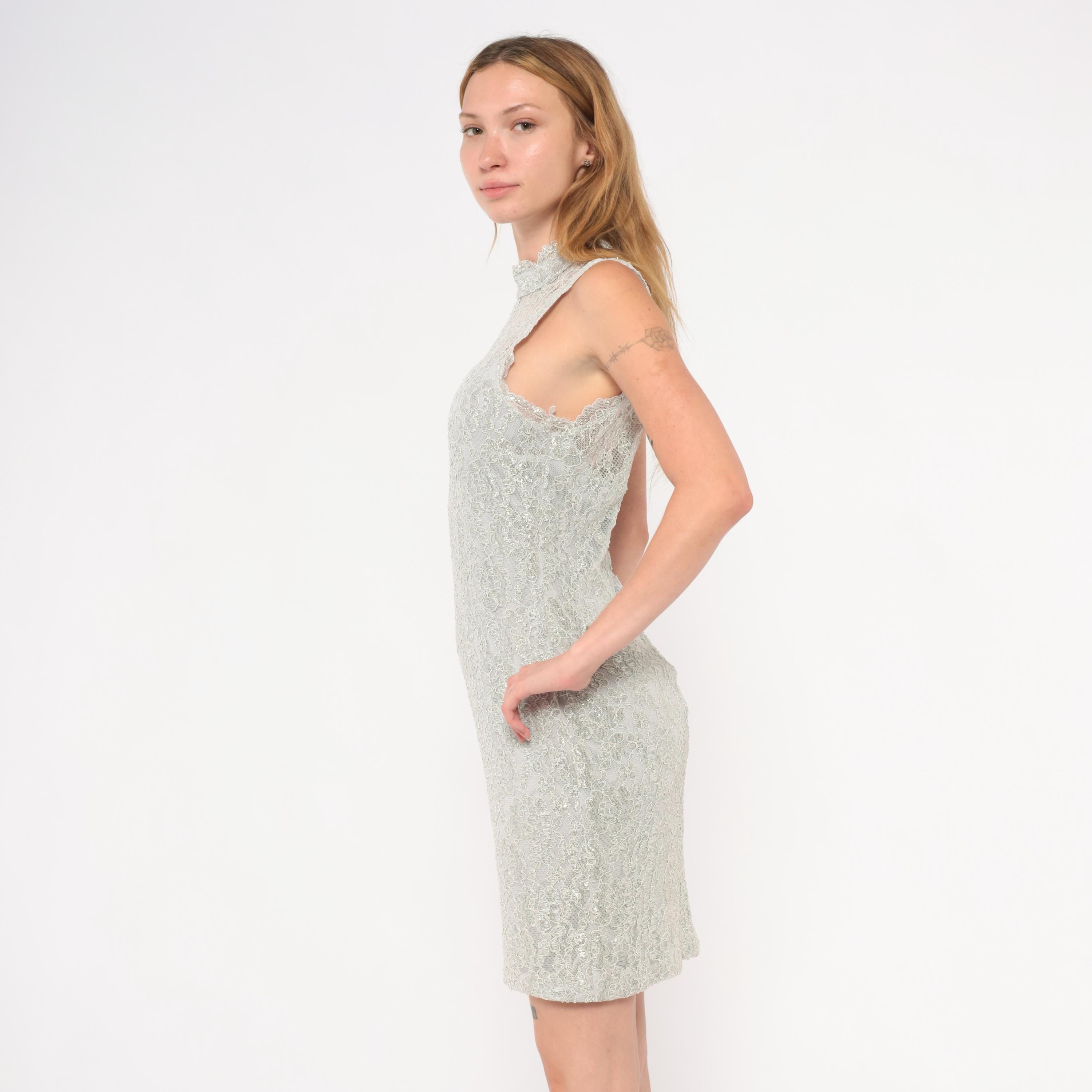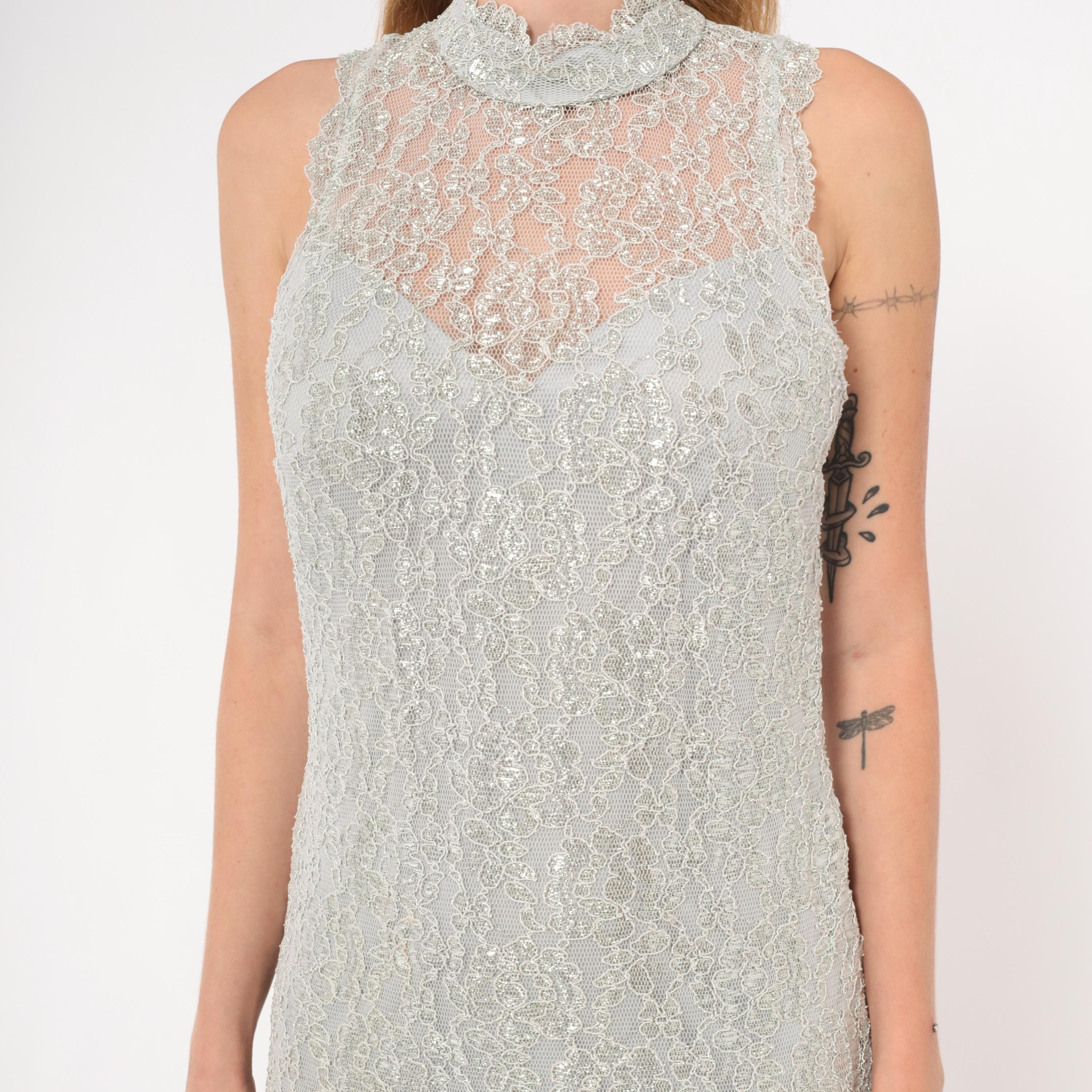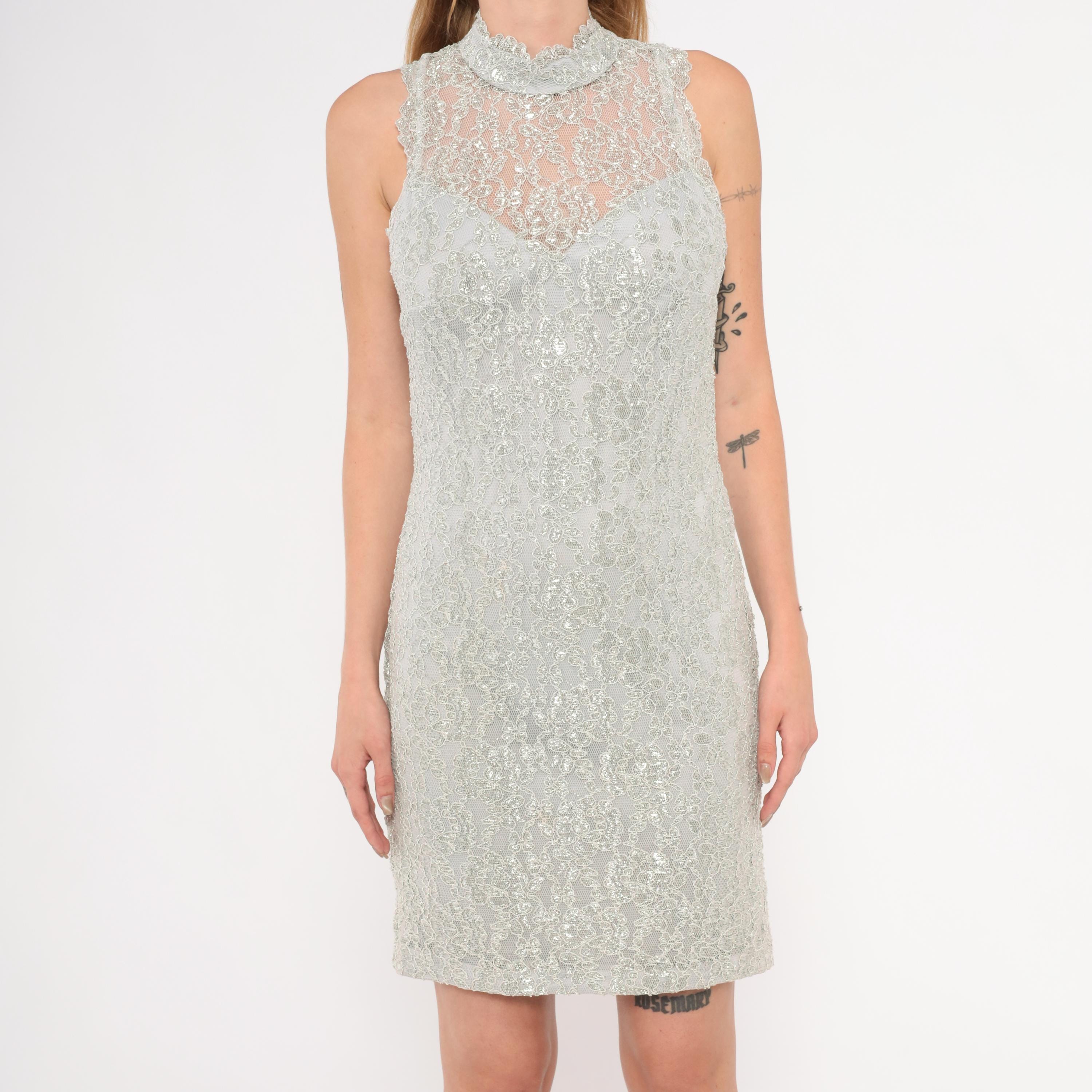 90s silver lace mini dress from Nite Scarlet with an allover metallic floral lace overlay and solid grey lining beneath. Mock neck collar with ruffled lace edge and sheer illusion yoke across the chest and upper back. Sleeveless cut with scalloped lace armhole trim and back zipper closure.