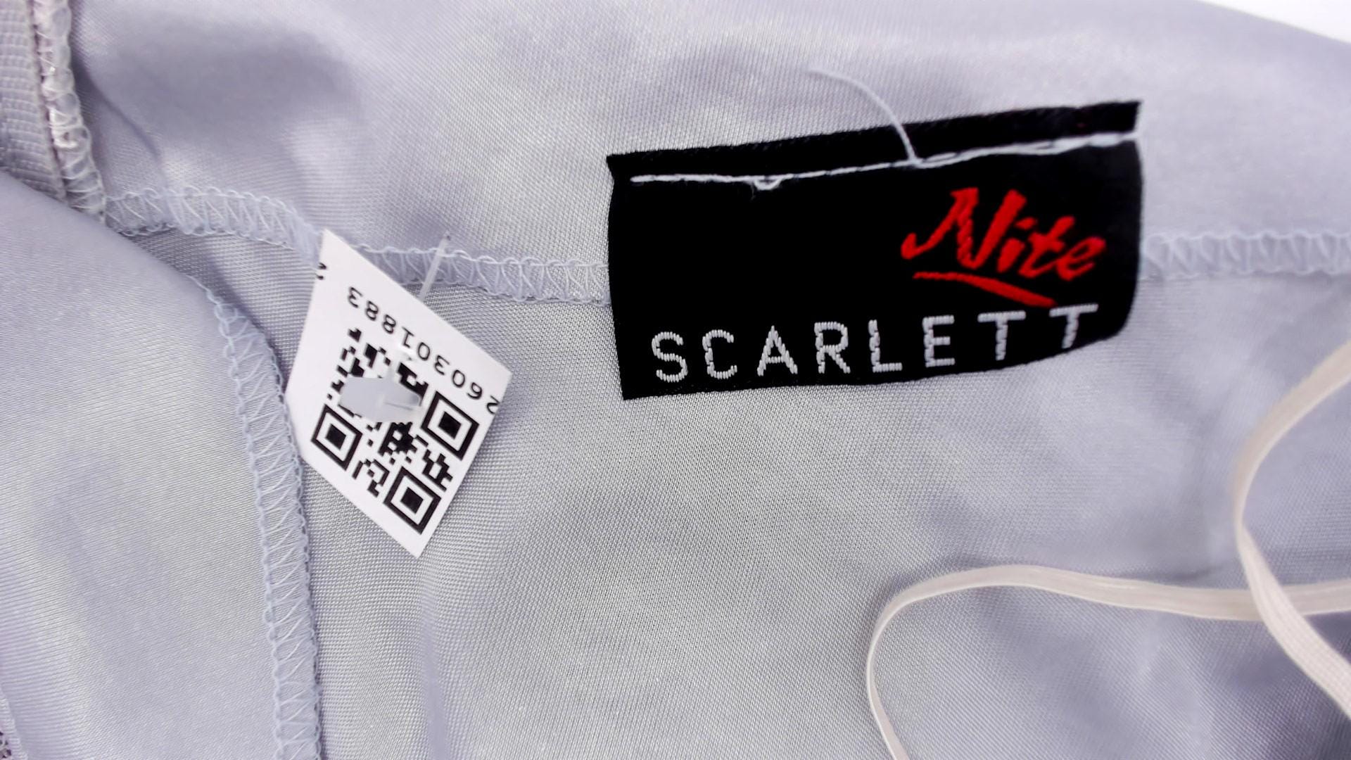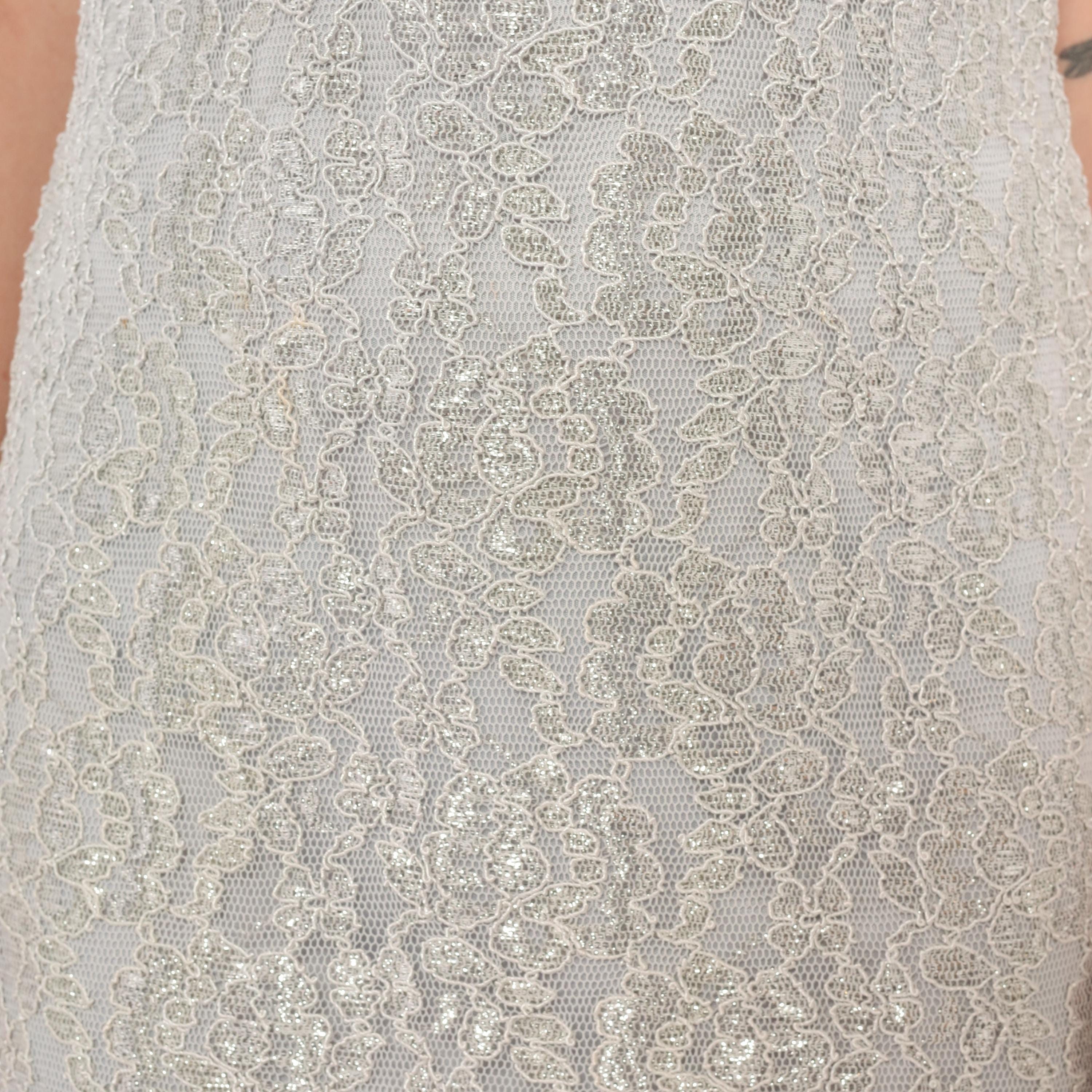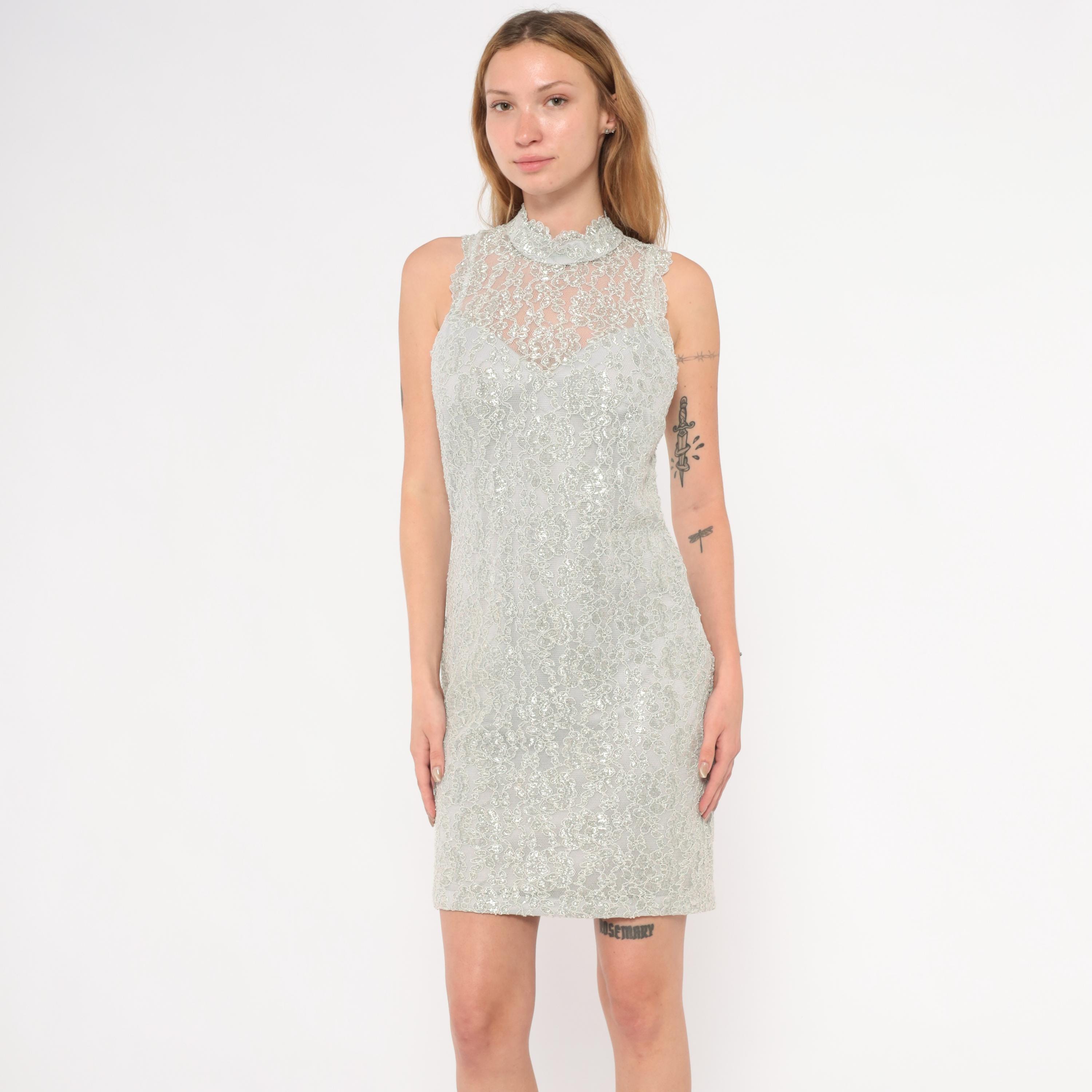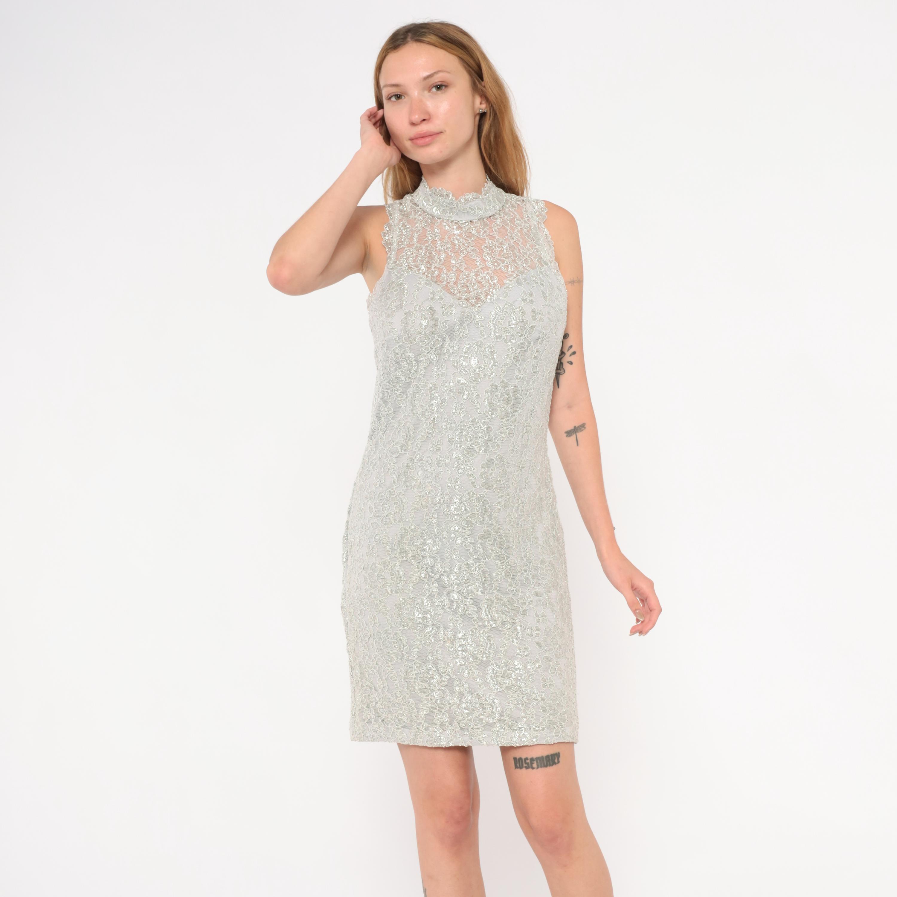 90s silver lace mini dress from Nite Scarlet with an allover metallic floral lace overlay and solid grey lining beneath. Mock neck collar with ruffled lace edge and sheer illusion yoke across the chest and upper back. Sleeveless cut with scalloped lace armhole trim and back zipper closure.