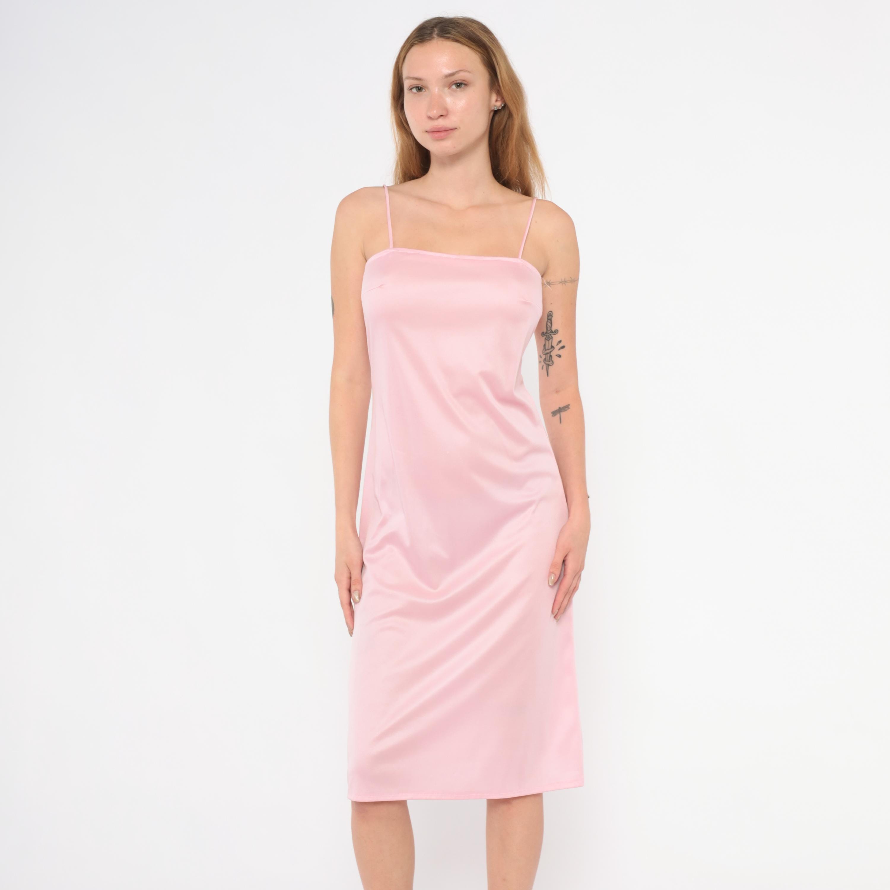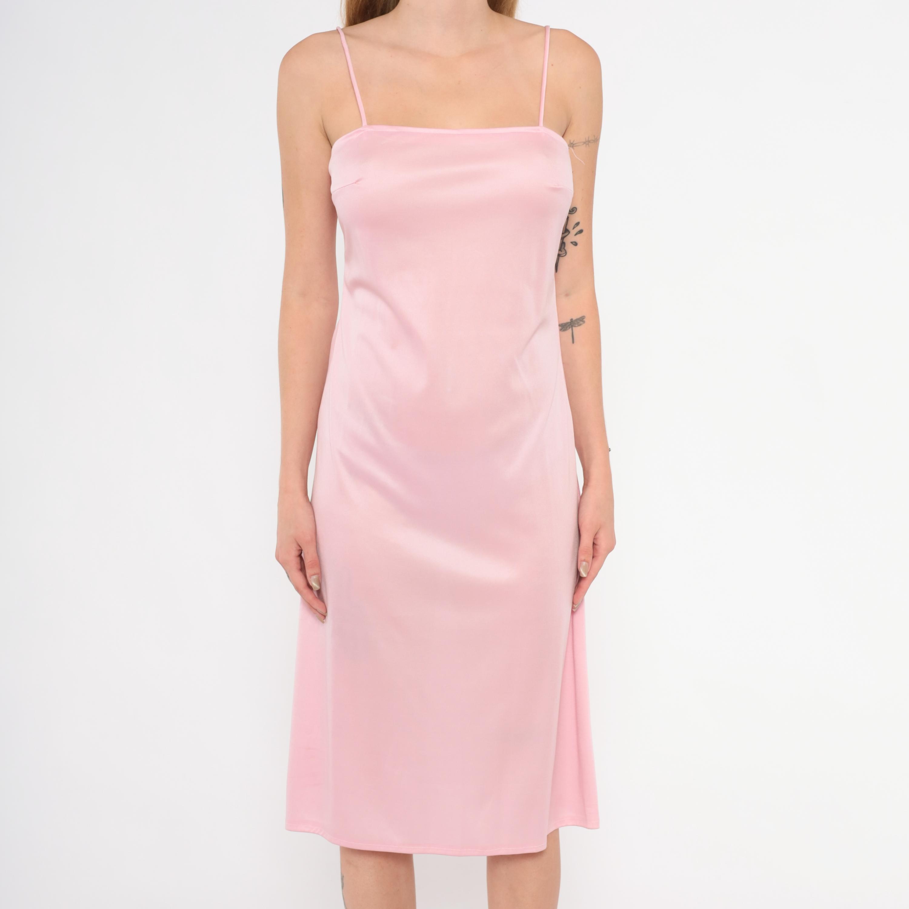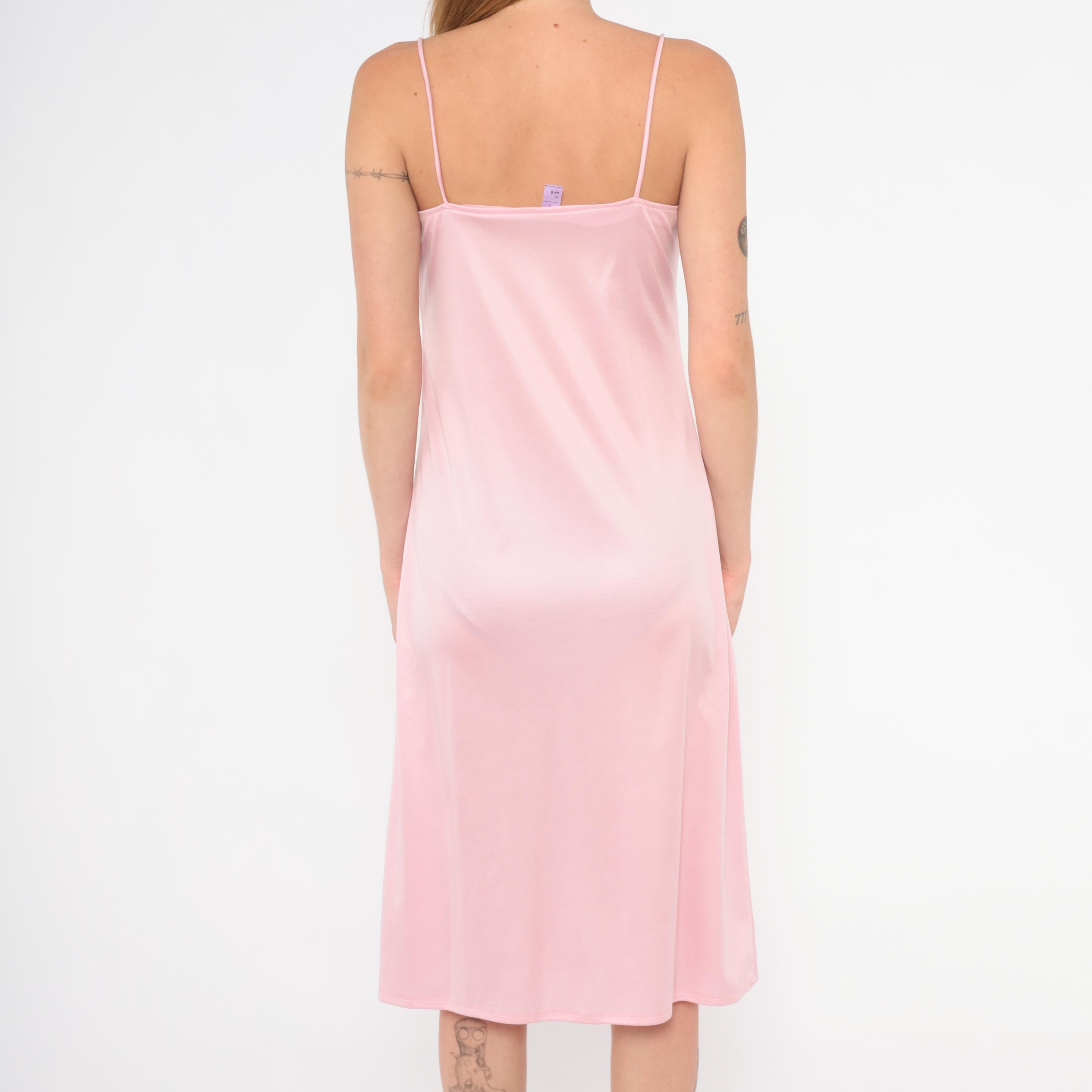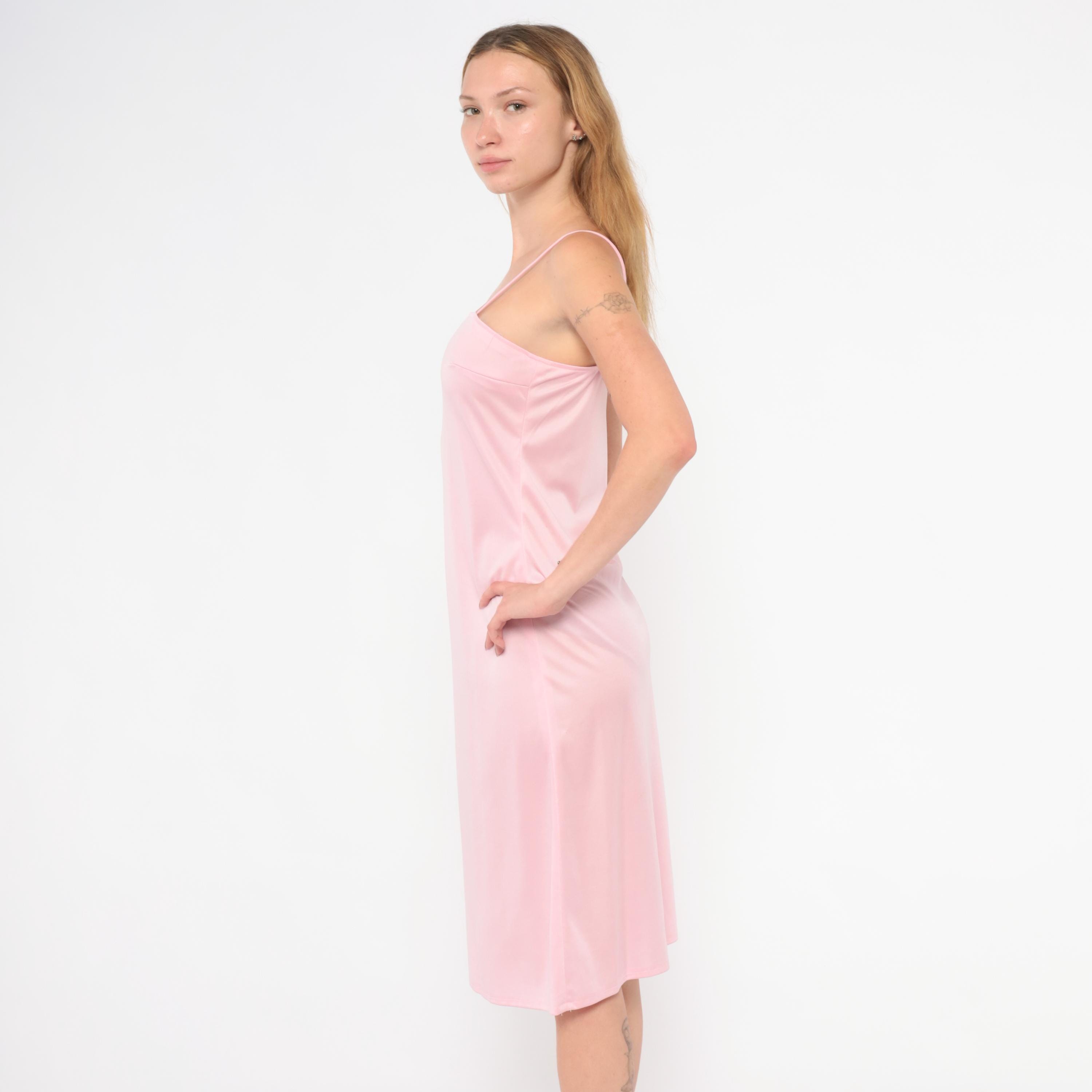 70s blush pink satin slip dress with a straight across neckline and thin spaghetti straps. Pullover construction with no closures, a straight silhouette through the body, and a slight A-line flare below the hip. The hem falls just below the knee.