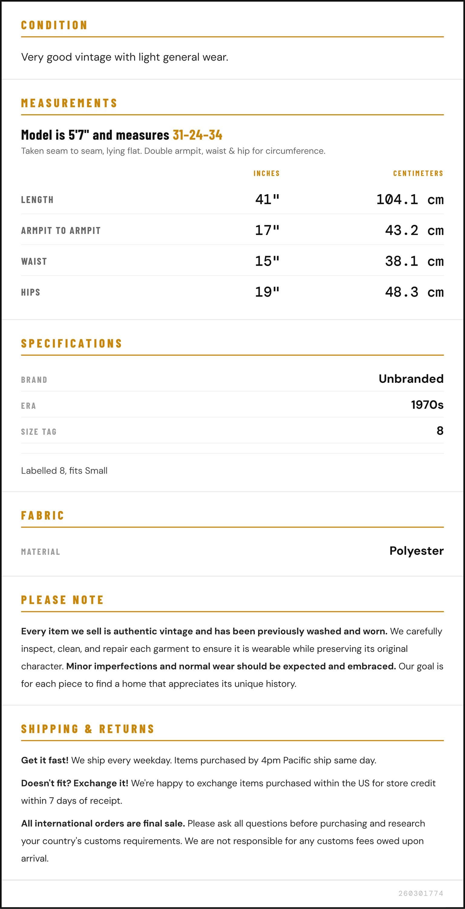 Measurements are taken laying flat and should be doubled where applicable. The "best fits" size is just an estimate, and vintage sizing can vary from modern sizing. Please use measurements to ensure proper fit. The best thing to do is measure a similar item of your own, and compare. When an item has stretch, we will list the unstretched dimensions with the stretched measurement afterwards.