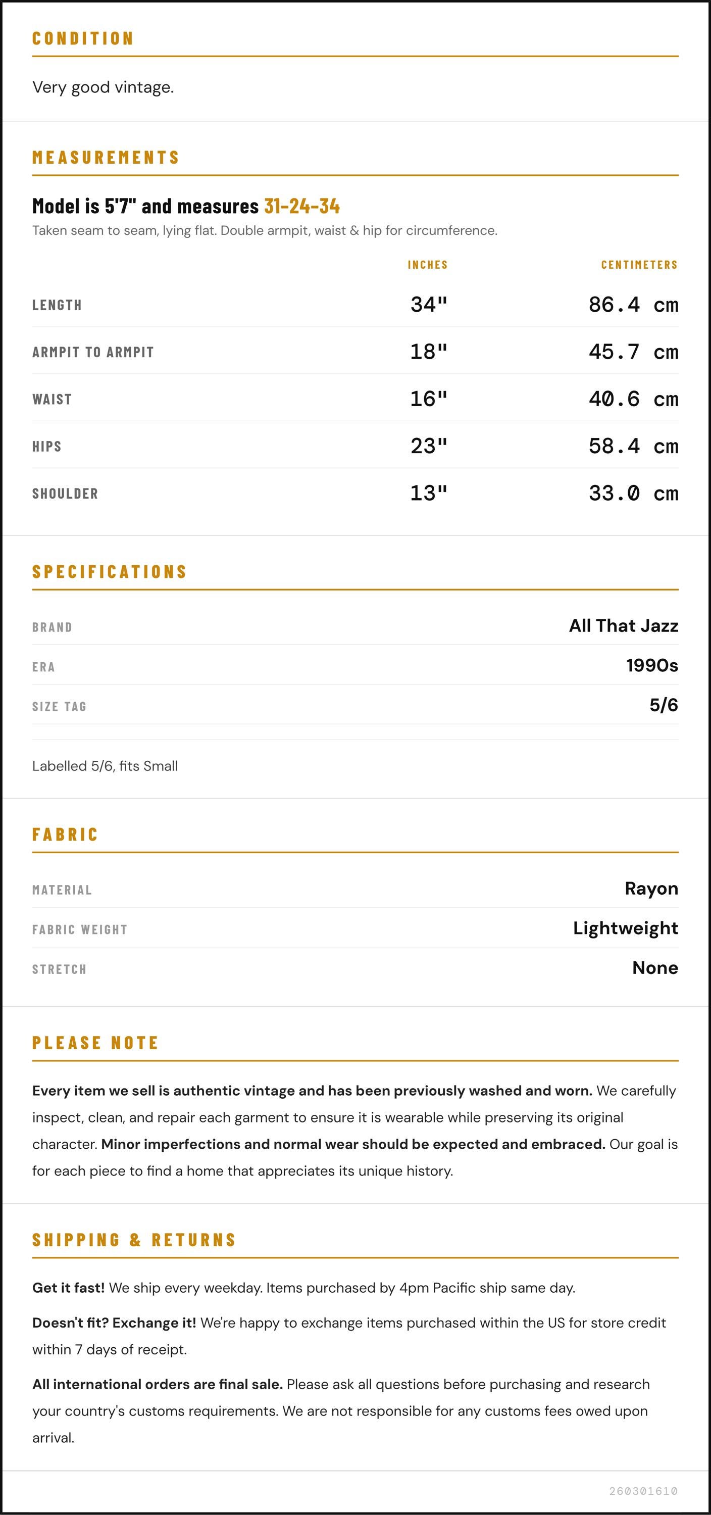 Vintage denim was usually made without any stretch, unlike modern jeans. Check the measurements to ensure proper fit, and remember to give yourself a little wiggle room in the waist and hips, depending on your preferred fit.
