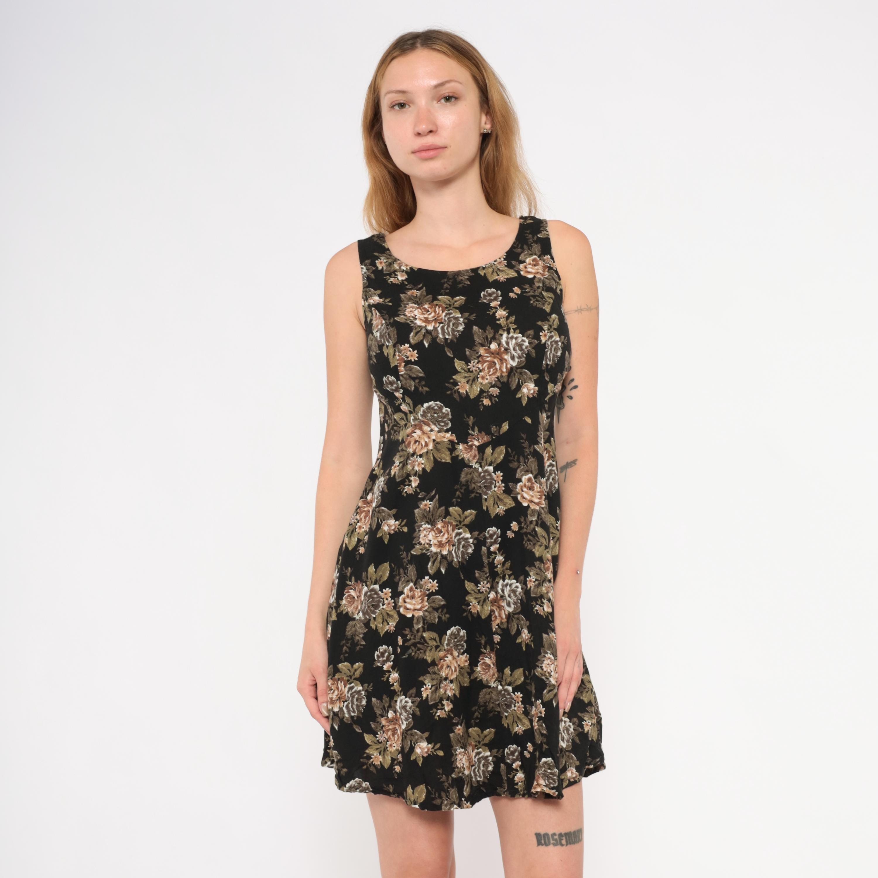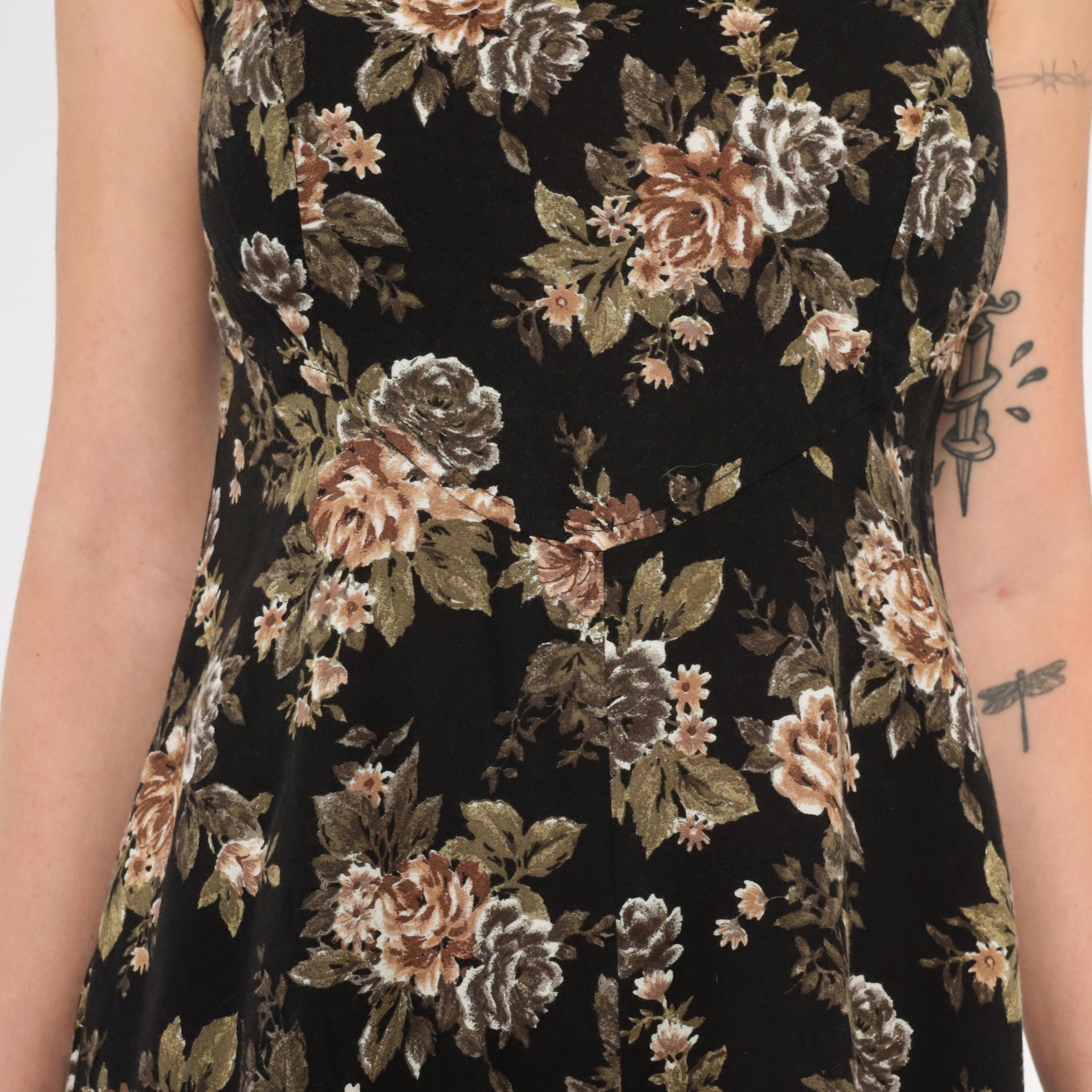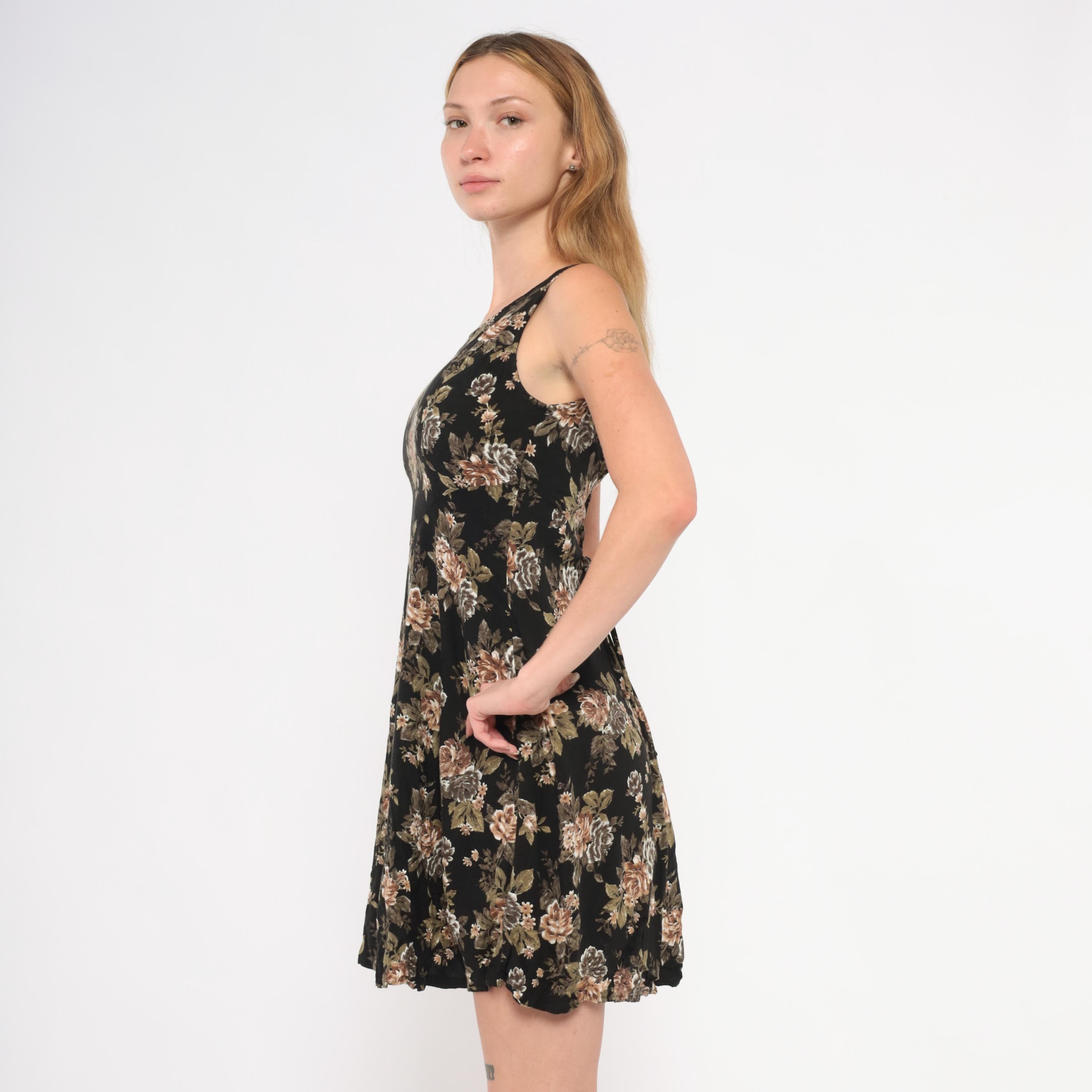 90s black mini dress from All That Jazz with a muted rose floral print in tan, taupe, olive green, and grey tones. Sleeveless cut with a scoop neckline, fitted bodice, and A-line skirt with a slight flare at the hem.
