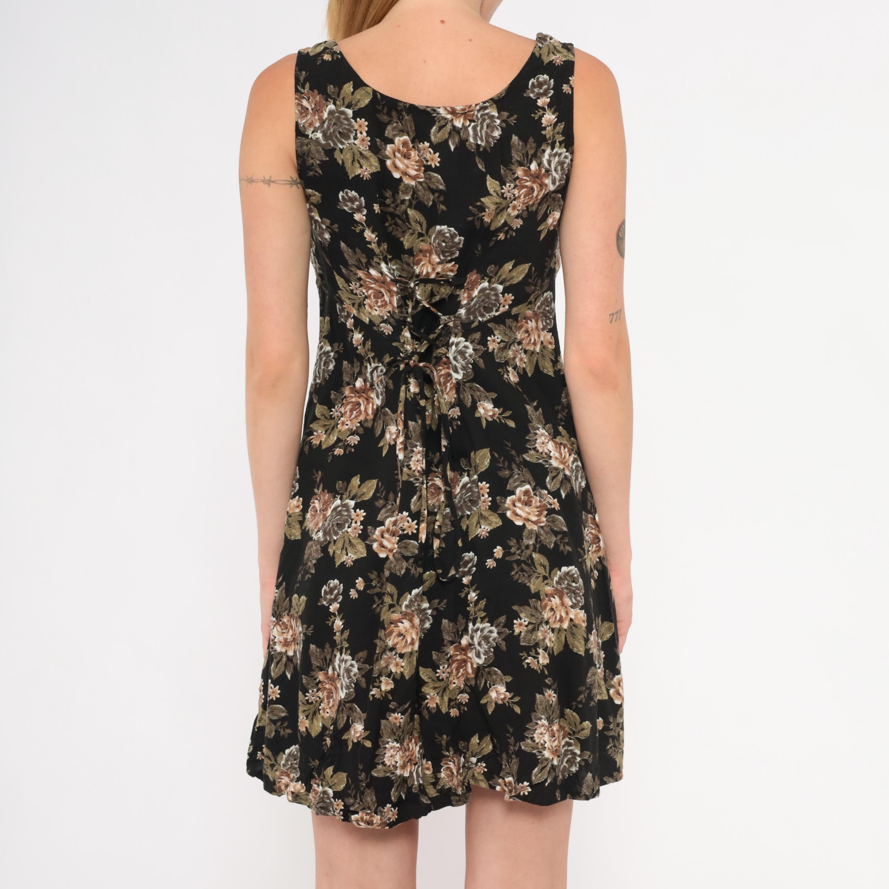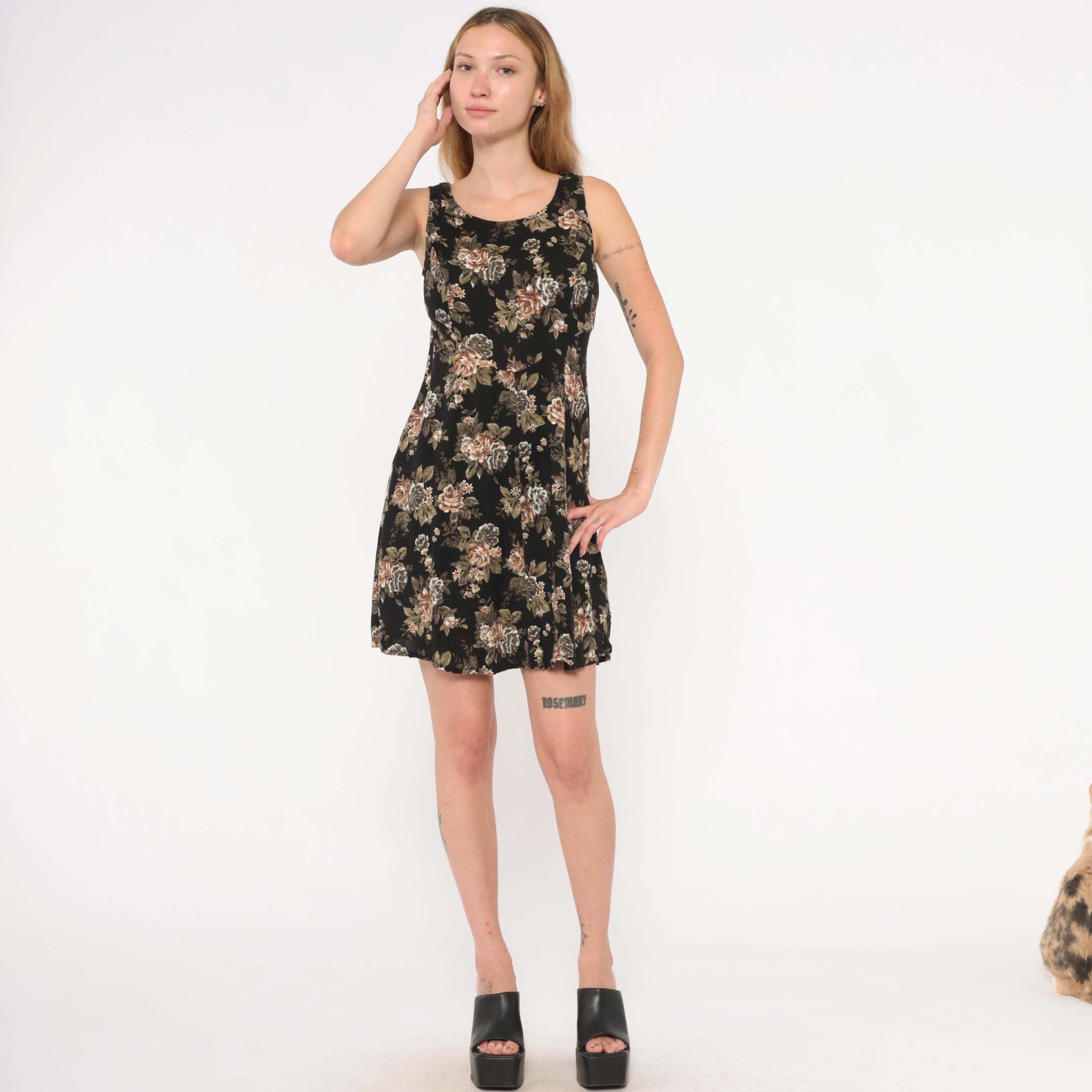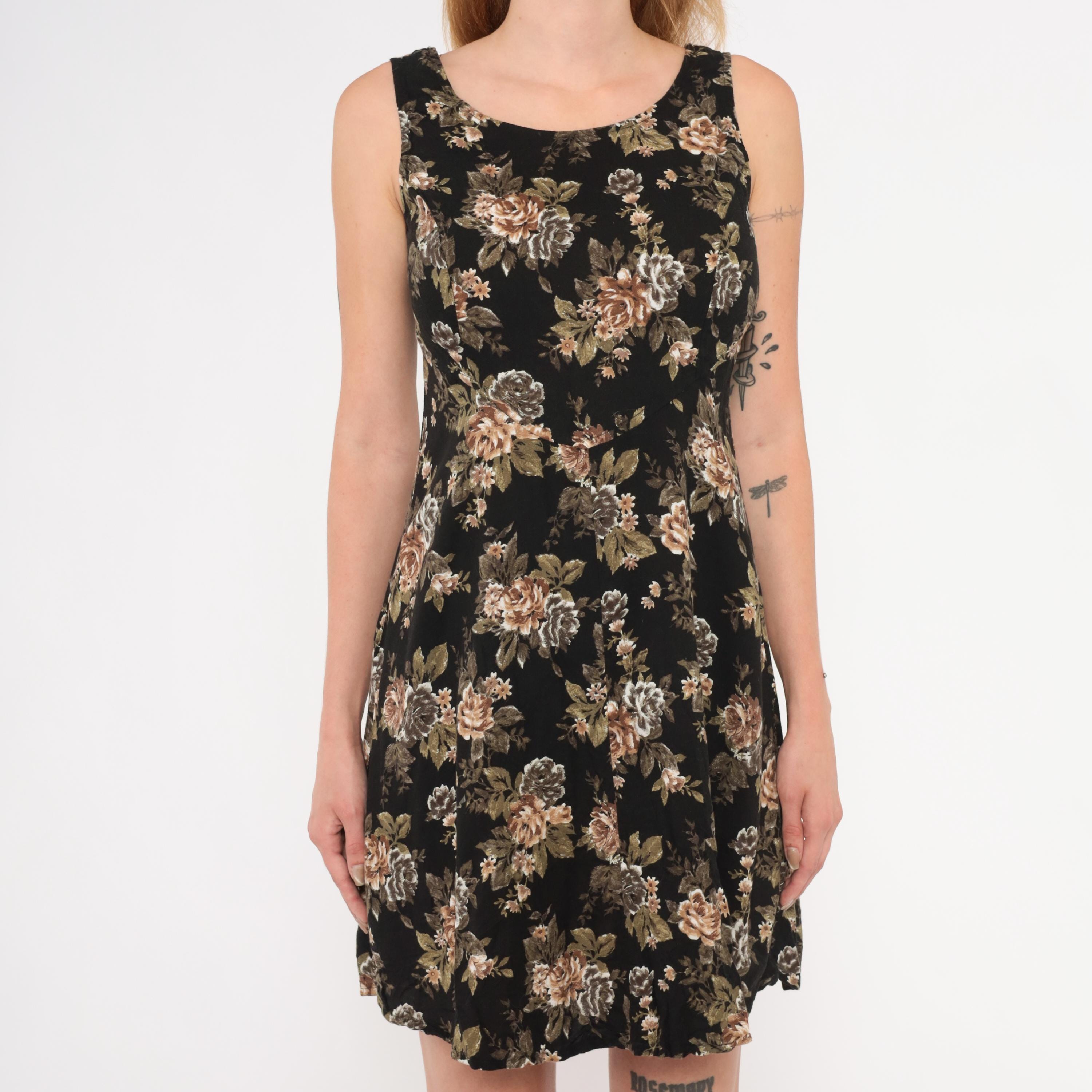 90s black mini dress from All That Jazz with a muted rose floral print in tan, taupe, olive green, and grey tones. Sleeveless cut with a scoop neckline, fitted bodice, and A-line skirt with a slight flare at the hem.
