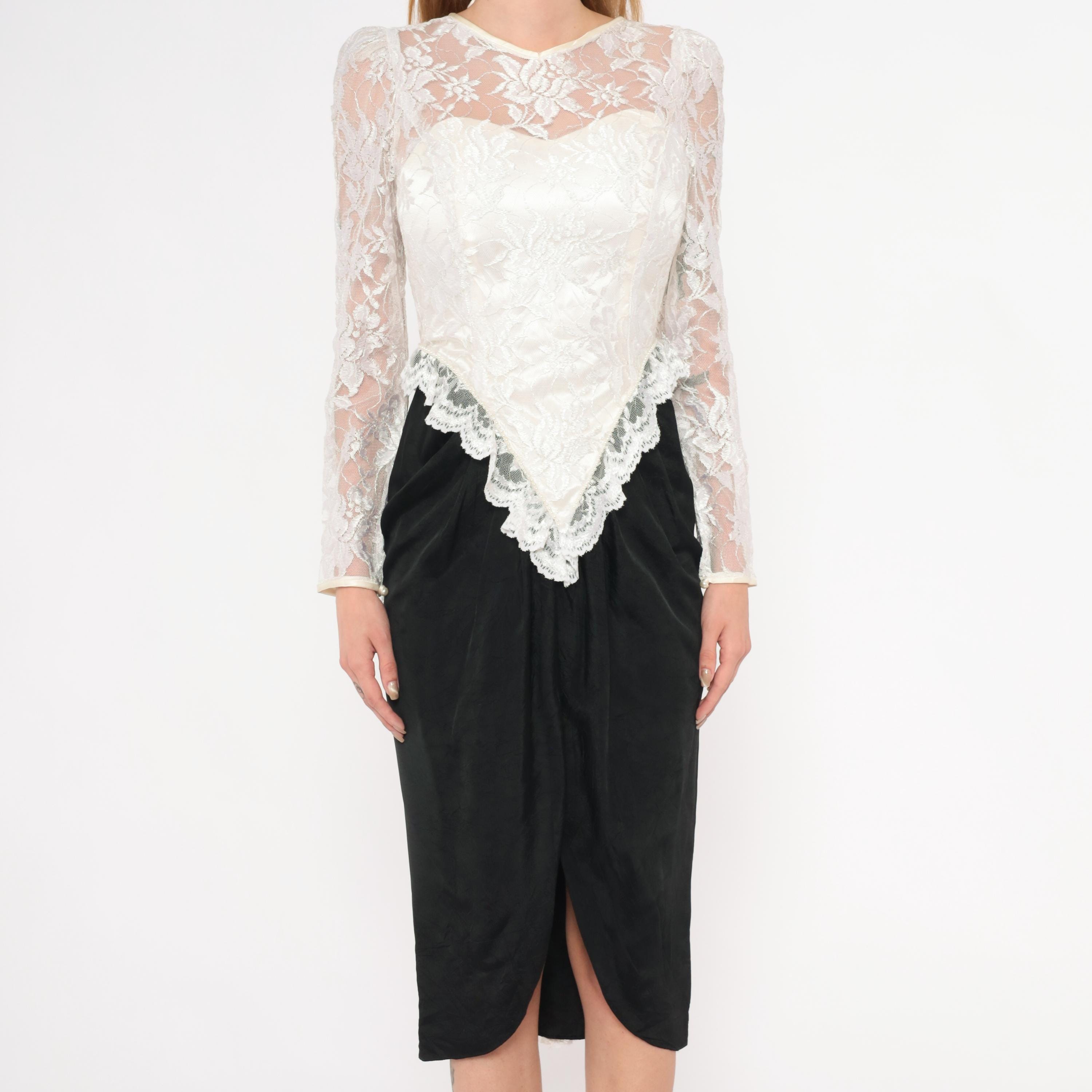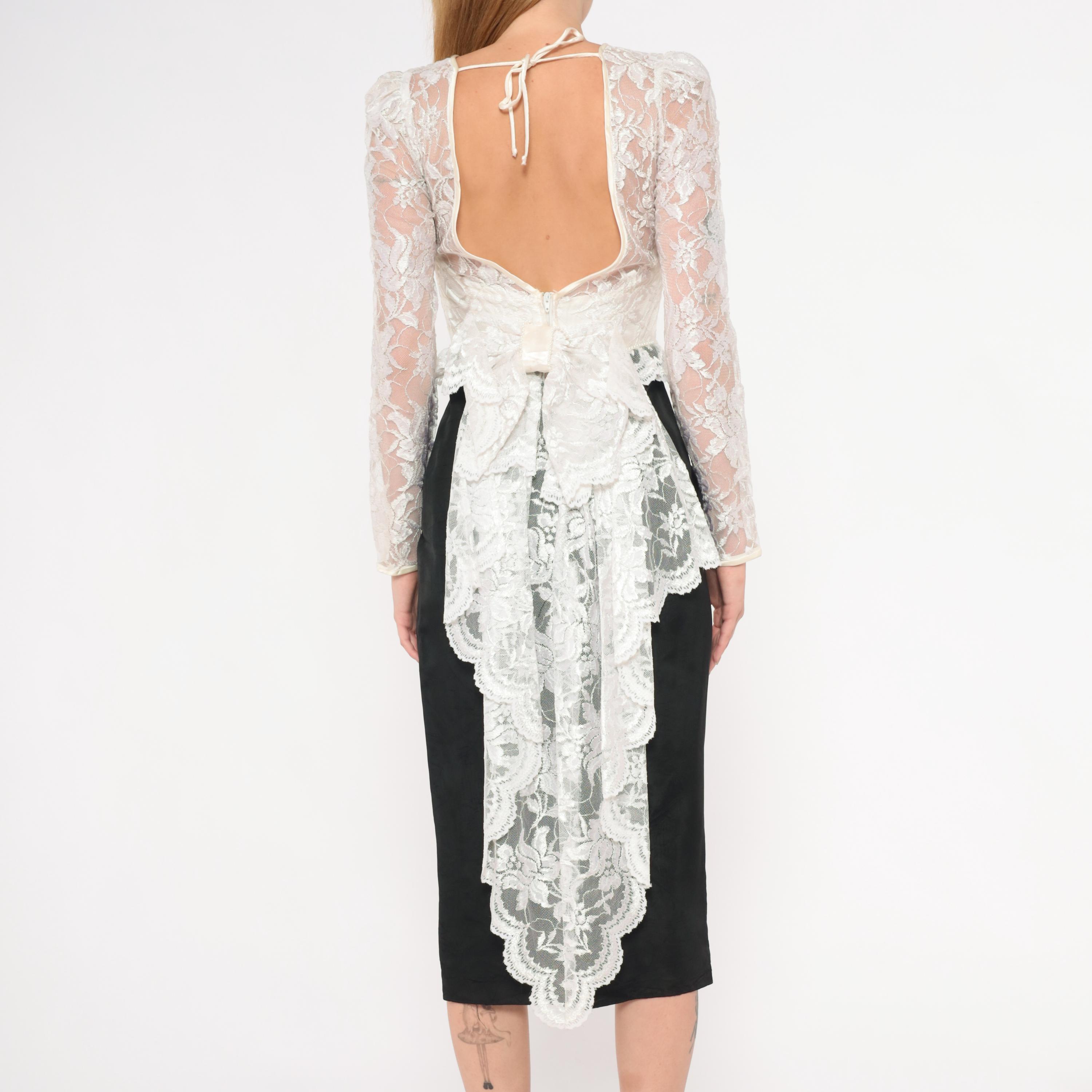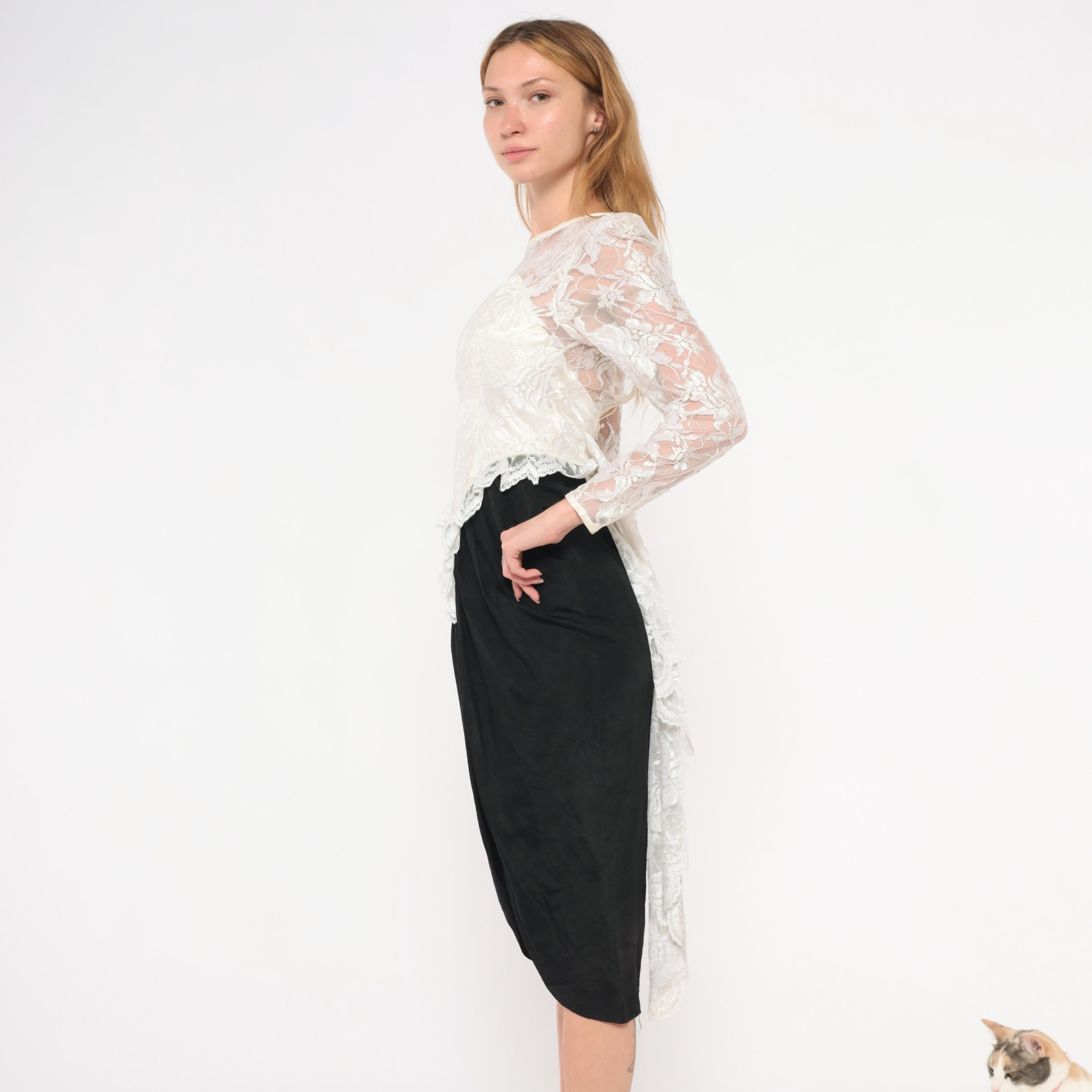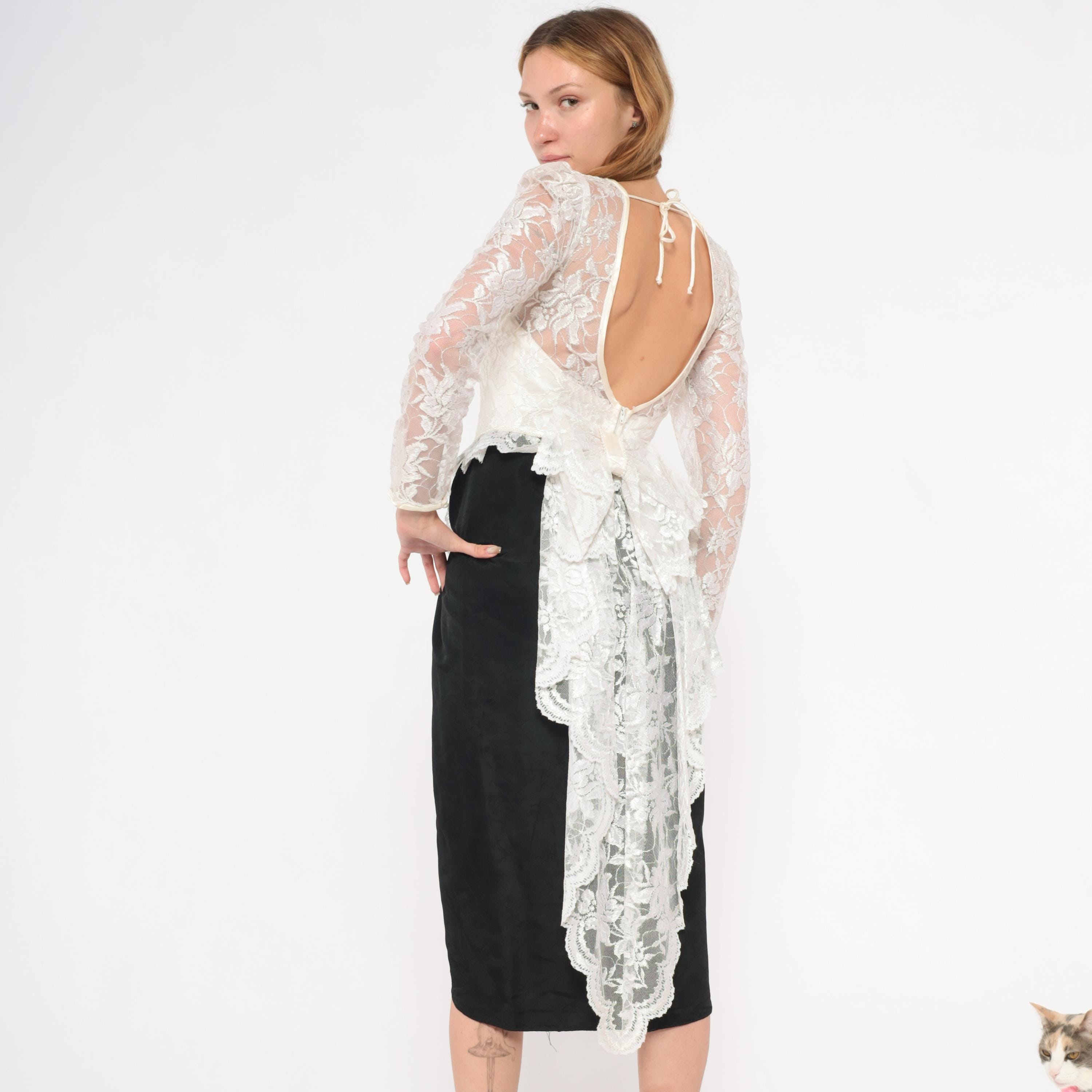 90s black and ivory two-tone dress with a white lace sweetheart bodice layered under sheer floral lace sleeves and neckline. Deep V-shaped basque waistline dips into a black satin tulip pencil skirt with a front slit. Open back with tie closure at the nape and a cascading lace bustle draping down the rear of the skirt. Long sleeves with scalloped lace cuffs, scalloped lace trim at the basque waist, and back zipper closure.