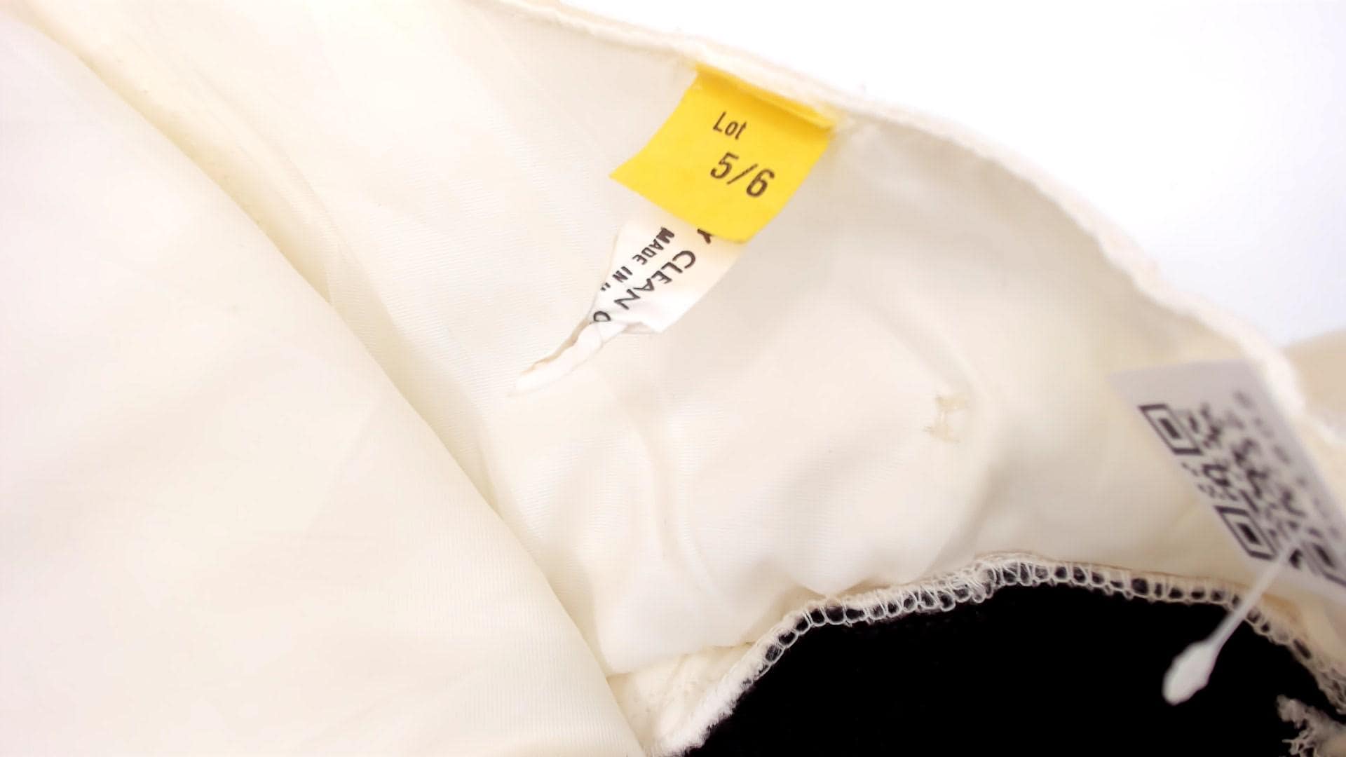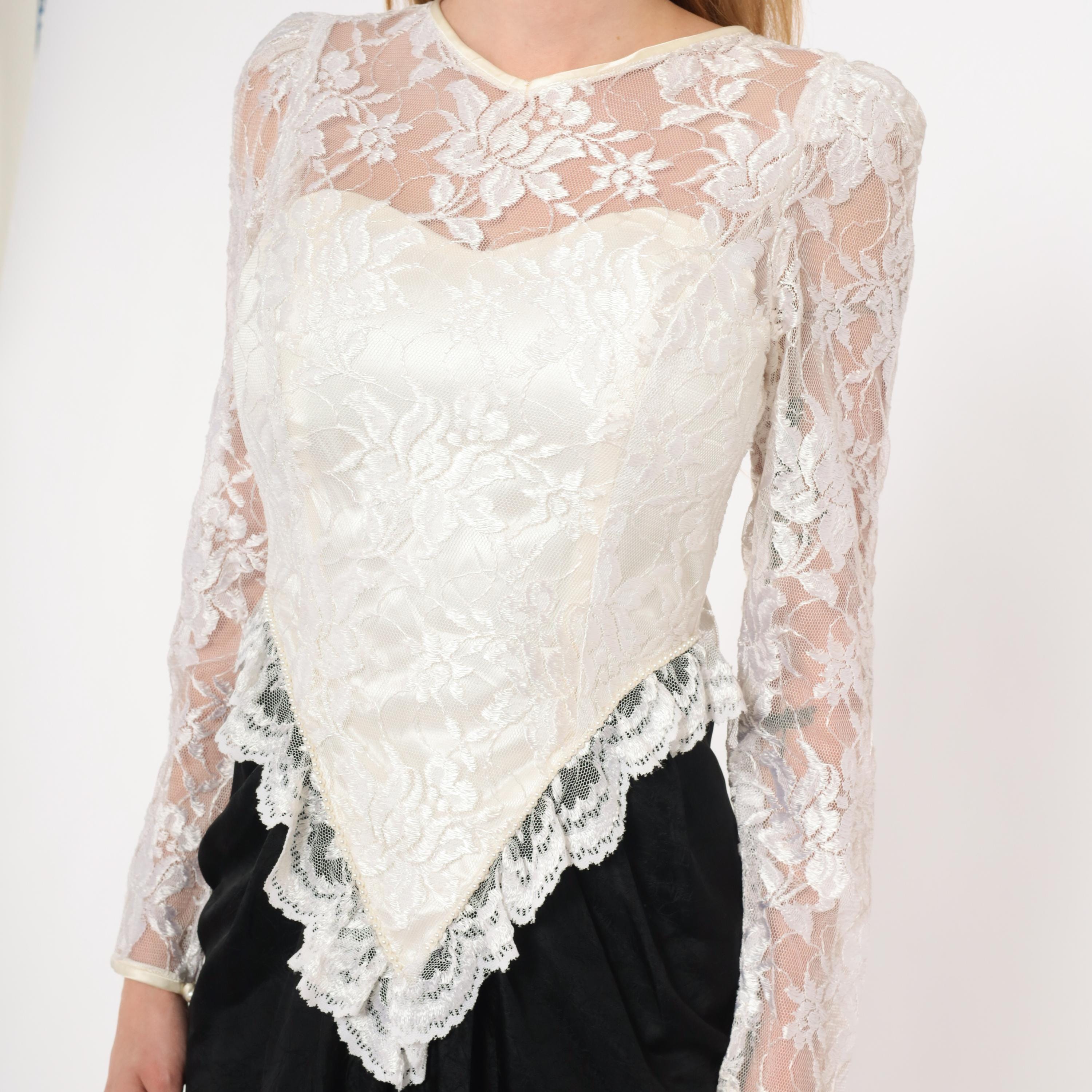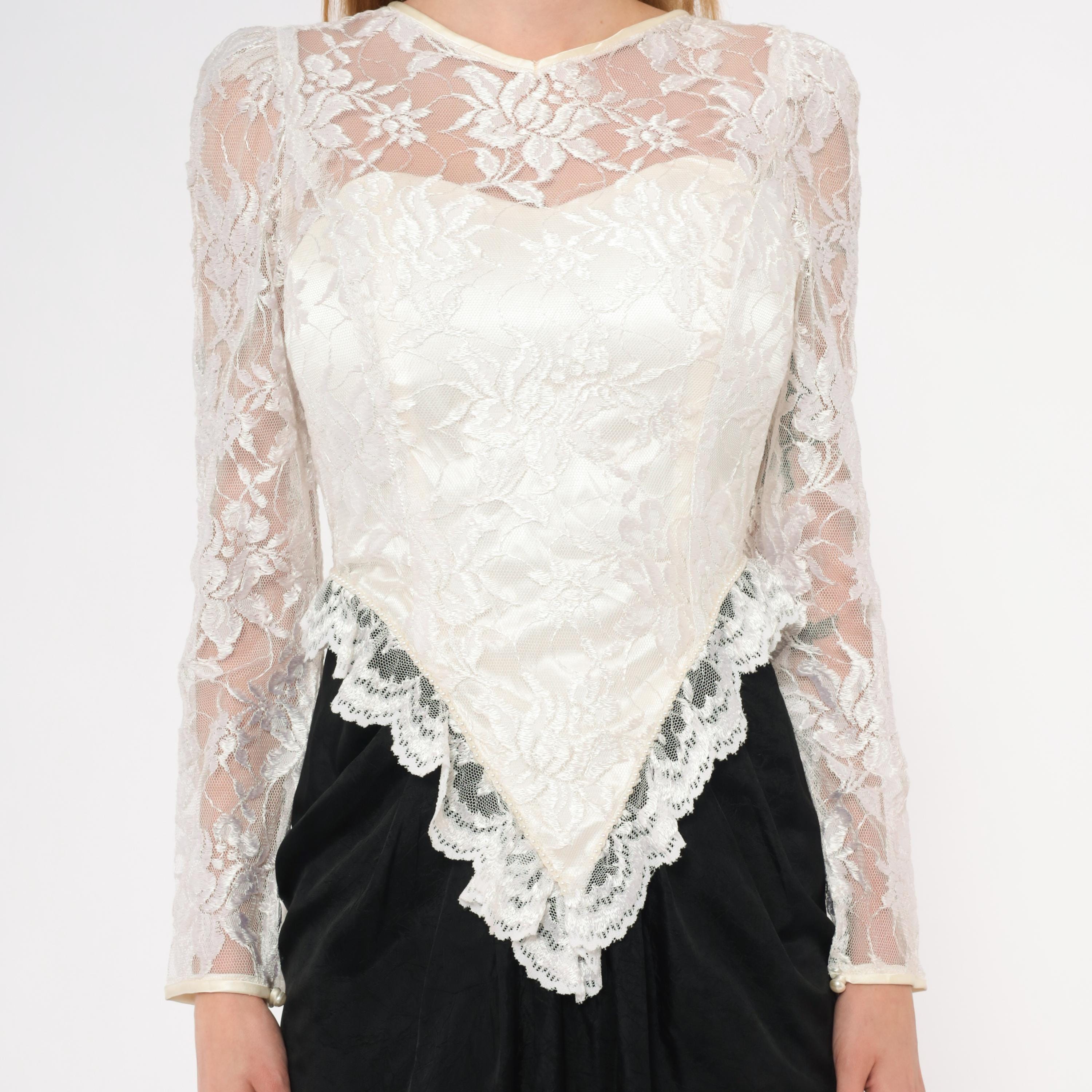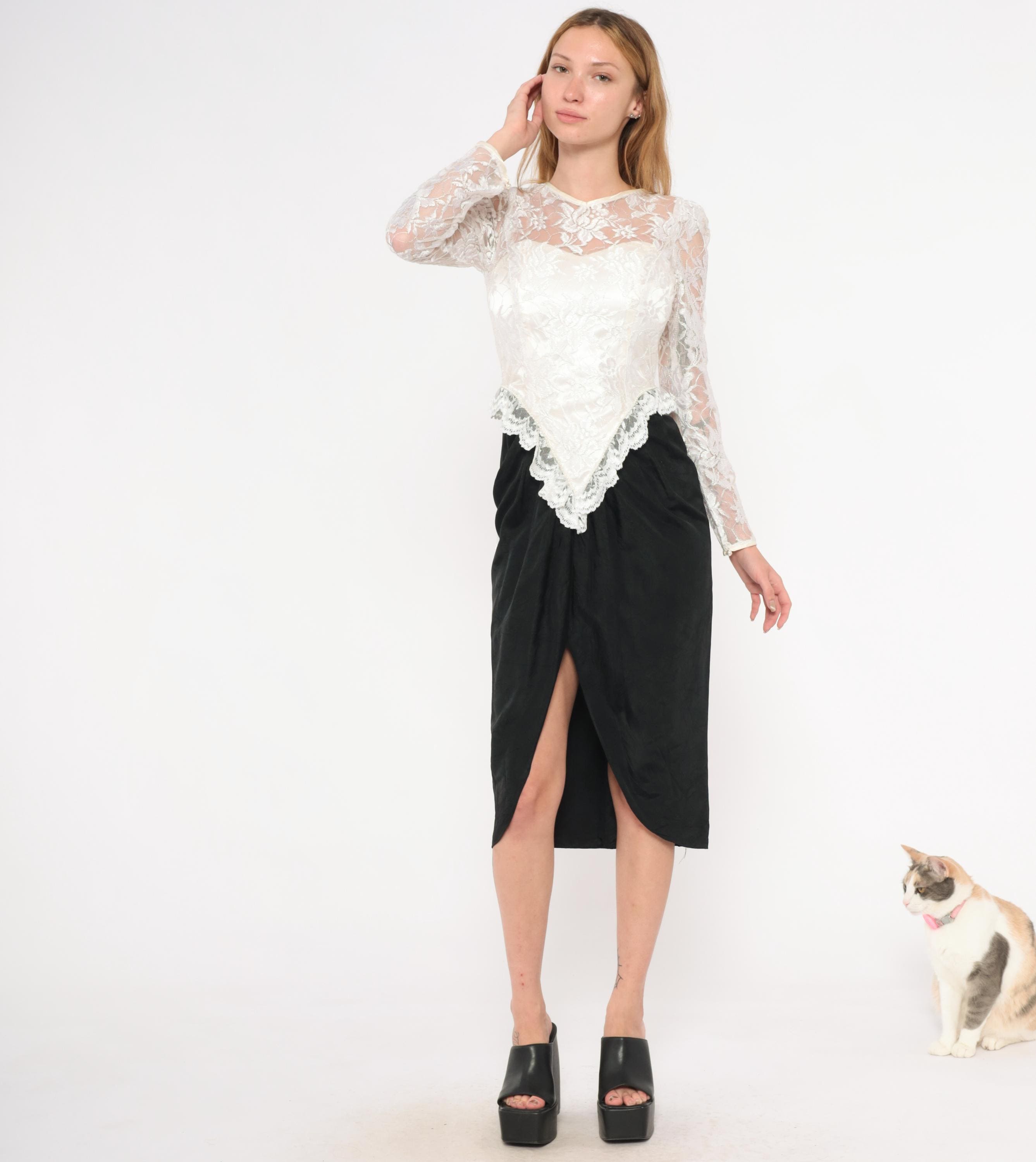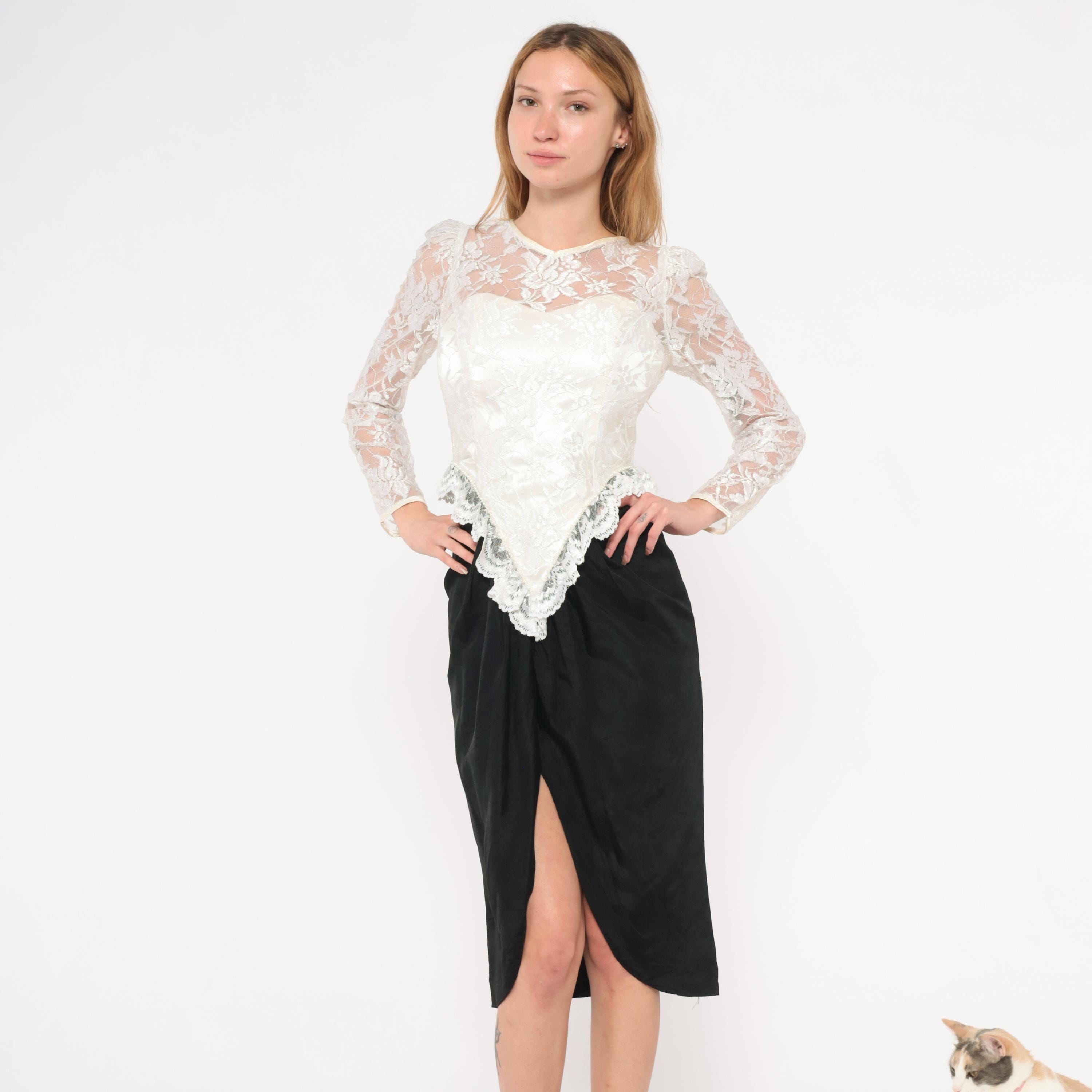 90s black and ivory two-tone dress with a white lace sweetheart bodice layered under sheer floral lace sleeves and neckline. Deep V-shaped basque waistline dips into a black satin tulip pencil skirt with a front slit. Open back with tie closure at the nape and a cascading lace bustle draping down the rear of the skirt. Long sleeves with scalloped lace cuffs, scalloped lace trim at the basque waist, and back zipper closure.
