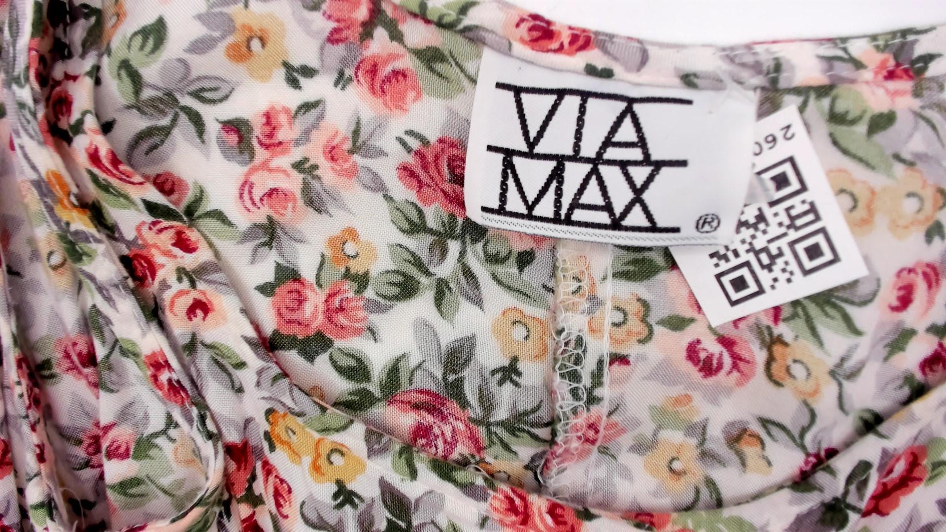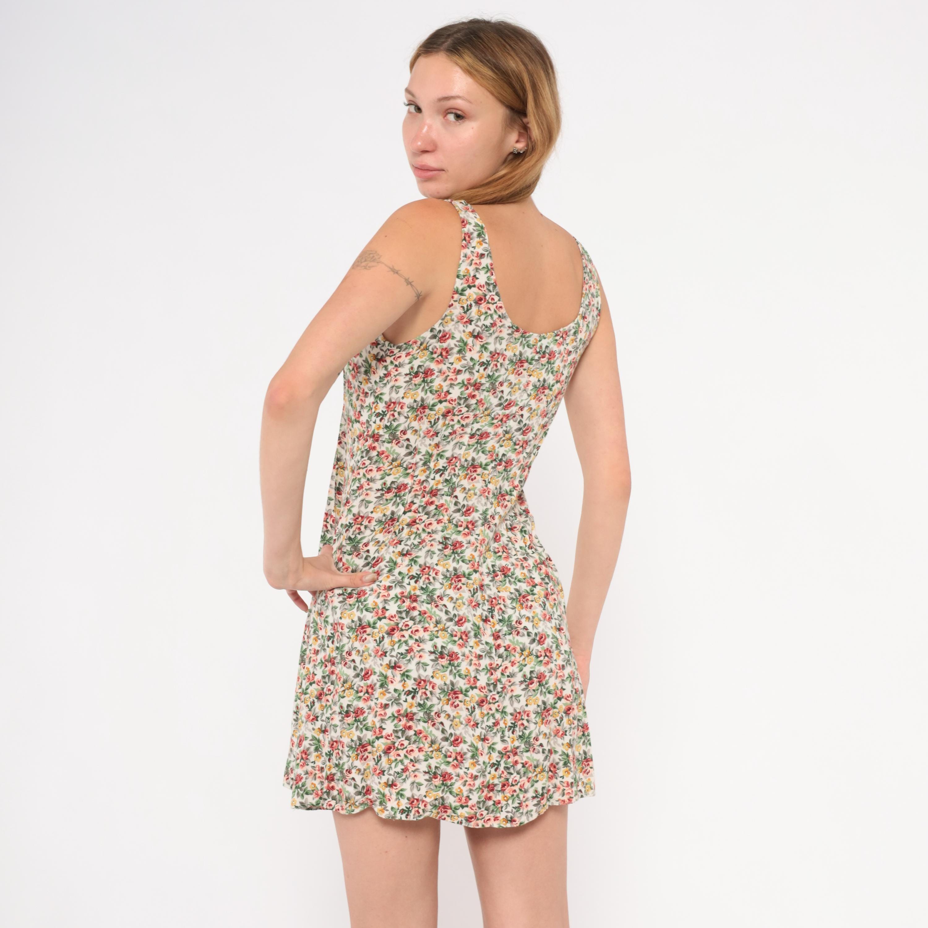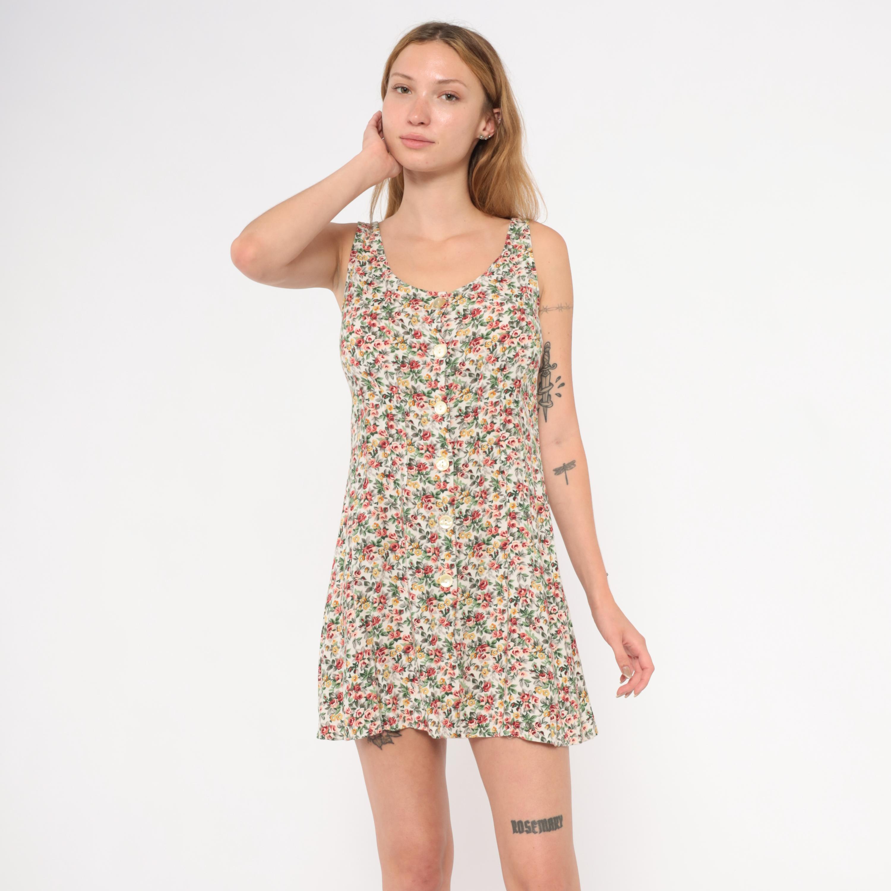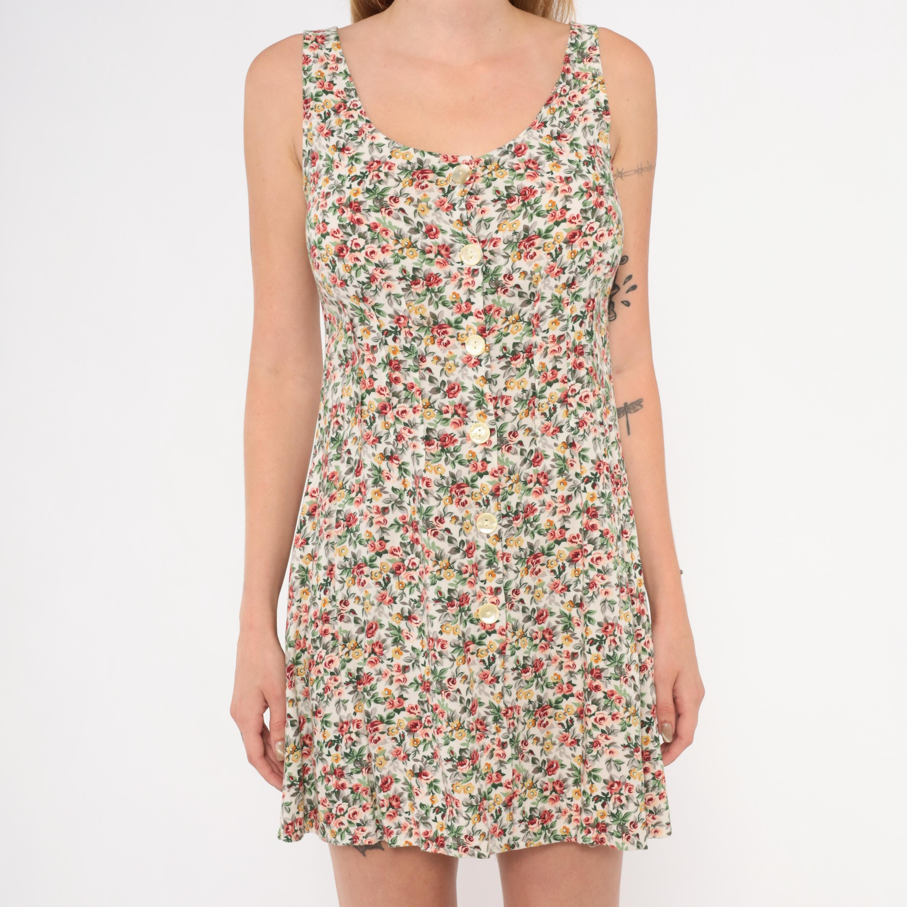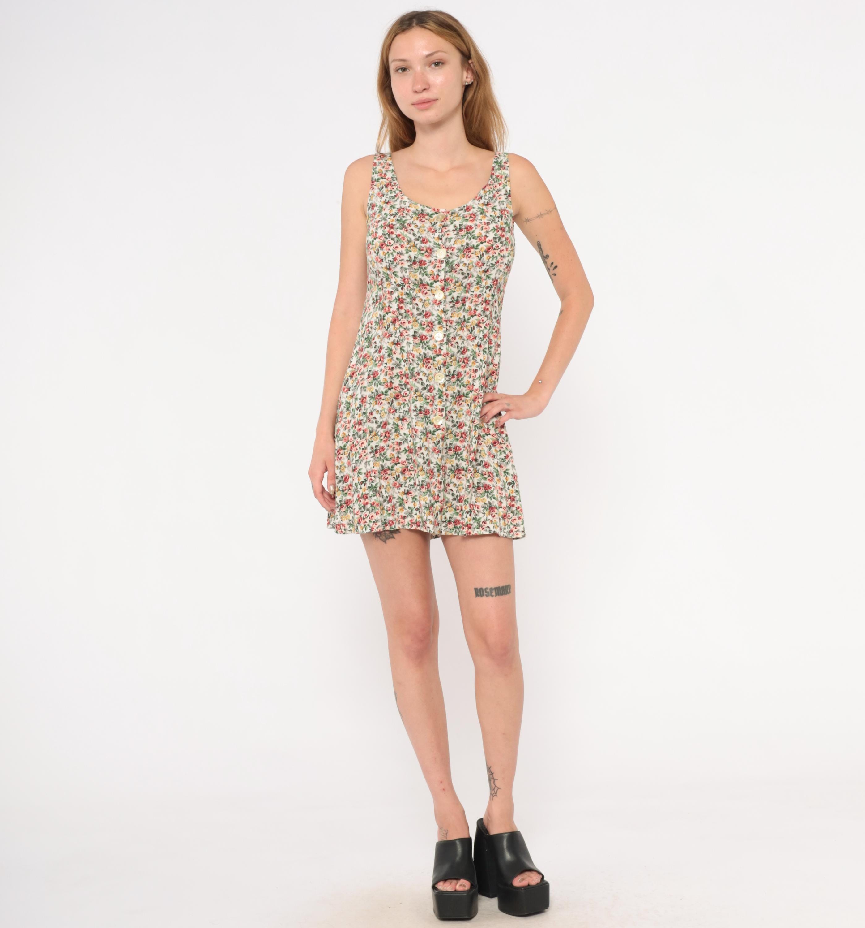 90s floral mini dress from ViaMax with an allover rose print in pink, red, yellow, and green on a cream background. Scoop neckline at front and back, wide tank straps, and button front closure with pearlescent shell buttons down the center.
