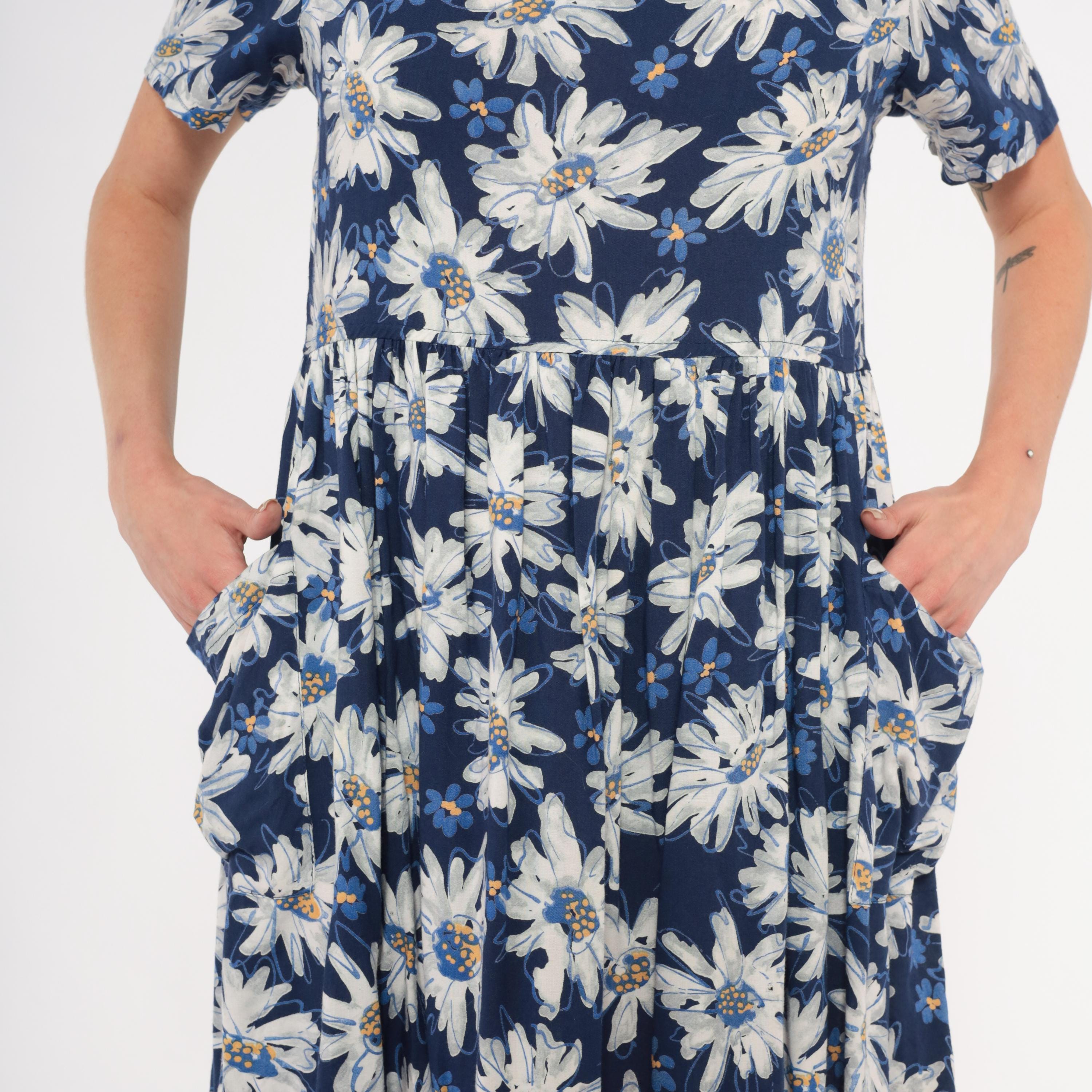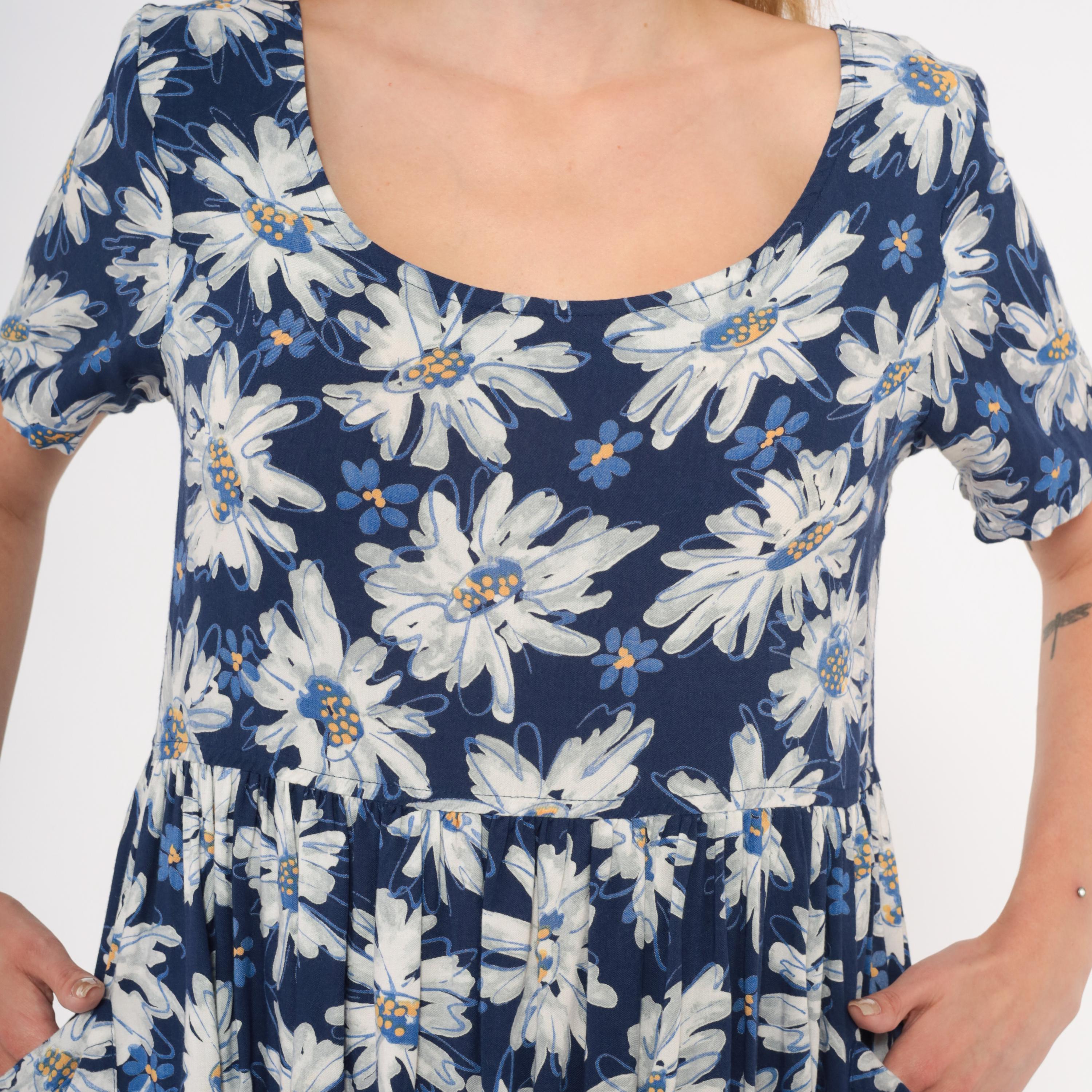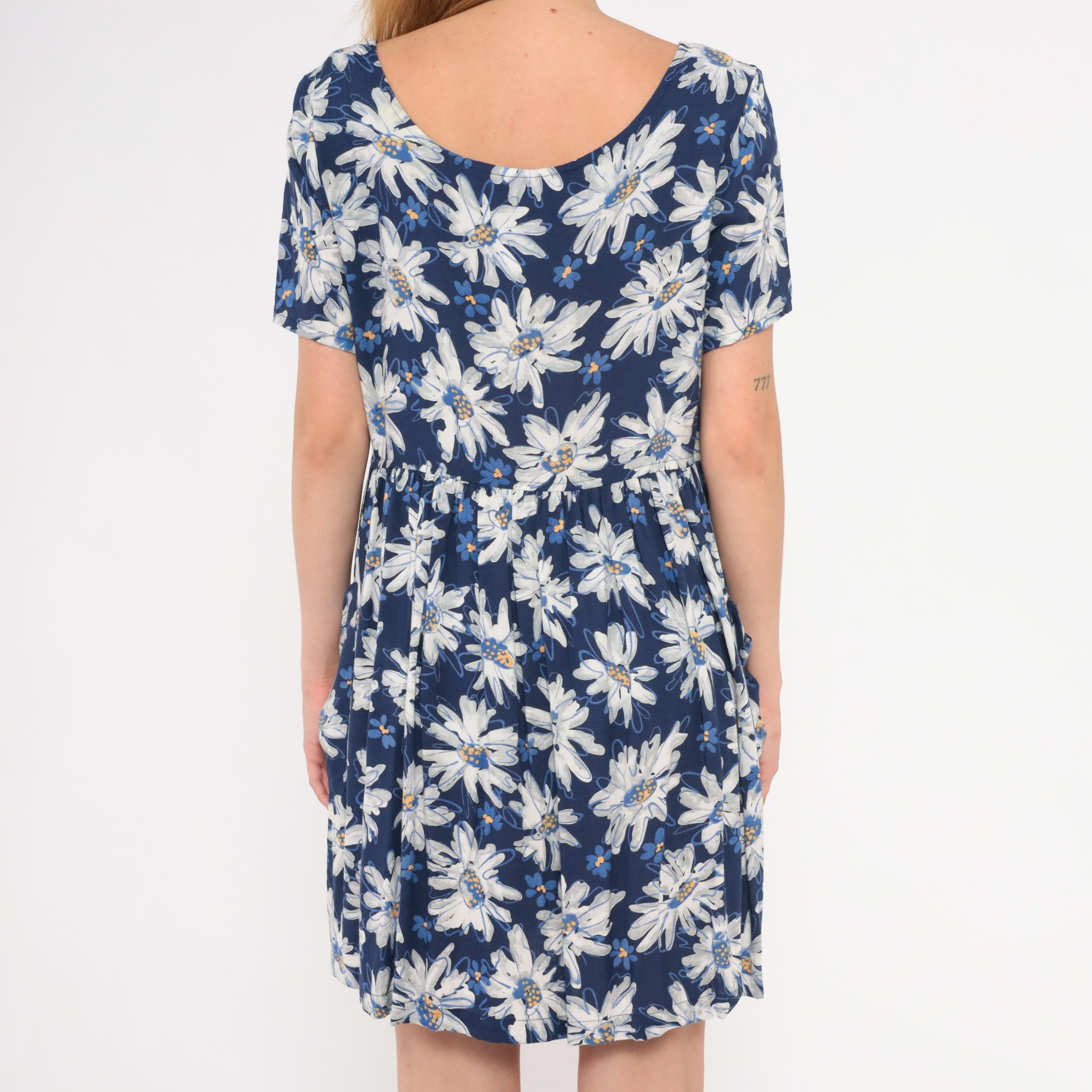 90s navy babydoll dress from Moda Intl with an allover white and blue painted daisy print. Scoop neckline on both front and back, short sleeves, and a fitted bodice with gathered waist seam. A-line skirt with front patch pockets, falling above the knee.