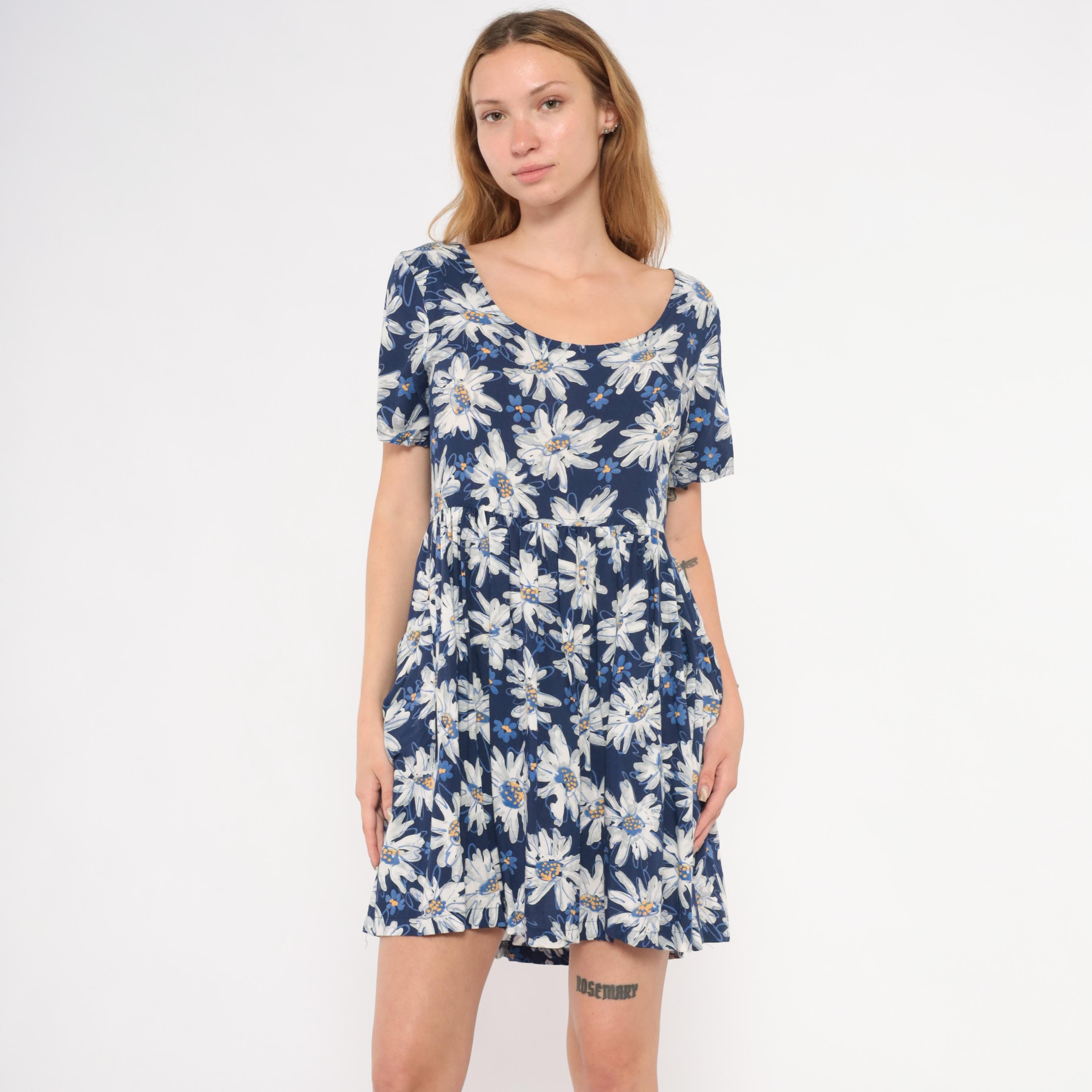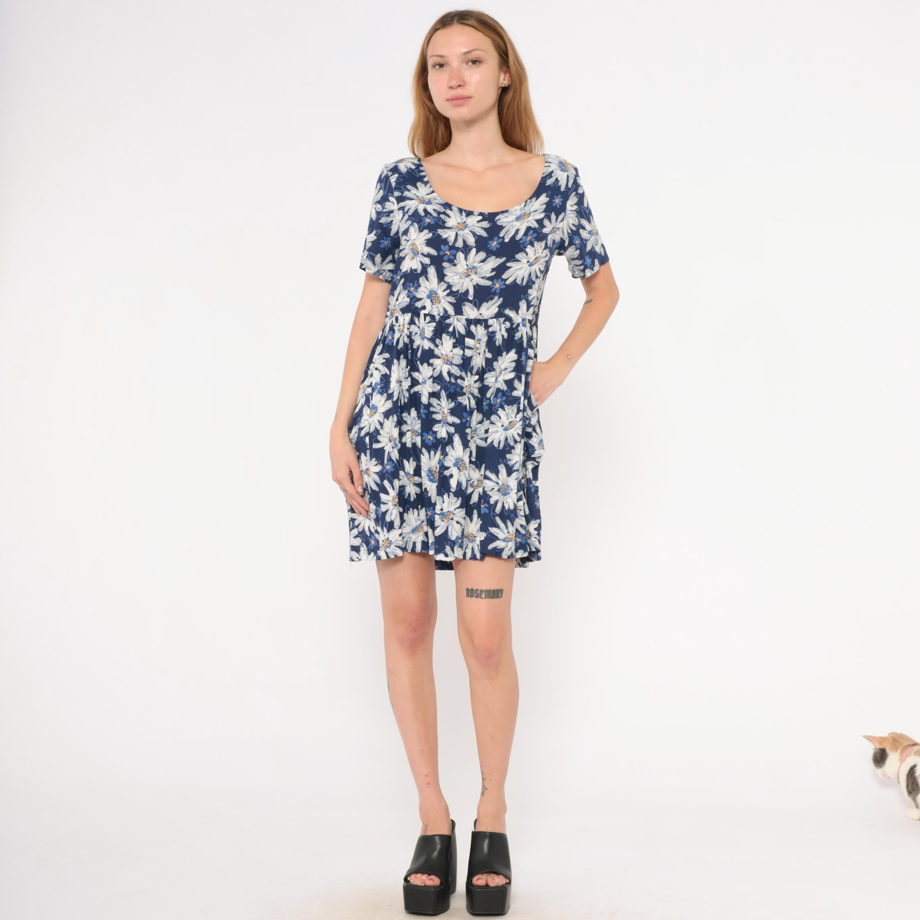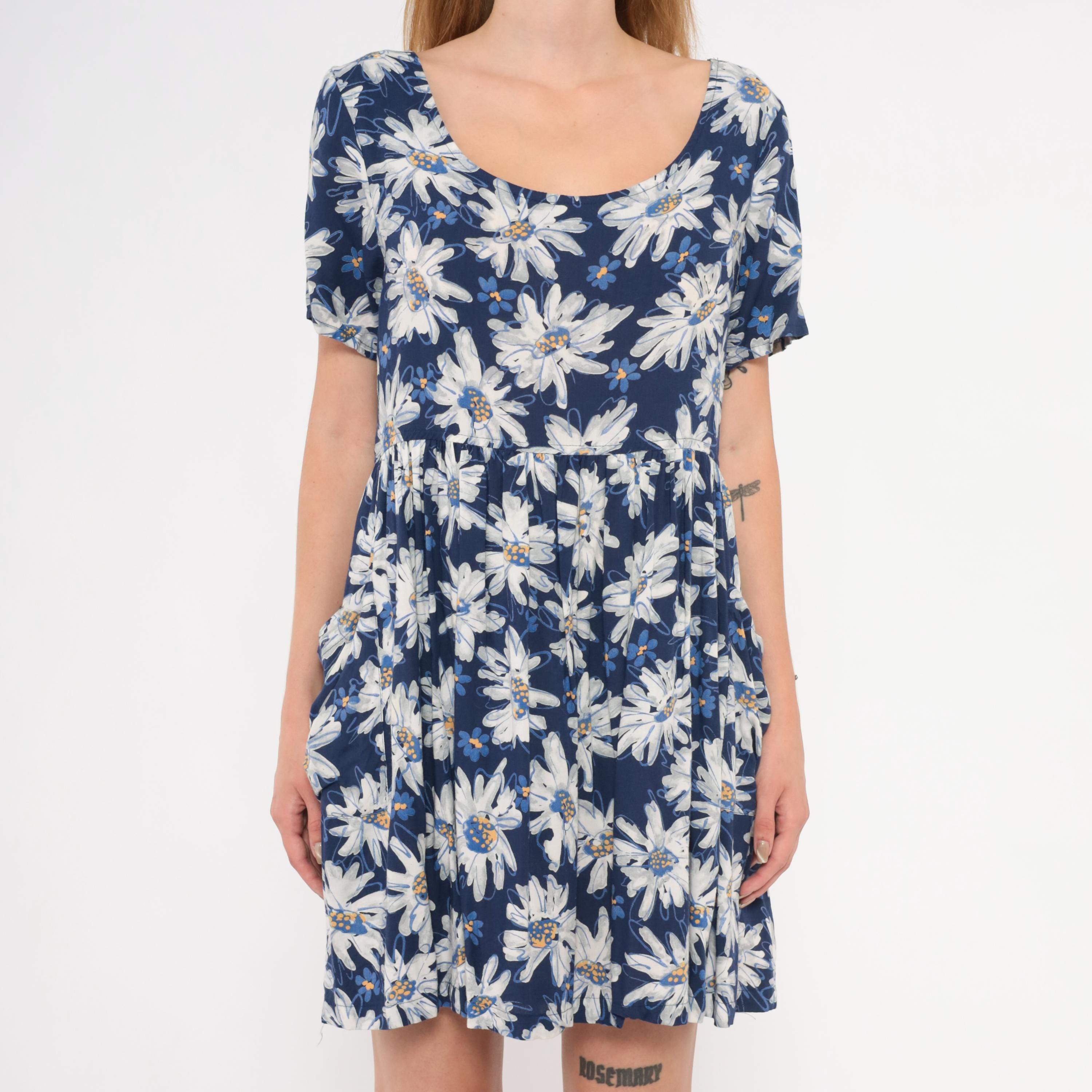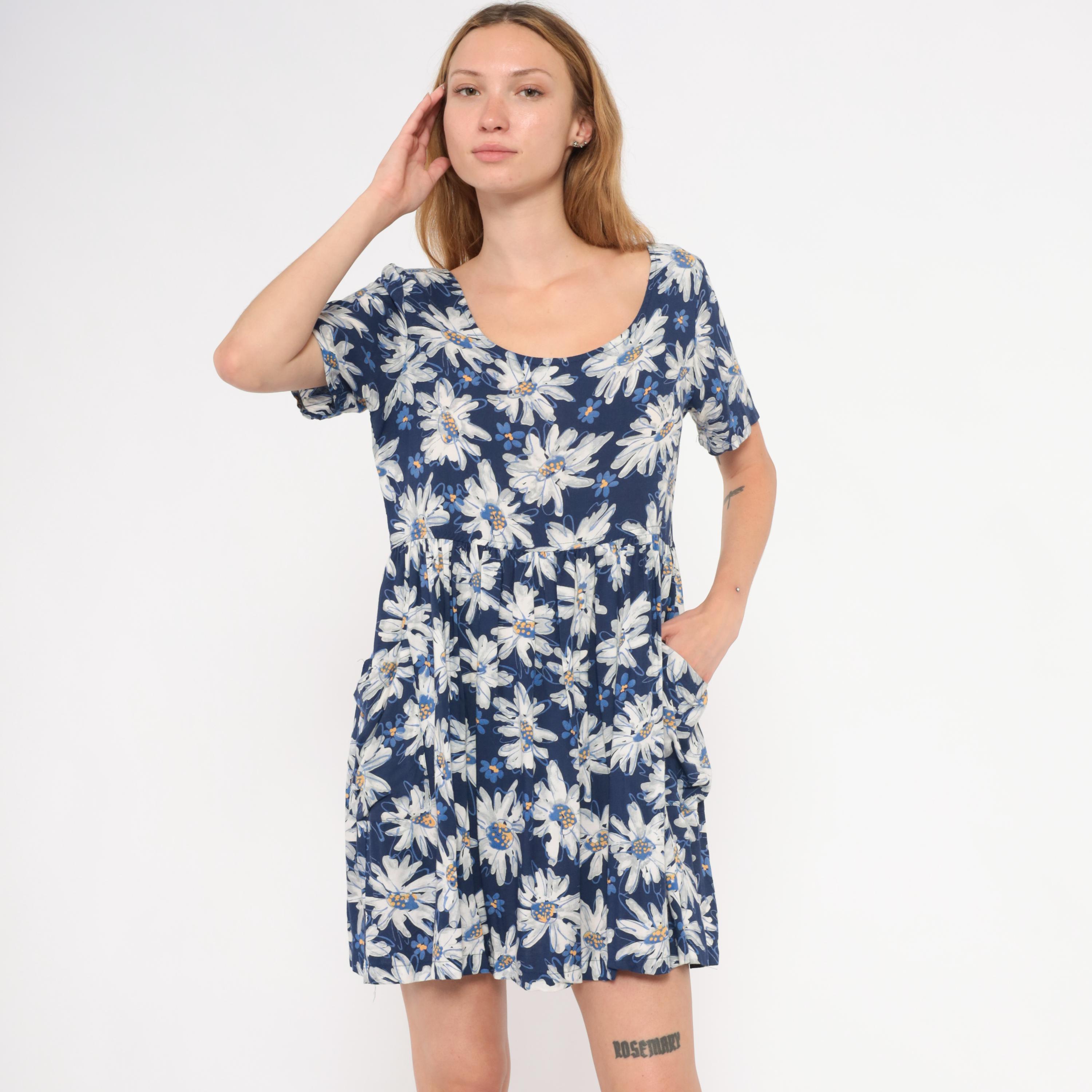 90s navy babydoll dress from Moda Intl with an allover white and blue painted daisy print. Scoop neckline on both front and back, short sleeves, and a fitted bodice with gathered waist seam. A-line skirt with front patch pockets, falling above the knee.