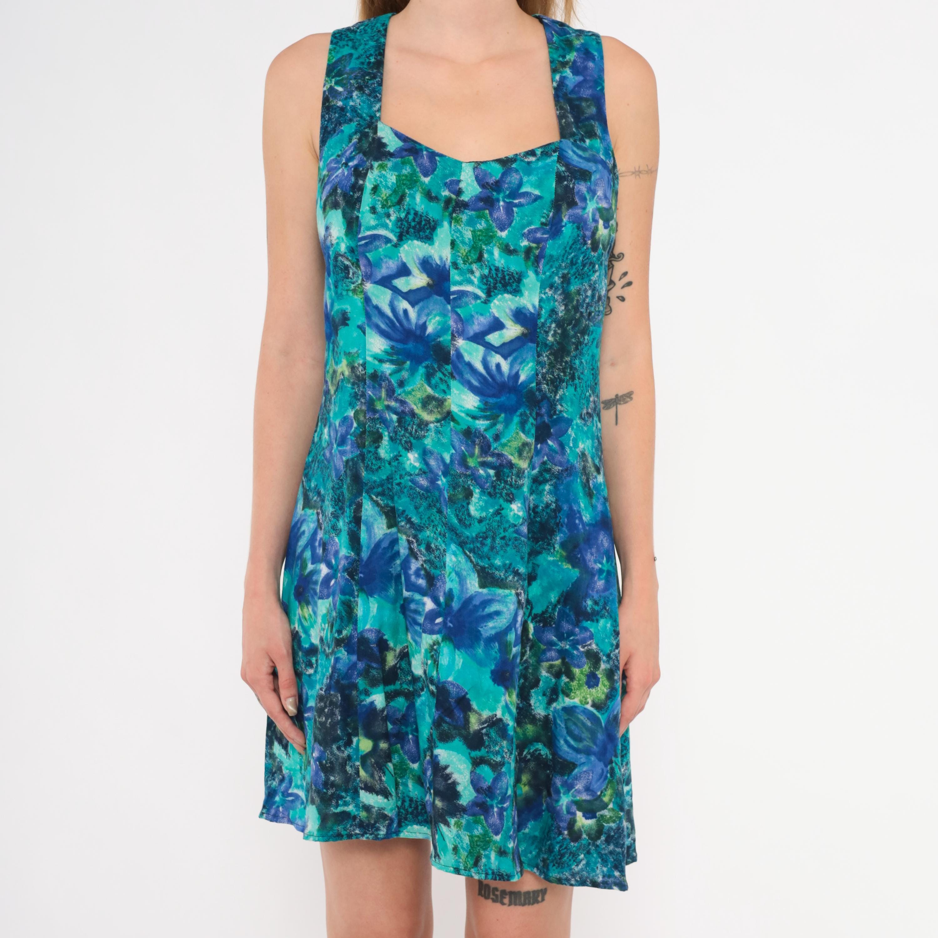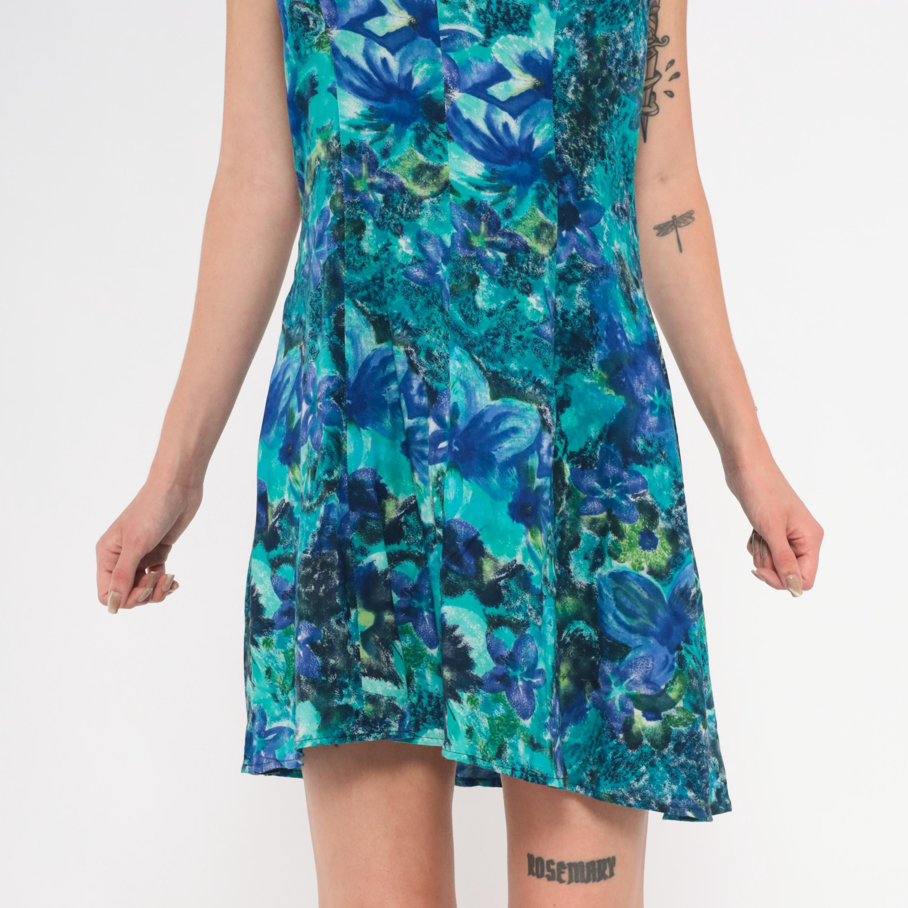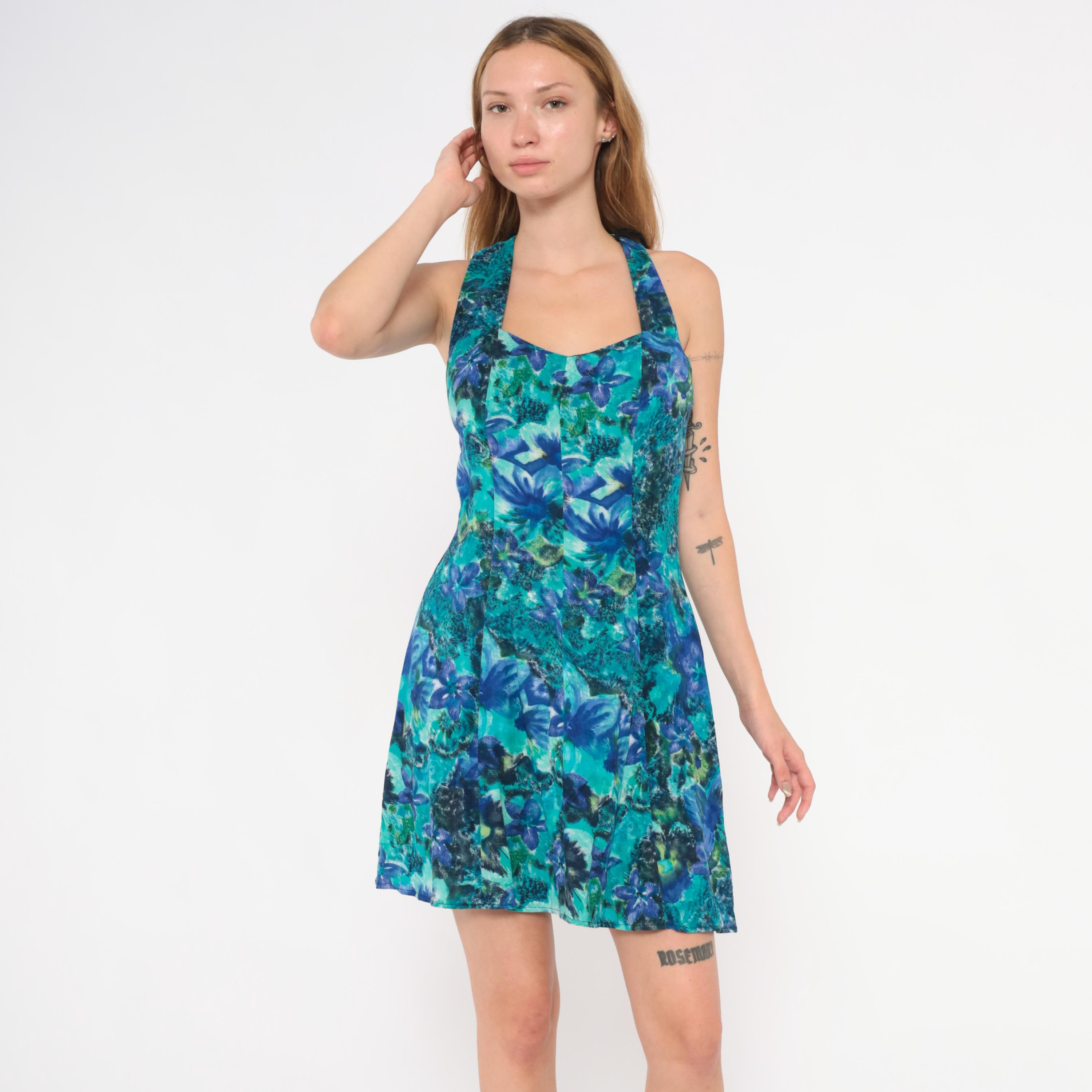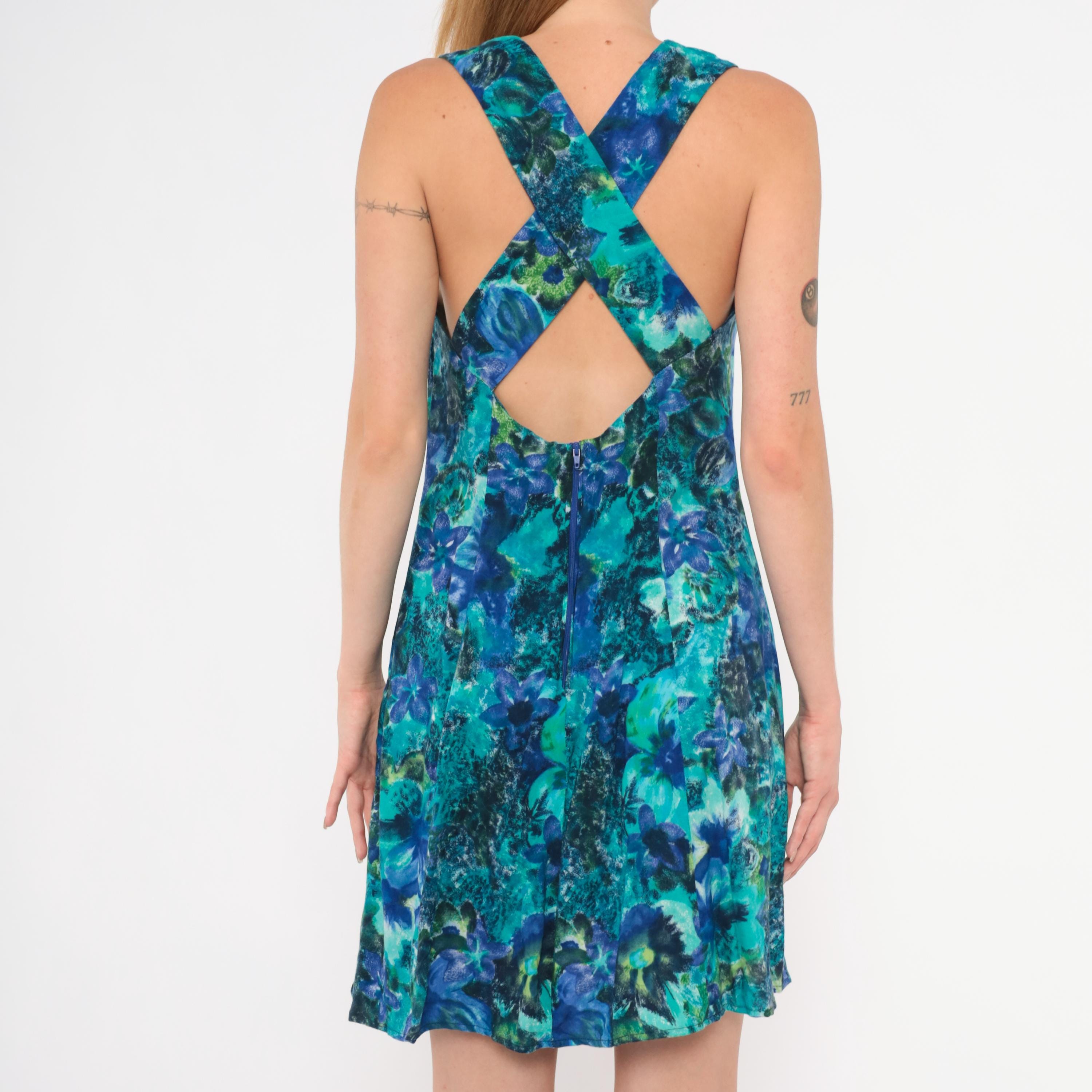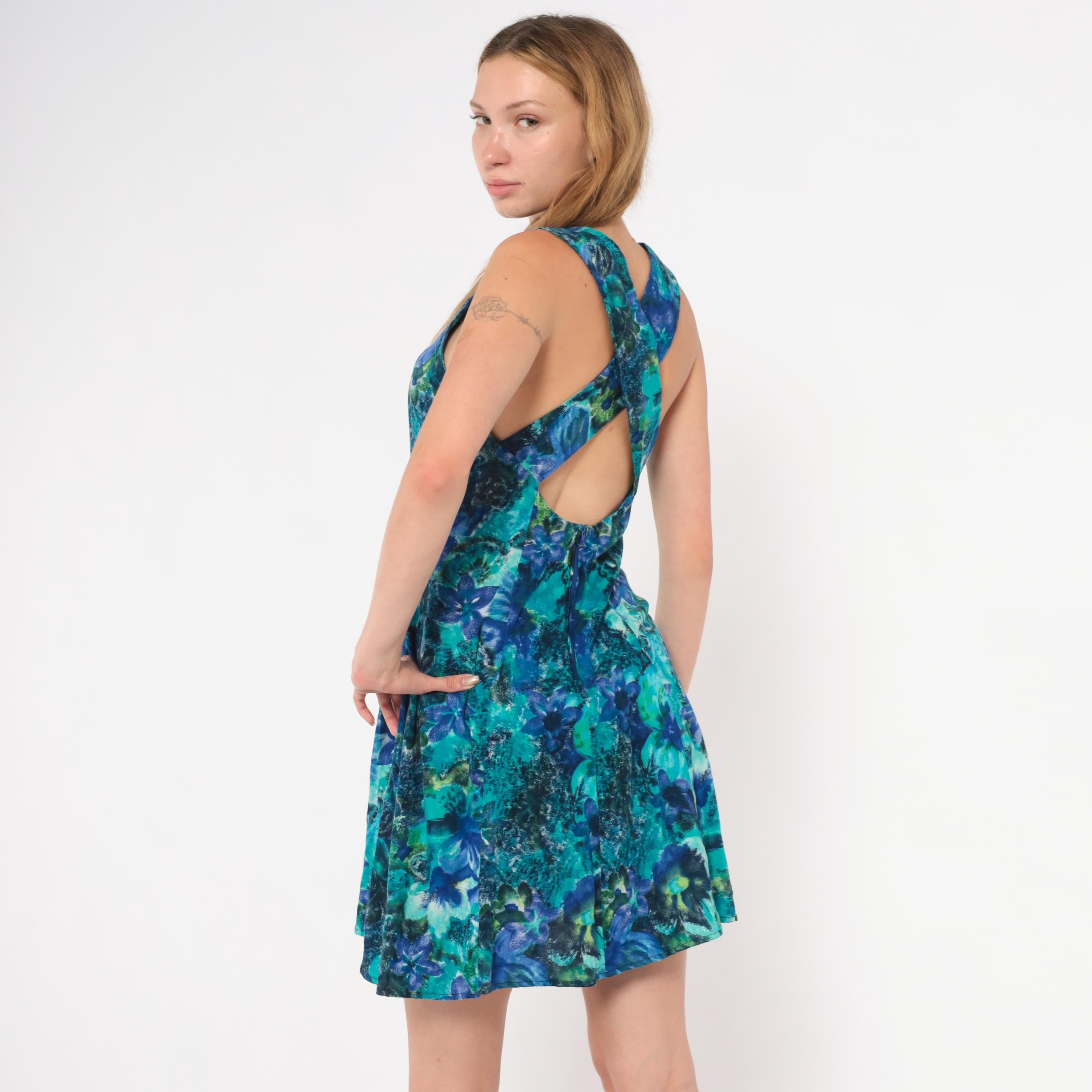90s crossback mini dress in a watercolor tropical floral print with teal, cobalt, green, and navy tones throughout. Sweetheart neckline with wide straps that cross over the open back, forming a diamond-shaped cutout above a center back zipper closure. A-line skirt with paneled construction and a slightly flared hem.