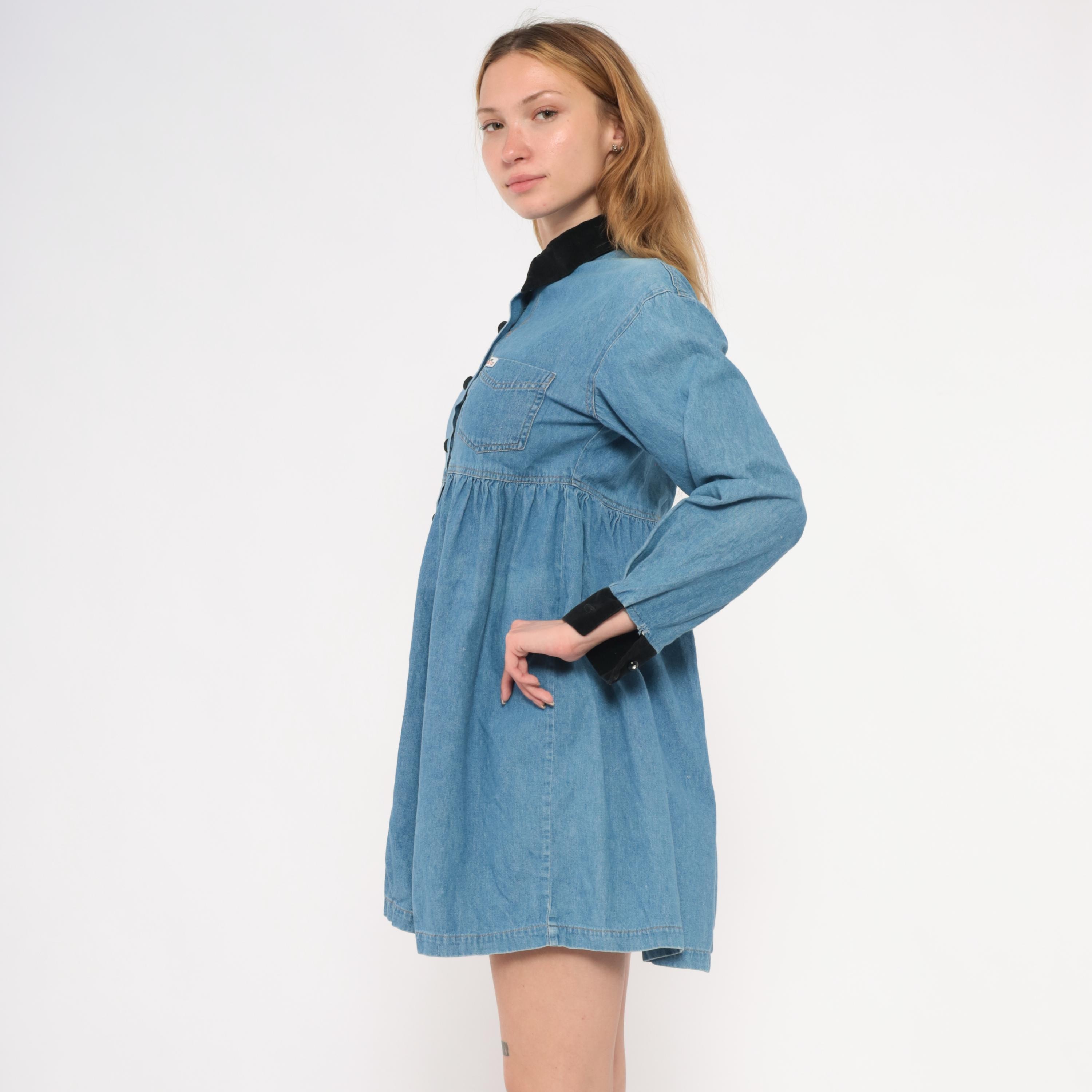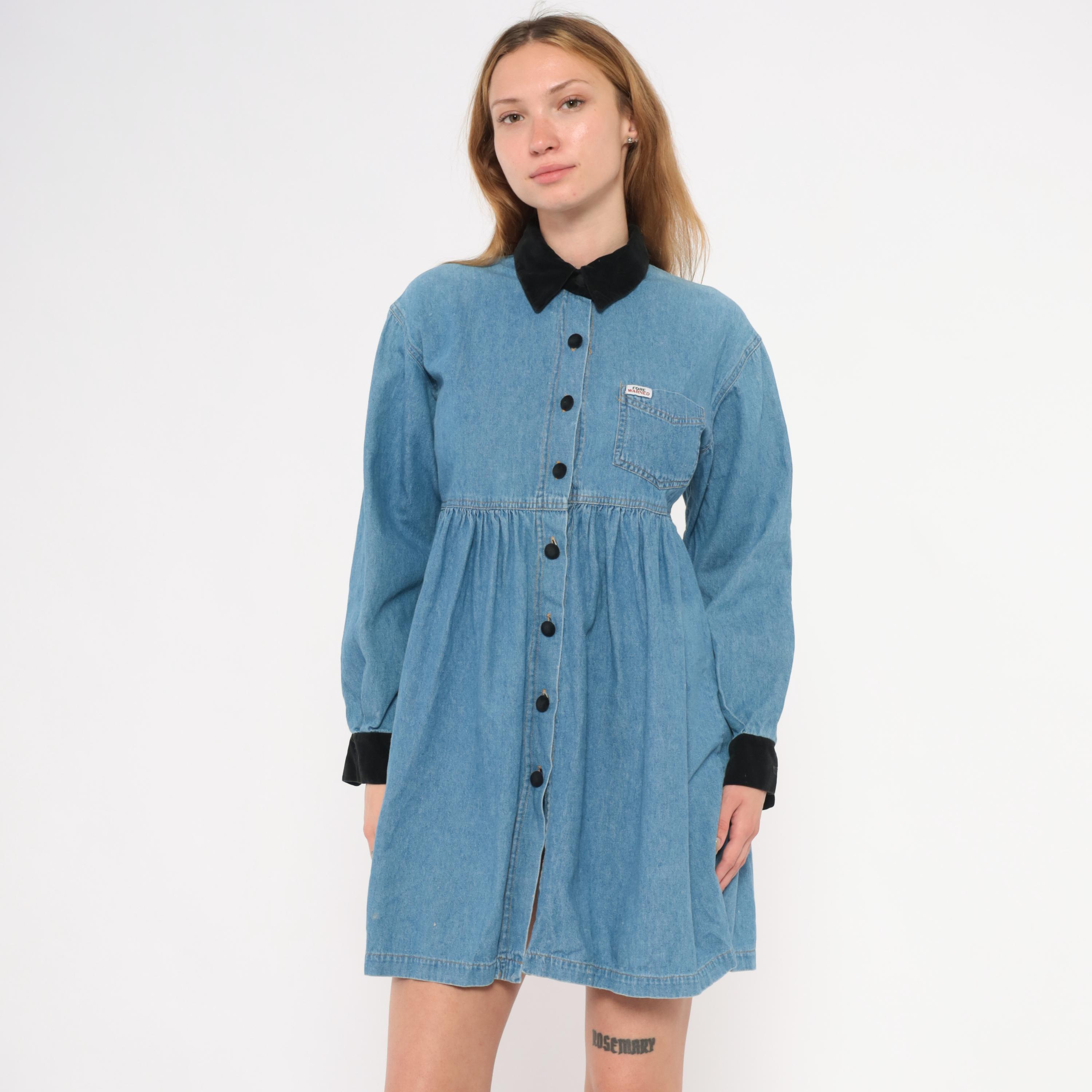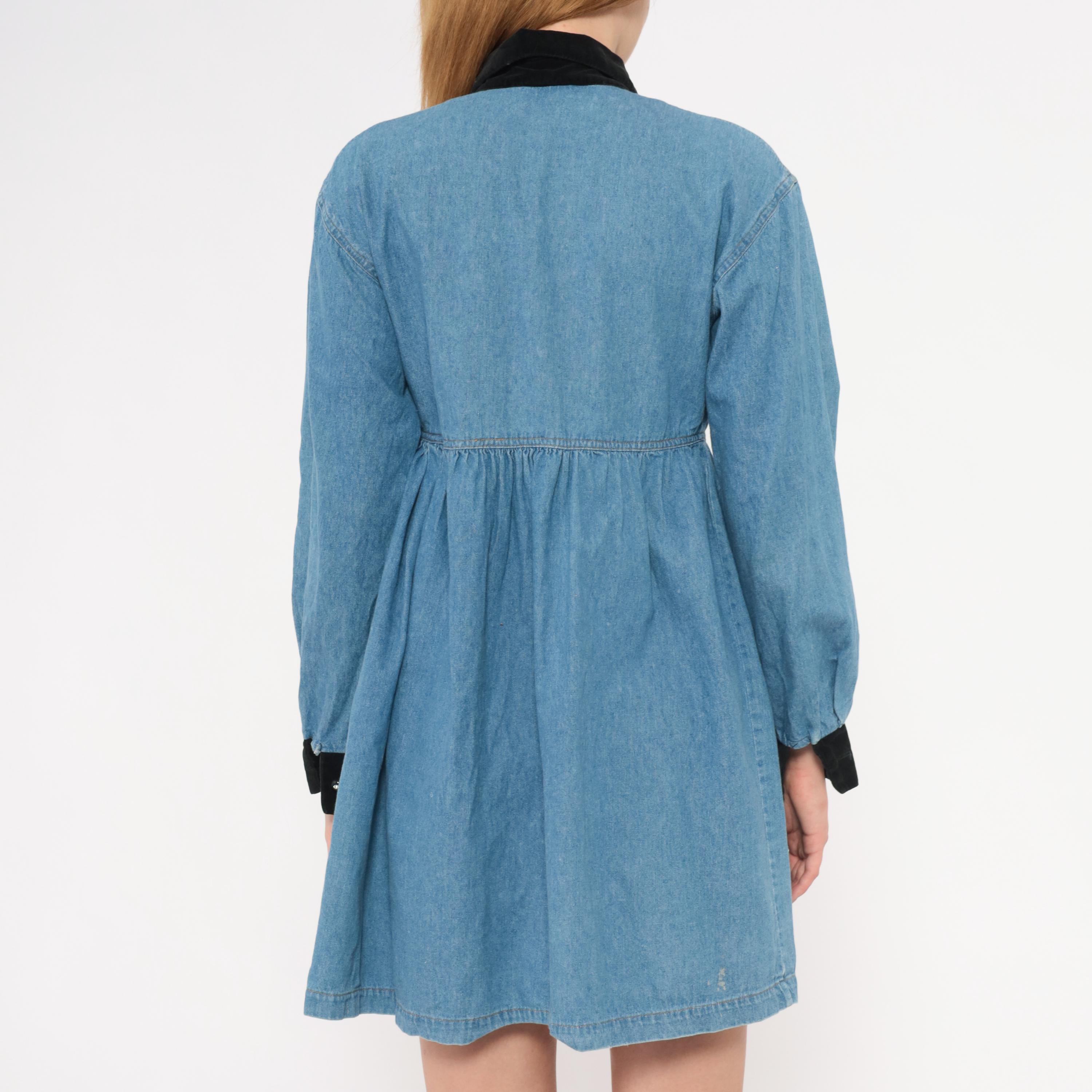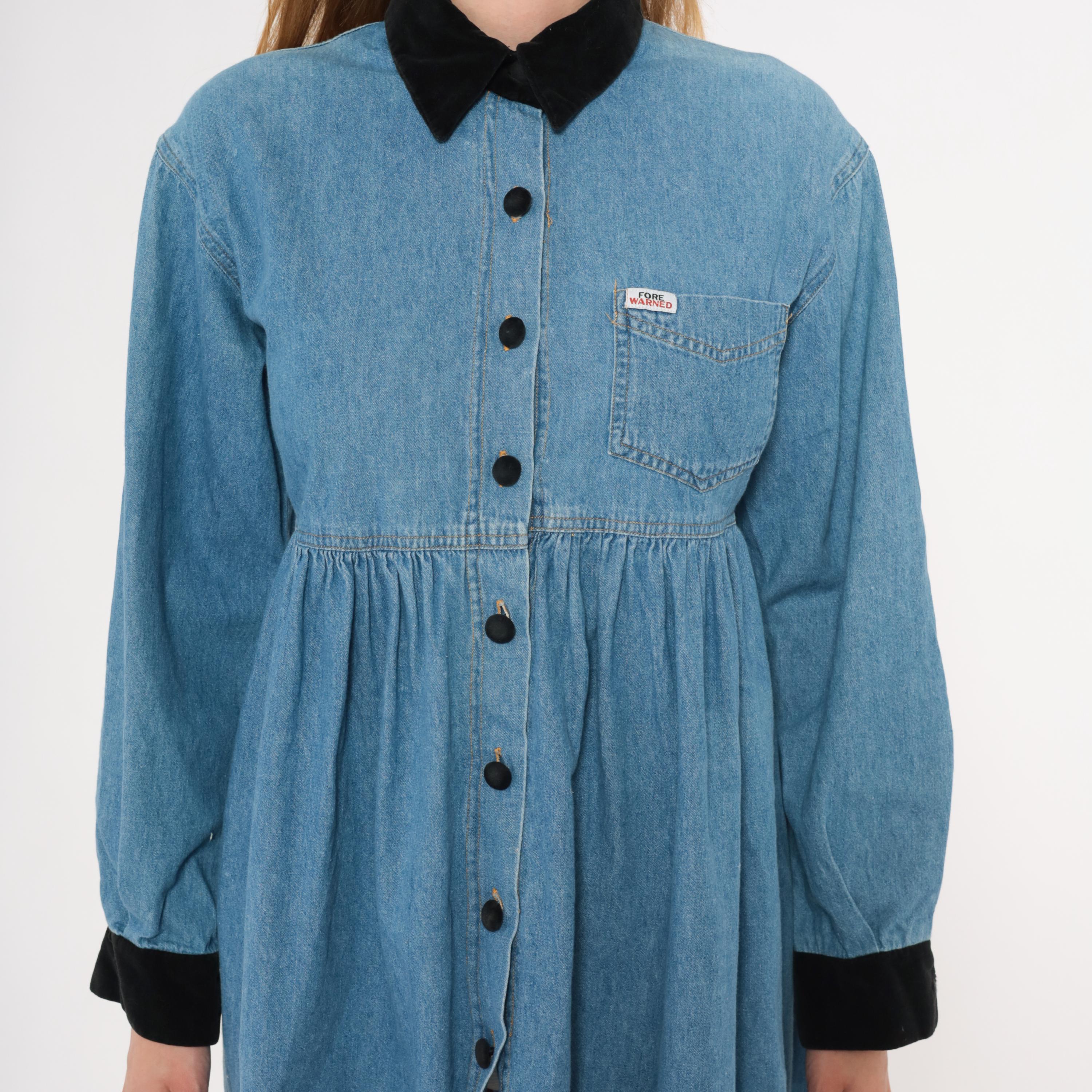 90s denim babydoll dress from Forewarned Jeans with a contrasting black velvet collar and matching velvet cuffs. Button front closure with black buttons running from collar to hem, gathered waist seam, and a single chest pocket with brand label. Long sleeves, A-line skirt, and a relaxed fit through the body.