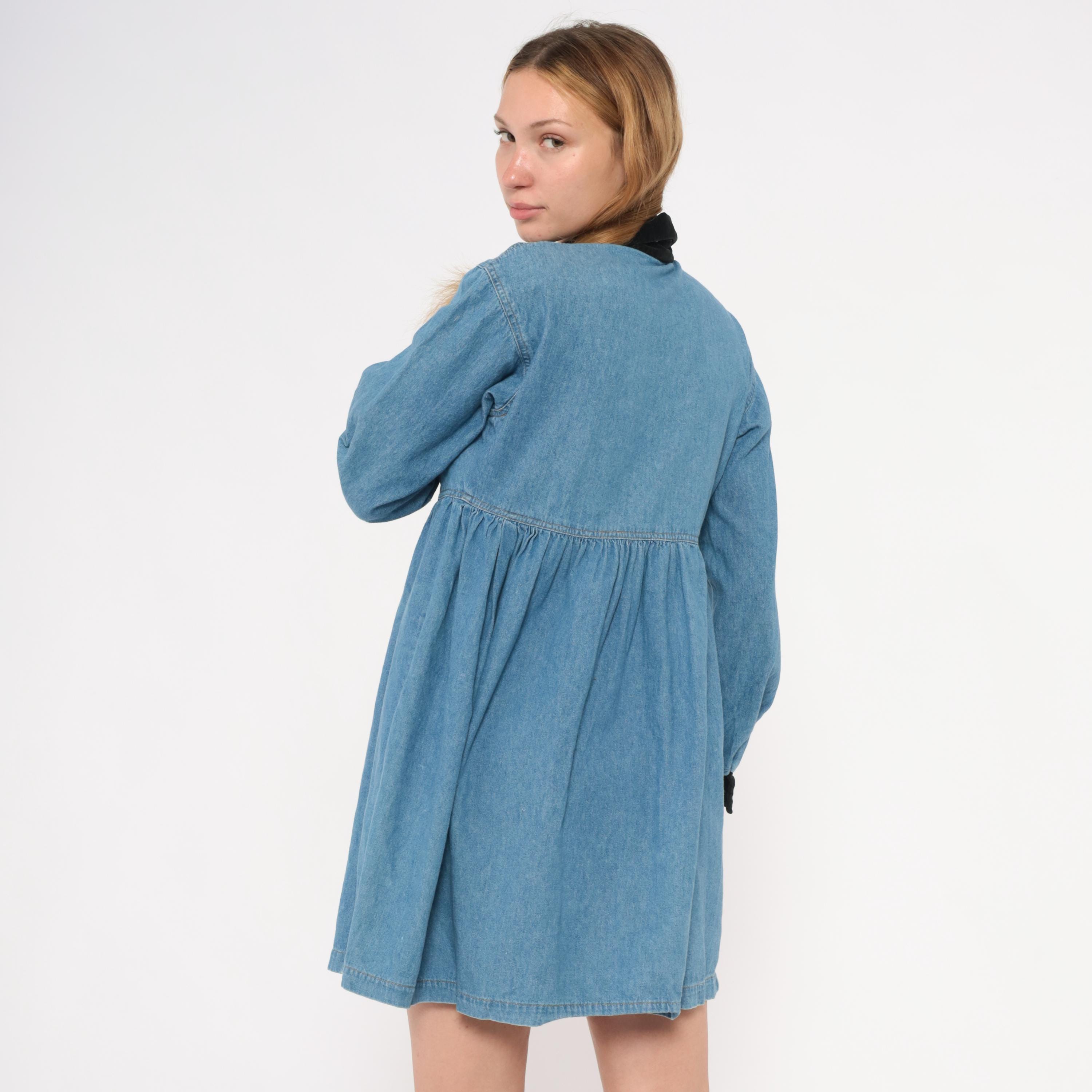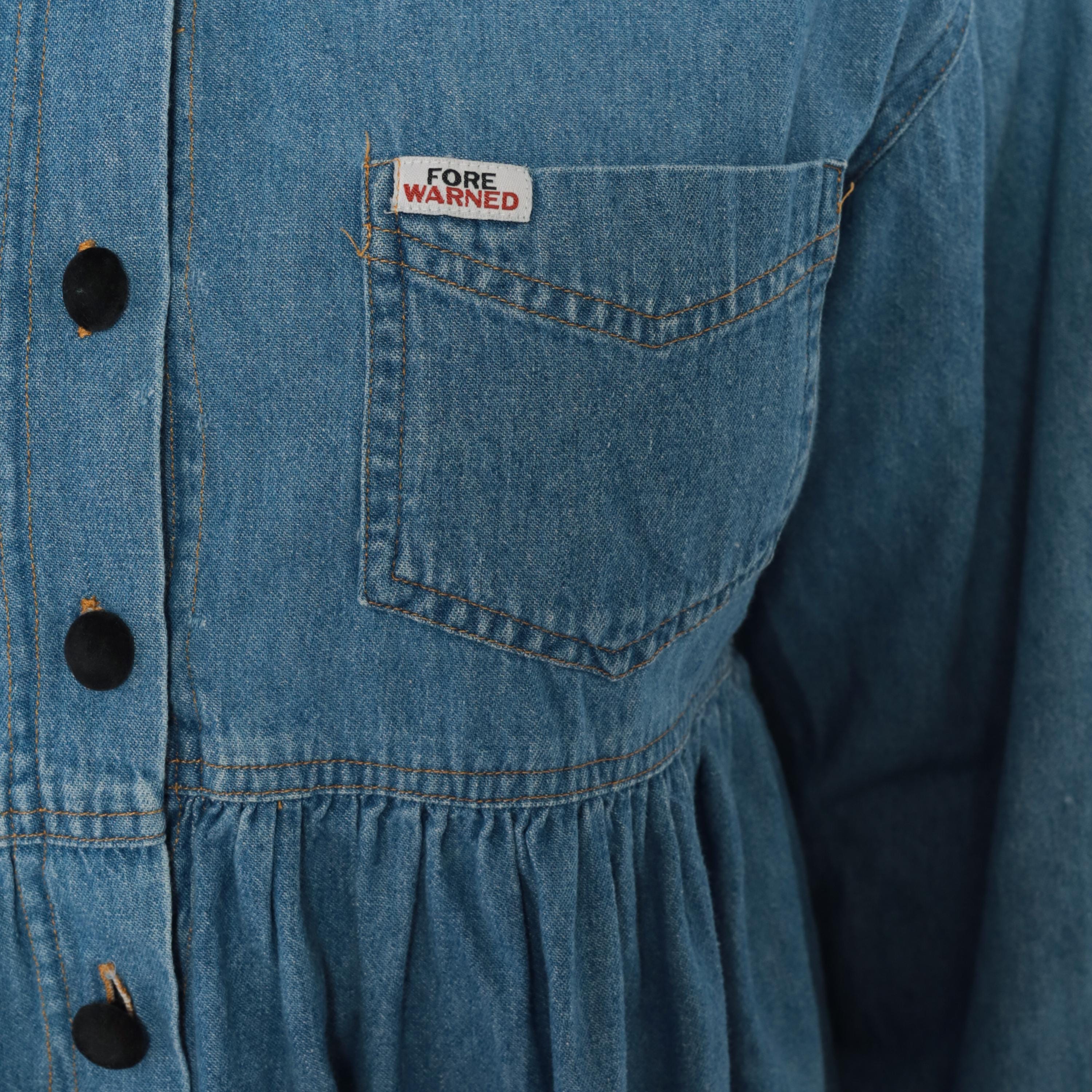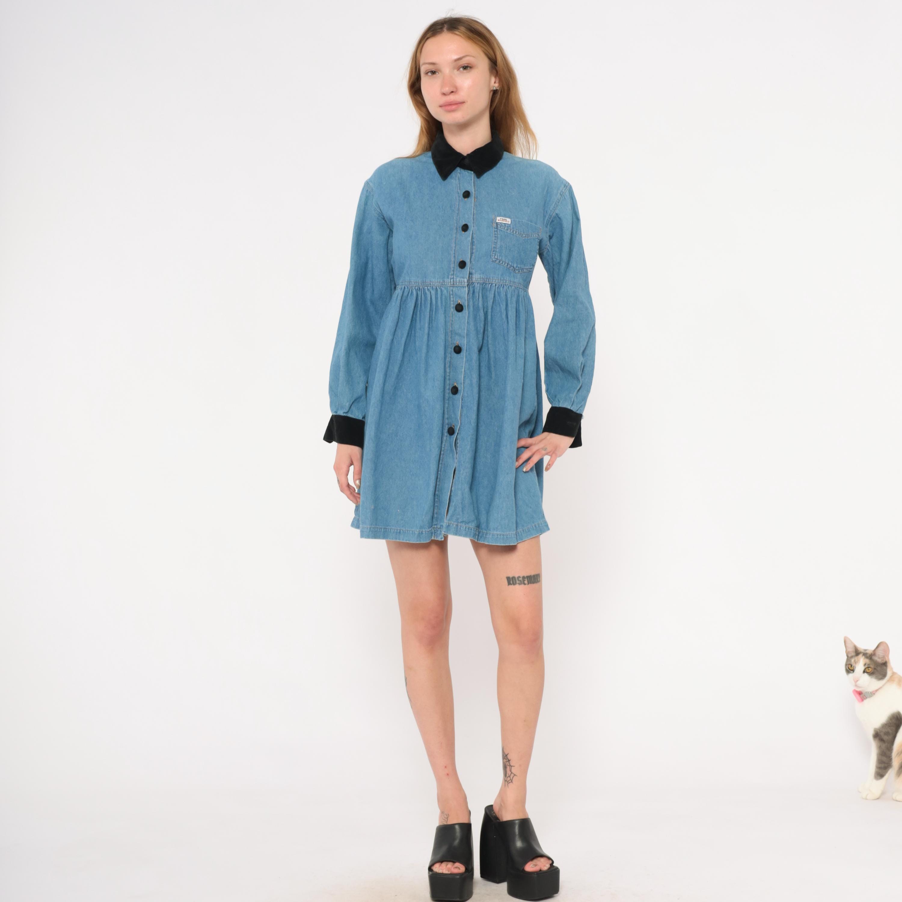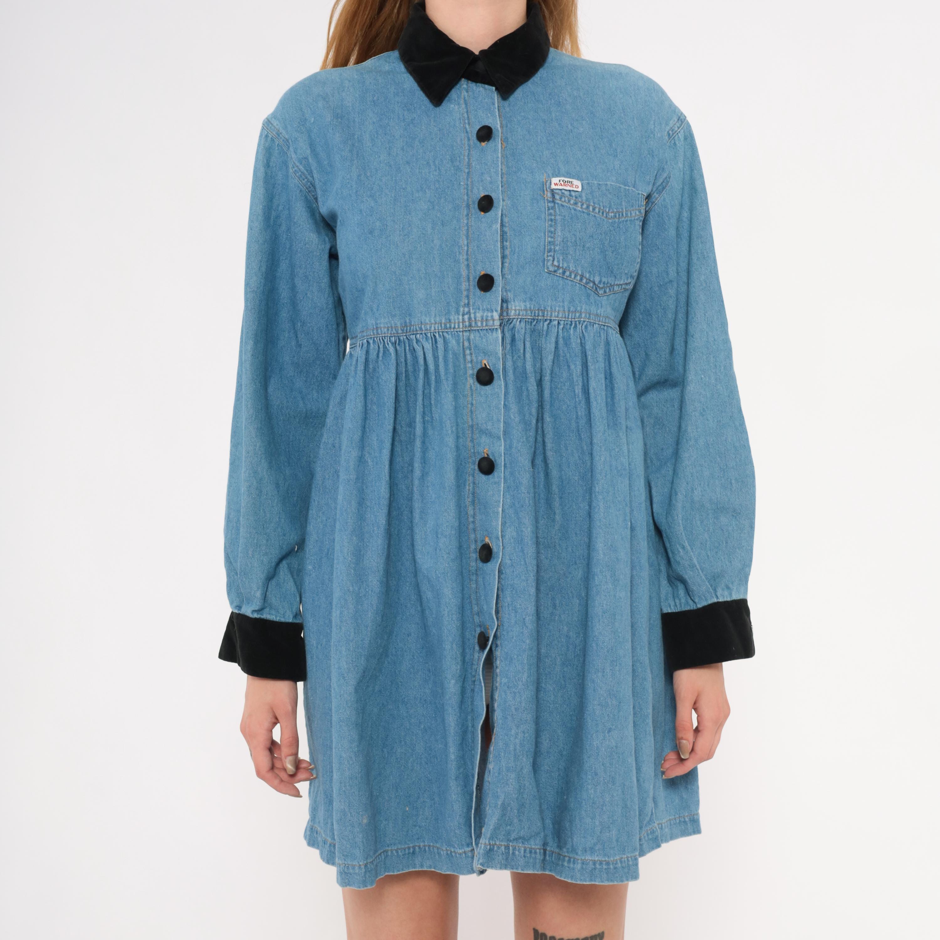 90s denim babydoll dress from Forewarned Jeans with a contrasting black velvet collar and matching velvet cuffs. Button front closure with black buttons running from collar to hem, gathered waist seam, and a single chest pocket with brand label. Long sleeves, A-line skirt, and a relaxed fit through the body.