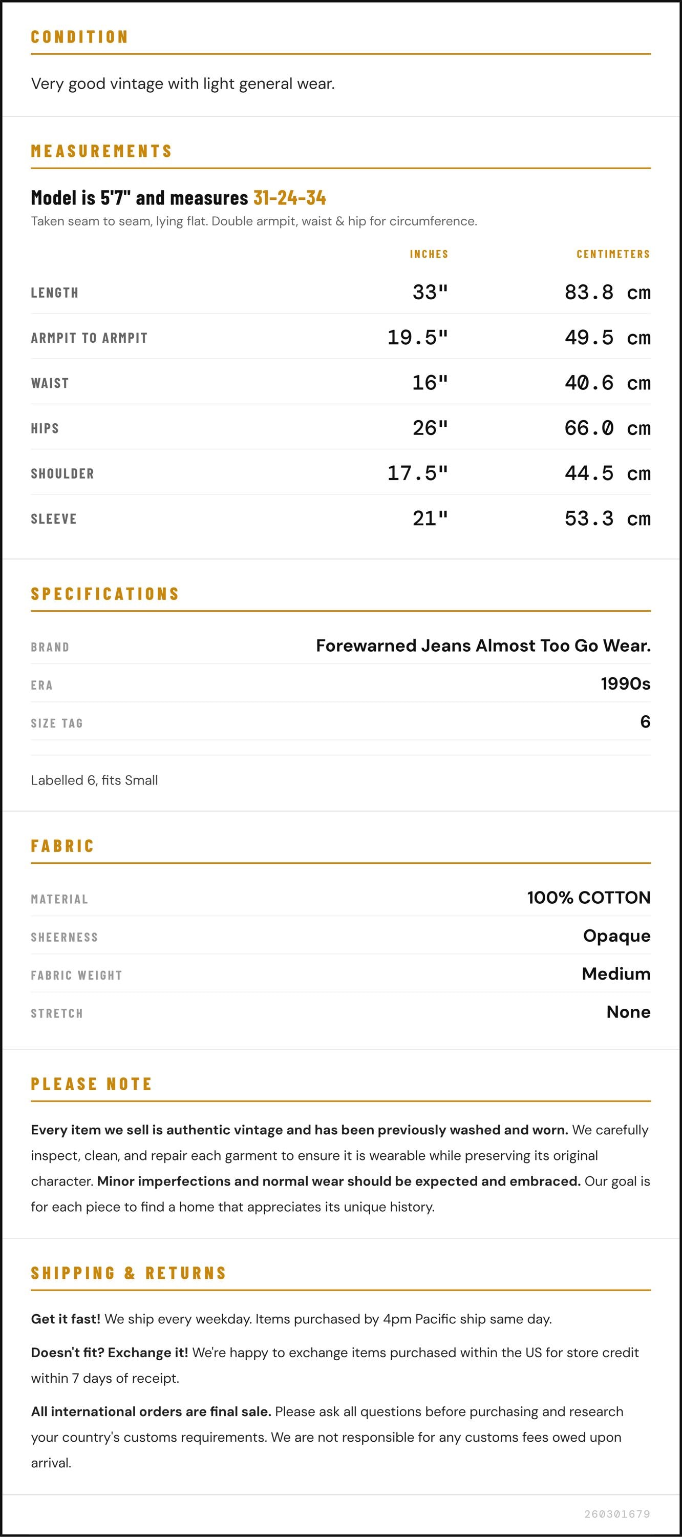 Vintage denim was usually made without any stretch, unlike modern jeans. Check the measurements to ensure proper fit, and remember to give yourself a little wiggle room in the waist and hips, depending on your preferred fit.