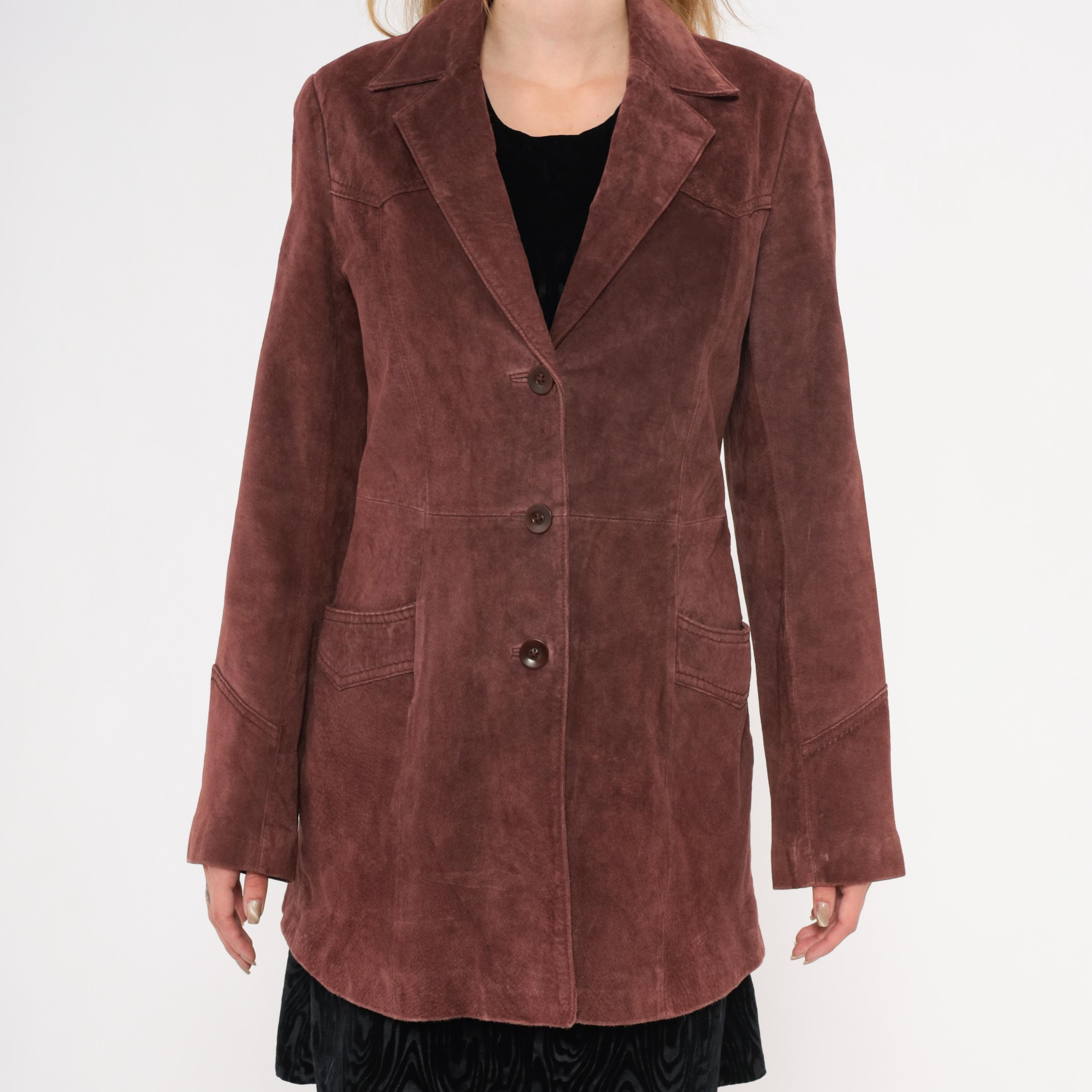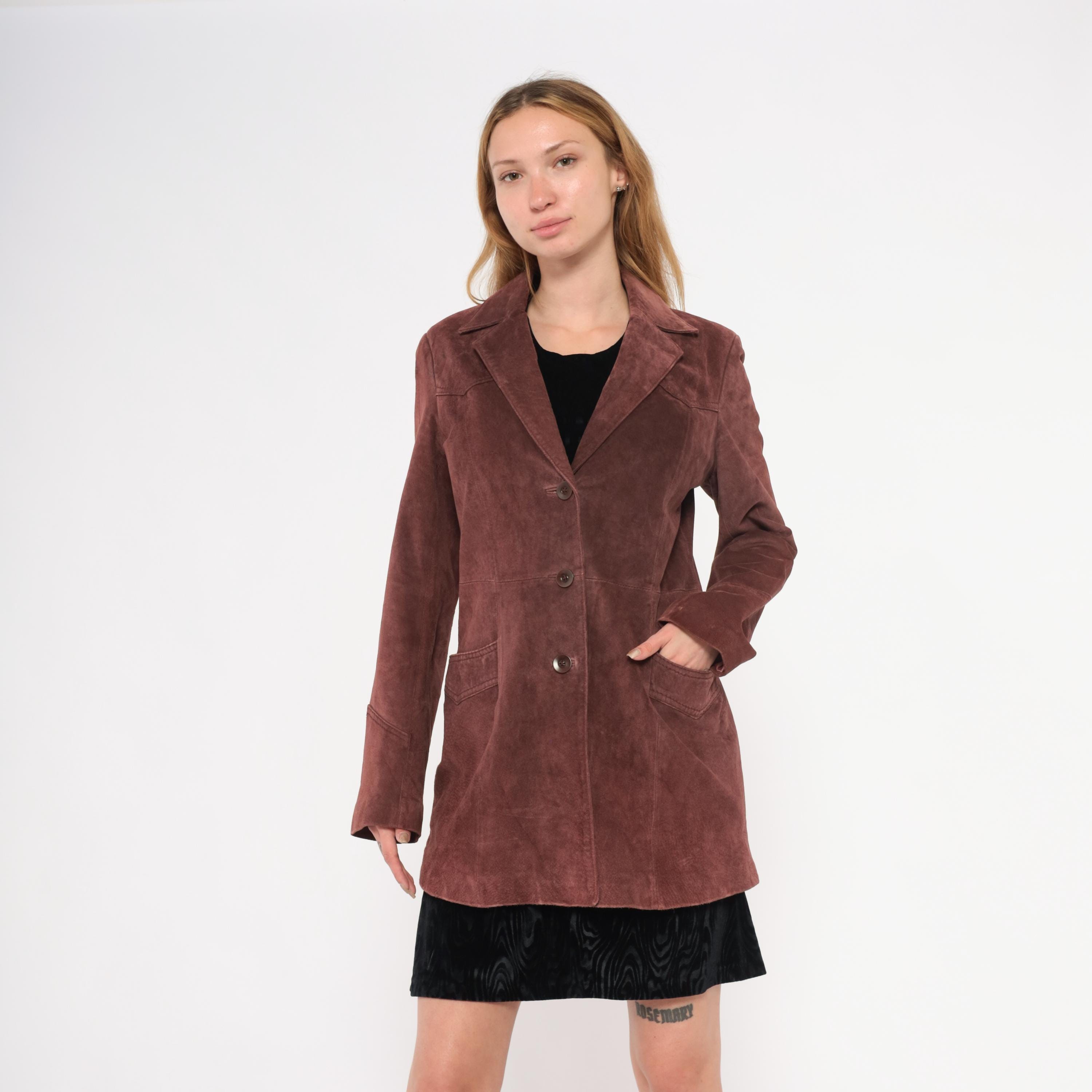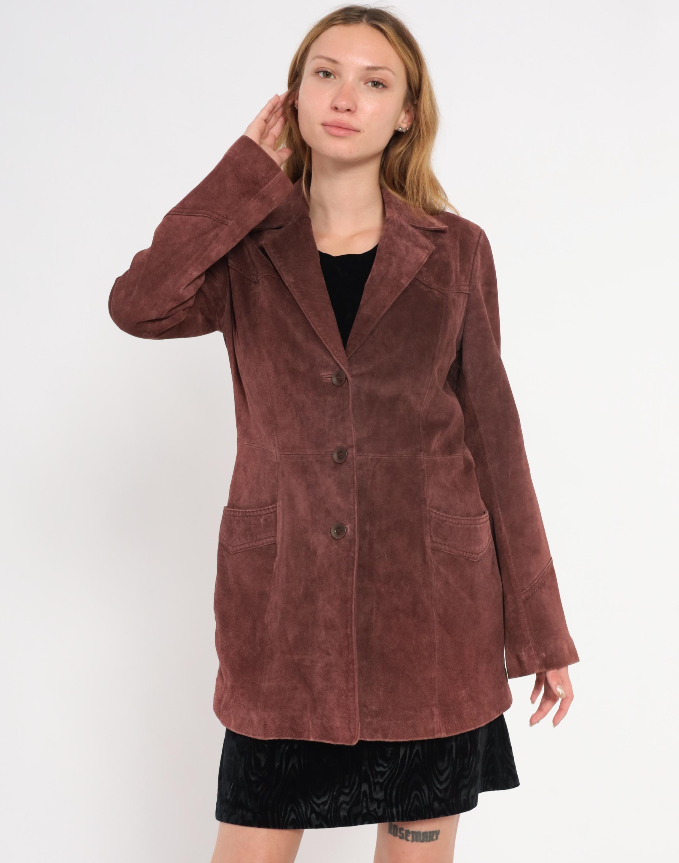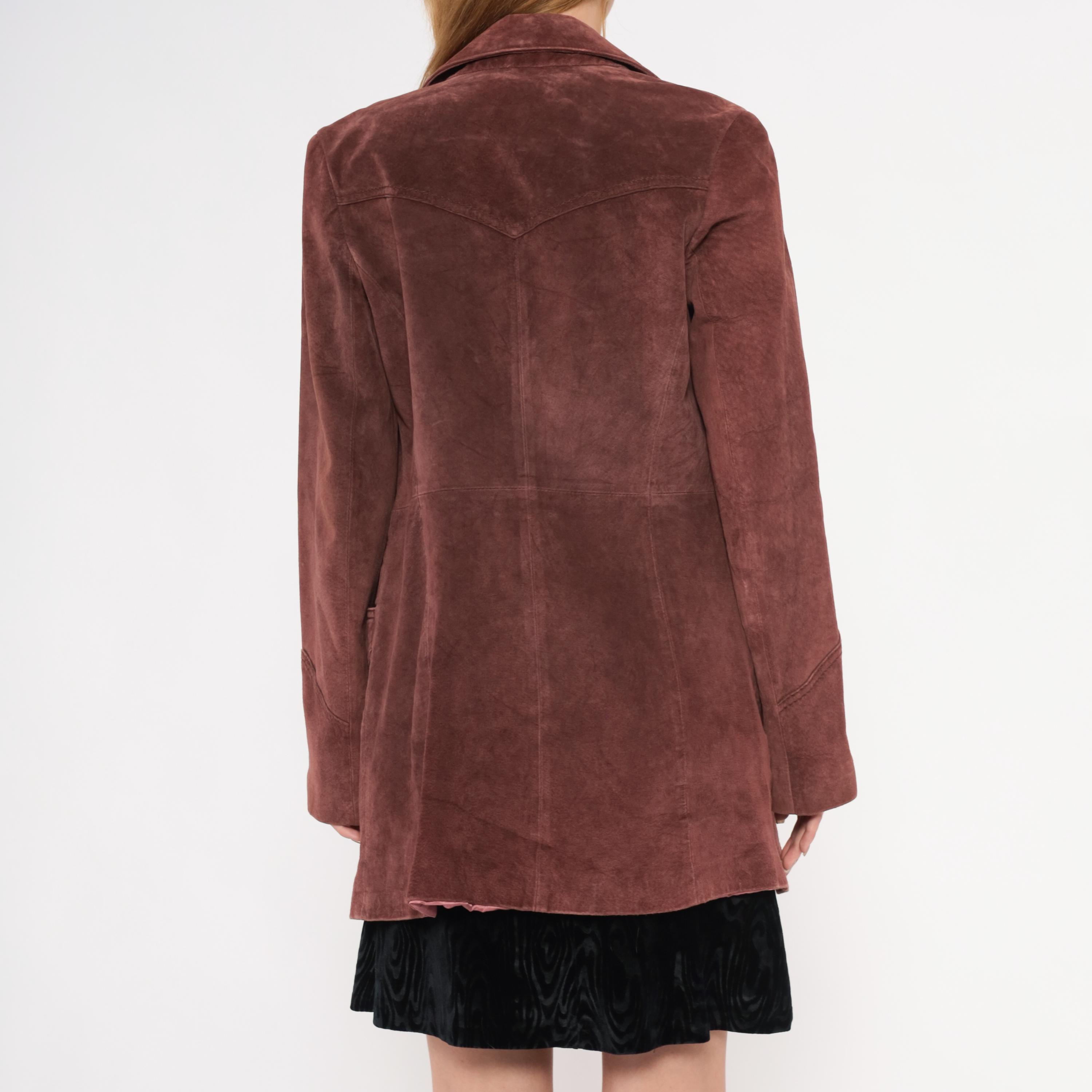 Burgundy suede blazer from the 2000s with notched lapel collar and three-button front closure. Long-line cut ending at mid-hip with two front patch pockets and Western-inspired back yoke seaming. Long sleeves with straight cuffs in a rich wine-to-plum tone throughout.