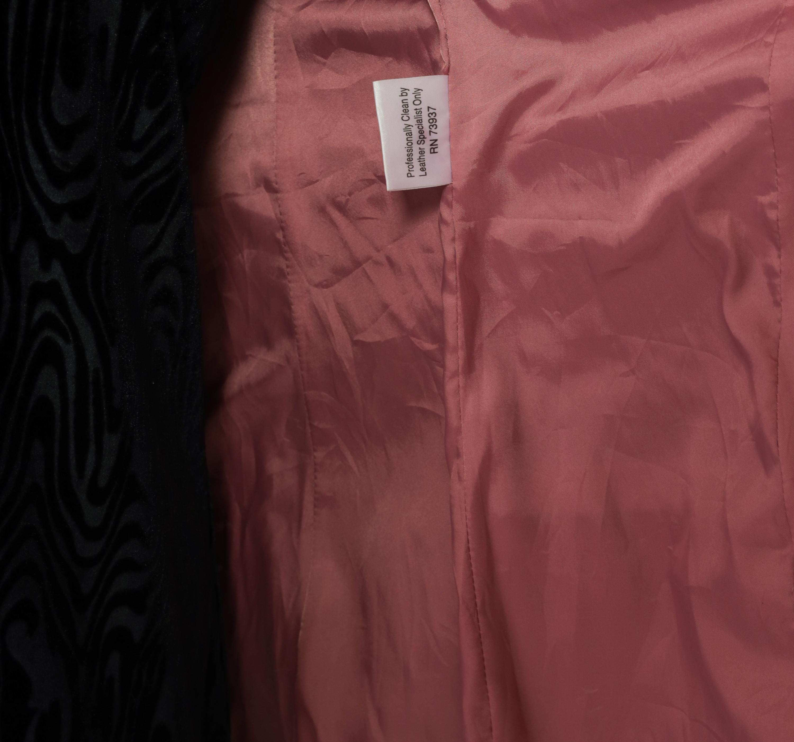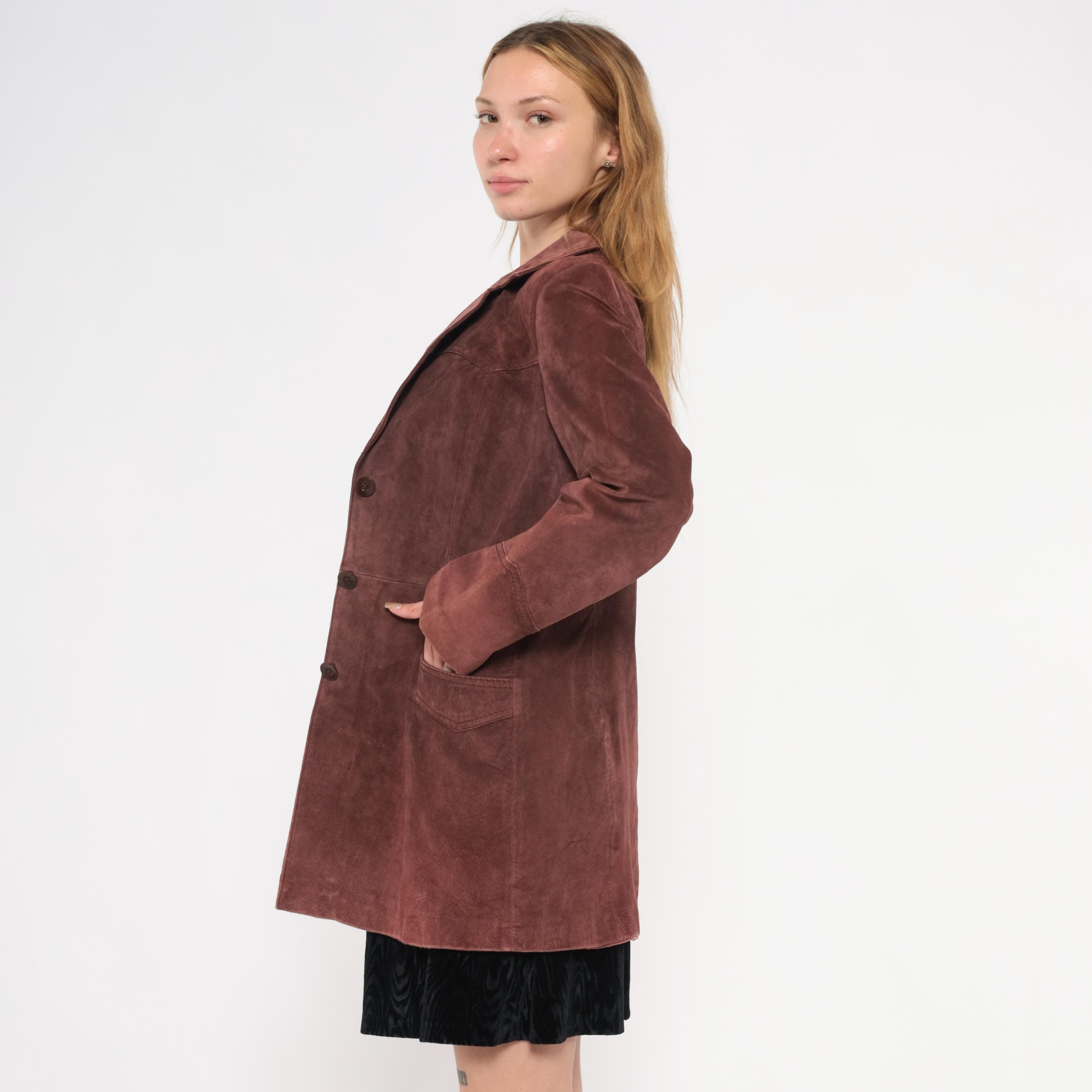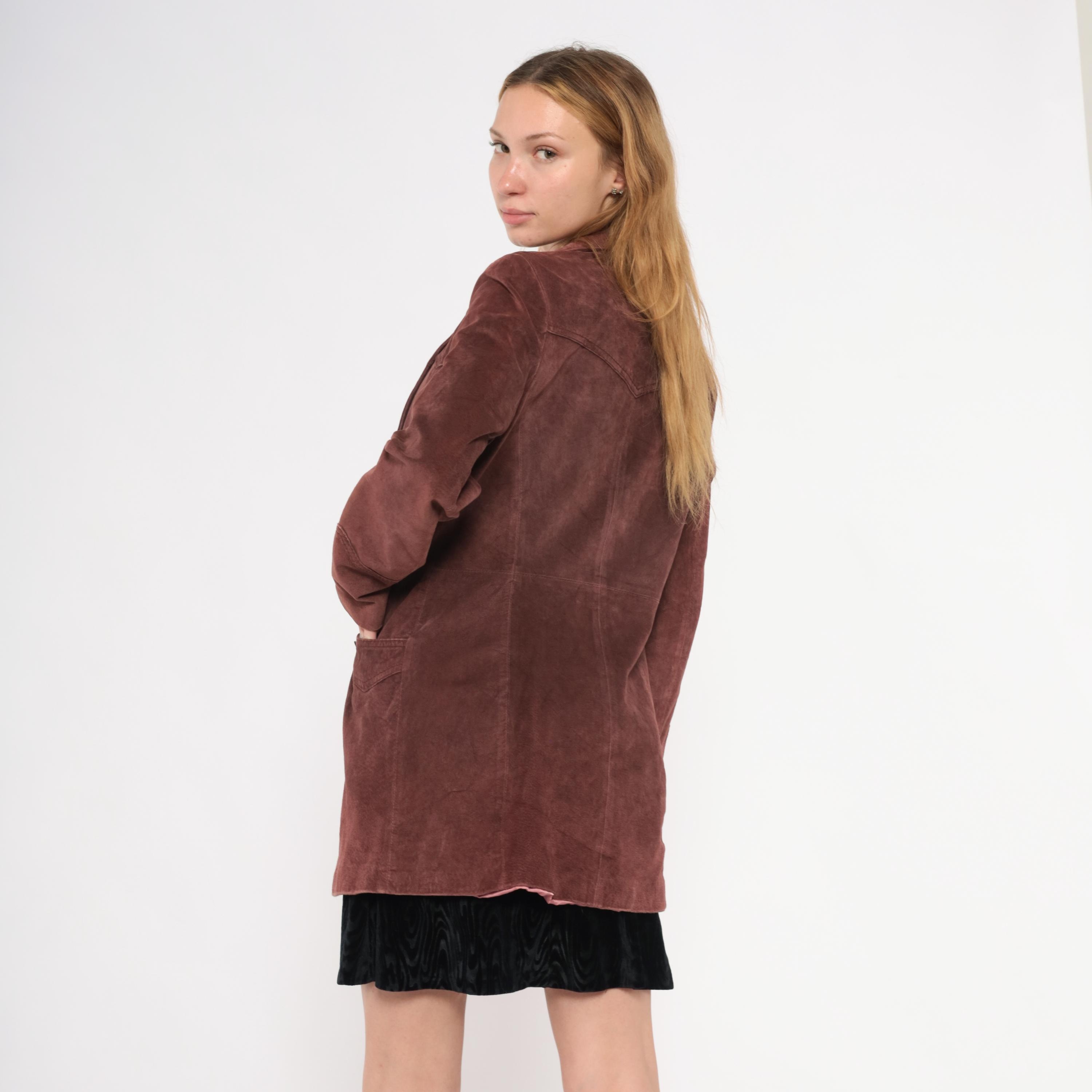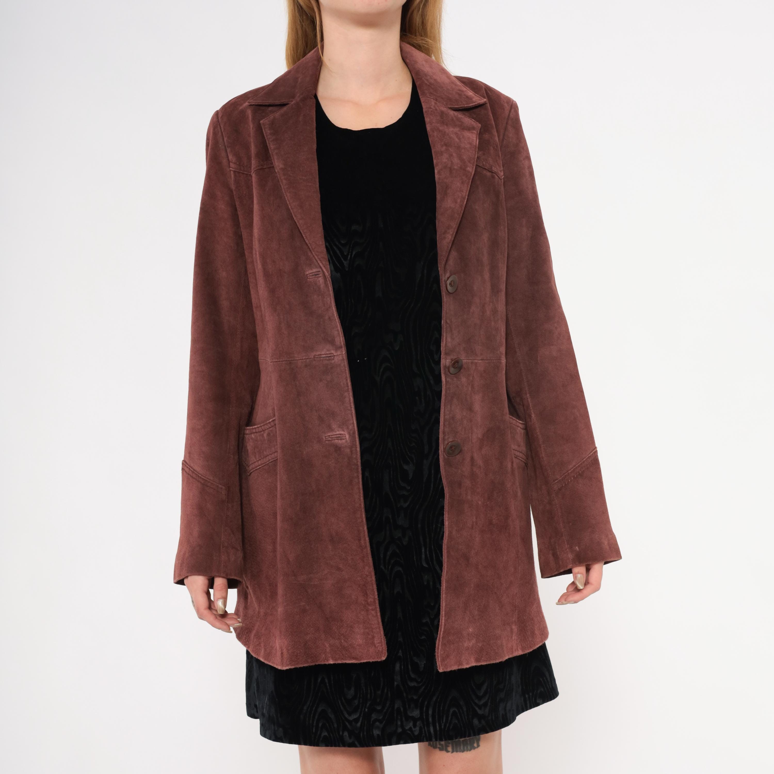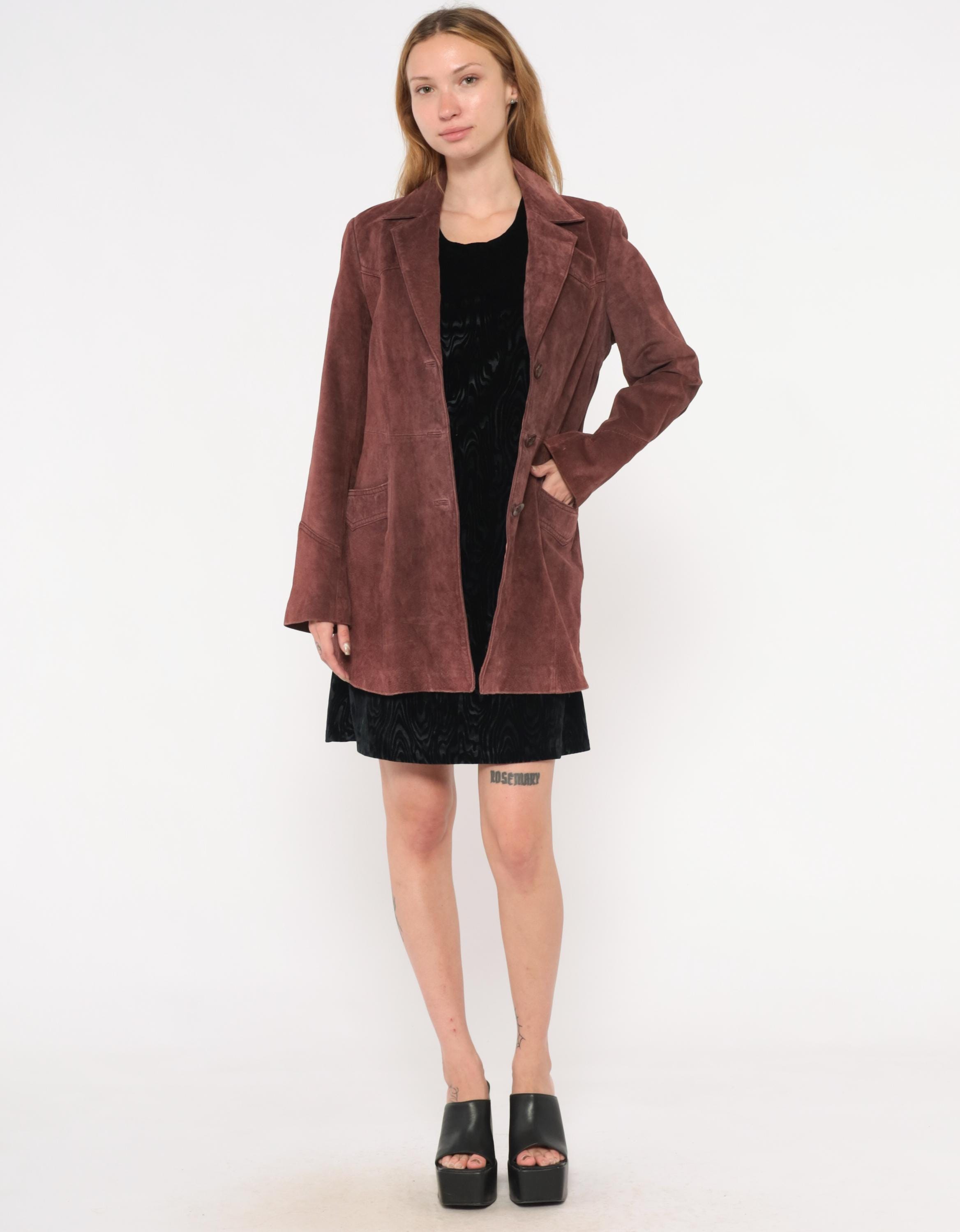 Burgundy suede blazer from the 2000s with notched lapel collar and three-button front closure. Long-line cut ending at mid-hip with two front patch pockets and Western-inspired back yoke seaming. Long sleeves with straight cuffs in a rich wine-to-plum tone throughout.