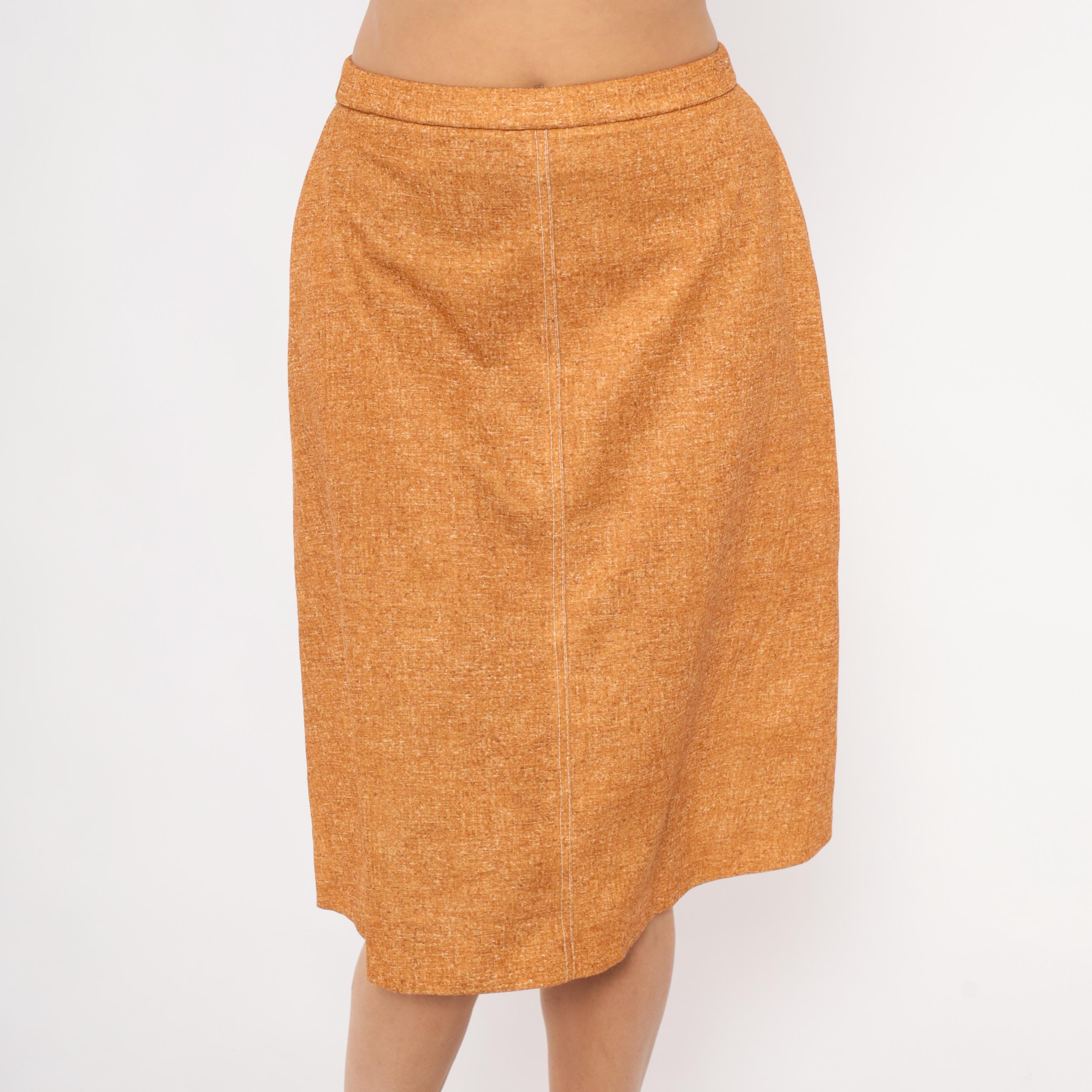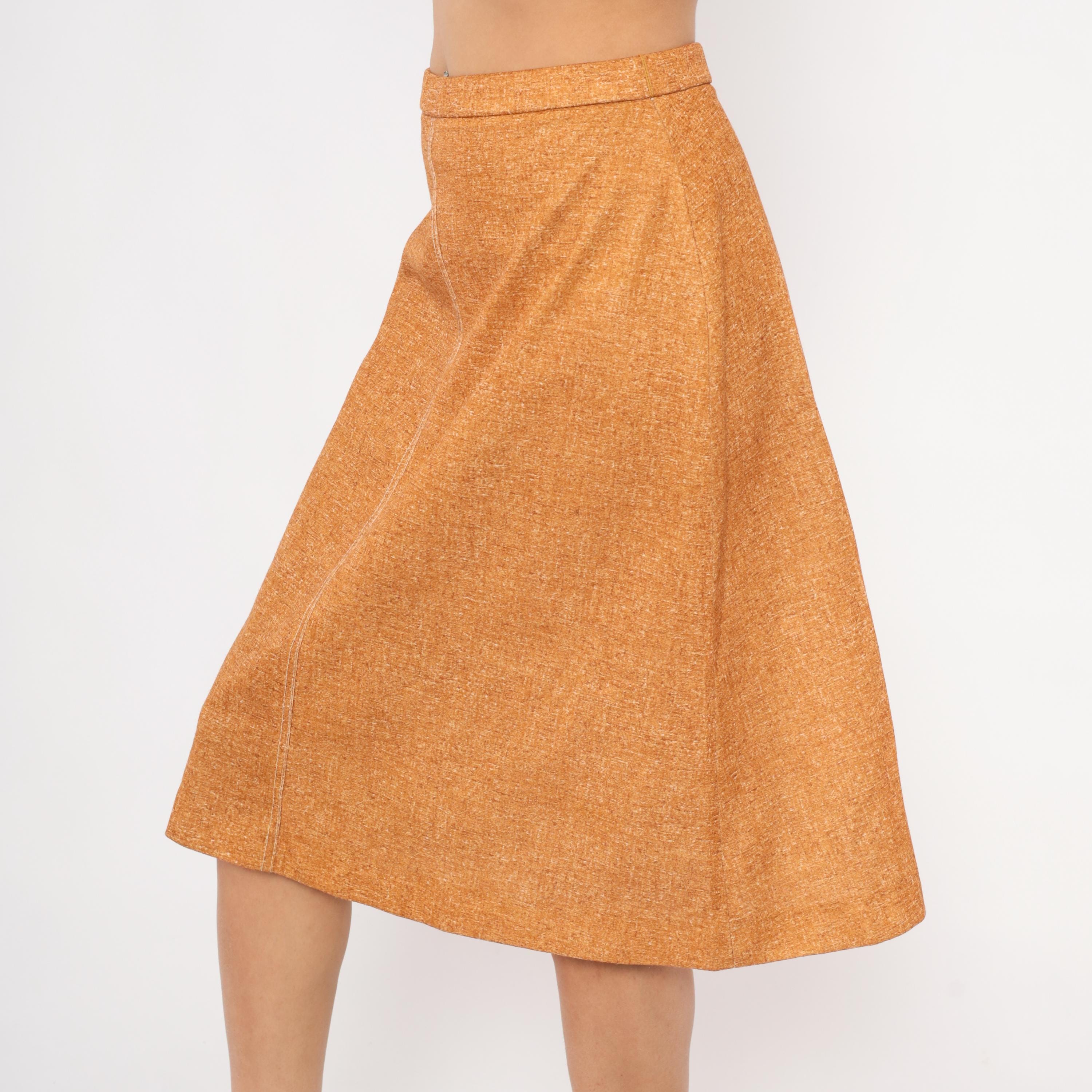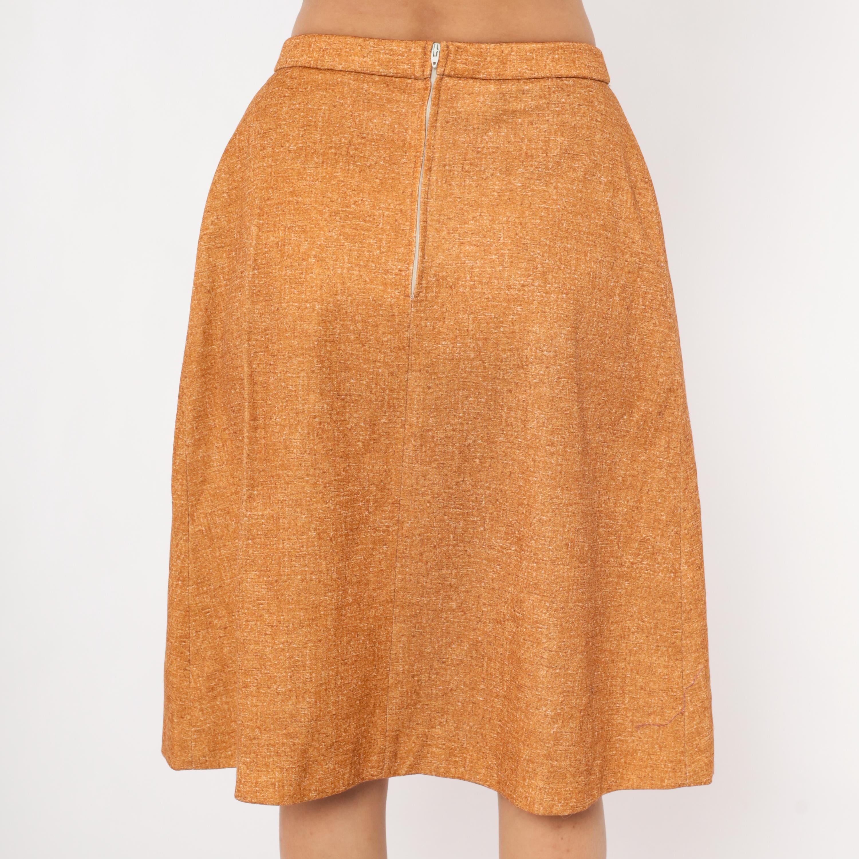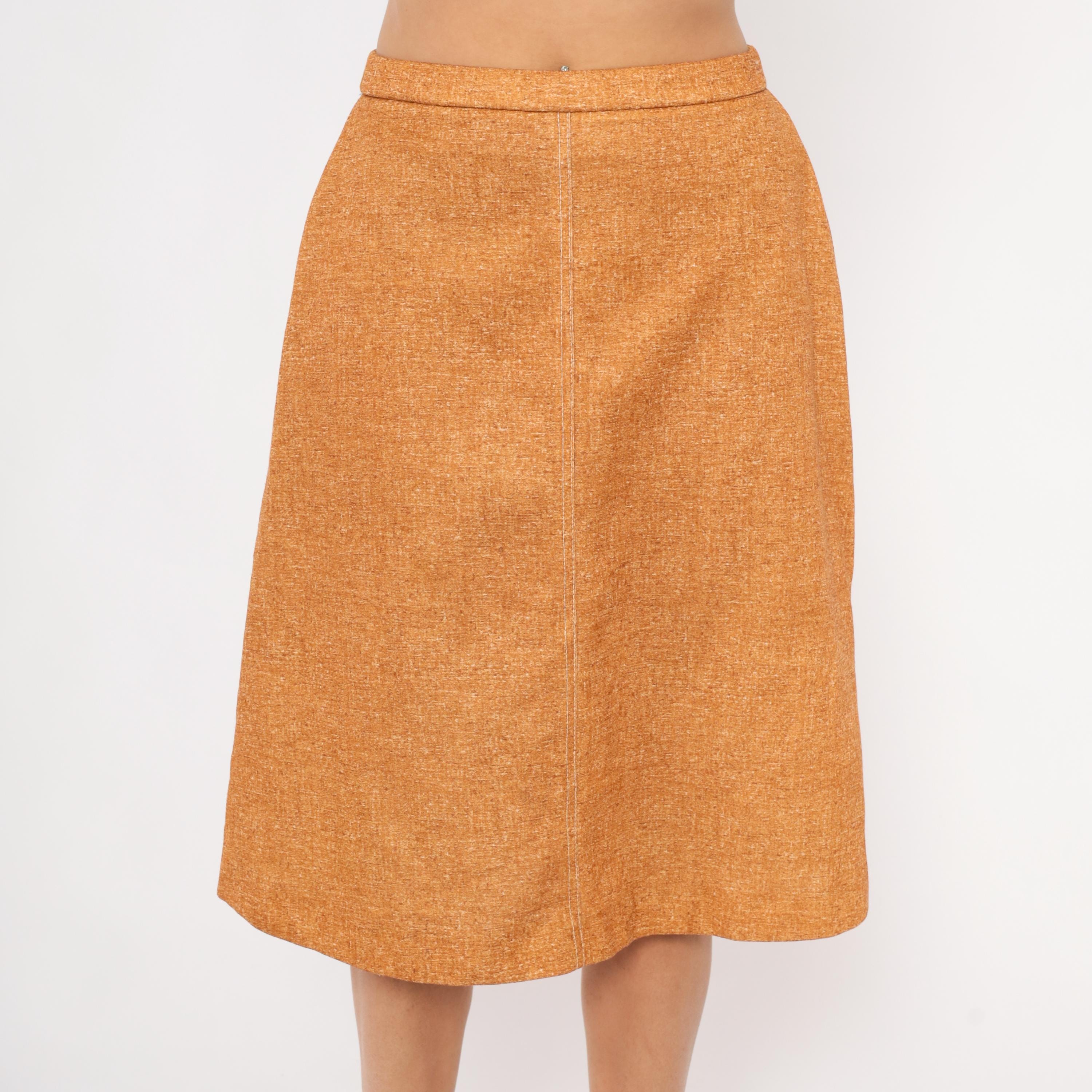 70s A-line skirt from Perception in a warm amber and mustard heathered tweed-textured weave with a fitted waistband and back zipper closure. Center front seam runs the full length of the skirt, with panel seaming along the sides.