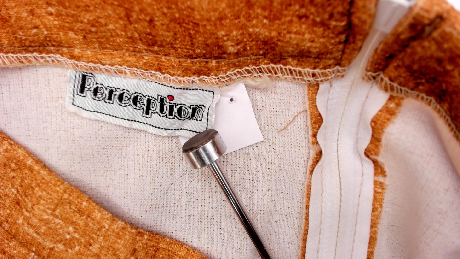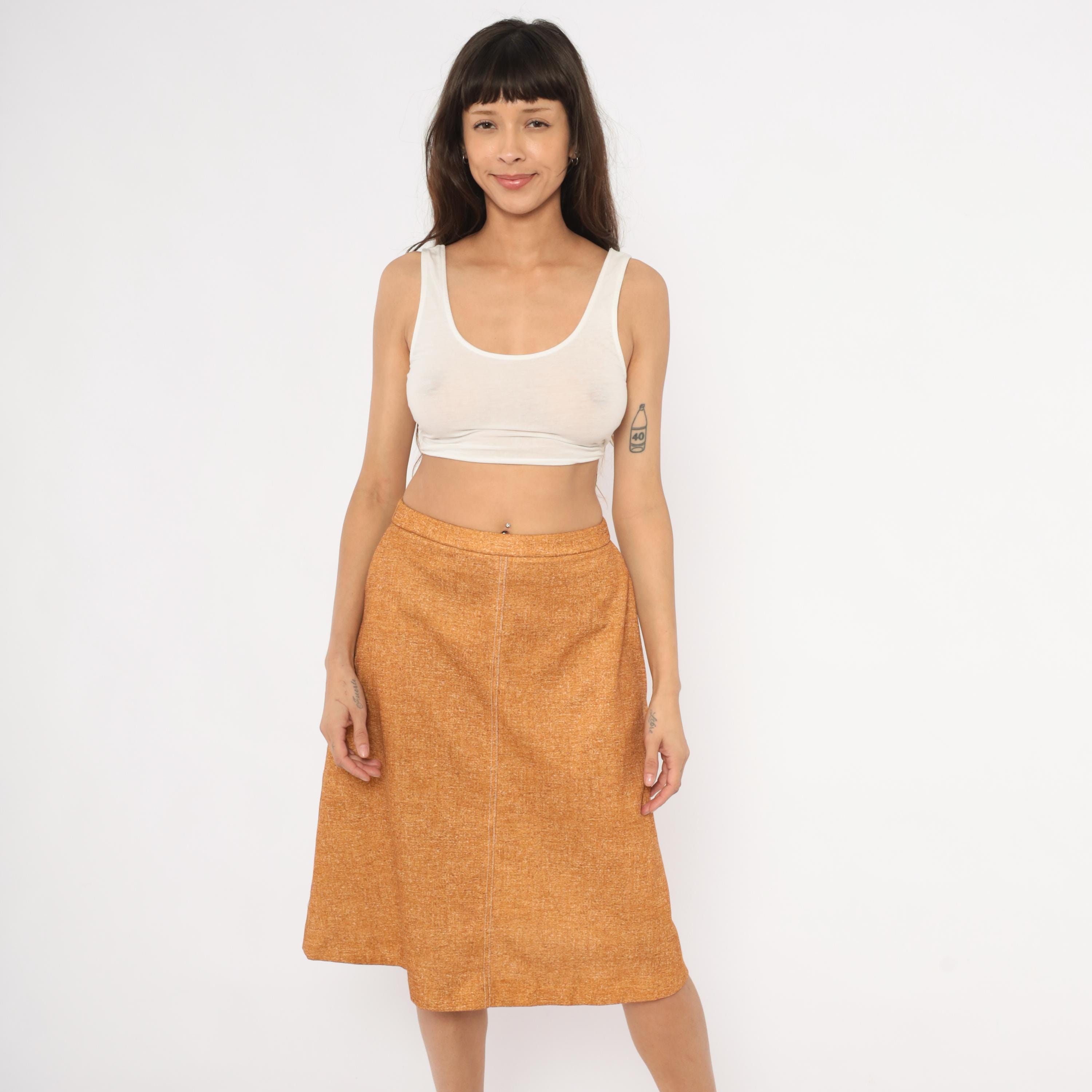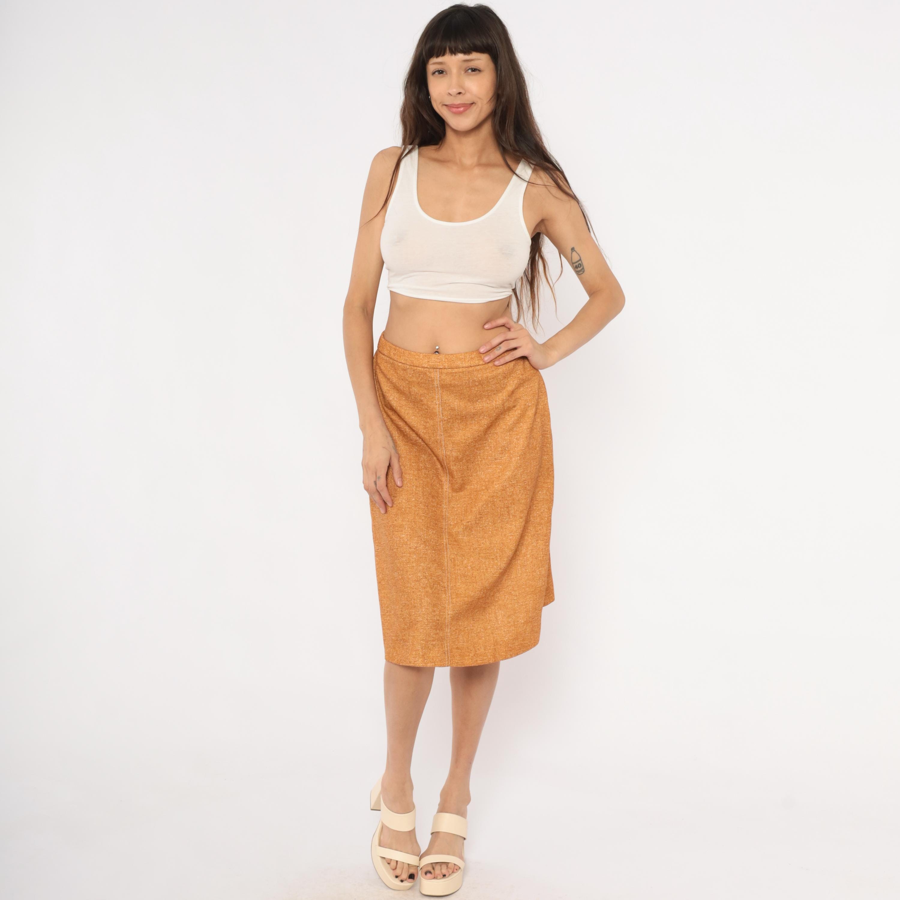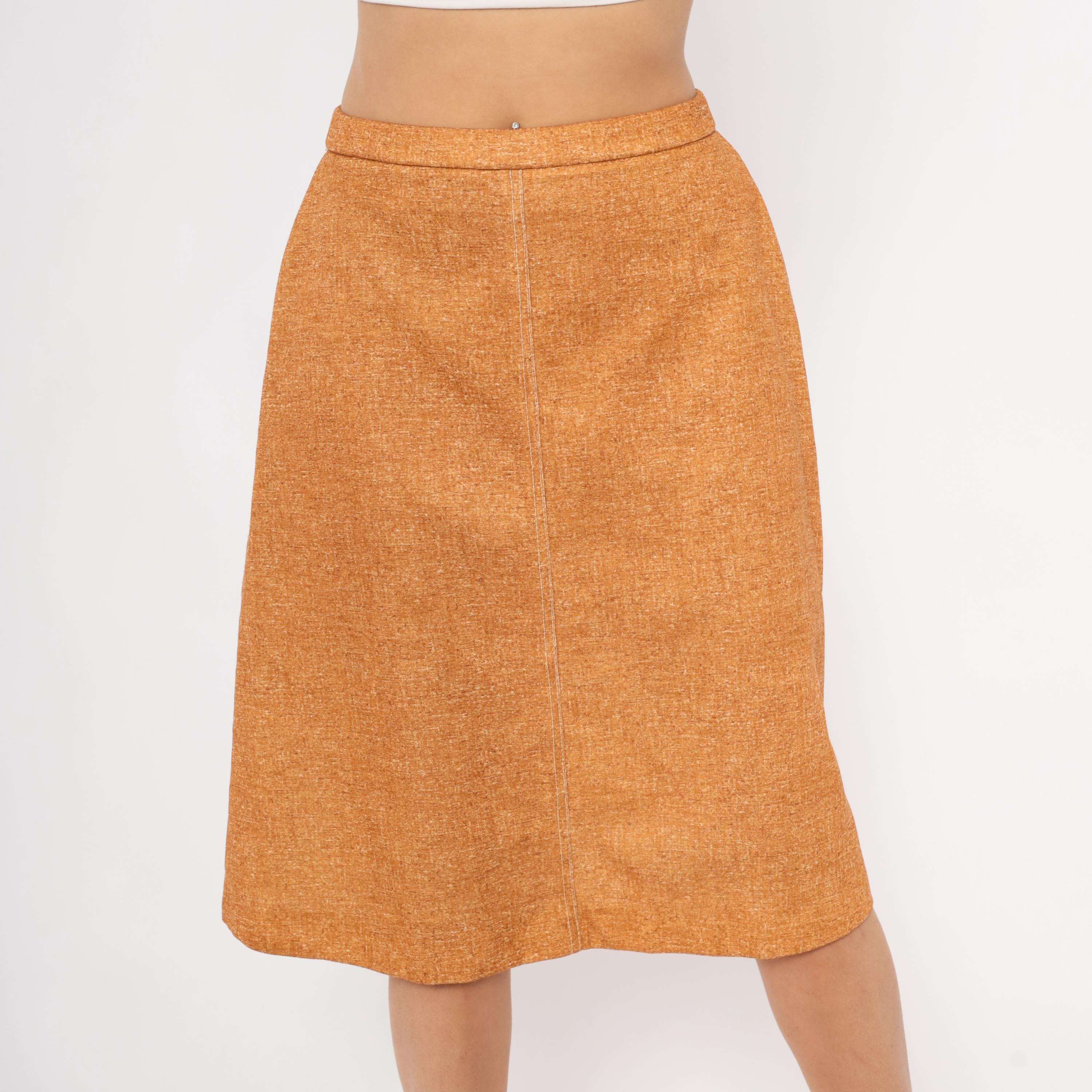 70s A-line skirt from Perception in a warm amber and mustard heathered tweed-textured weave with a fitted waistband and back zipper closure. Center front seam runs the full length of the skirt, with panel seaming along the sides.