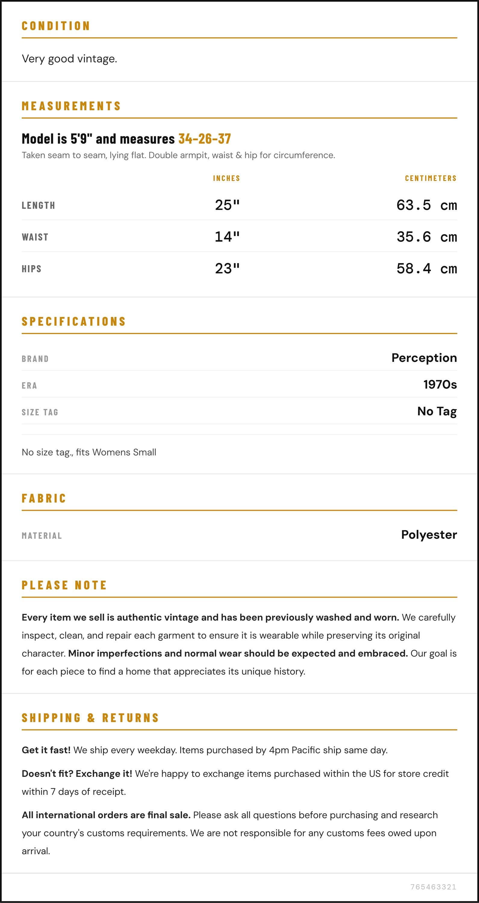 Vintage denim was usually made without any stretch, unlike modern jeans. Check the measurements to ensure proper fit, and remember to give yourself a little wiggle room in the waist and hips, depending on your preferred fit.