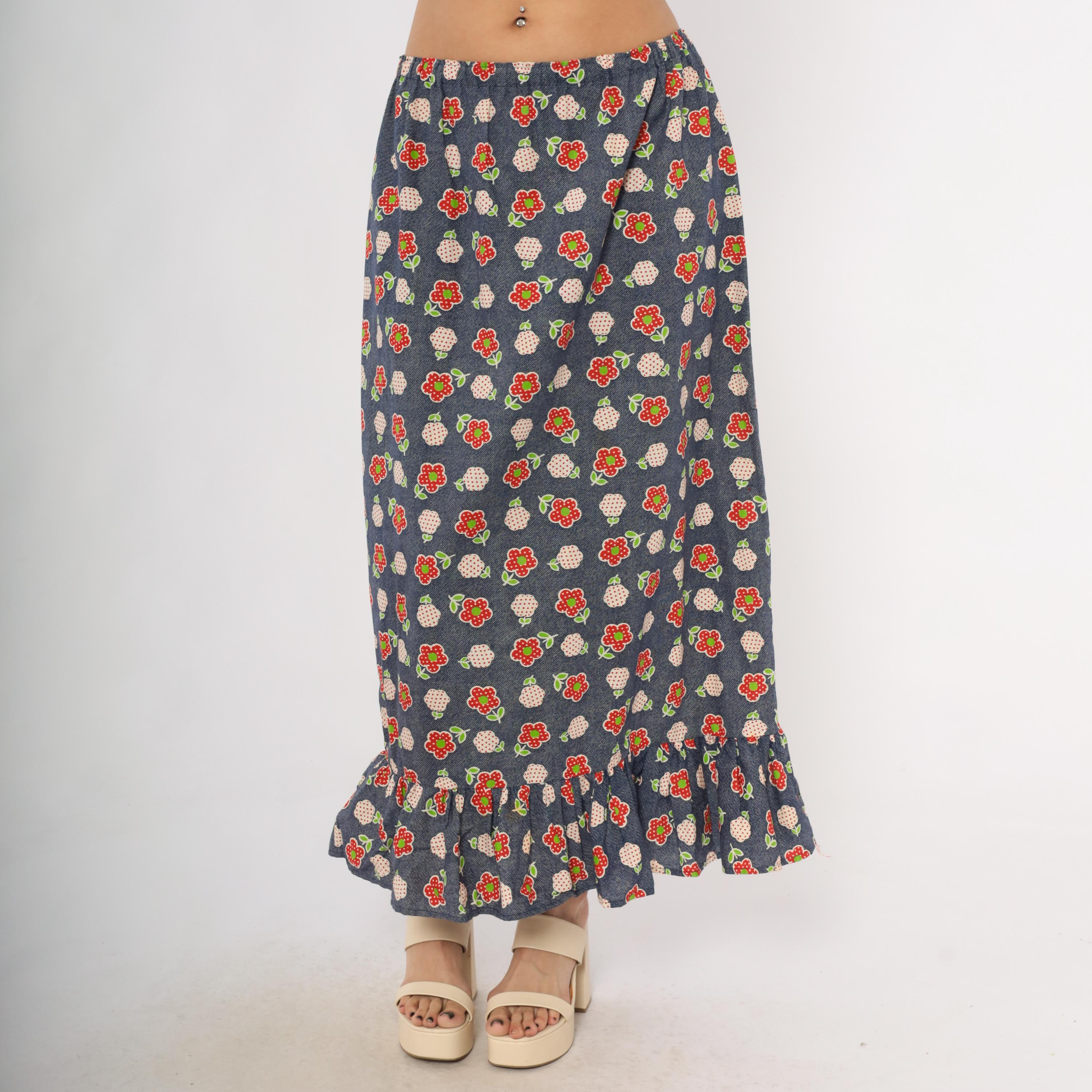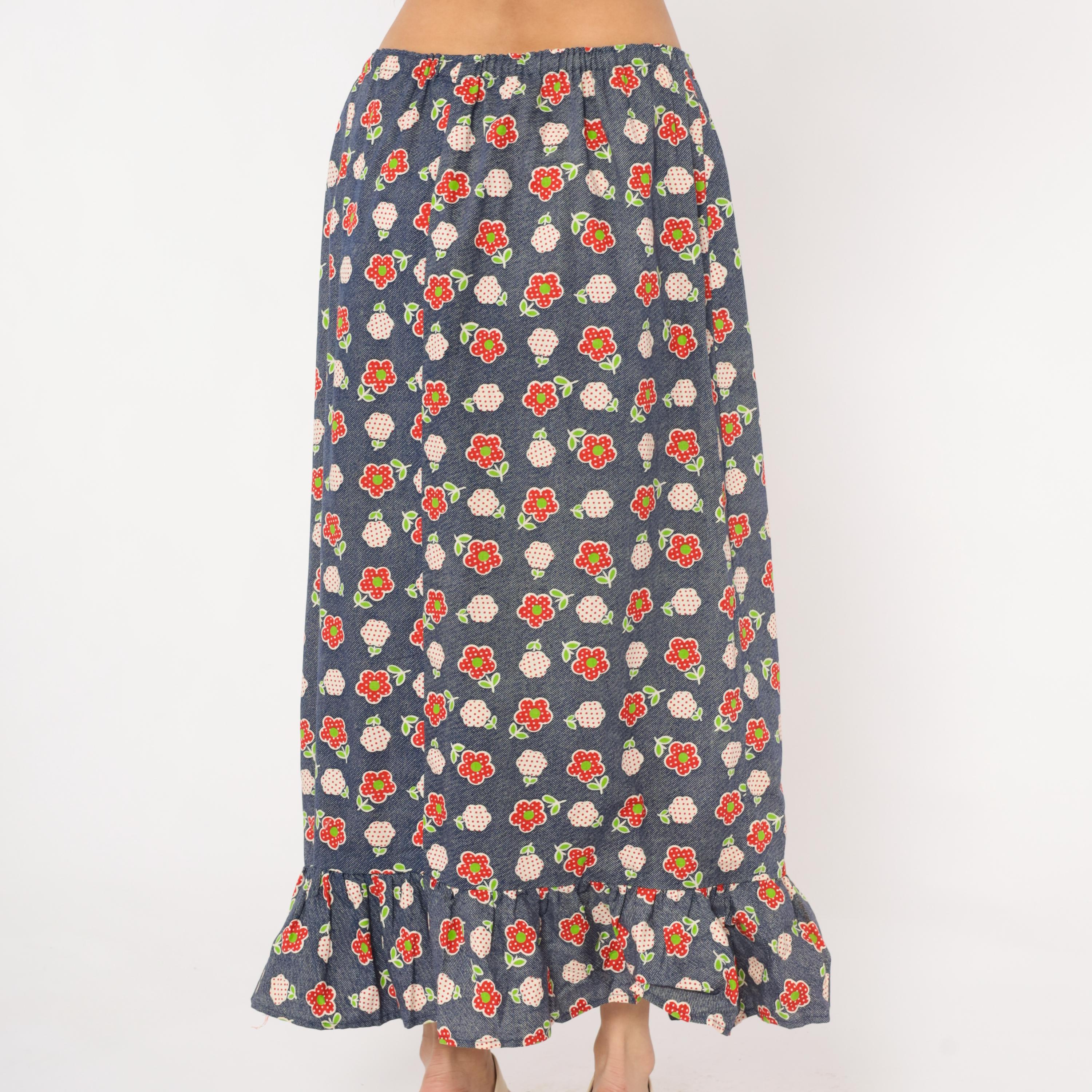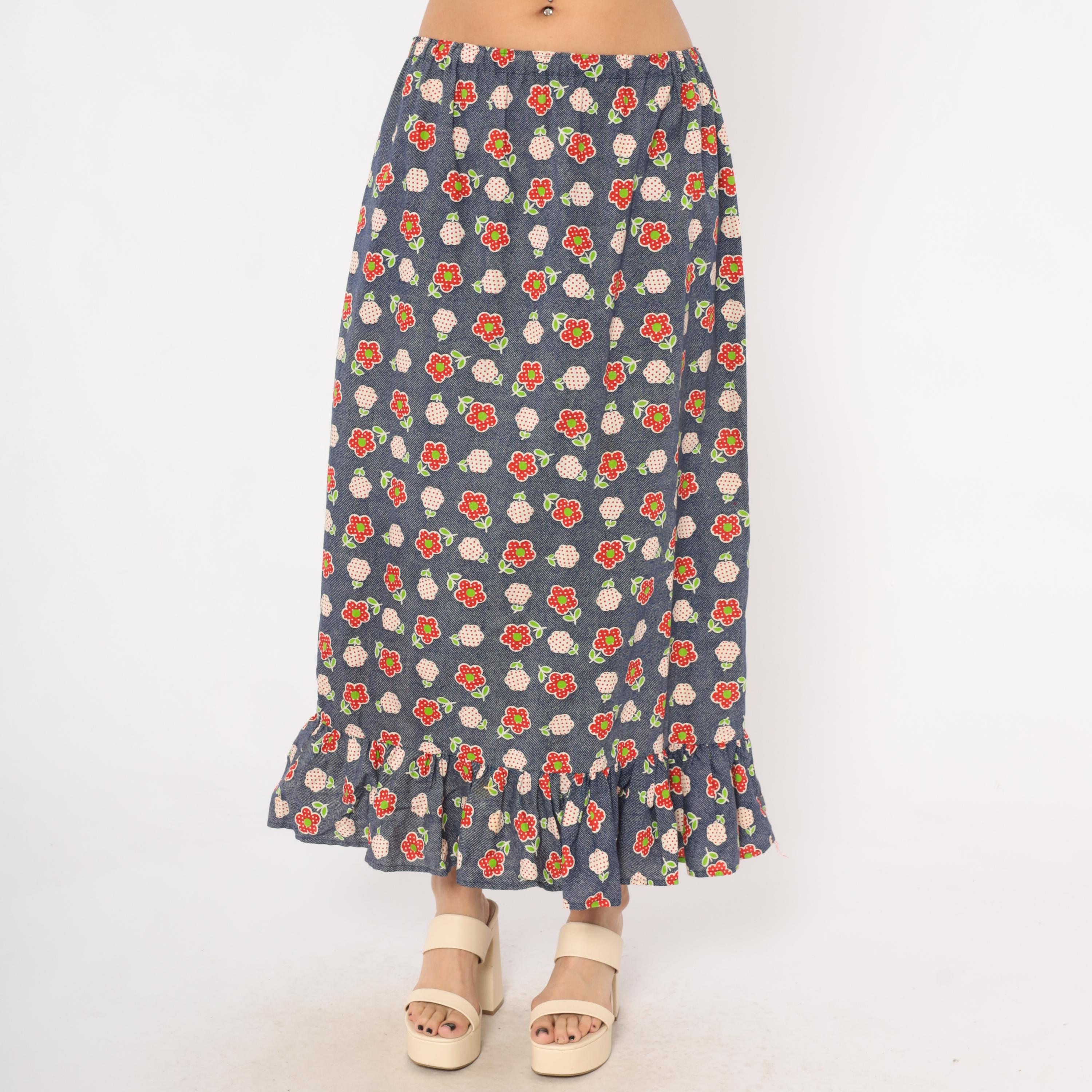 70s navy blue maxi skirt with an allover print of red and white polka-dotted flowers alternating with strawberry motifs in red, white, and green. Elastic gathered waistband, A-line silhouette, and a wide ruffle flounce at the hem. Ankle length with no closures or pockets.