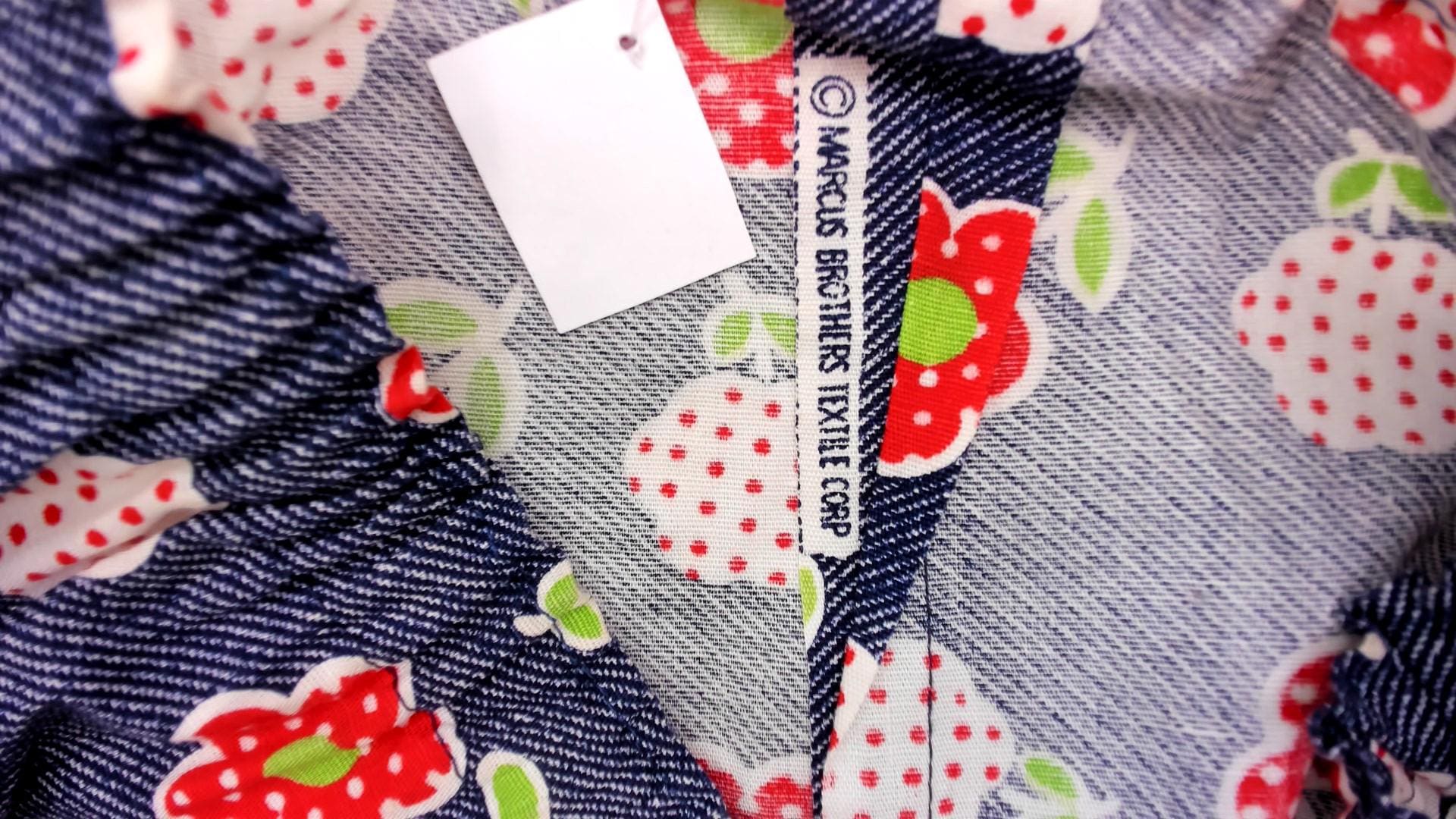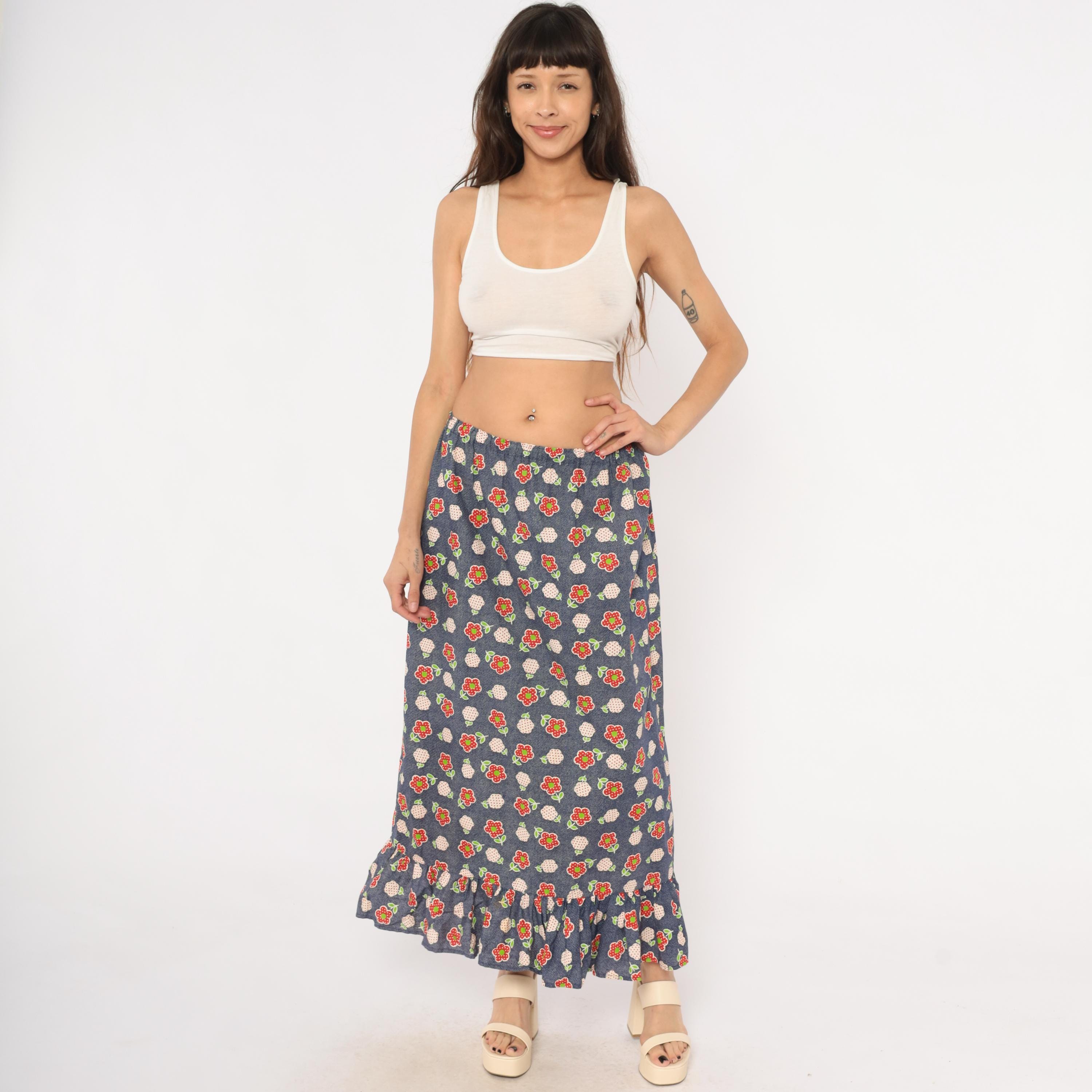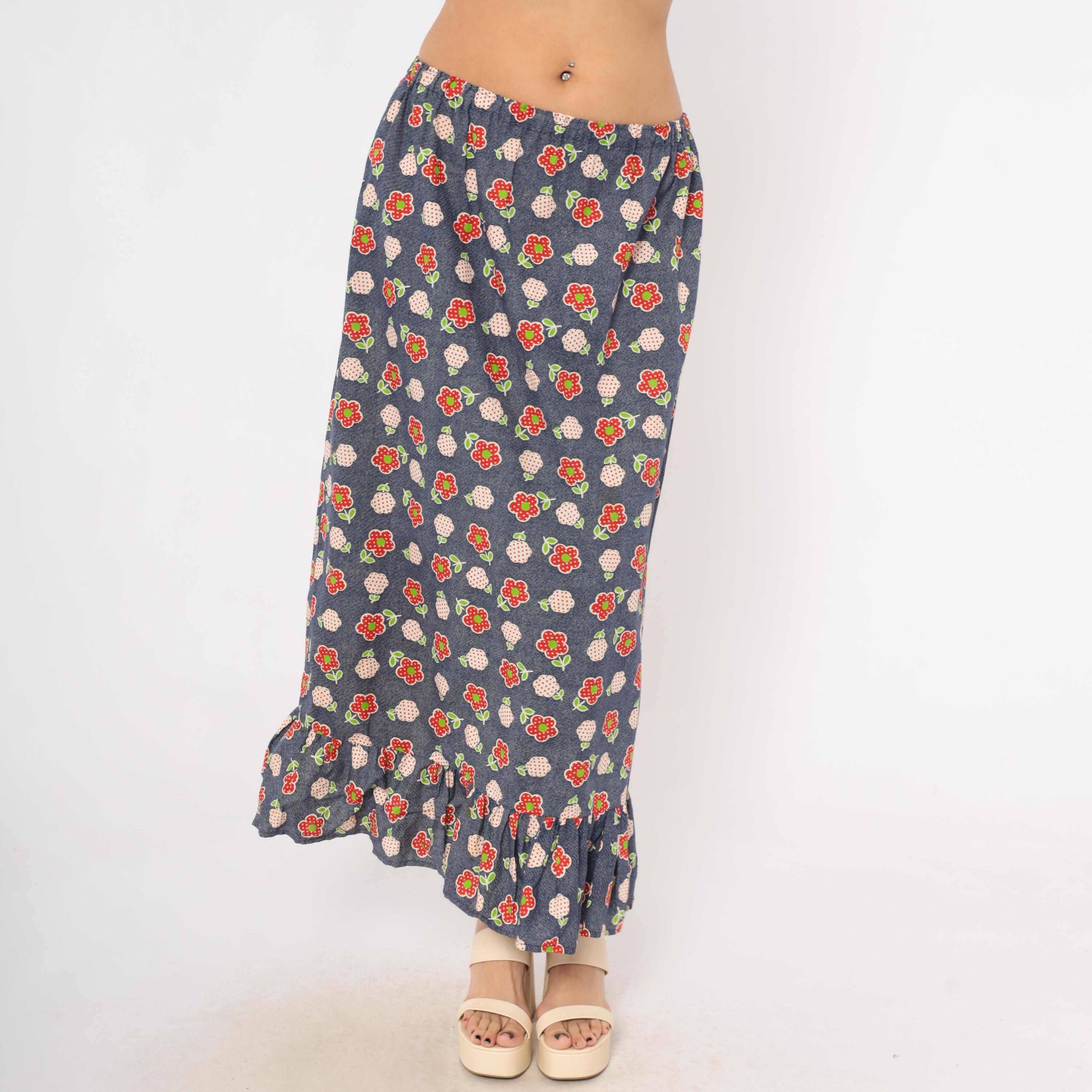 70s navy blue maxi skirt with an allover print of red and white polka-dotted flowers alternating with strawberry motifs in red, white, and green. Elastic gathered waistband, A-line silhouette, and a wide ruffle flounce at the hem. Ankle length with no closures or pockets.