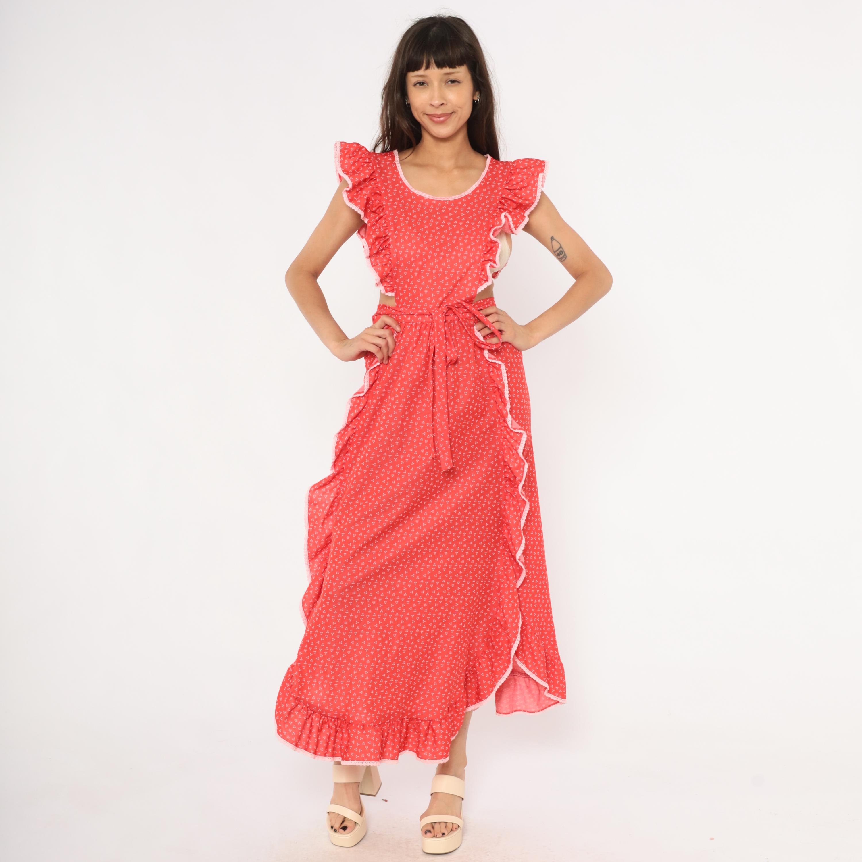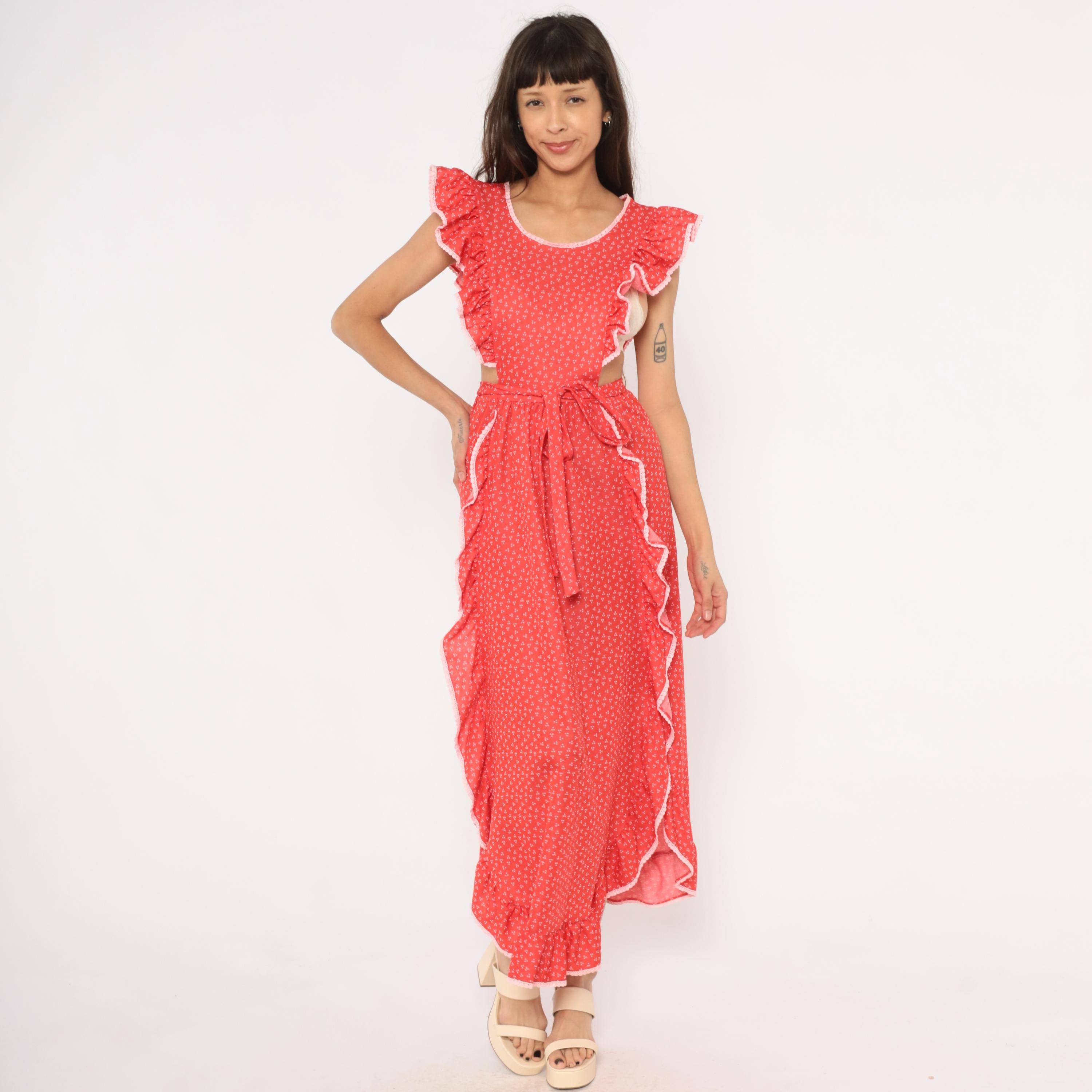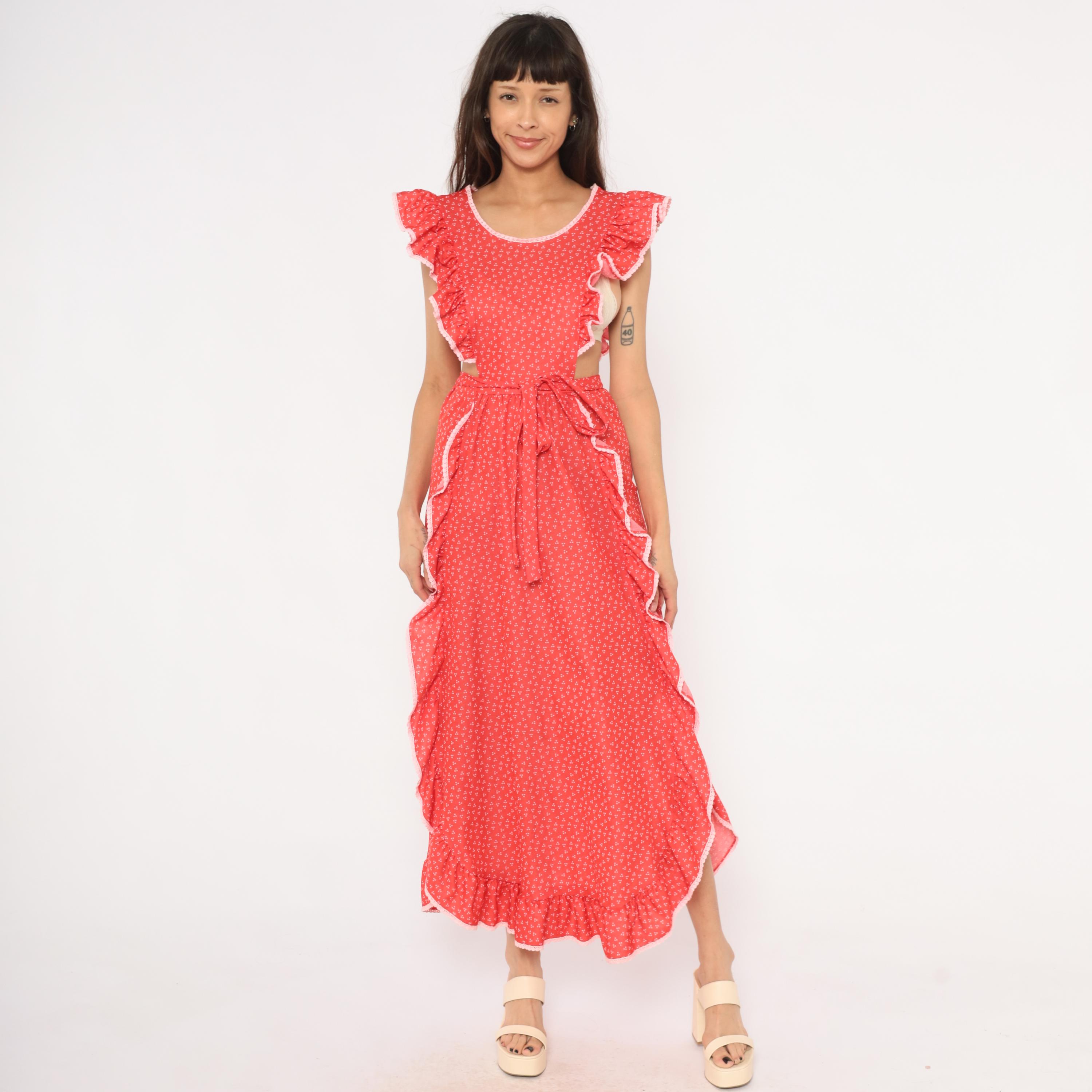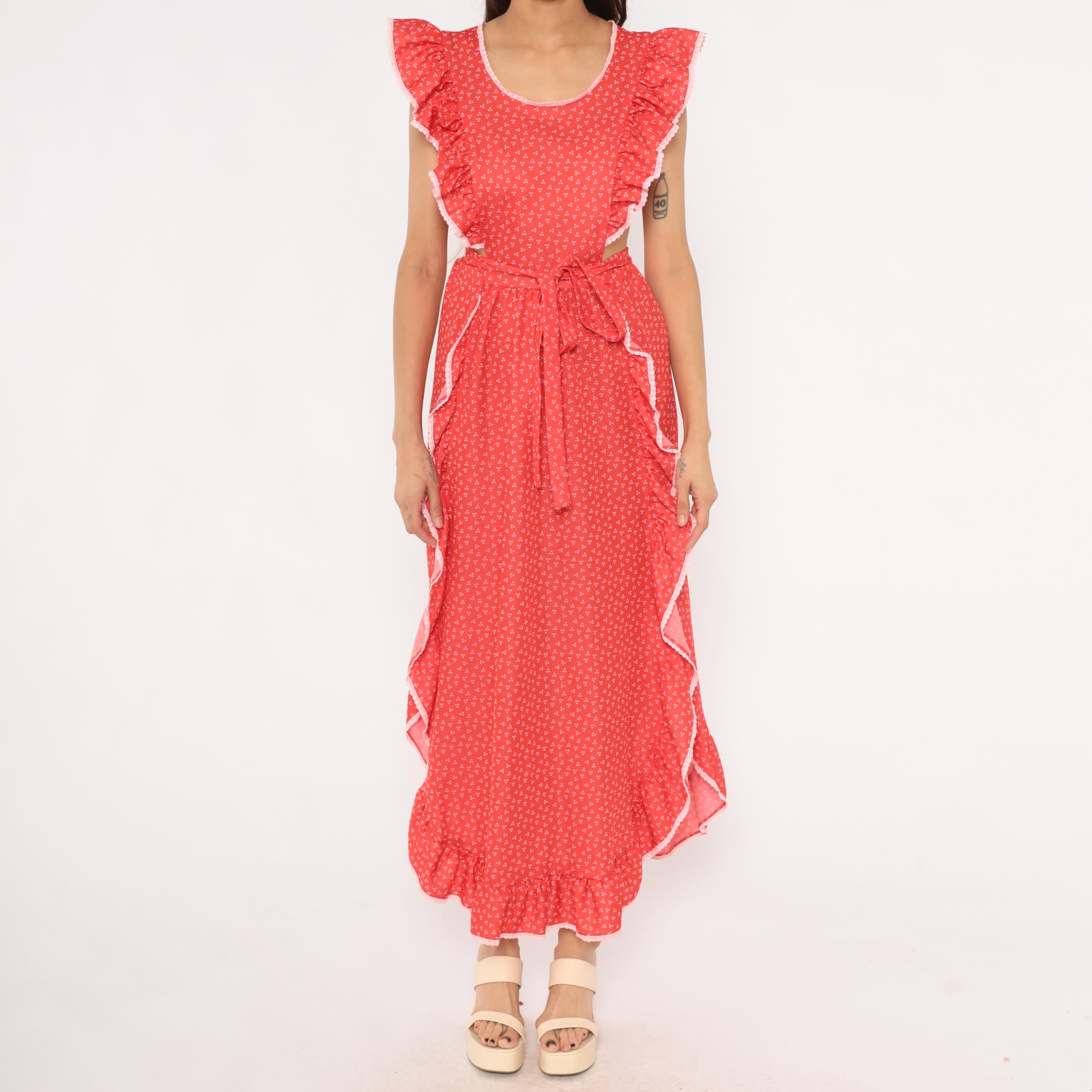 70s red and white calico print maxi dress from Gay Gibson with ruffled flutter sleeves trimmed in white lace edging. Scoop neckline, side cutouts at the waist, and a self-tie fabric belt at the front. Cascading ruffle panels run down the front of the skirt with matching lace trim, and a gathered ruffle hem finishes the bottom. Back zipper closure with a fitted bodice and full-length skirt.