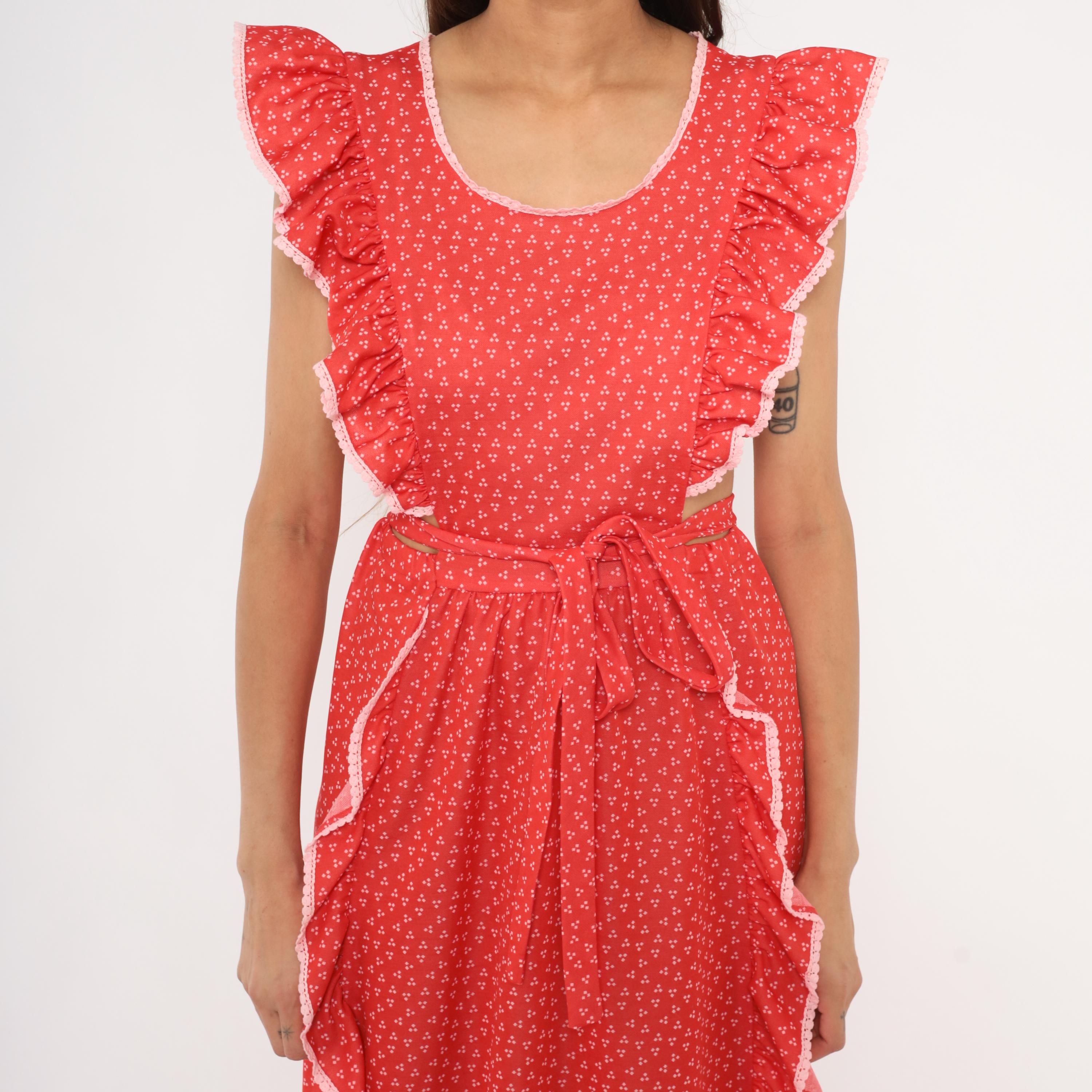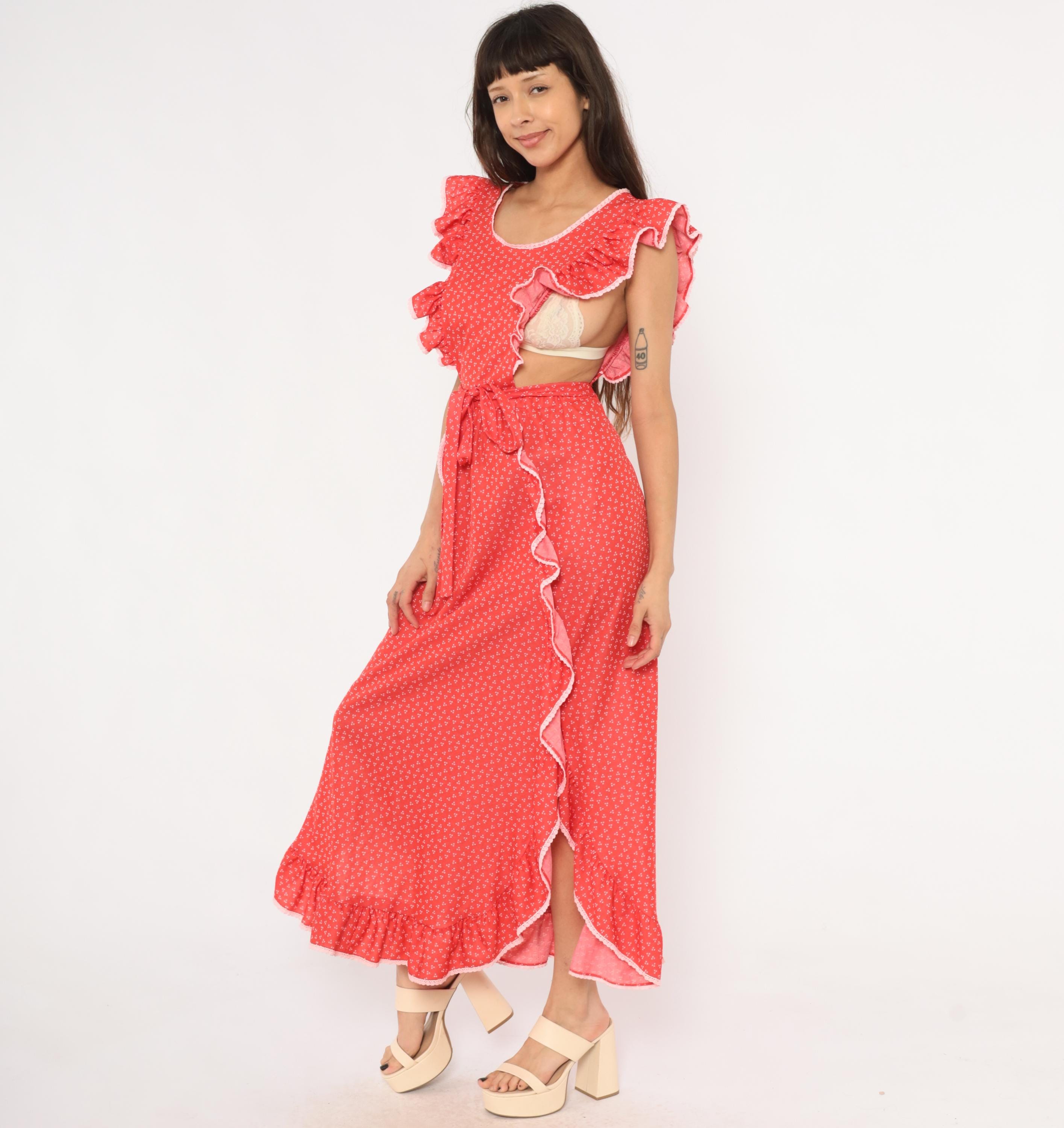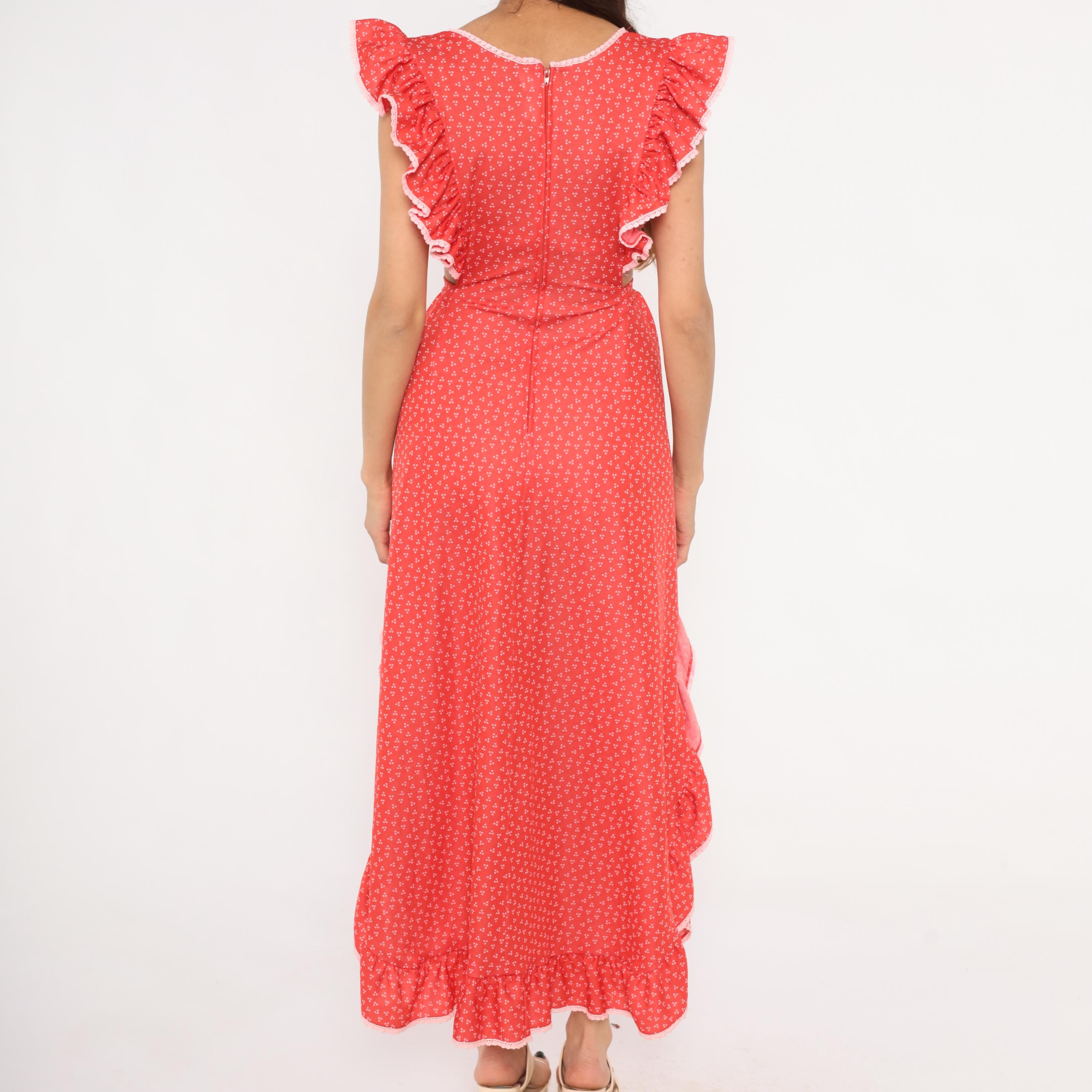 70s red and white calico print maxi dress from Gay Gibson with ruffled flutter sleeves trimmed in white lace edging. Scoop neckline, side cutouts at the waist, and a self-tie fabric belt at the front. Cascading ruffle panels run down the front of the skirt with matching lace trim, and a gathered ruffle hem finishes the bottom. Back zipper closure with a fitted bodice and full-length skirt.