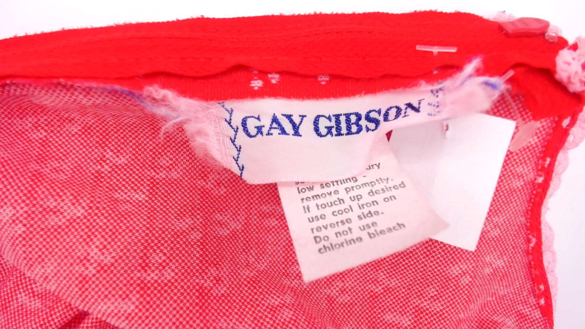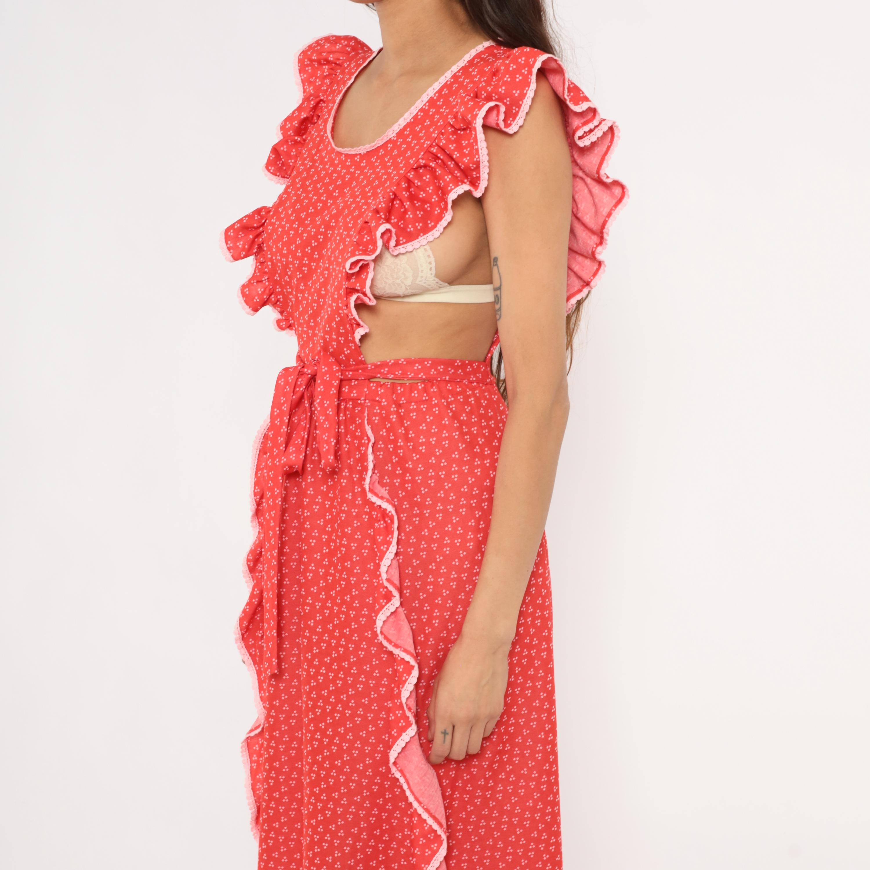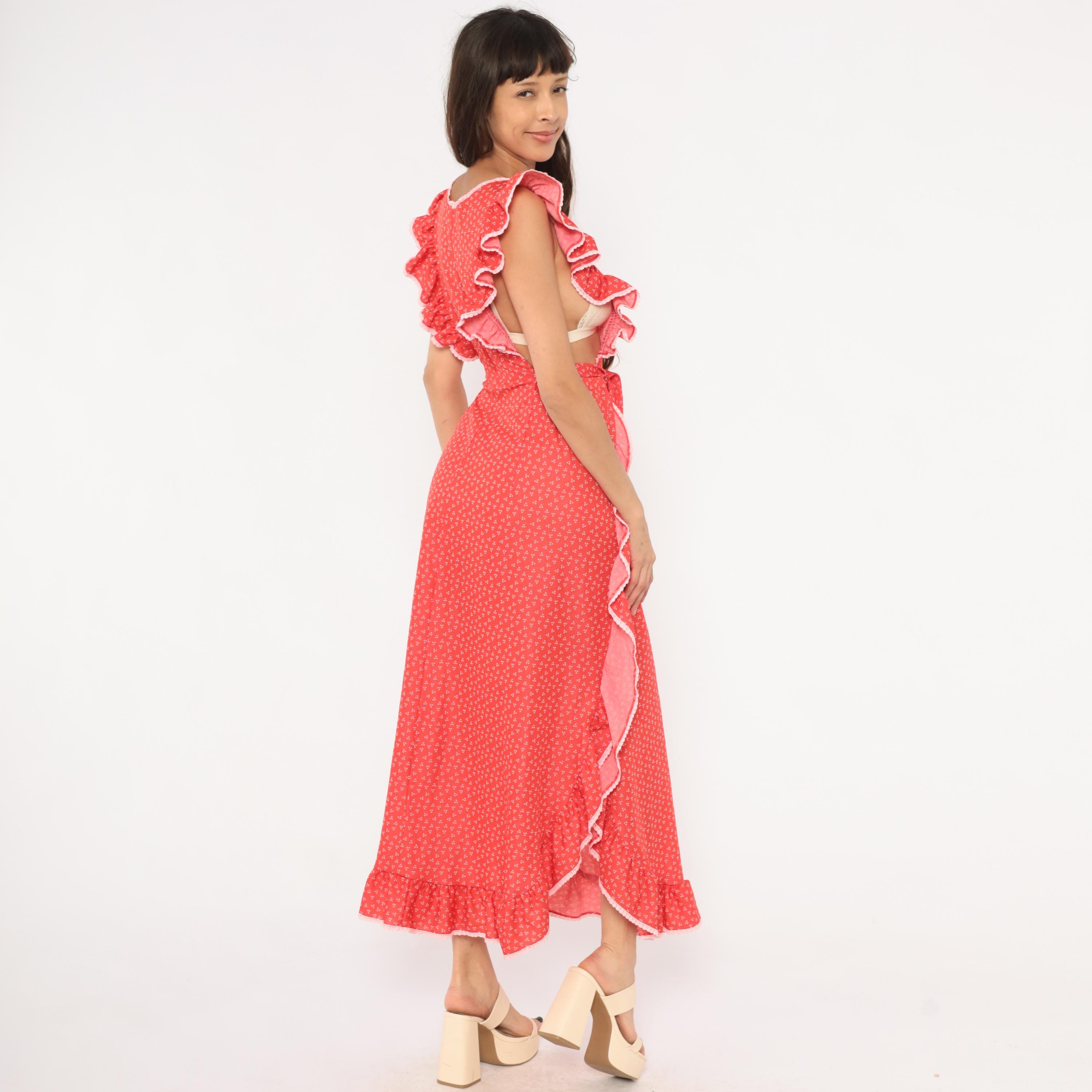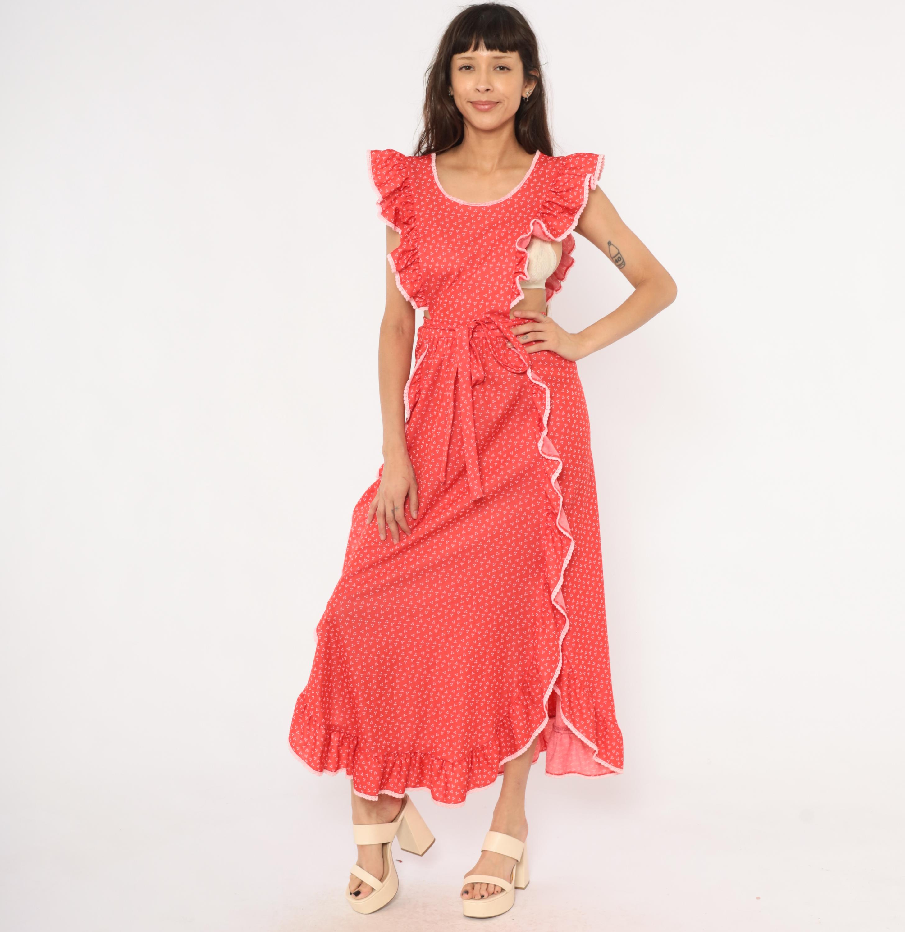 70s red and white calico print maxi dress from Gay Gibson with ruffled flutter sleeves trimmed in white lace edging. Scoop neckline, side cutouts at the waist, and a self-tie fabric belt at the front. Cascading ruffle panels run down the front of the skirt with matching lace trim, and a gathered ruffle hem finishes the bottom. Back zipper closure with a fitted bodice and full-length skirt.
