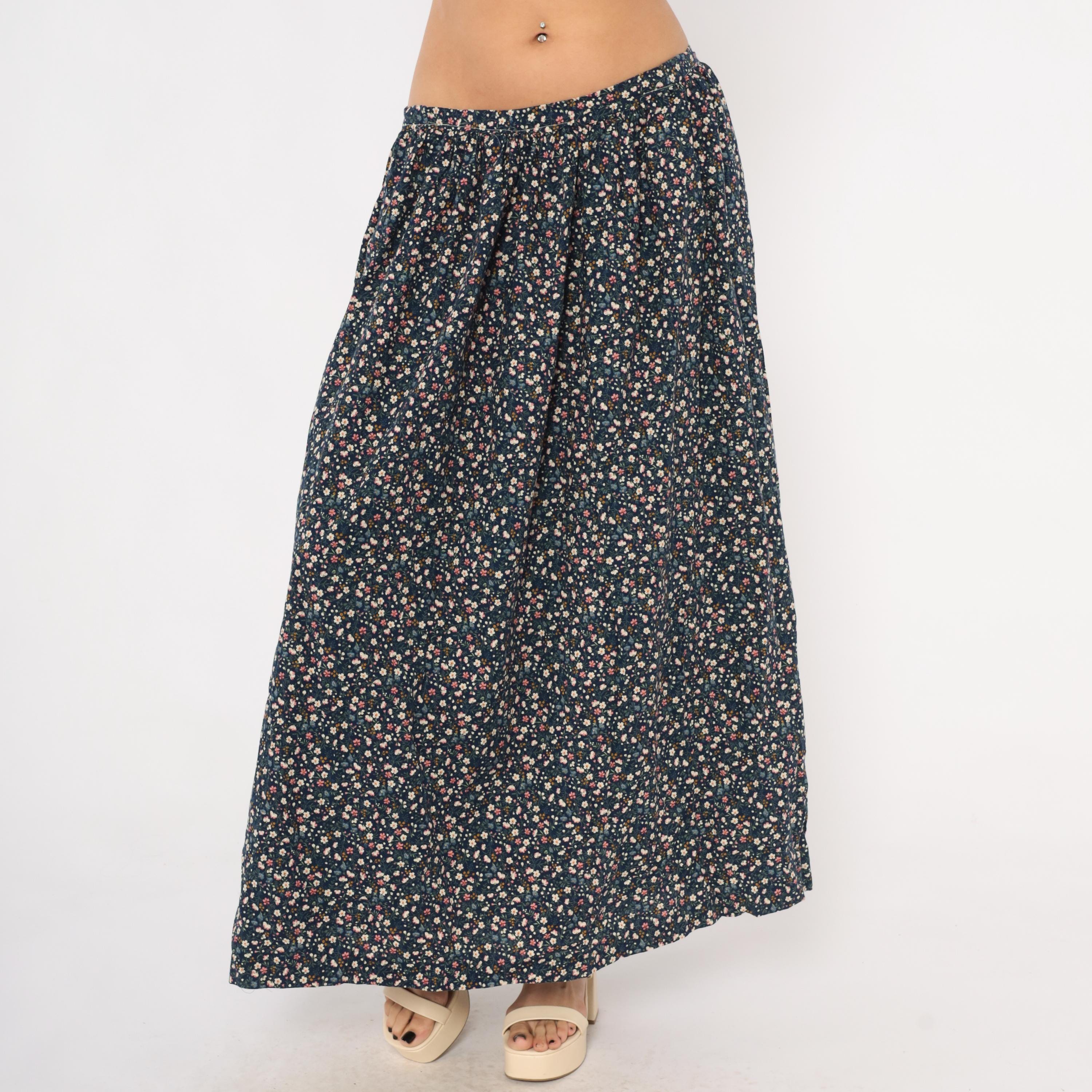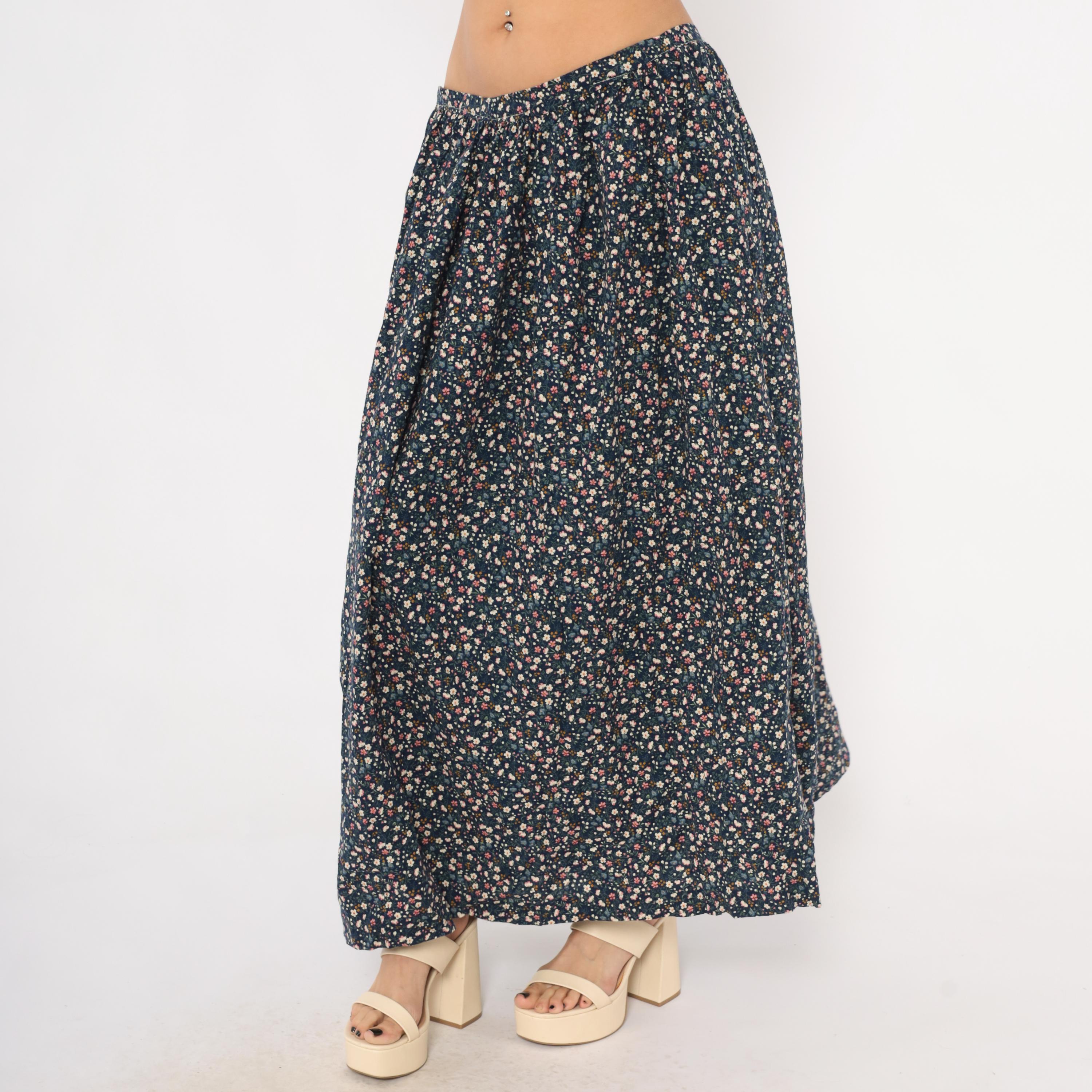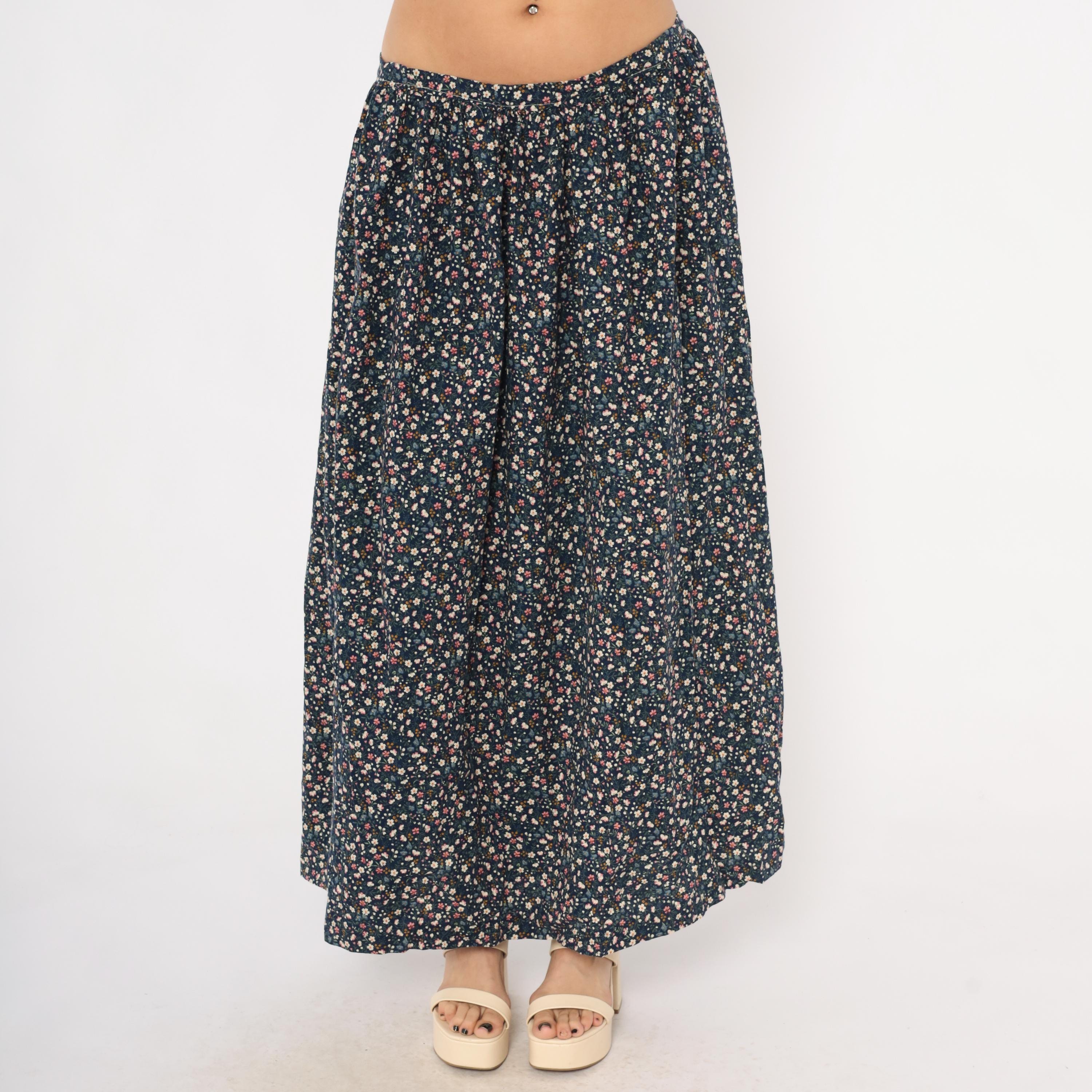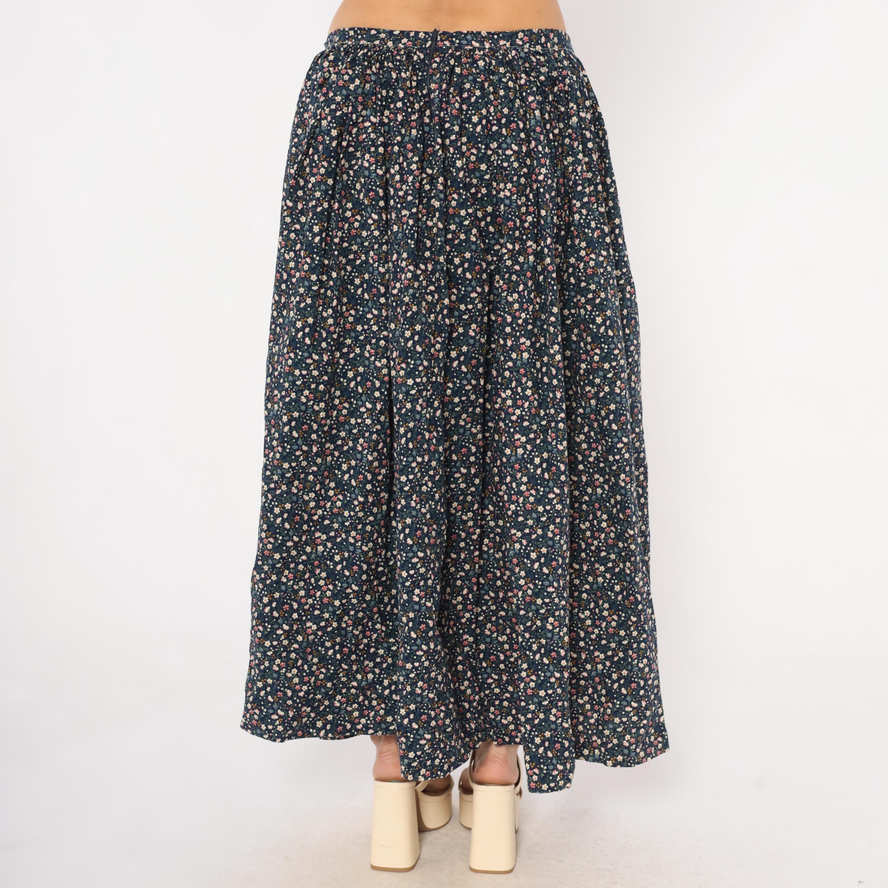 80s navy maxi skirt with an allover ditsy floral print in pink, cream, blue, and golden yellow scattered across a dark ground. Gathered waist with back zipper closure and full A-line sweep to ankle length. Calico-style blooms including small five-petal flowers, tiny buds, and green leaf stems cover the entire fabric.