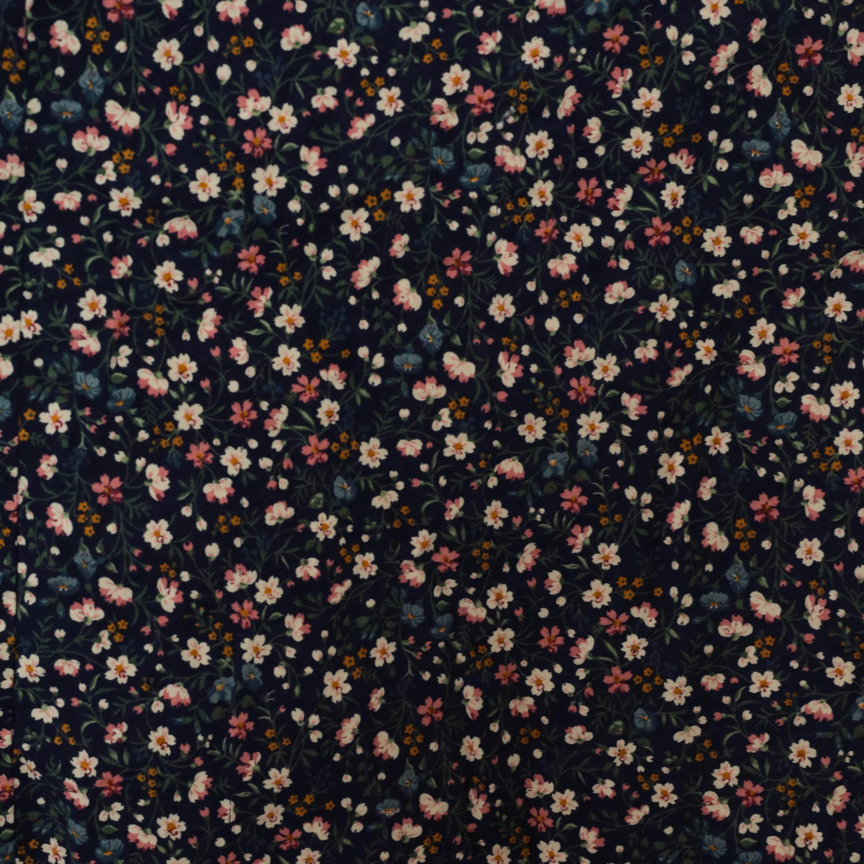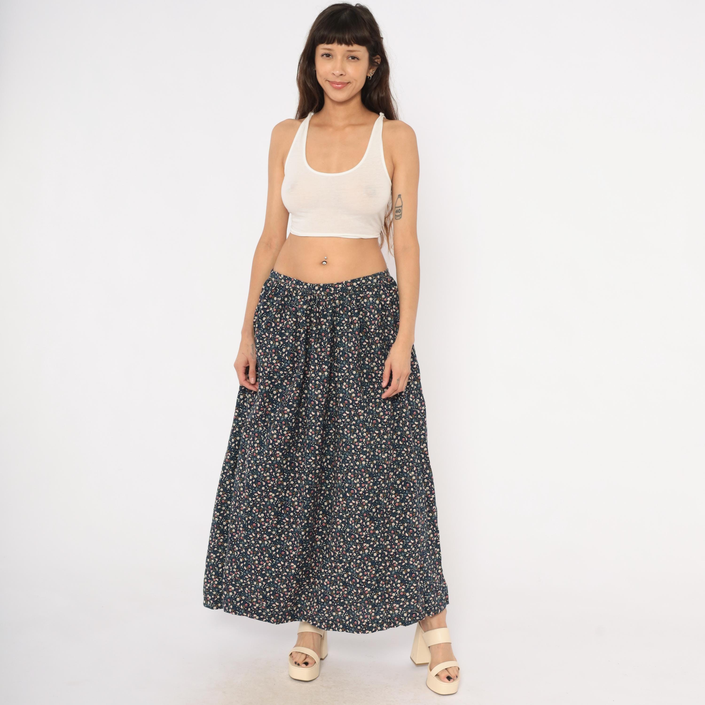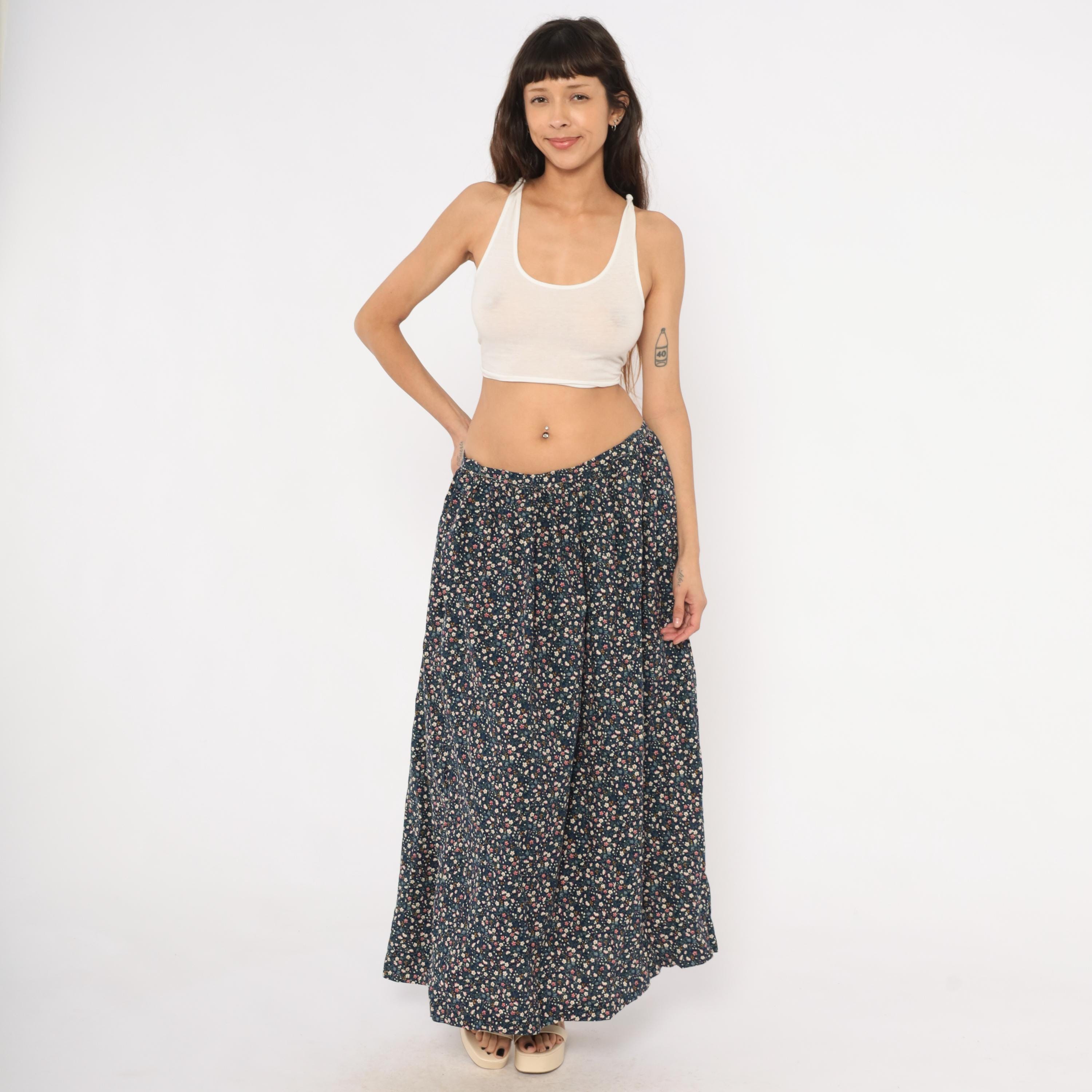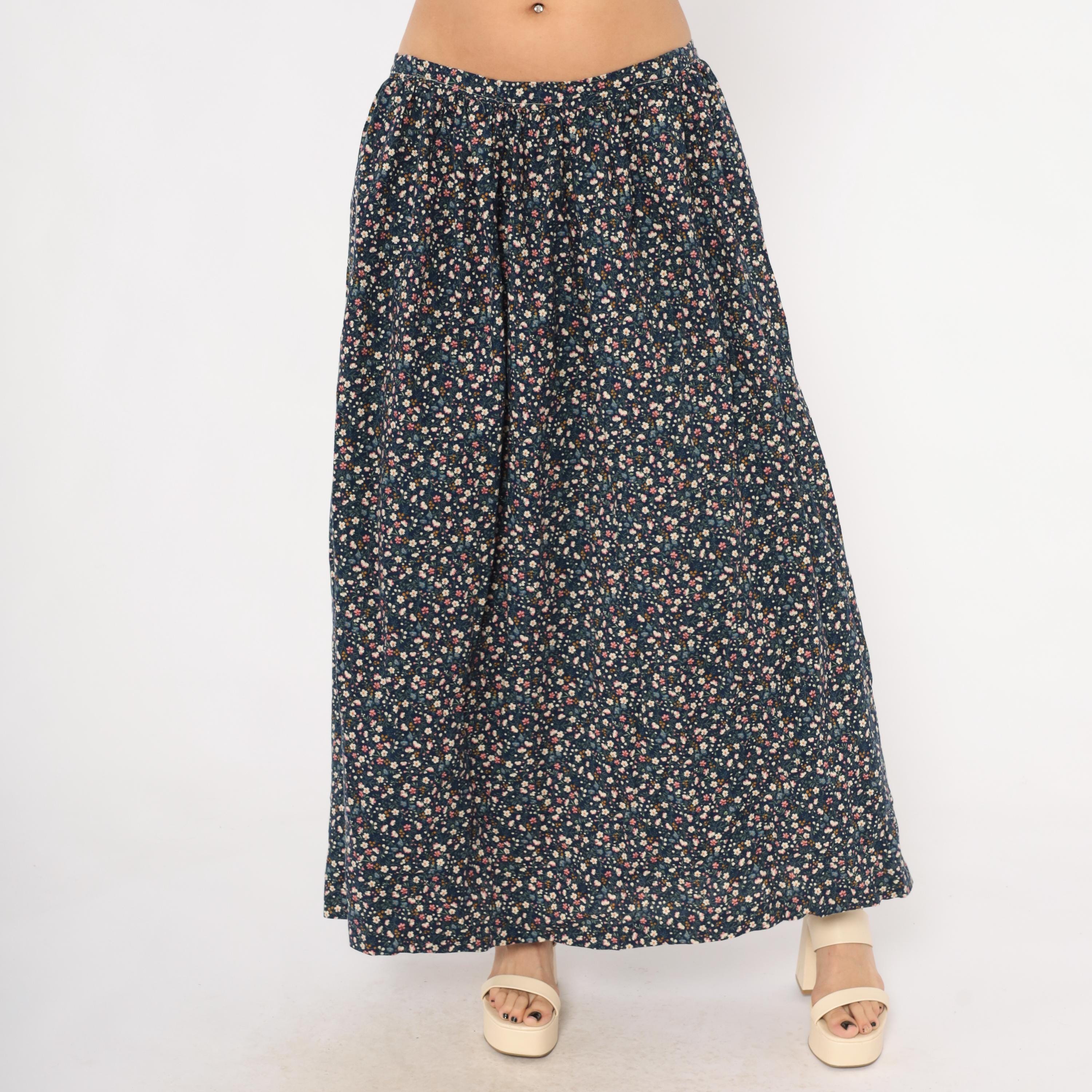 80s navy maxi skirt with an allover ditsy floral print in pink, cream, blue, and golden yellow scattered across a dark ground. Gathered waist with back zipper closure and full A-line sweep to ankle length. Calico-style blooms including small five-petal flowers, tiny buds, and green leaf stems cover the entire fabric.