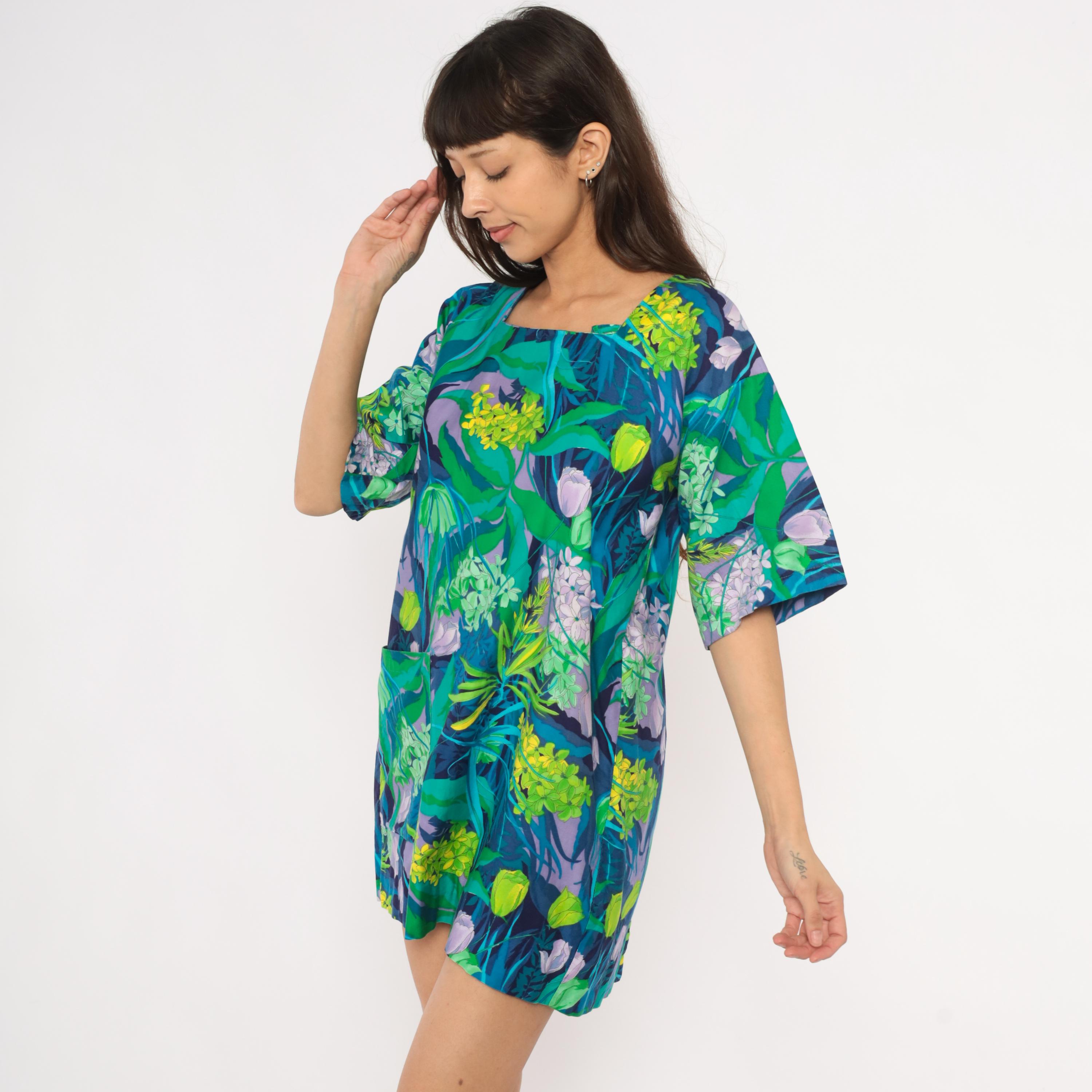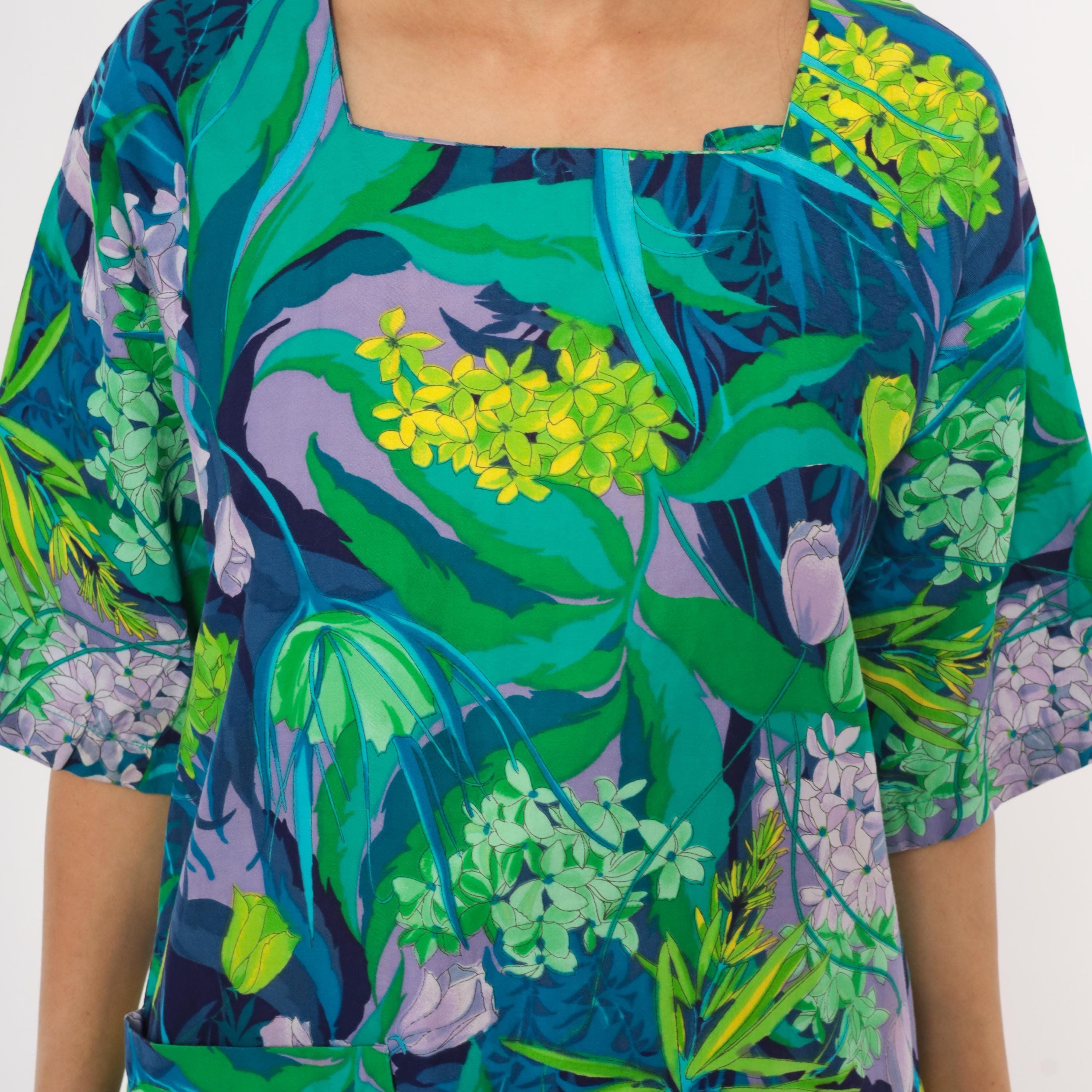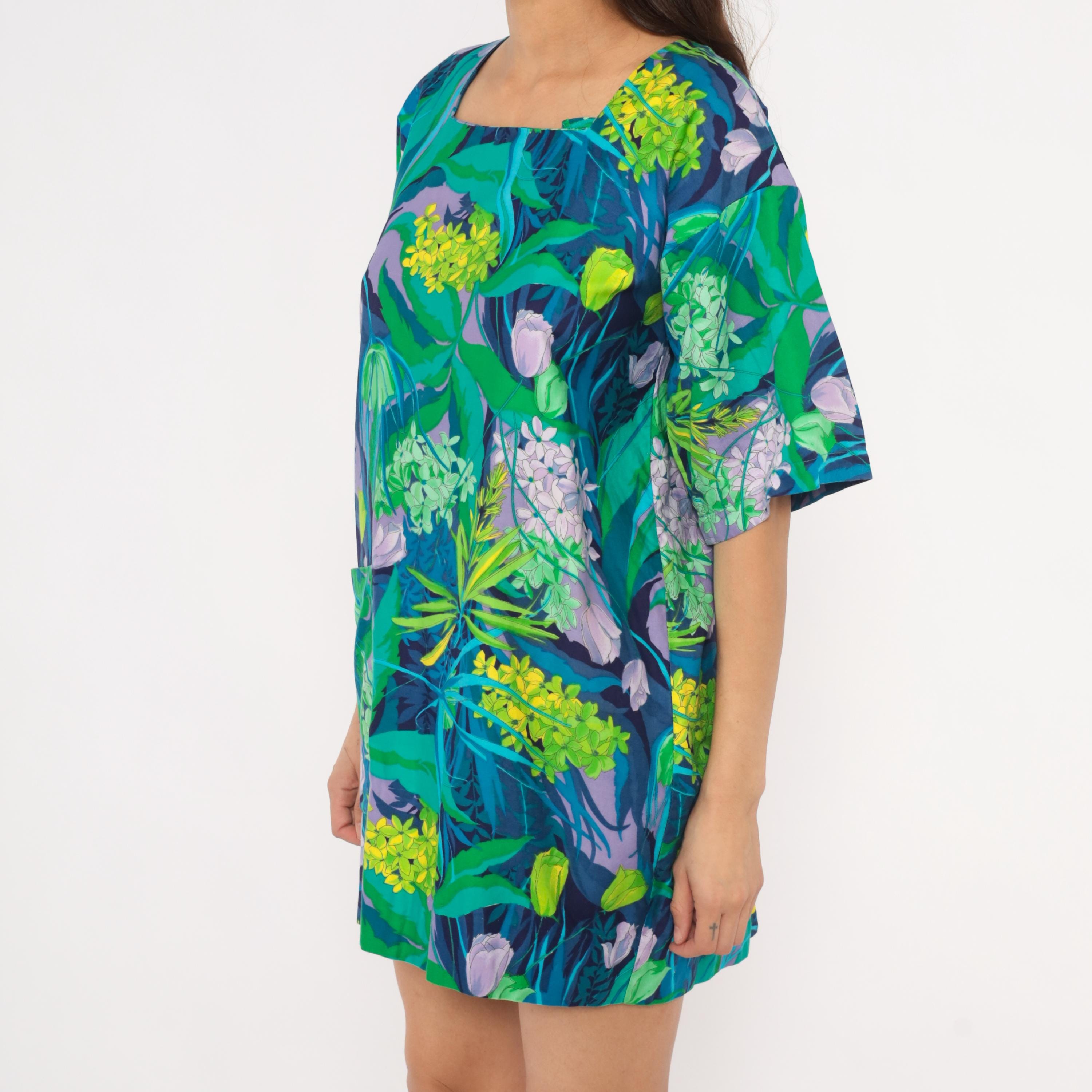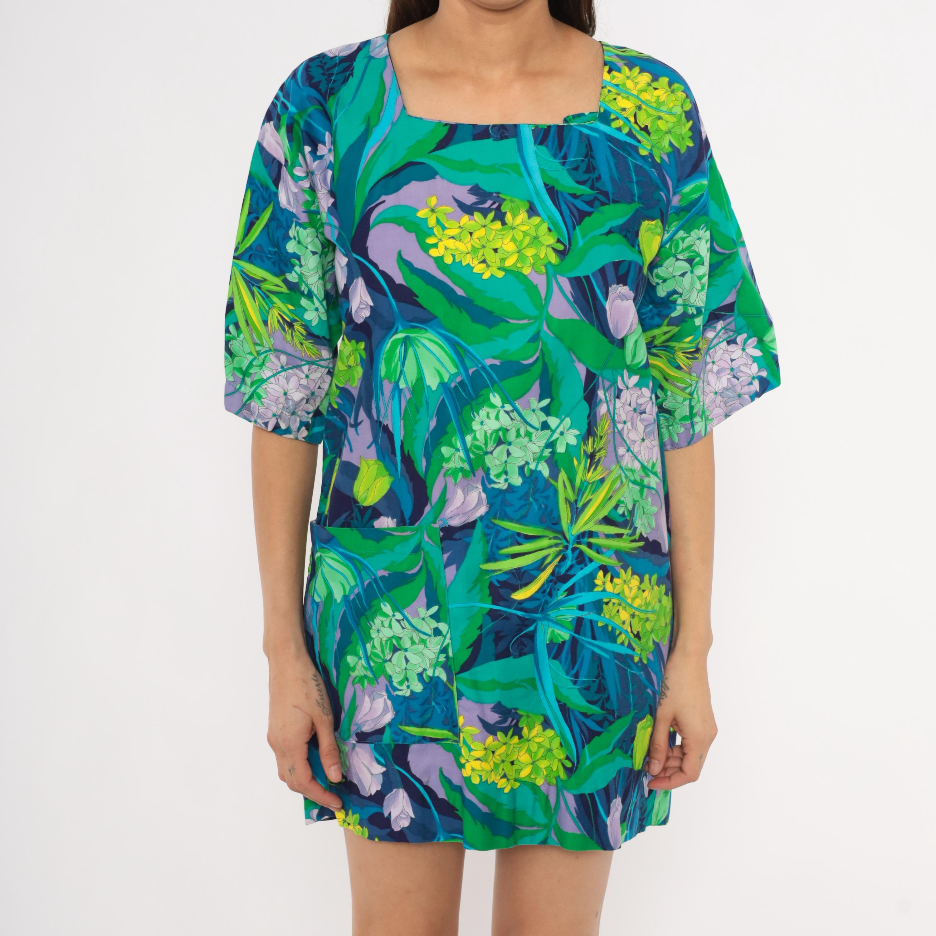 70s tropical botanical print mini tunic dress from Marjon with a square neckline, short wide sleeves, and back button closure with an open slit at the hem. Green, teal, purple, lavender, and yellow floral pattern across the entire garment with illustrations of hydrangeas, tulips, and leafy foliage. Front patch pocket on the left hip, relaxed straight silhouette.