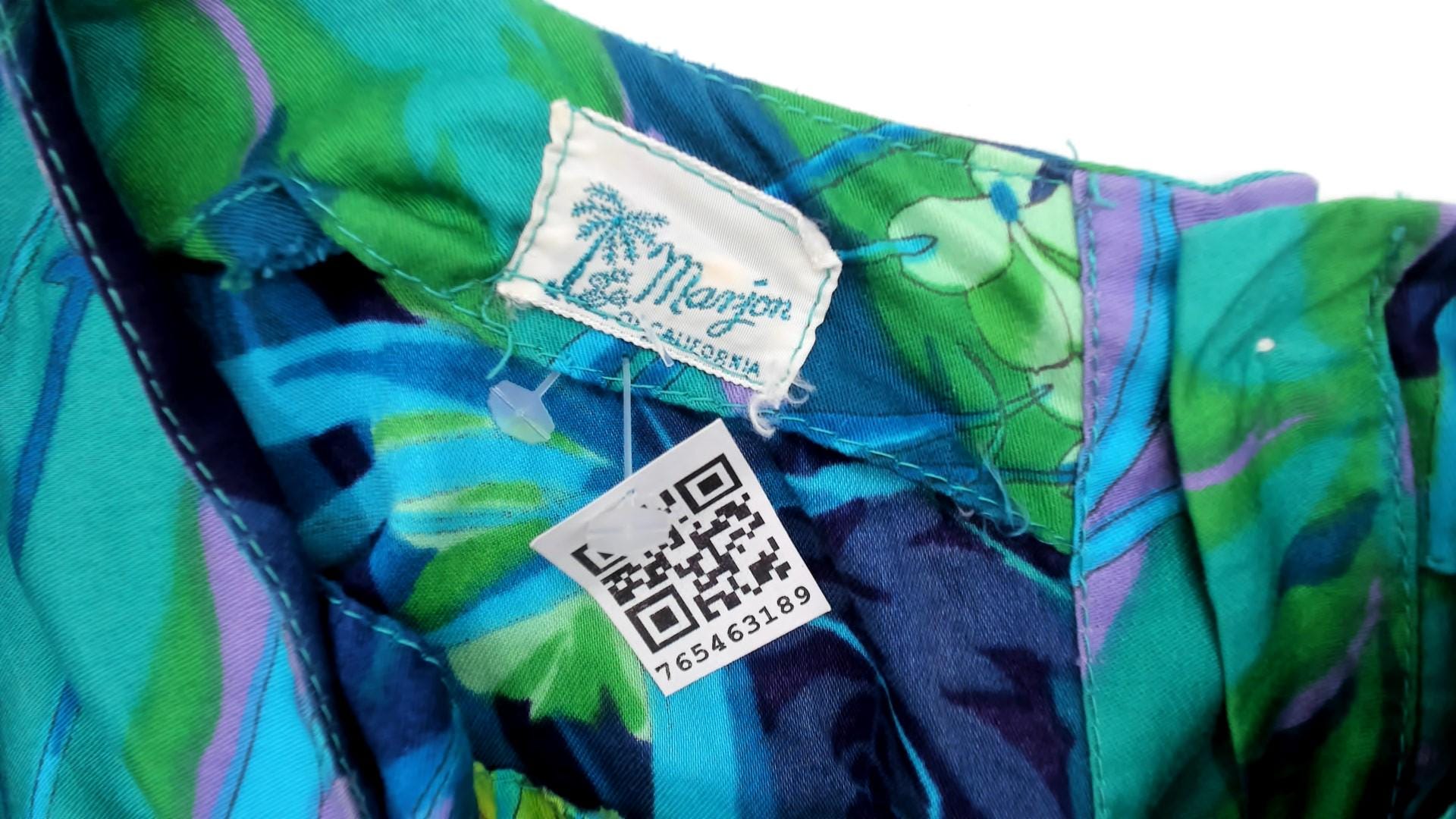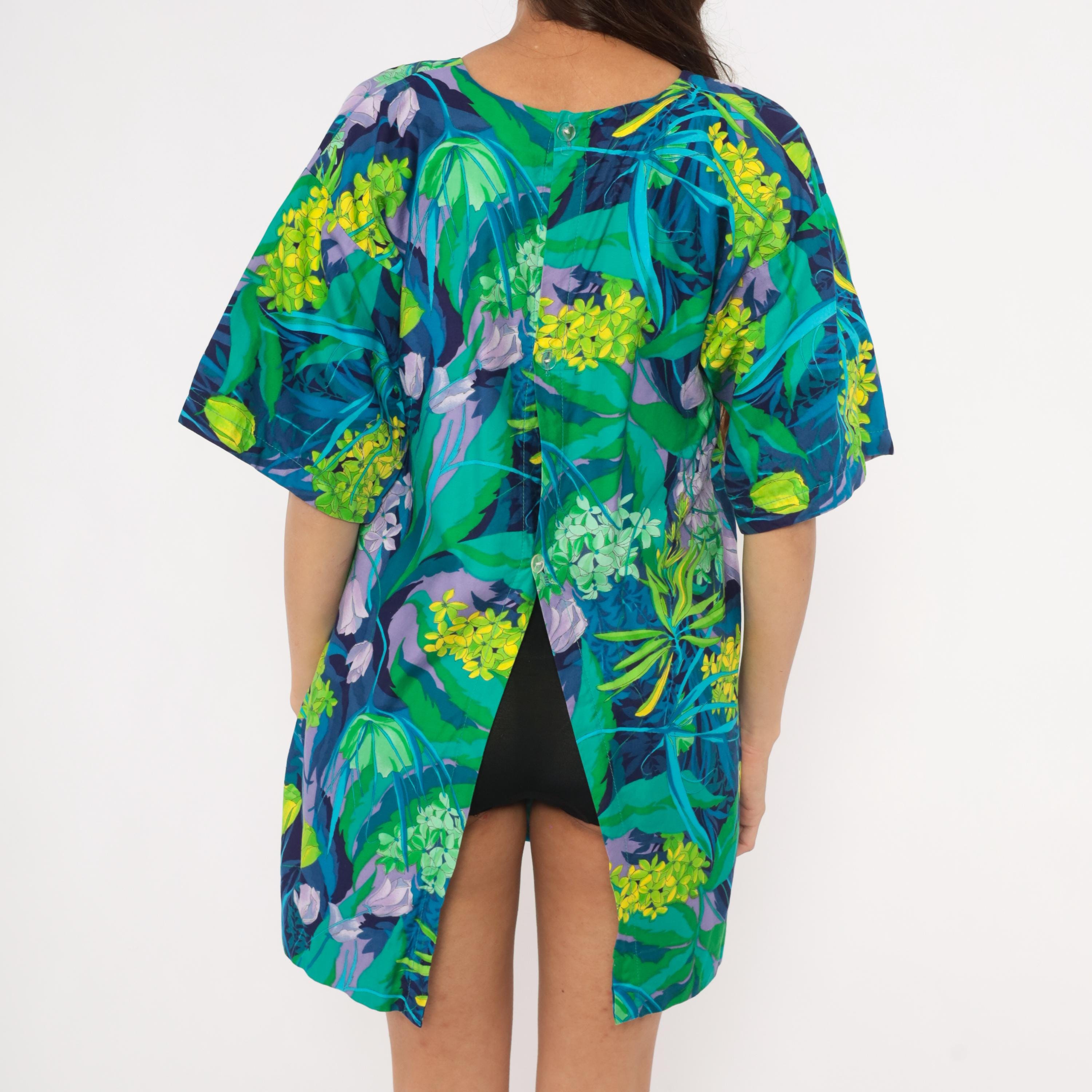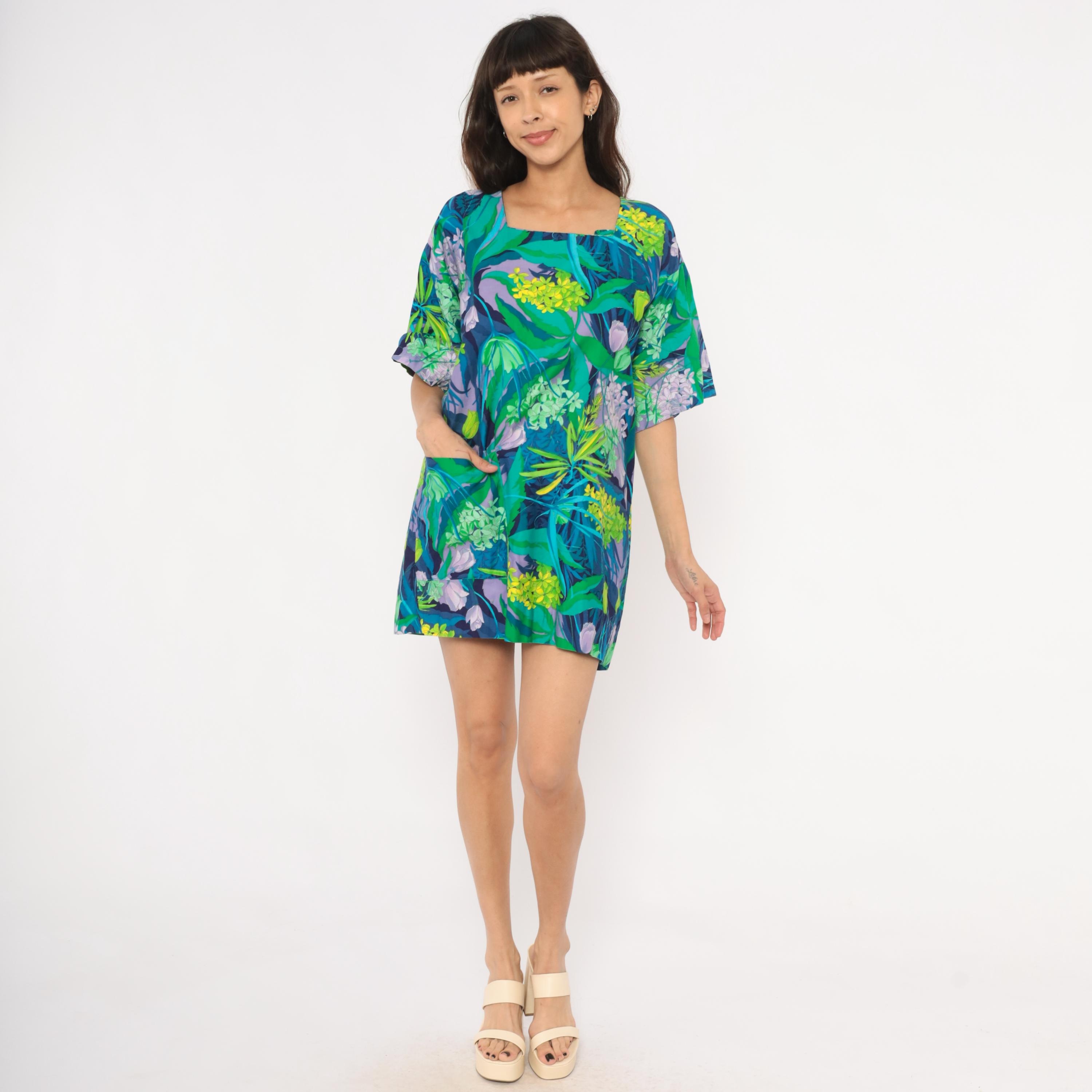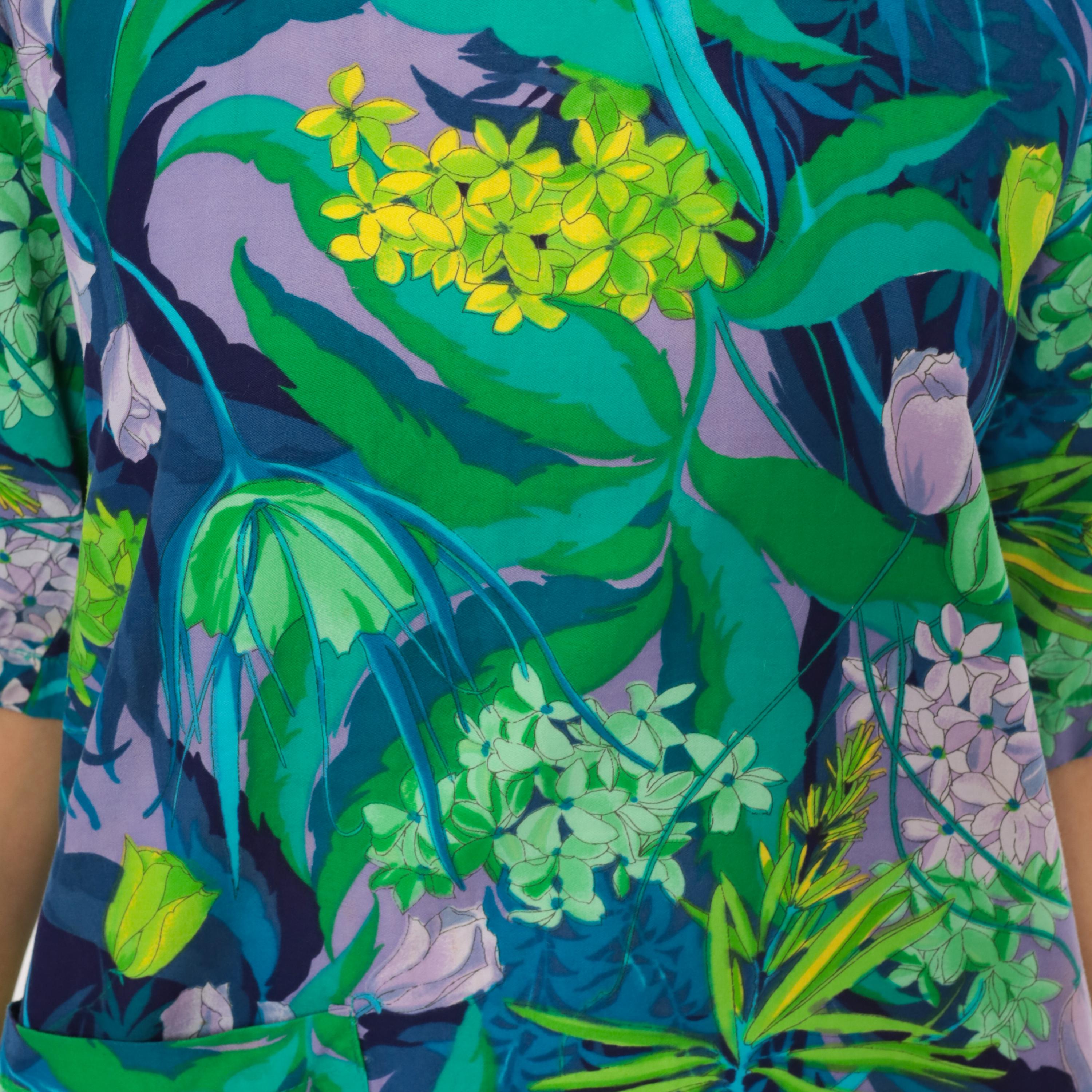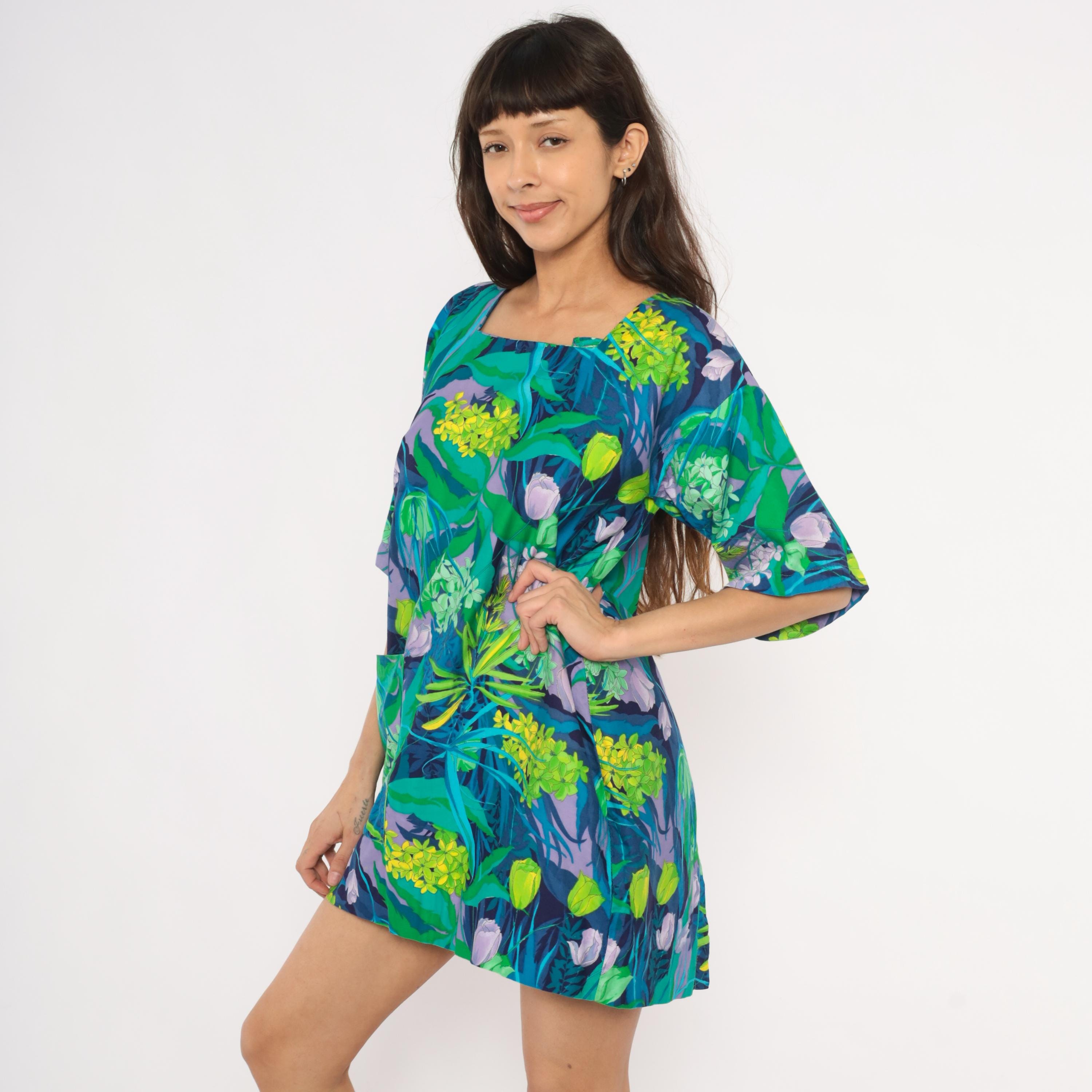 70s tropical botanical print mini tunic dress from Marjon with a square neckline, short wide sleeves, and back button closure with an open slit at the hem. Green, teal, purple, lavender, and yellow floral pattern across the entire garment with illustrations of hydrangeas, tulips, and leafy foliage. Front patch pocket on the left hip, relaxed straight silhouette.