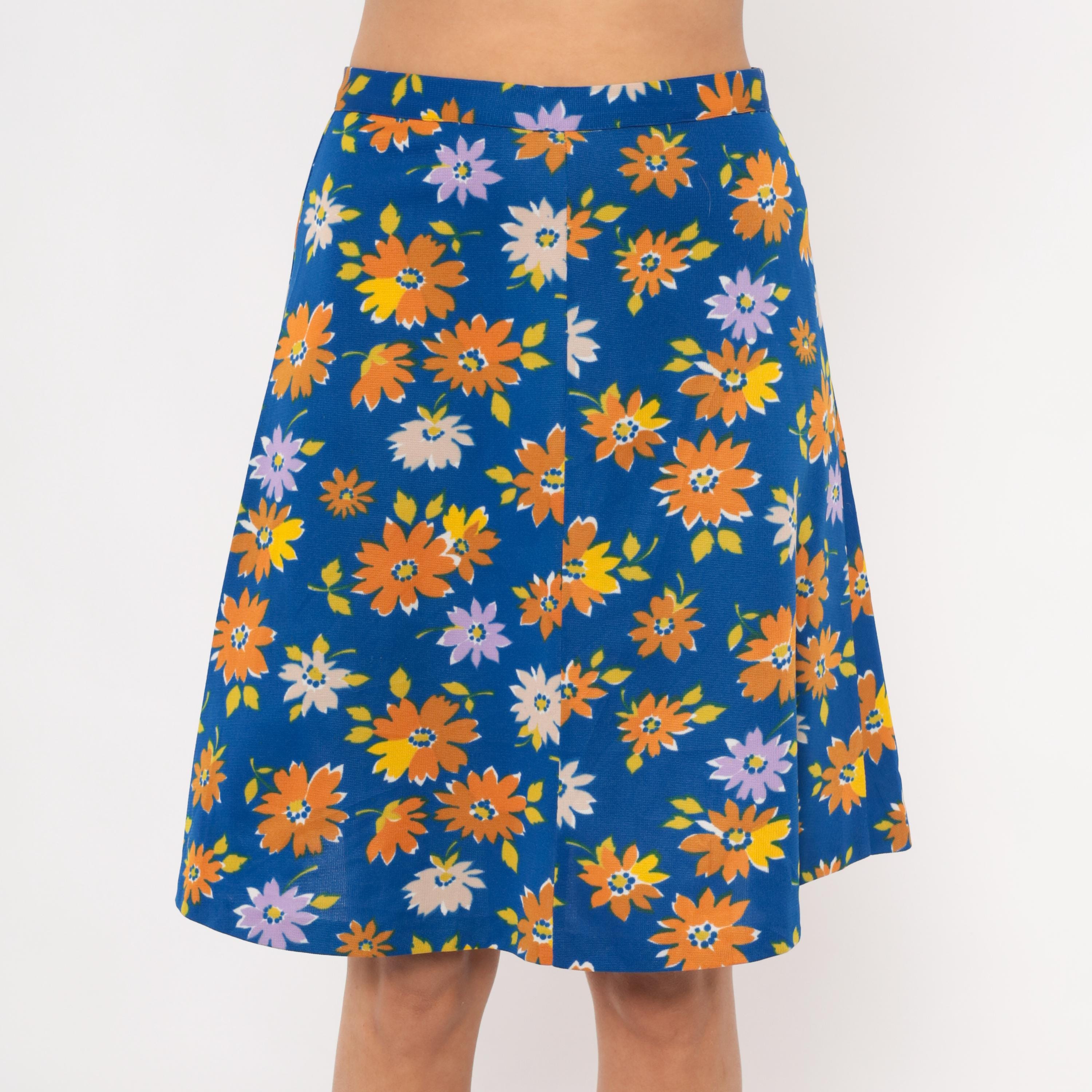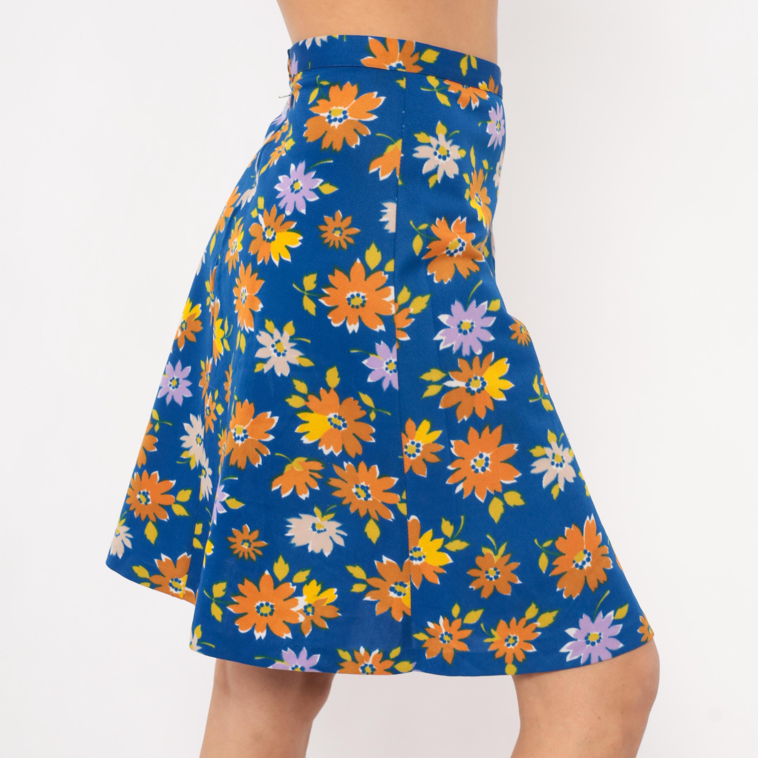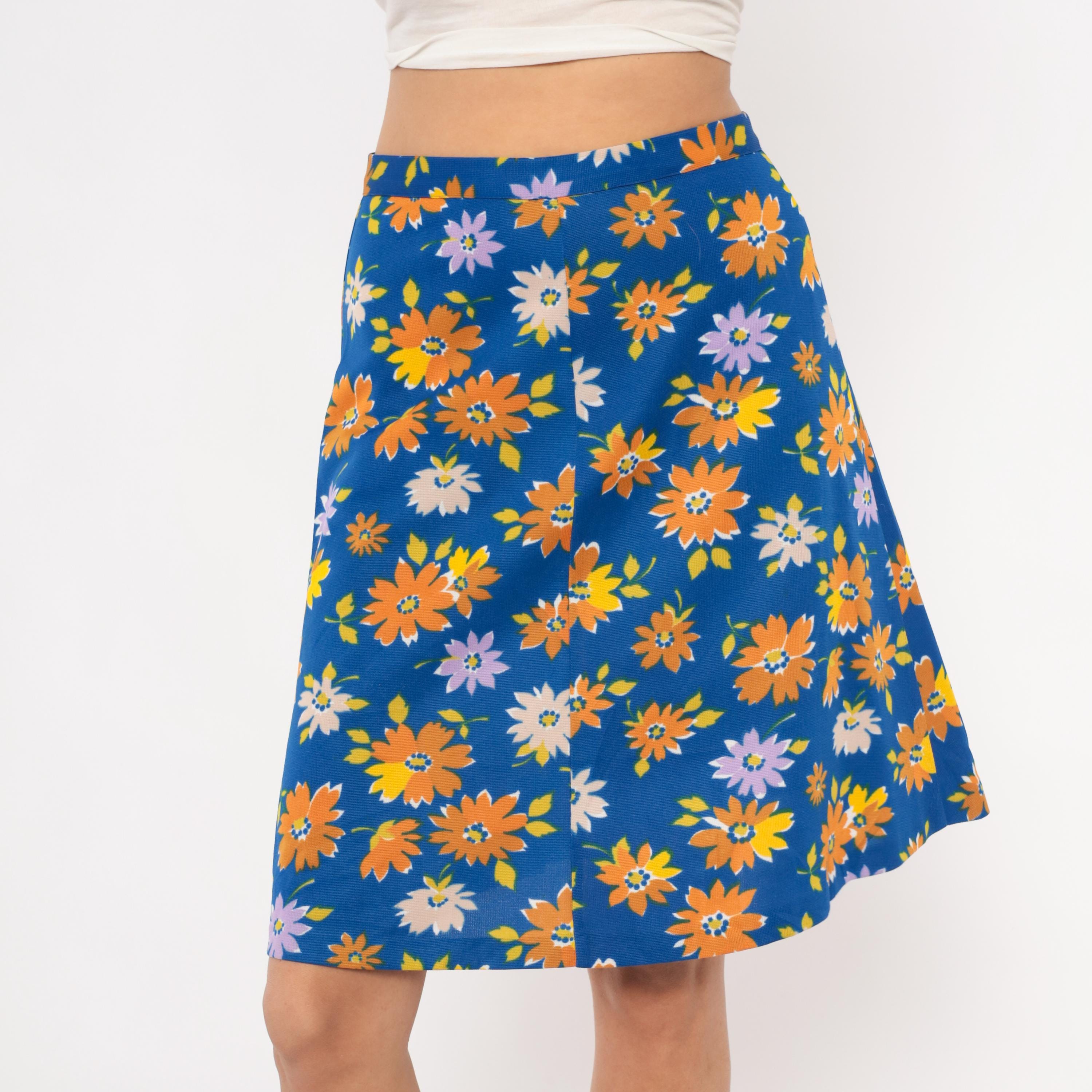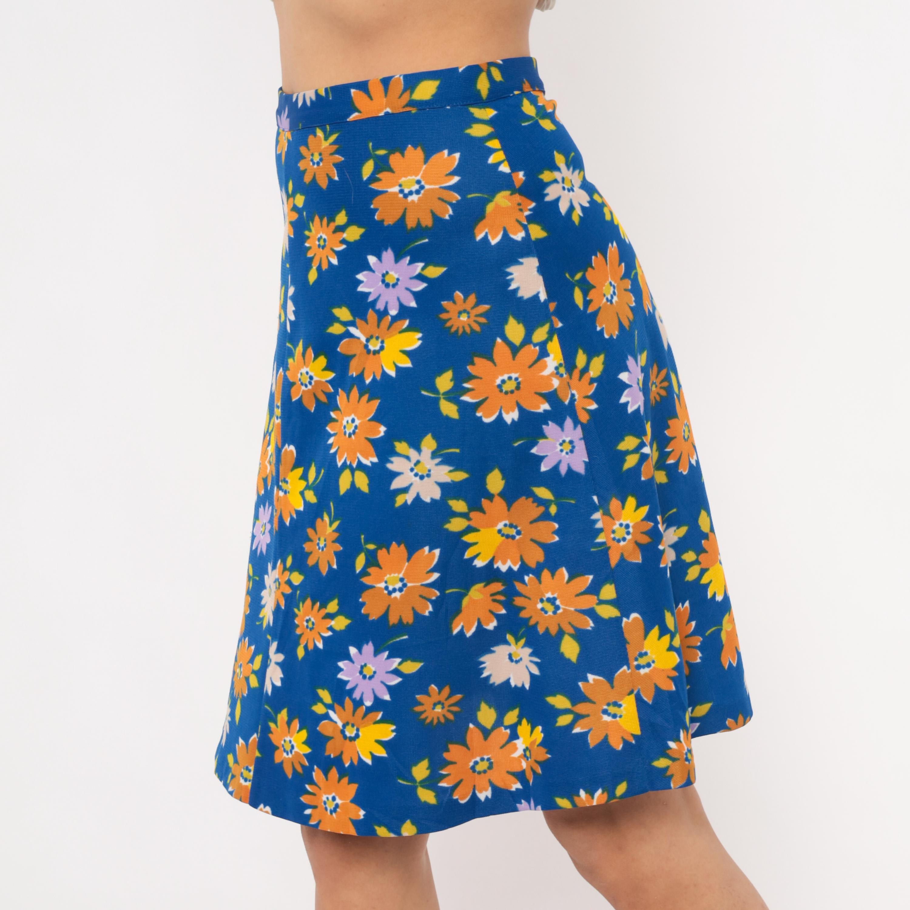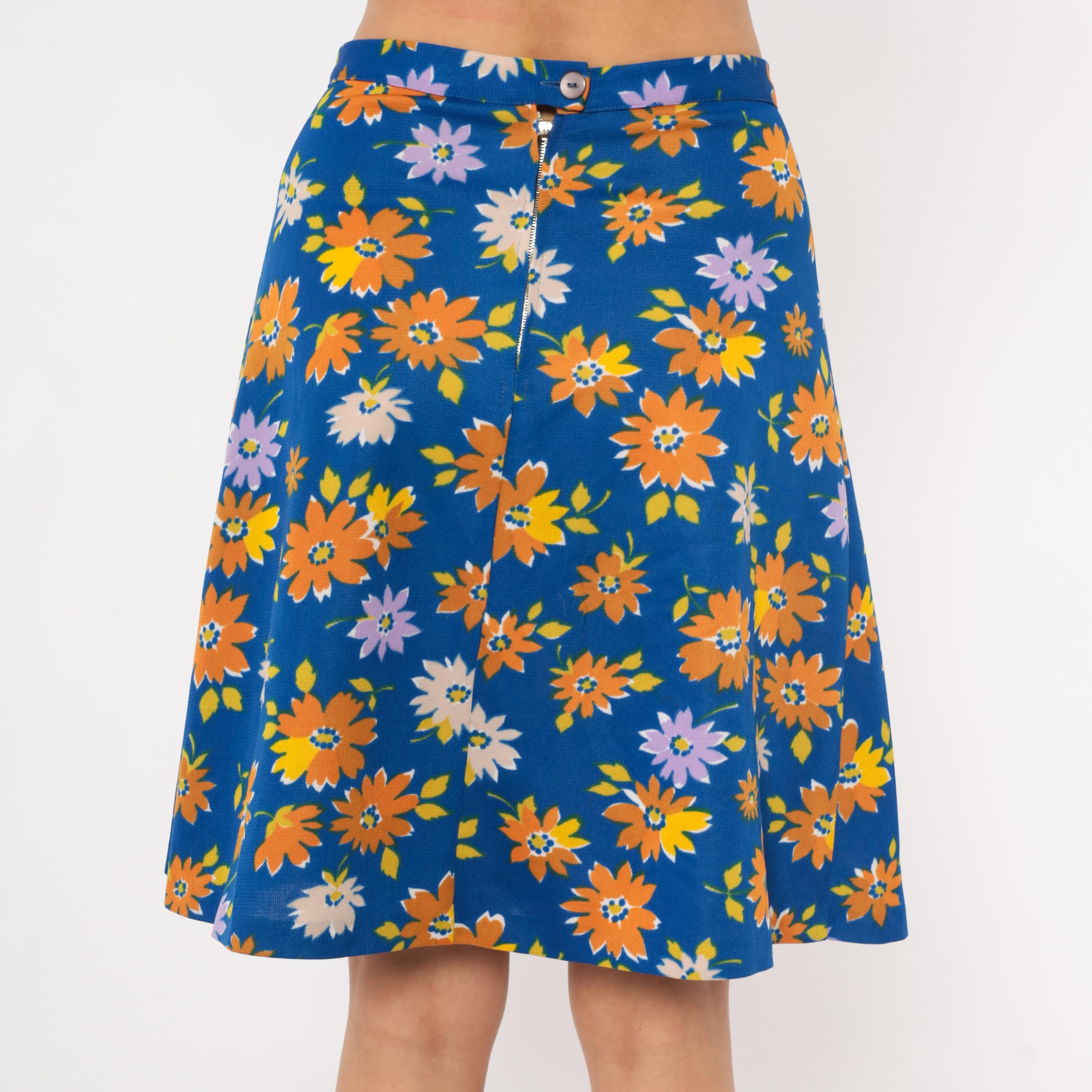 Cobalt blue A-line skirt from the 1970s with an allover daisy print in orange, yellow, lavender, and white. Back zipper closure with a single button at the waistband. Knee-length hem with a gently flared silhouette and fitted waist.