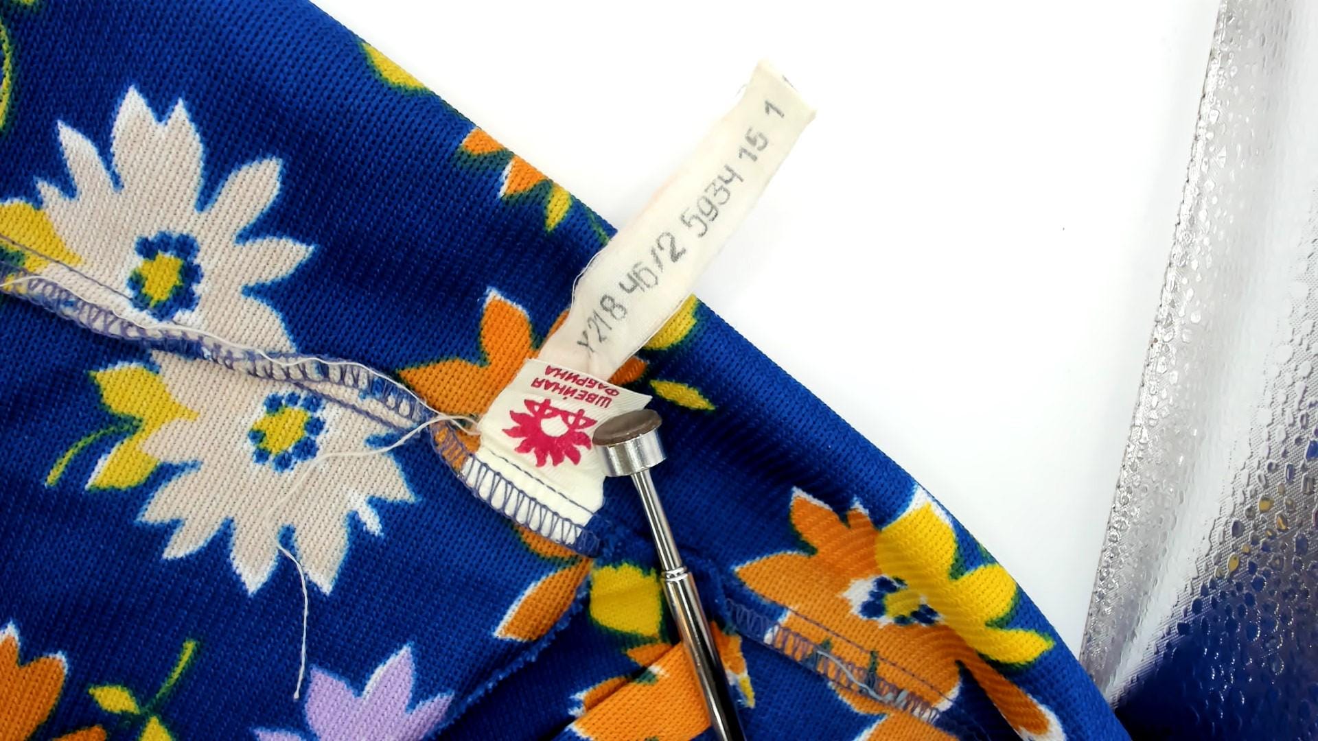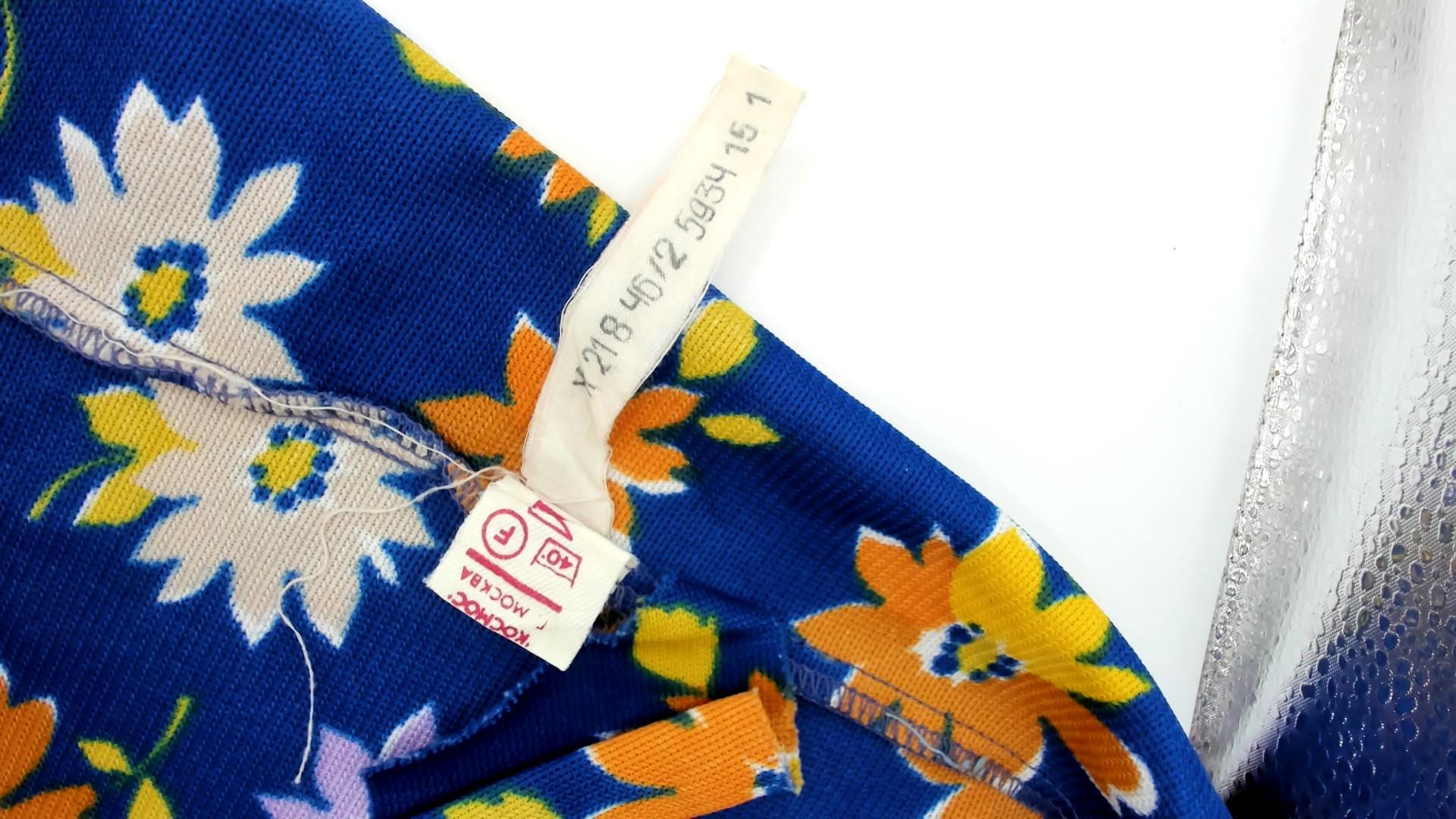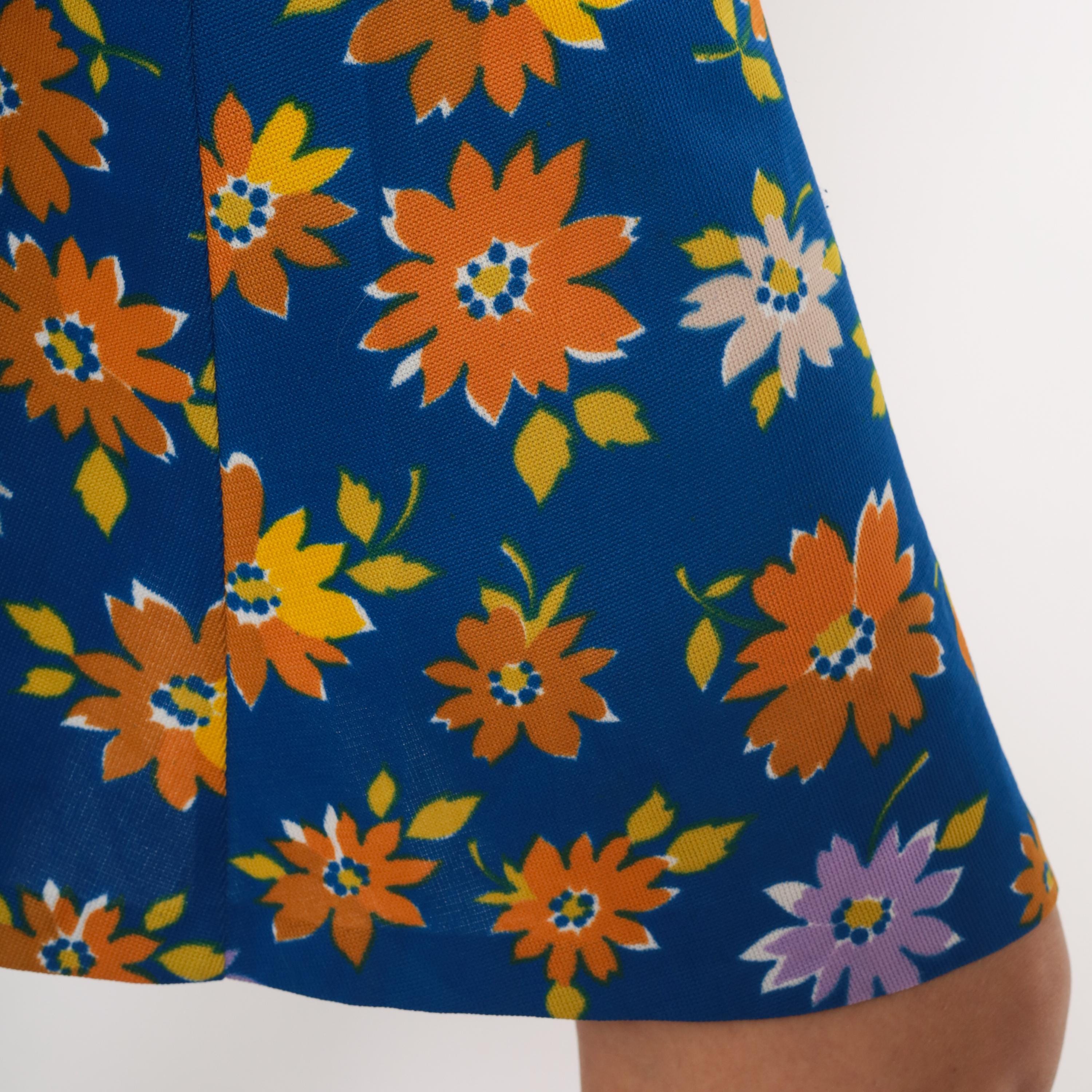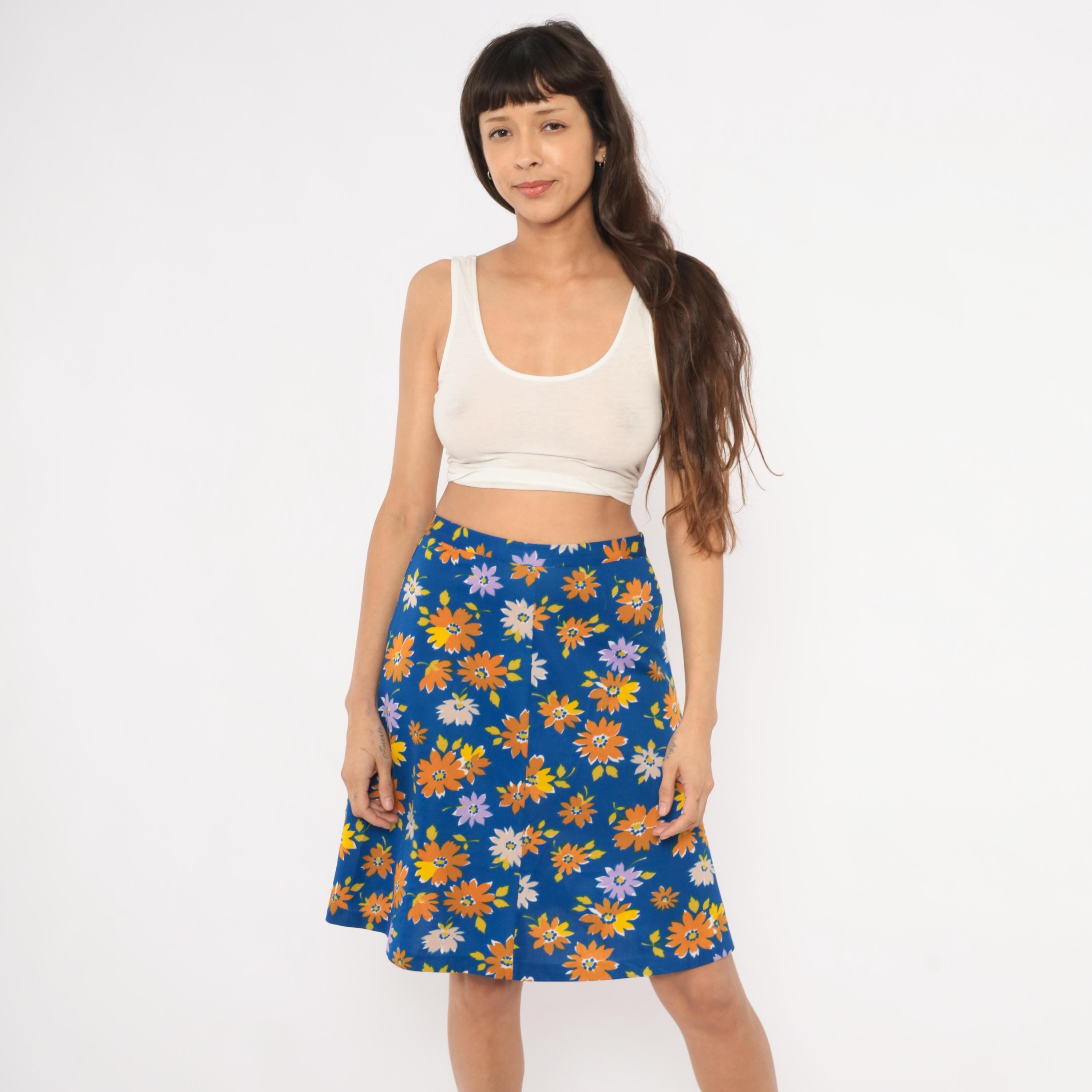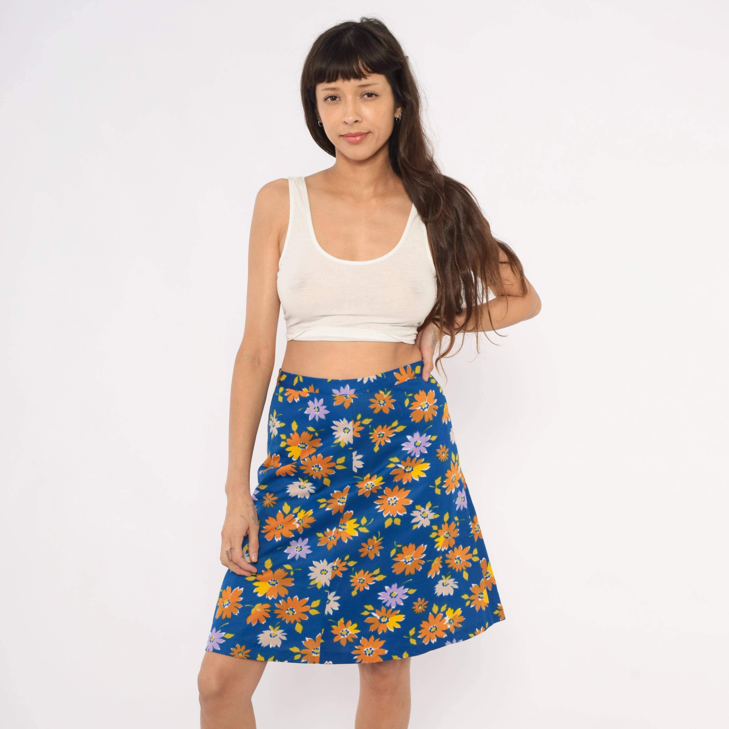 Cobalt blue A-line skirt from the 1970s with an allover daisy print in orange, yellow, lavender, and white. Back zipper closure with a single button at the waistband. Knee-length hem with a gently flared silhouette and fitted waist.