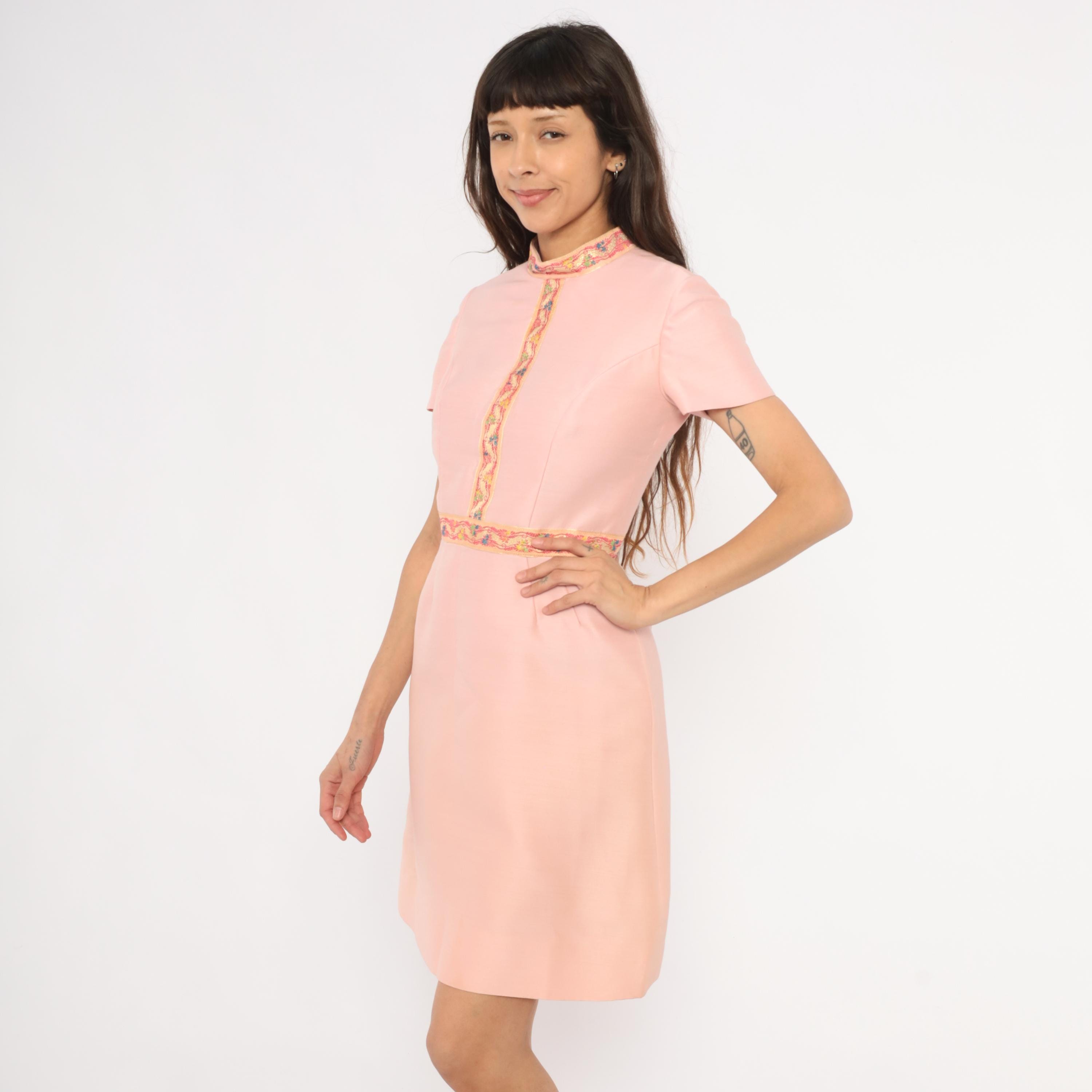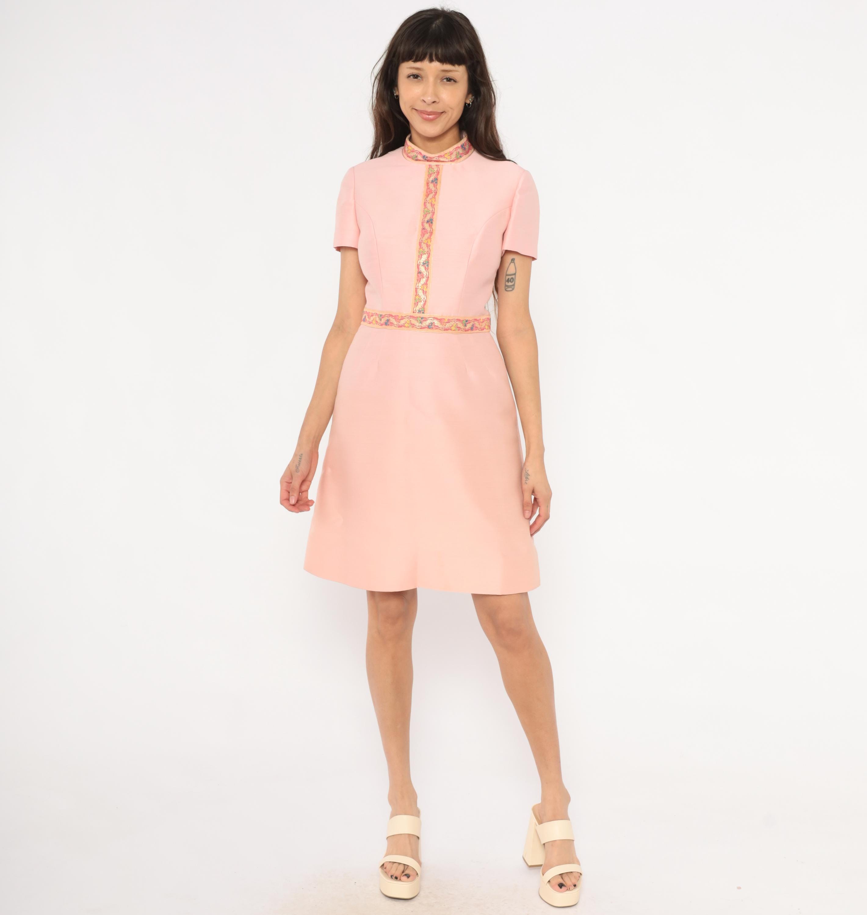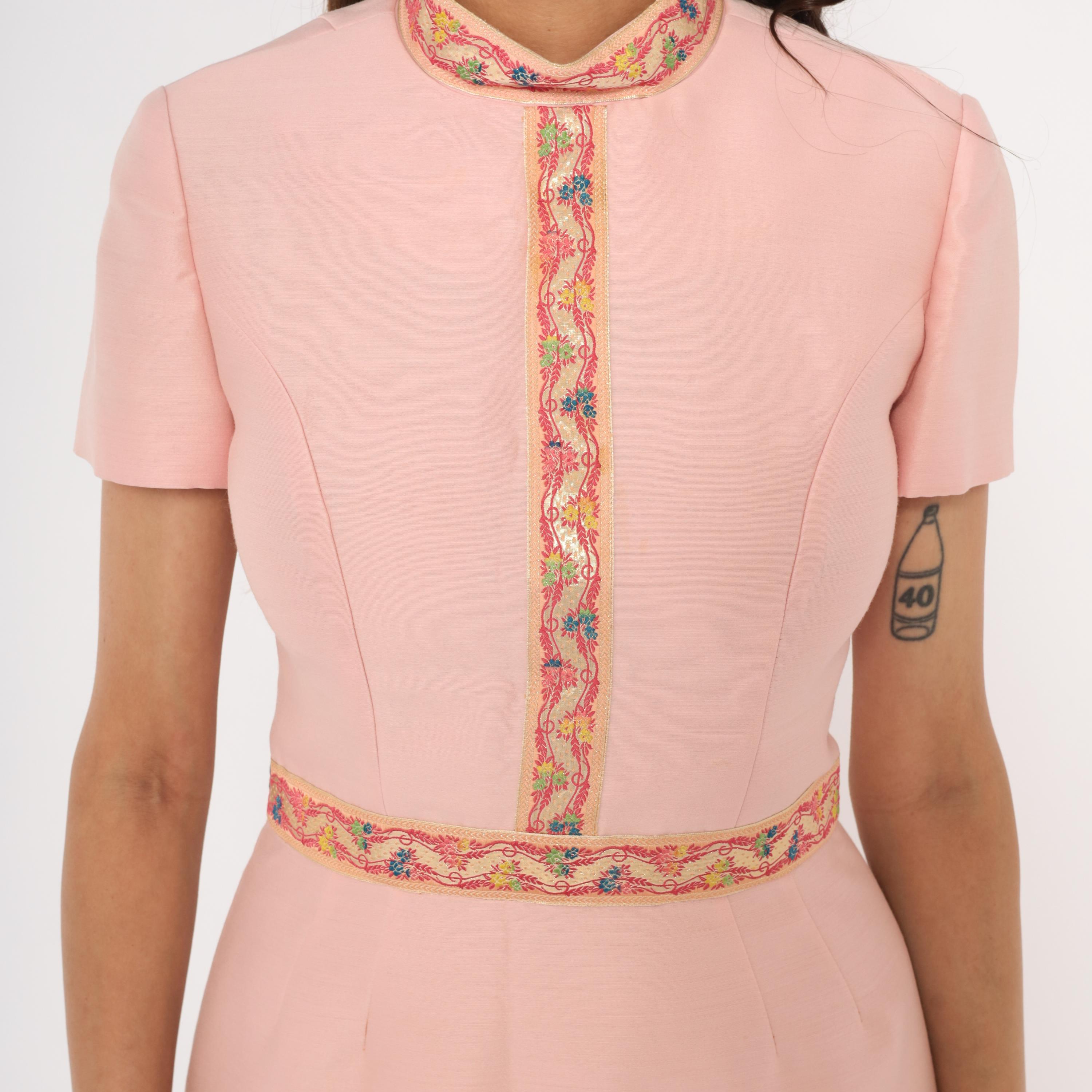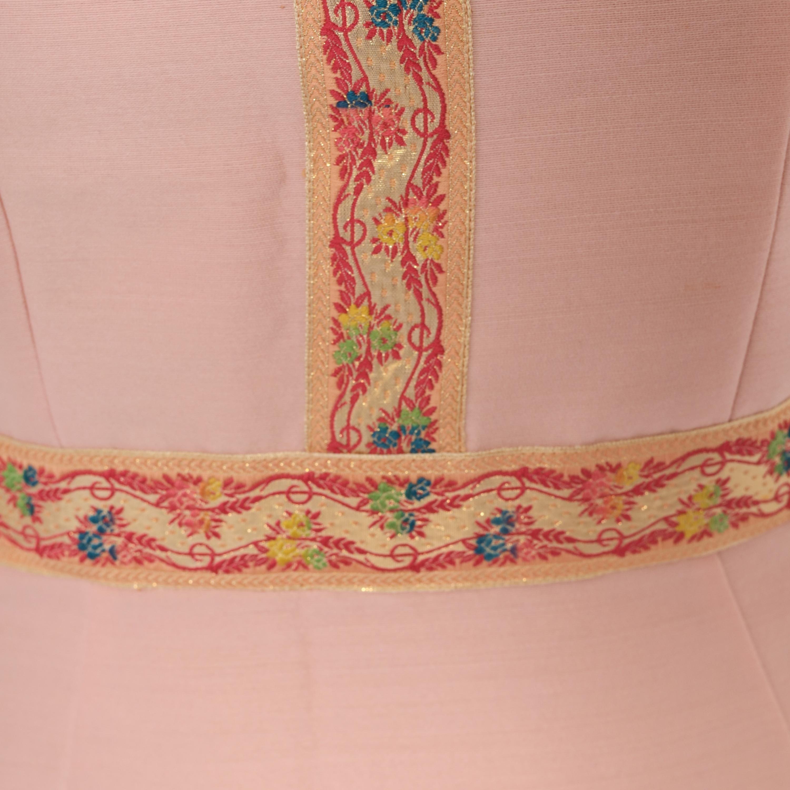 60s blush pink A-line dress with ornate floral embroidered ribbon trim along the mandarin collar, center front placket, and waistline. Short sleeves, fitted bodice with princess seaming, and a gently flared skirt falling to knee length. Back zipper closure. The ribbon trim incorporates pink, blue, yellow, and green woven floral motifs against a gold-threaded ground.