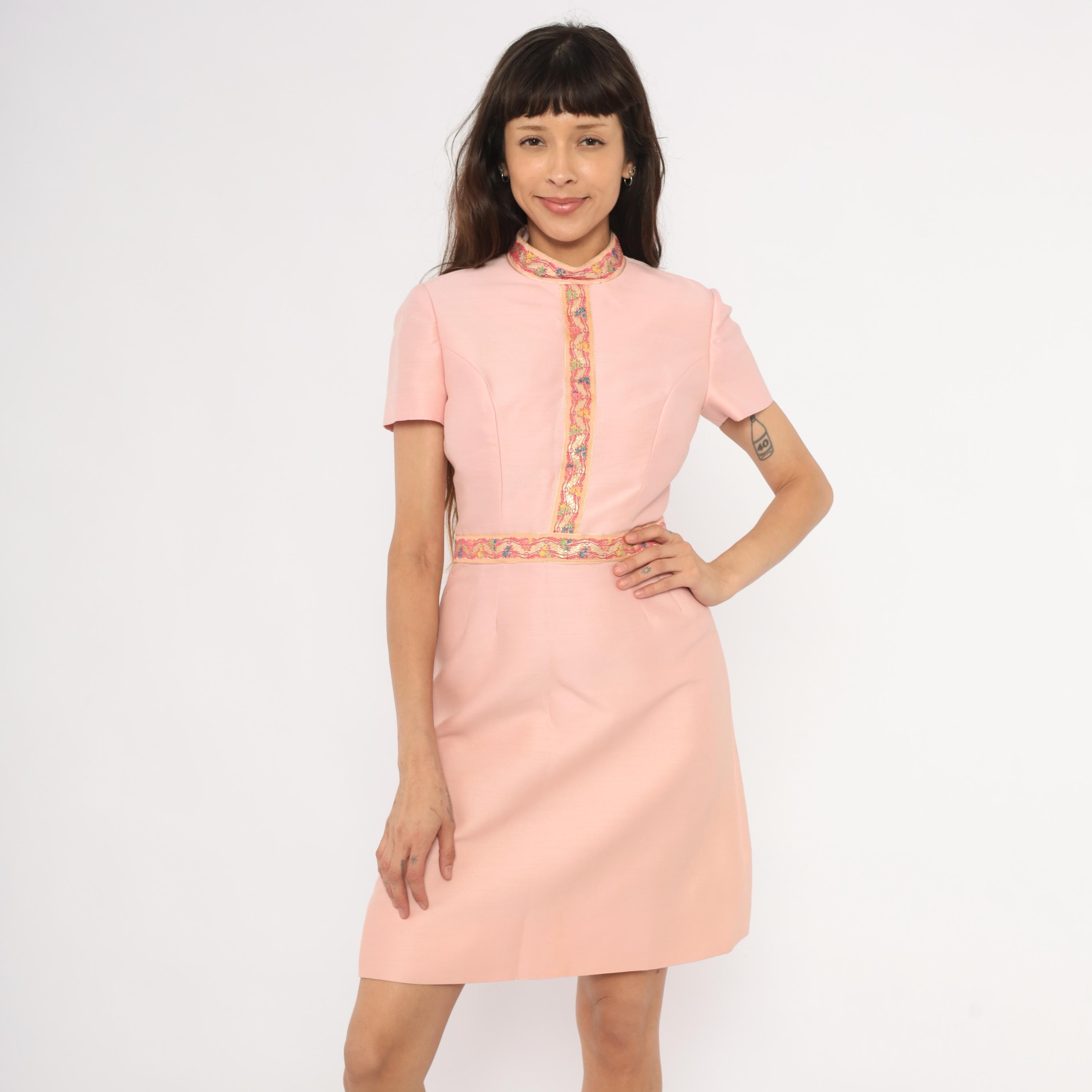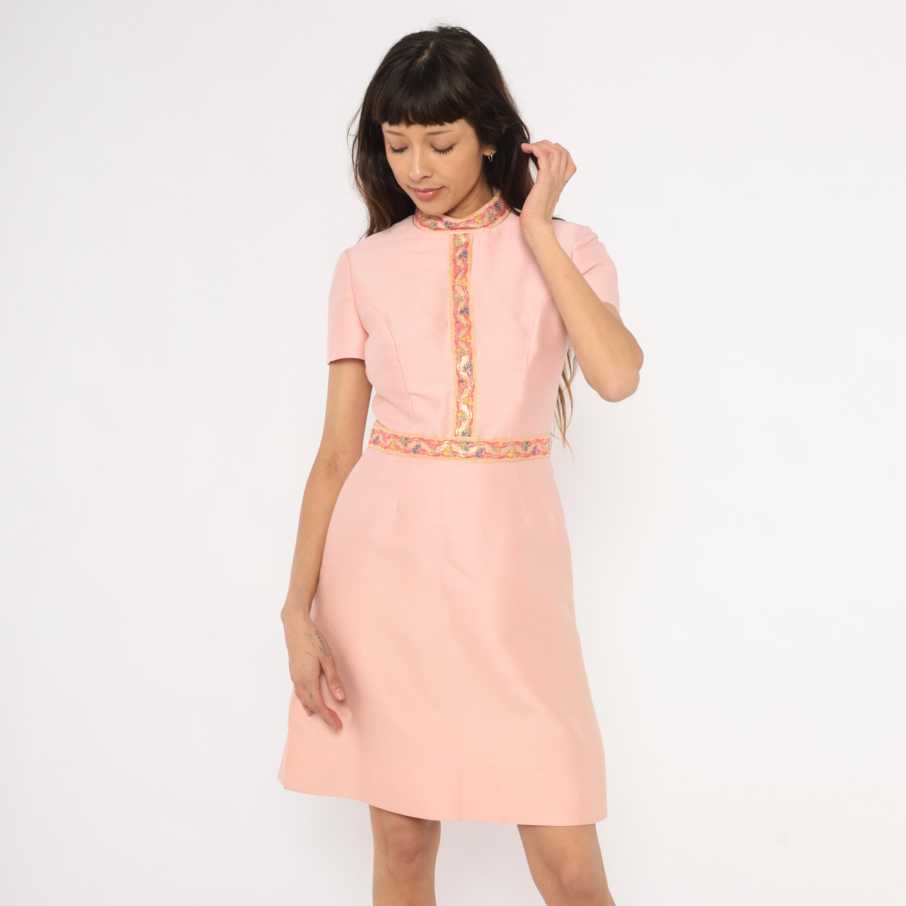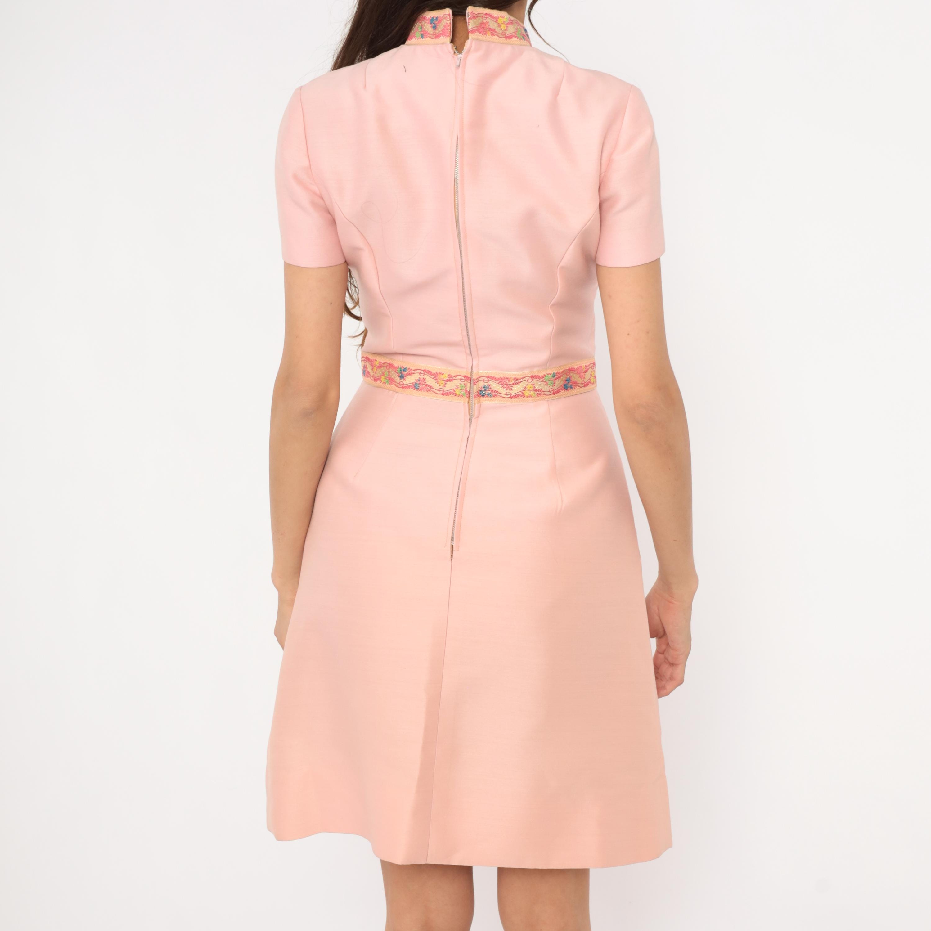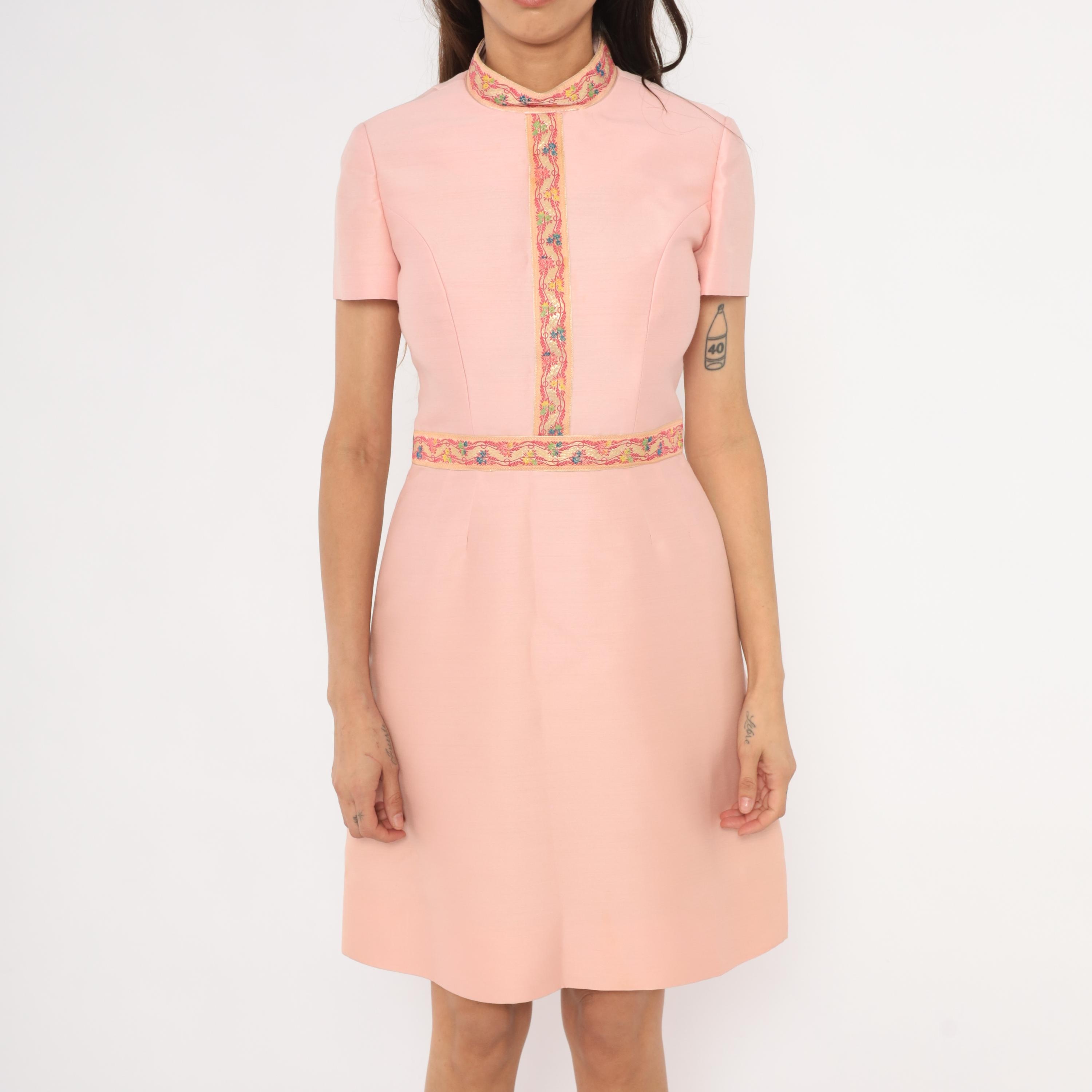 60s blush pink A-line dress with ornate floral embroidered ribbon trim along the mandarin collar, center front placket, and waistline. Short sleeves, fitted bodice with princess seaming, and a gently flared skirt falling to knee length. Back zipper closure. The ribbon trim incorporates pink, blue, yellow, and green woven floral motifs against a gold-threaded ground.