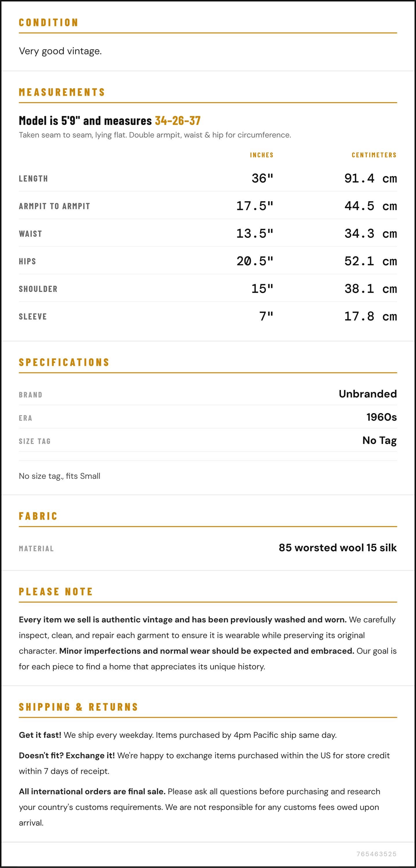 Measurements are taken laying flat and should be doubled where applicable. The "best fits" size is just an estimate, and vintage sizing can vary from modern sizing. Please use measurements to ensure proper fit. The best thing to do is measure a similar item of your own, and compare. When an item has stretch, we will list the unstretched dimensions with the stretched measurement afterwards.