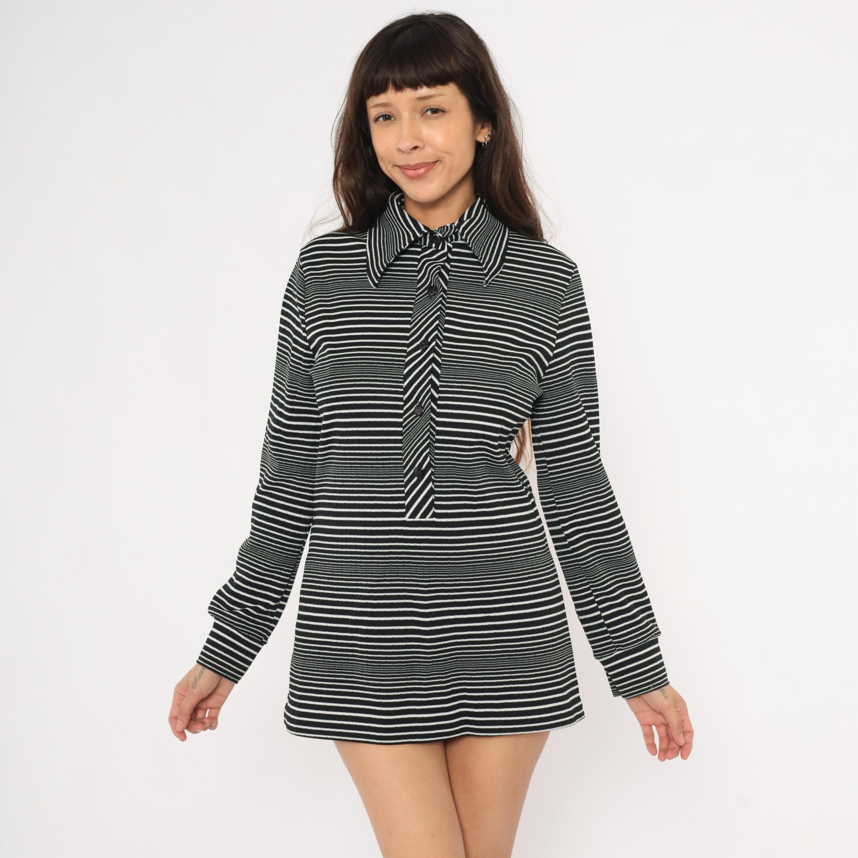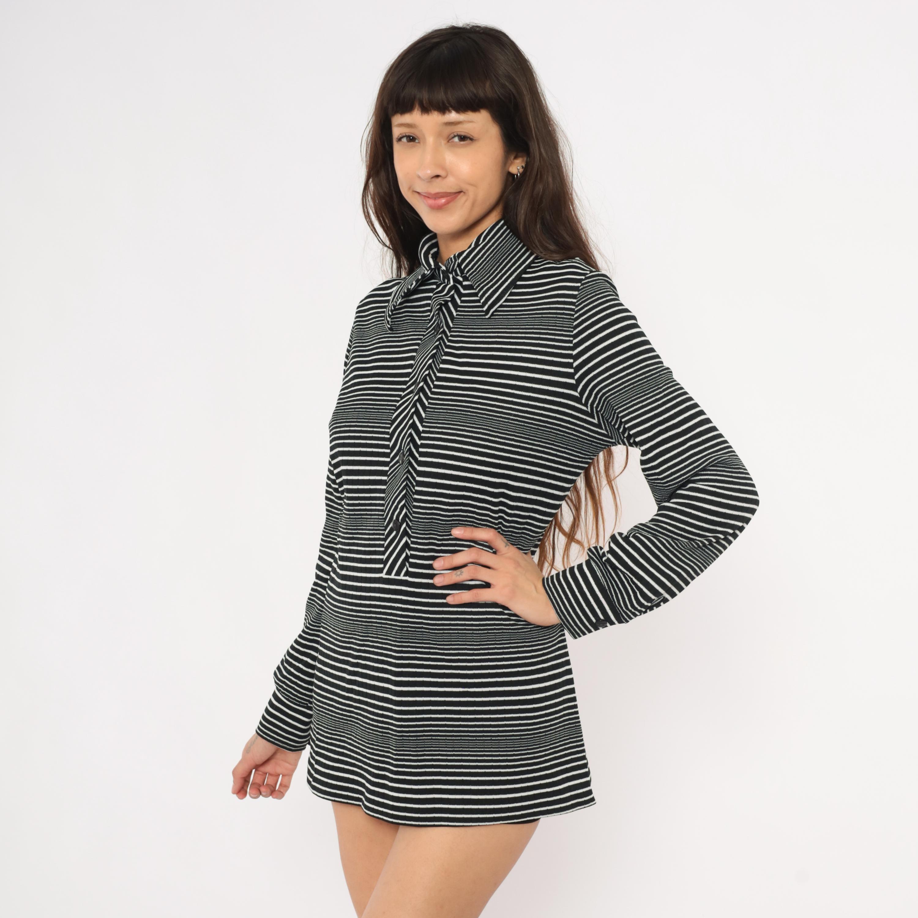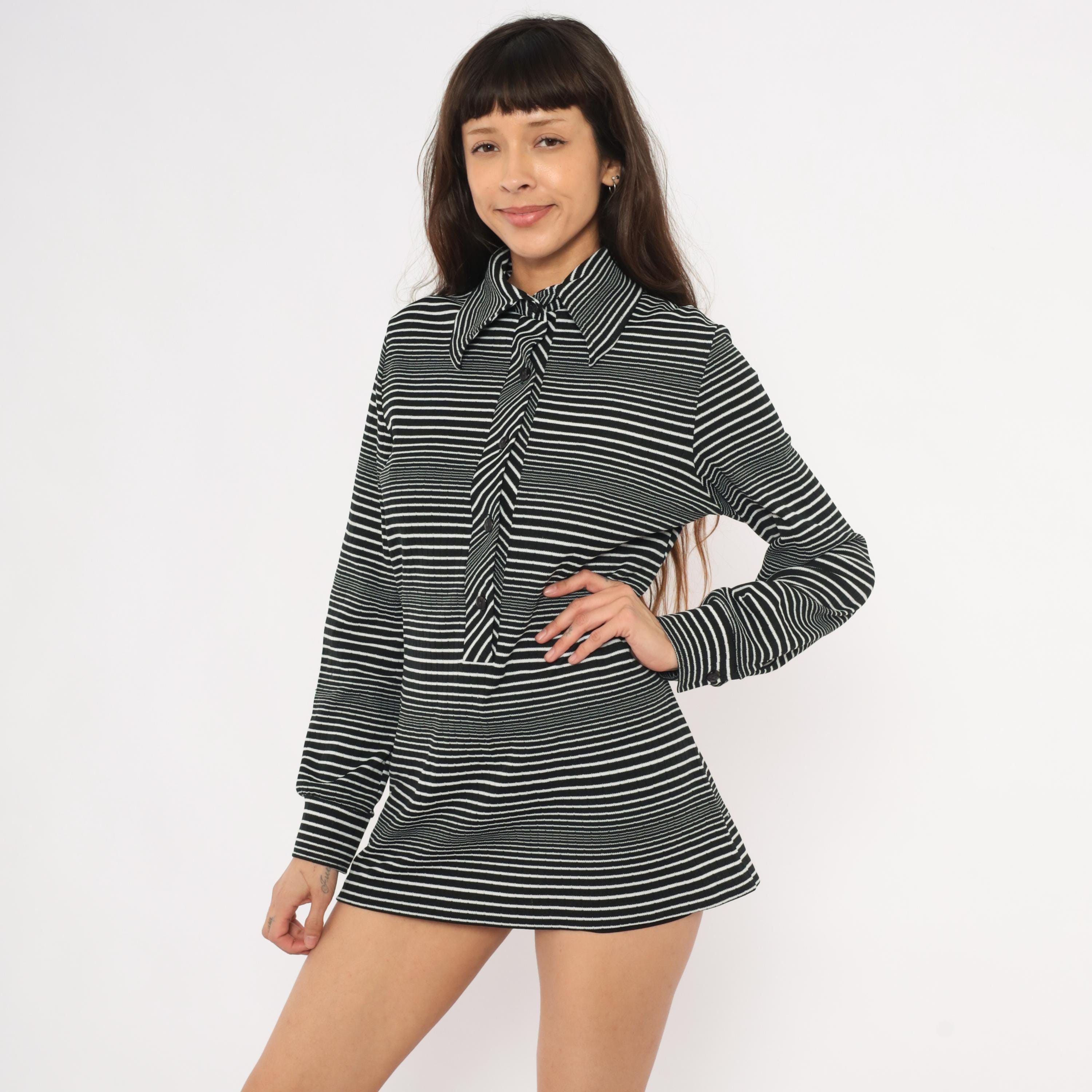 70s black and white horizontal striped tunic top from Lucky Tops with a pointed collar and attached tie at the neckline. Button front placket with long sleeves and a relaxed straight body that falls to upper thigh. The tie drapes diagonally across the front buttons, with the stripe pattern running at a bias angle along the tie detail.