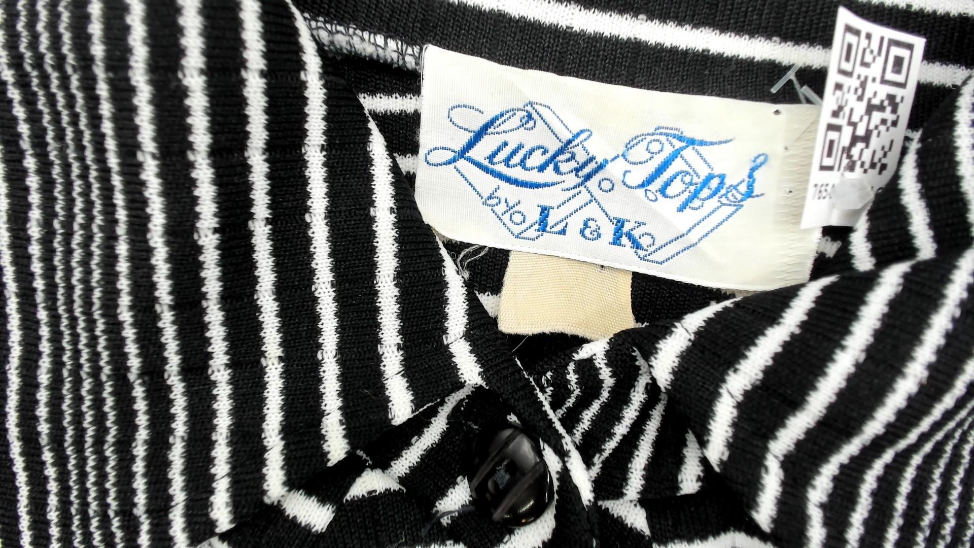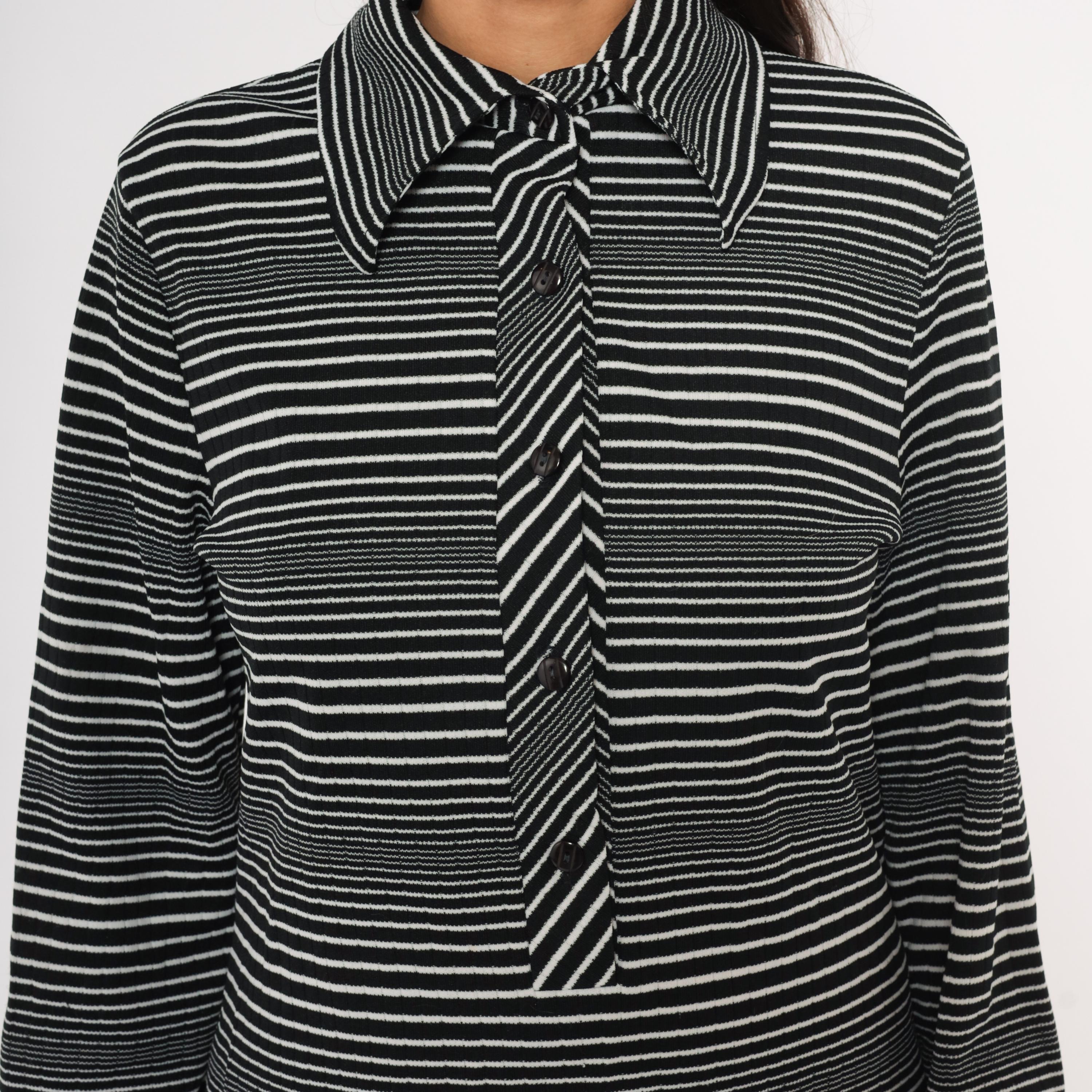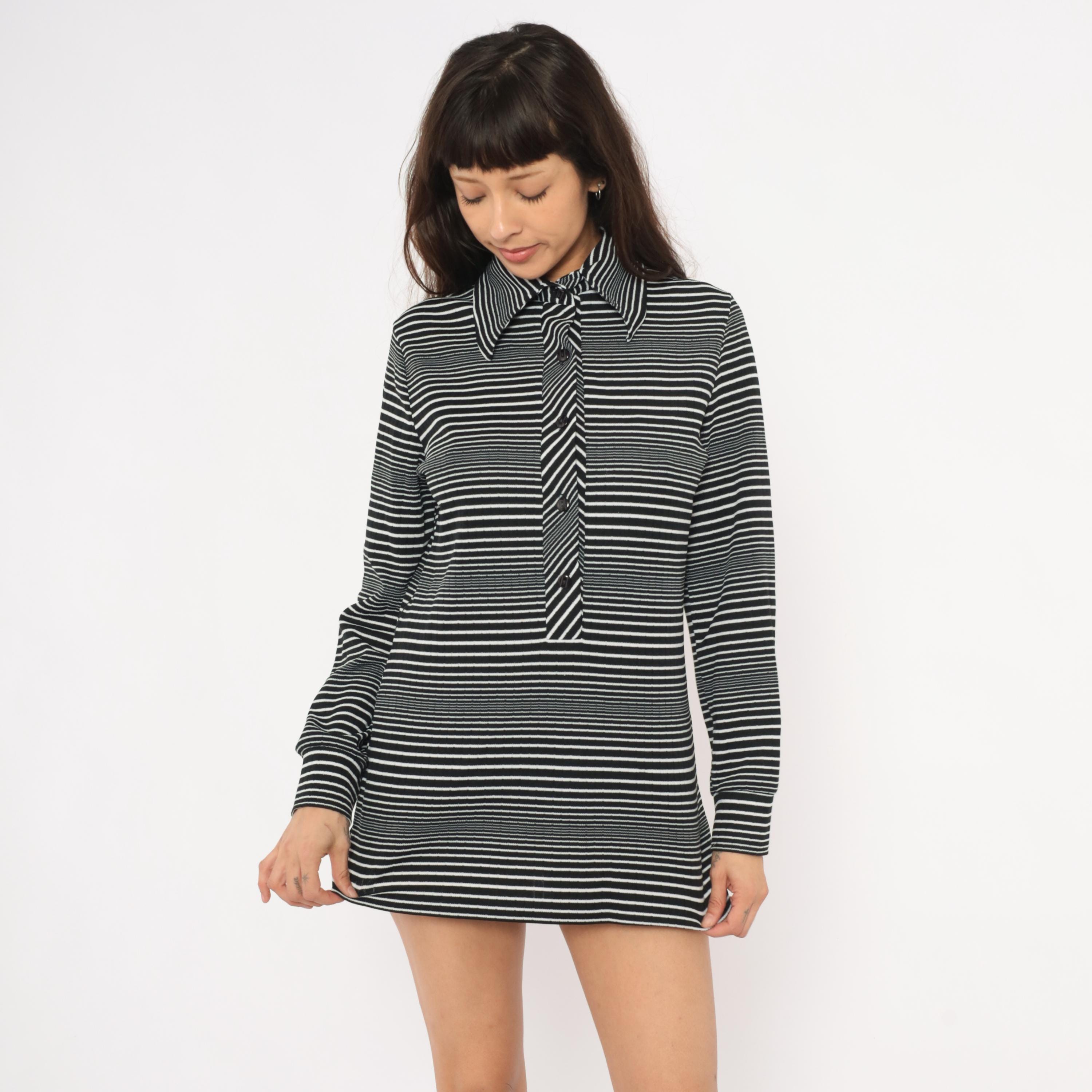 70s black and white horizontal striped tunic top from Lucky Tops with a pointed collar and attached tie at the neckline. Button front placket with long sleeves and a relaxed straight body that falls to upper thigh. The tie drapes diagonally across the front buttons, with the stripe pattern running at a bias angle along the tie detail.
