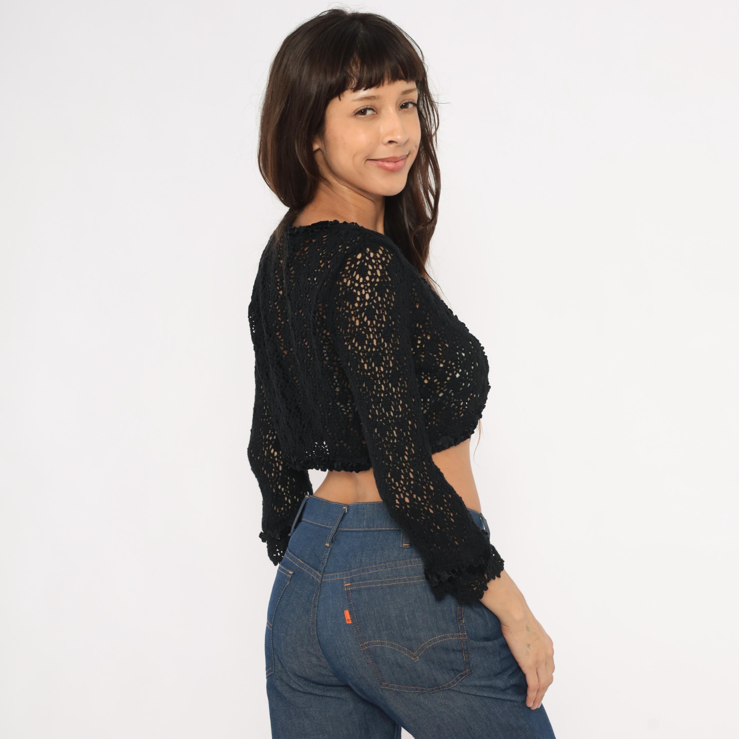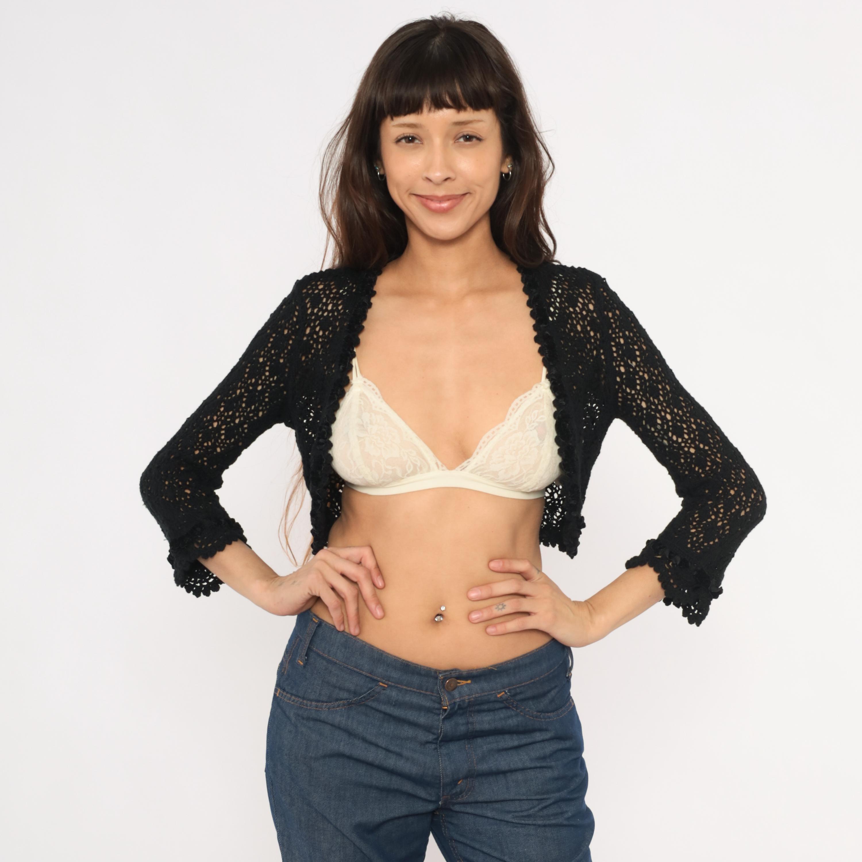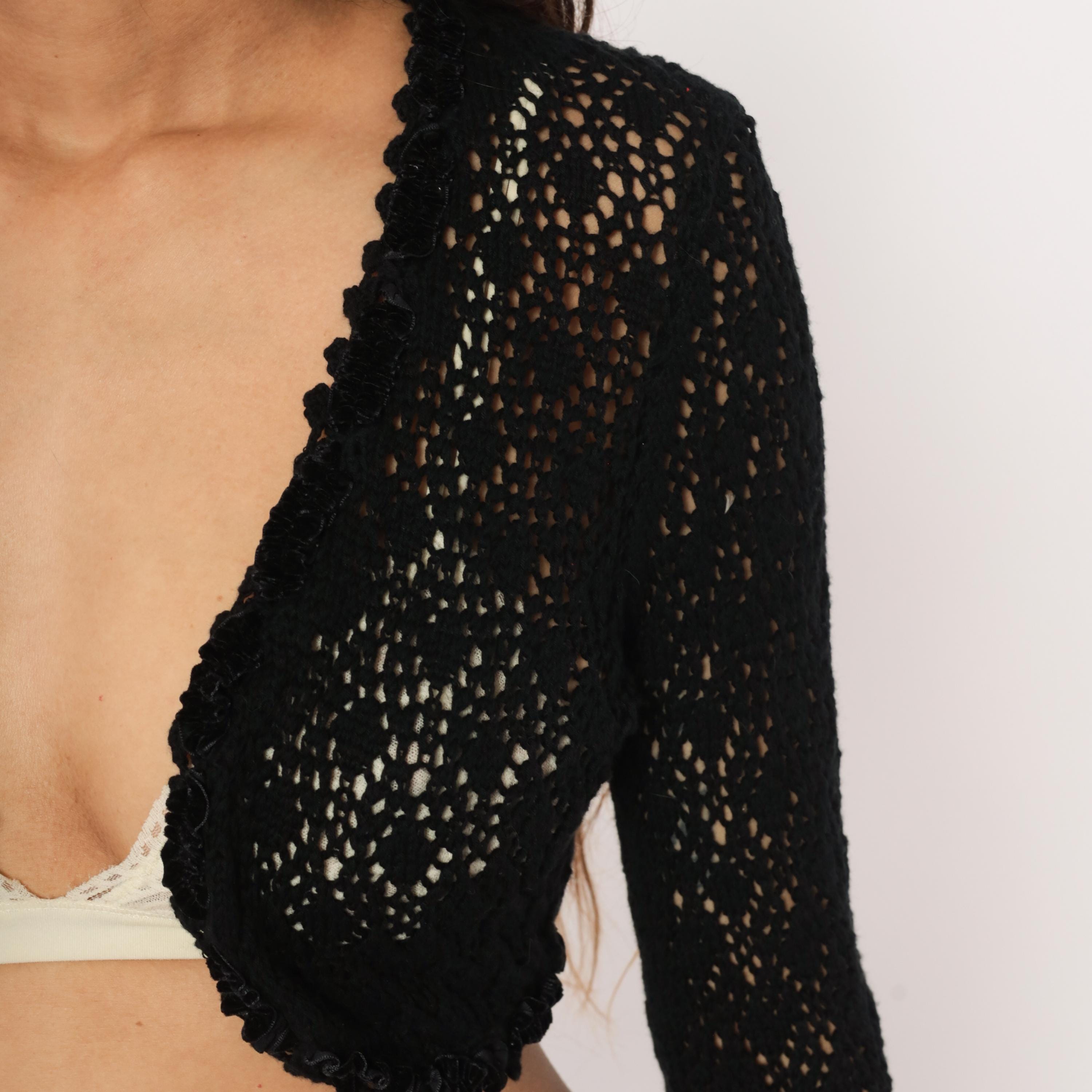 2000s black crochet bolero shrug from Express with an open front, deep V neckline, and scalloped ruffle trim along the edges and hem. Open lace pattern throughout with a diamond motif, three-quarter-length sleeves with ruffled cuffs. Cropped length hitting just below the bust.