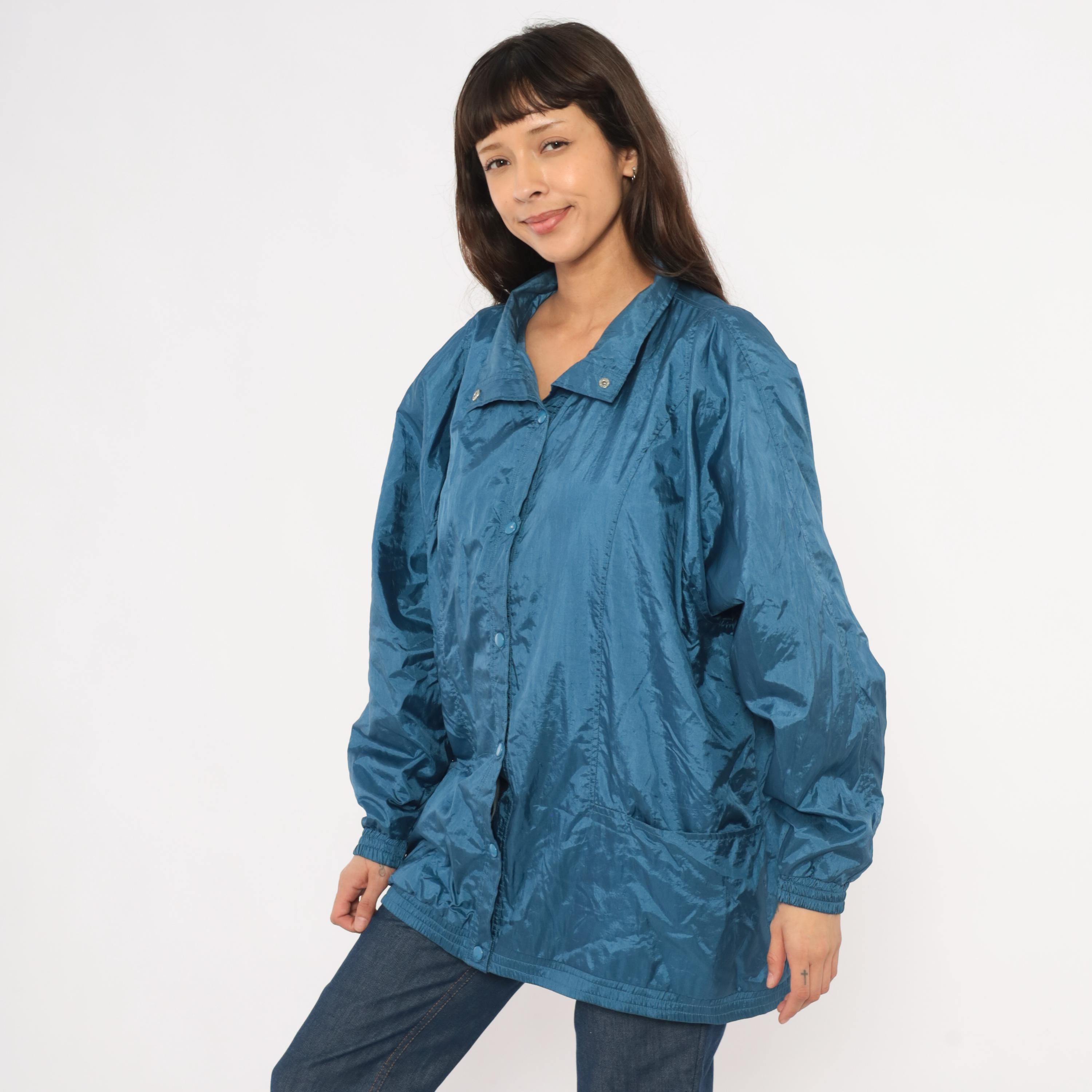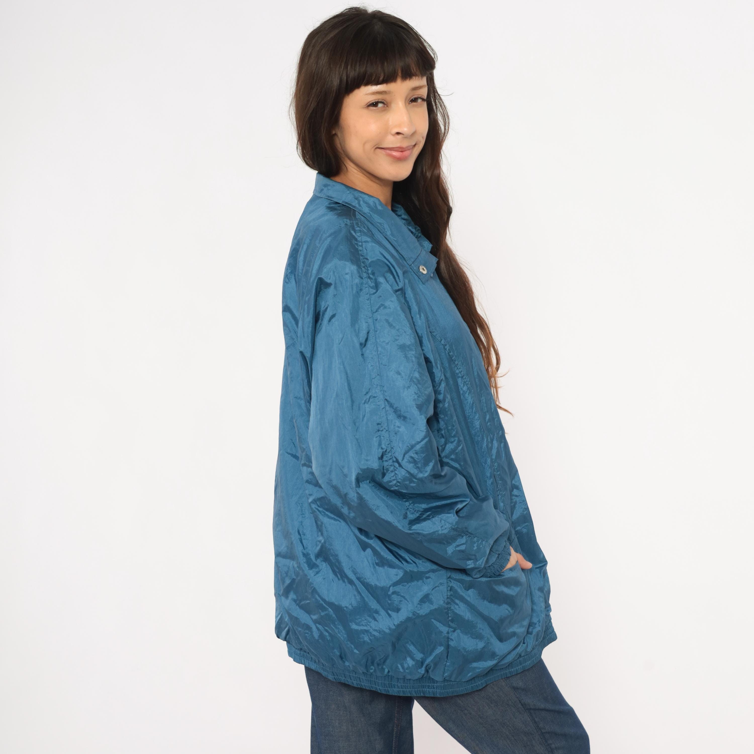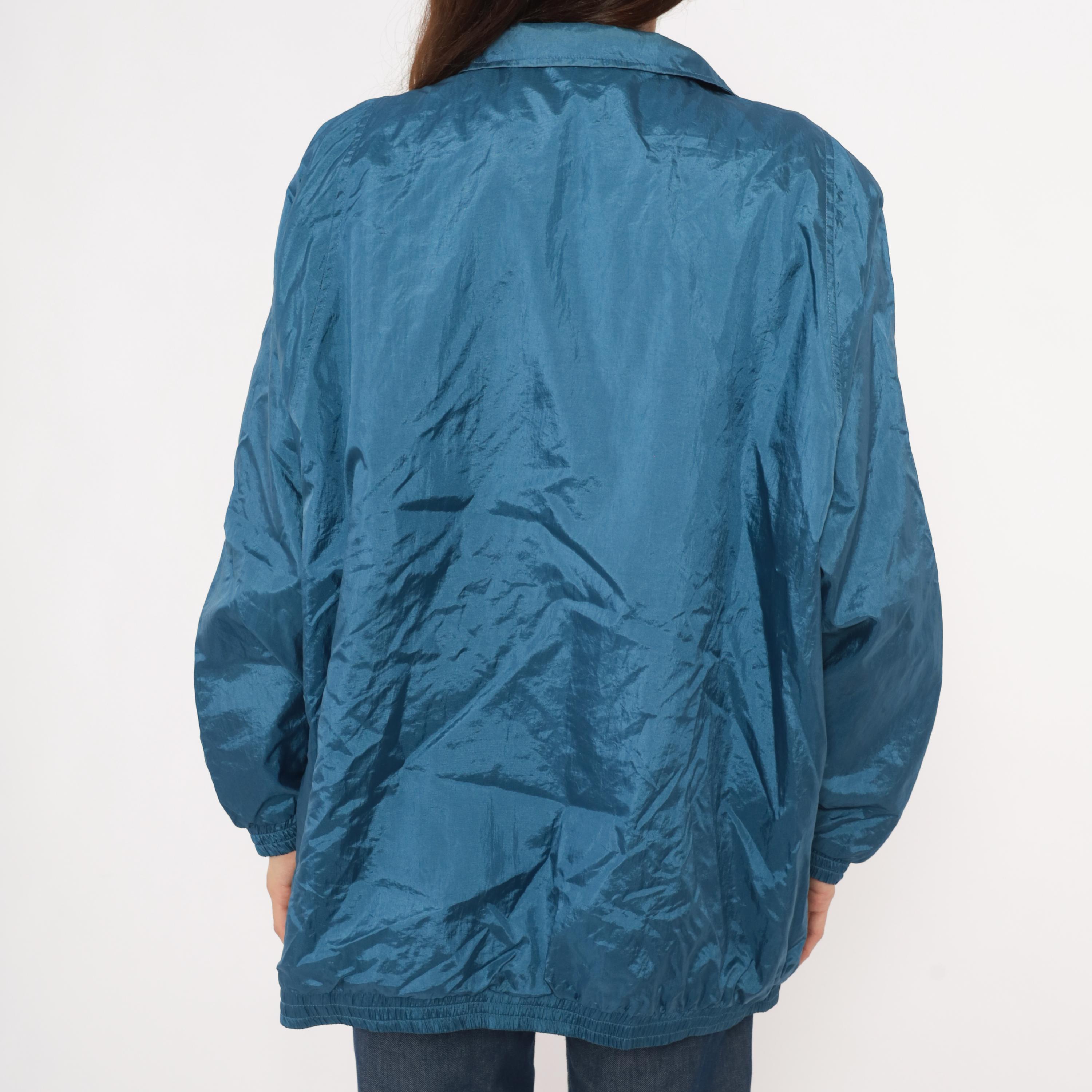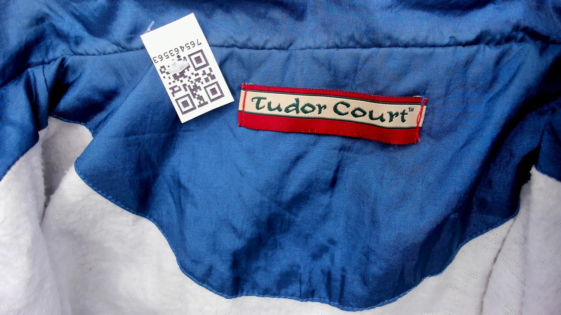80s coach jacket from Tudor Court in a steel blue tone with snap button front closure and fold-down collar. White cotton lining throughout the body, elasticized cuffs, and elasticized hem. Two slanted waist pockets on either side of the front.