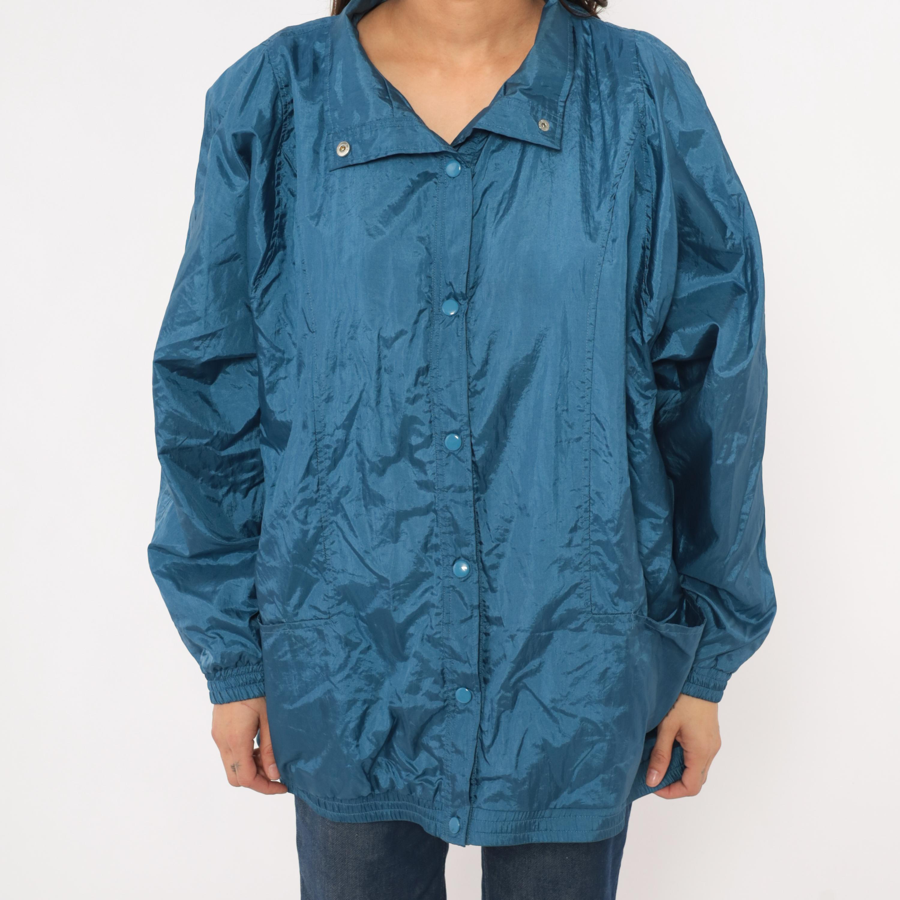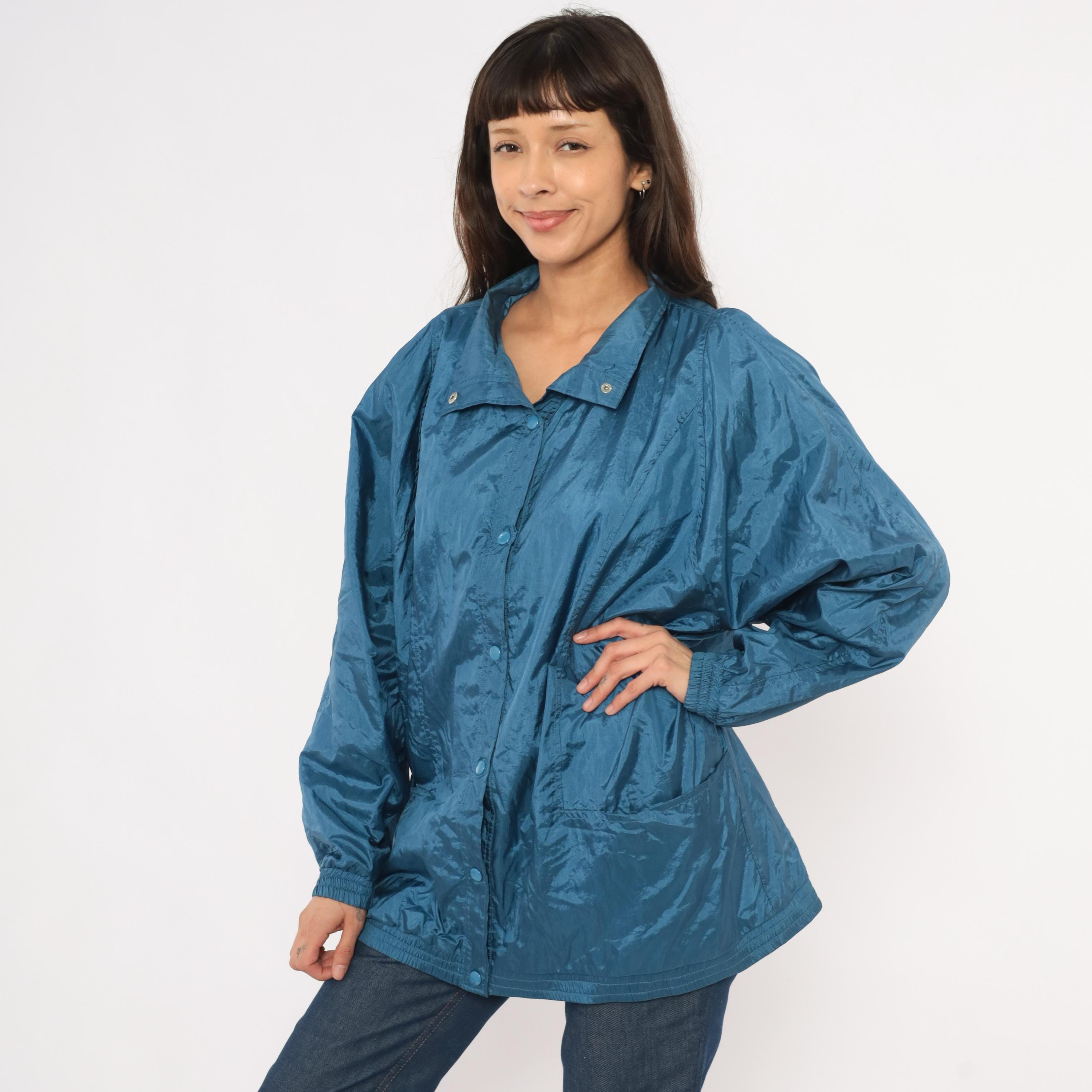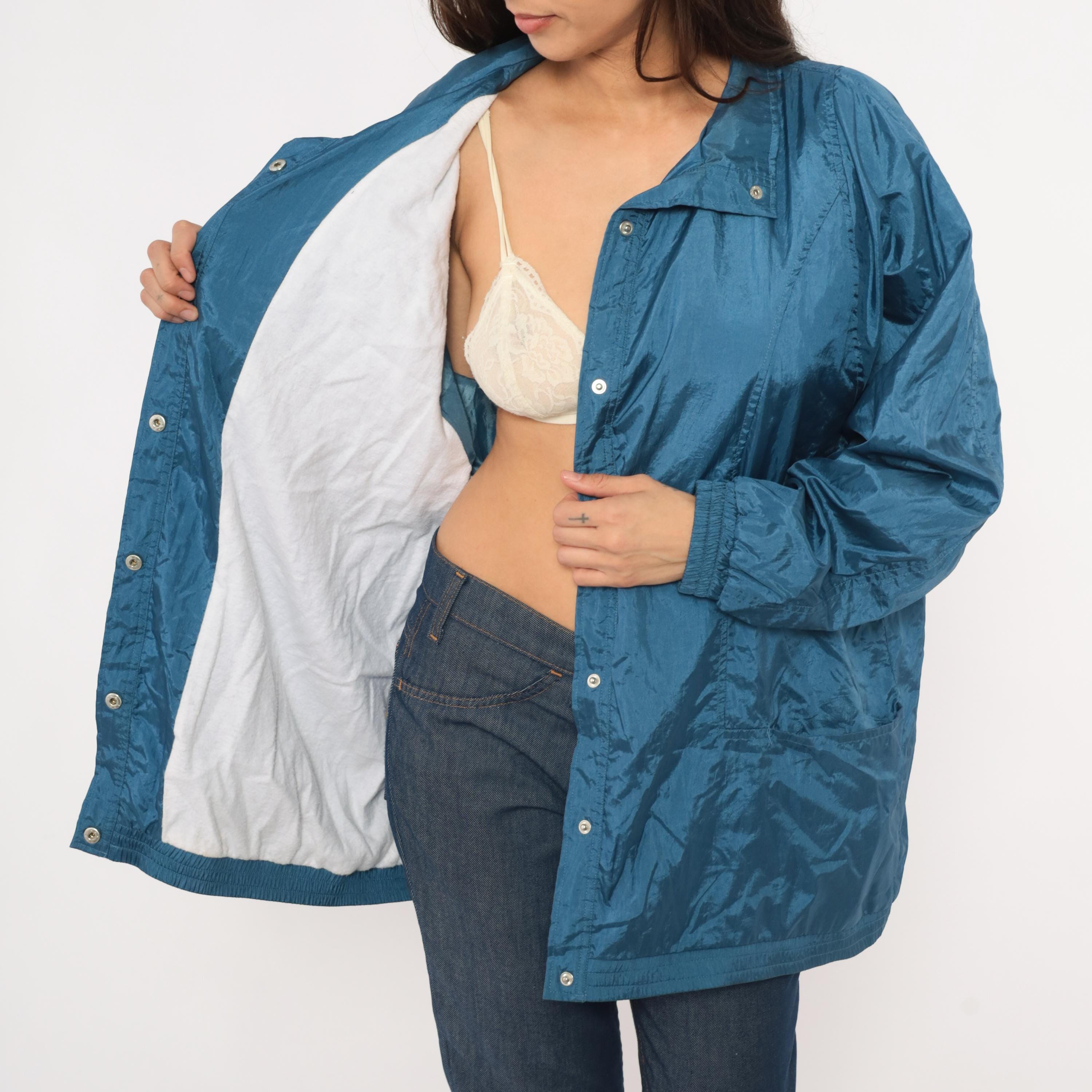 80s coach jacket from Tudor Court in a steel blue tone with snap button front closure and fold-down collar. White cotton lining throughout the body, elasticized cuffs, and elasticized hem. Two slanted waist pockets on either side of the front.