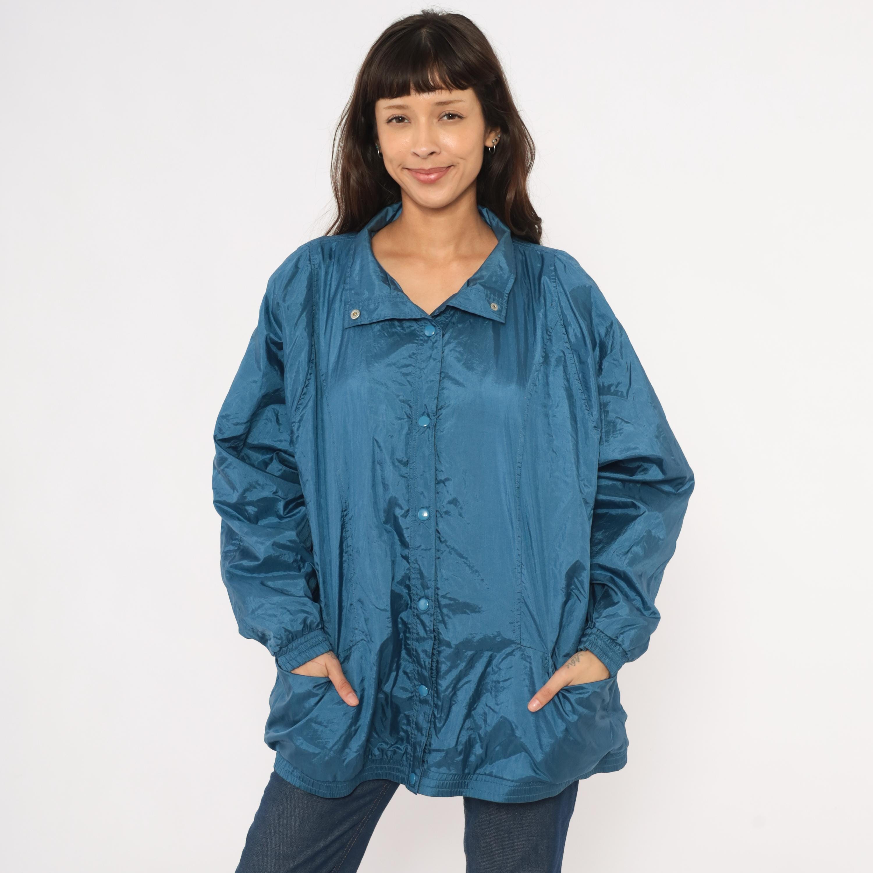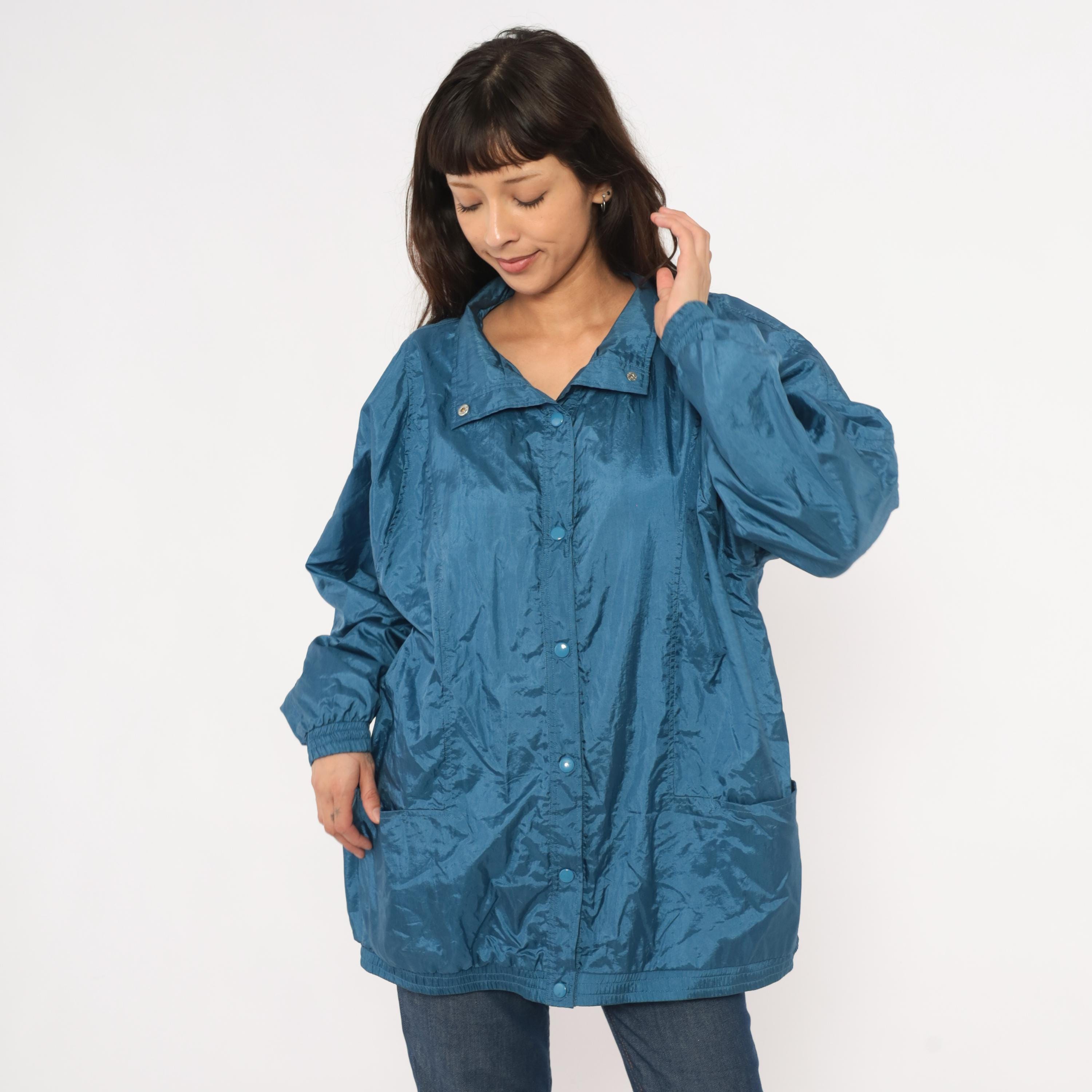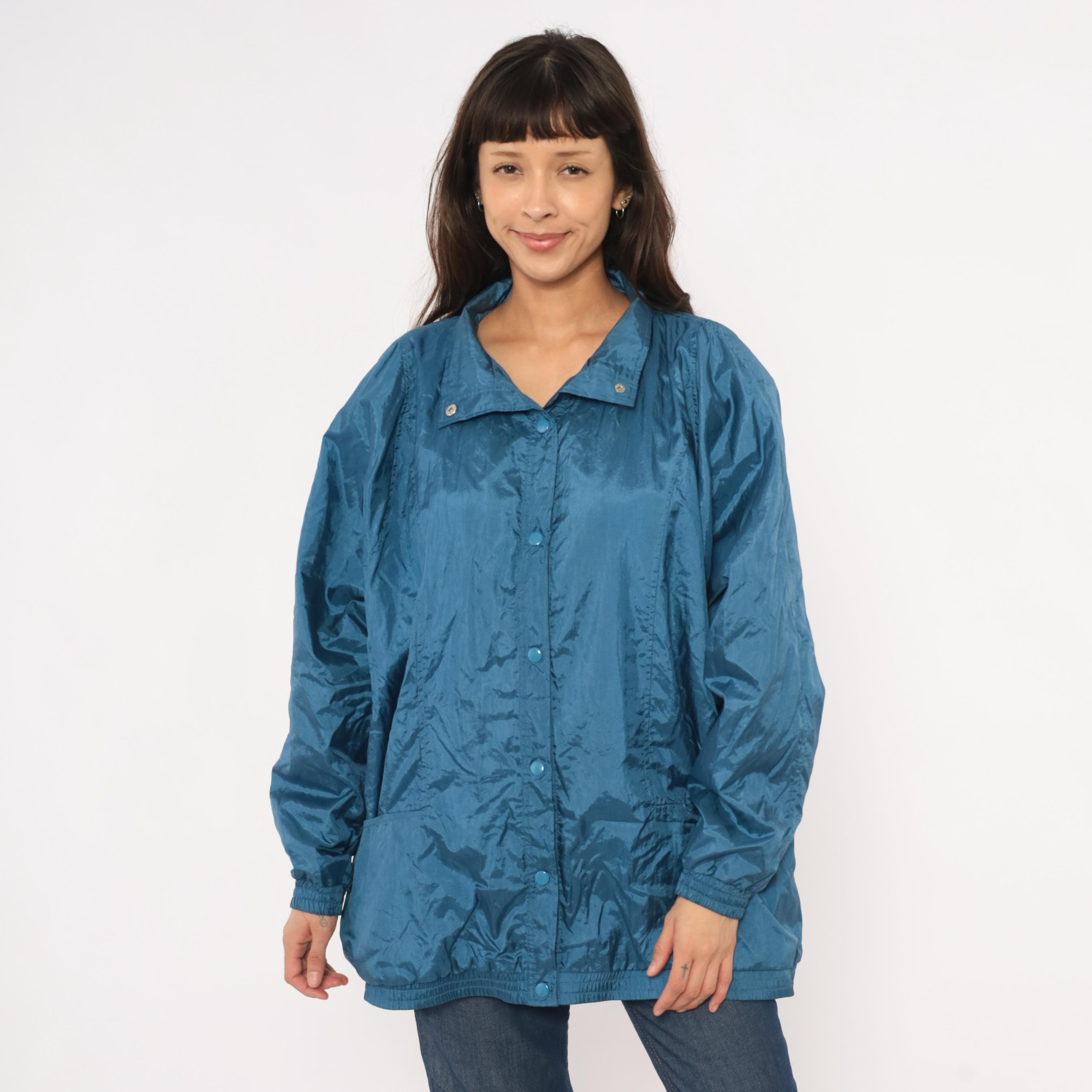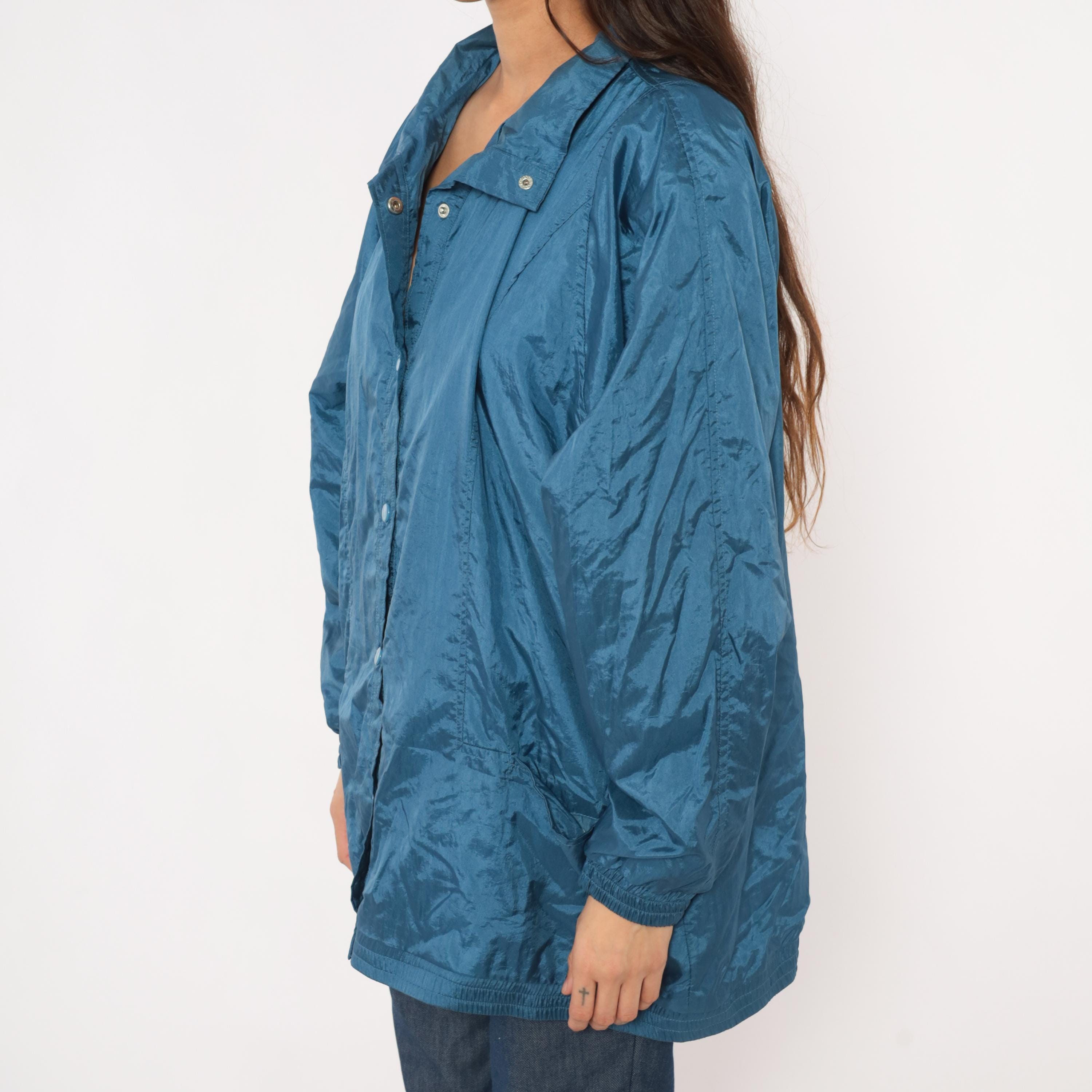 80s coach jacket from Tudor Court in a steel blue tone with snap button front closure and fold-down collar. White cotton lining throughout the body, elasticized cuffs, and elasticized hem. Two slanted waist pockets on either side of the front.