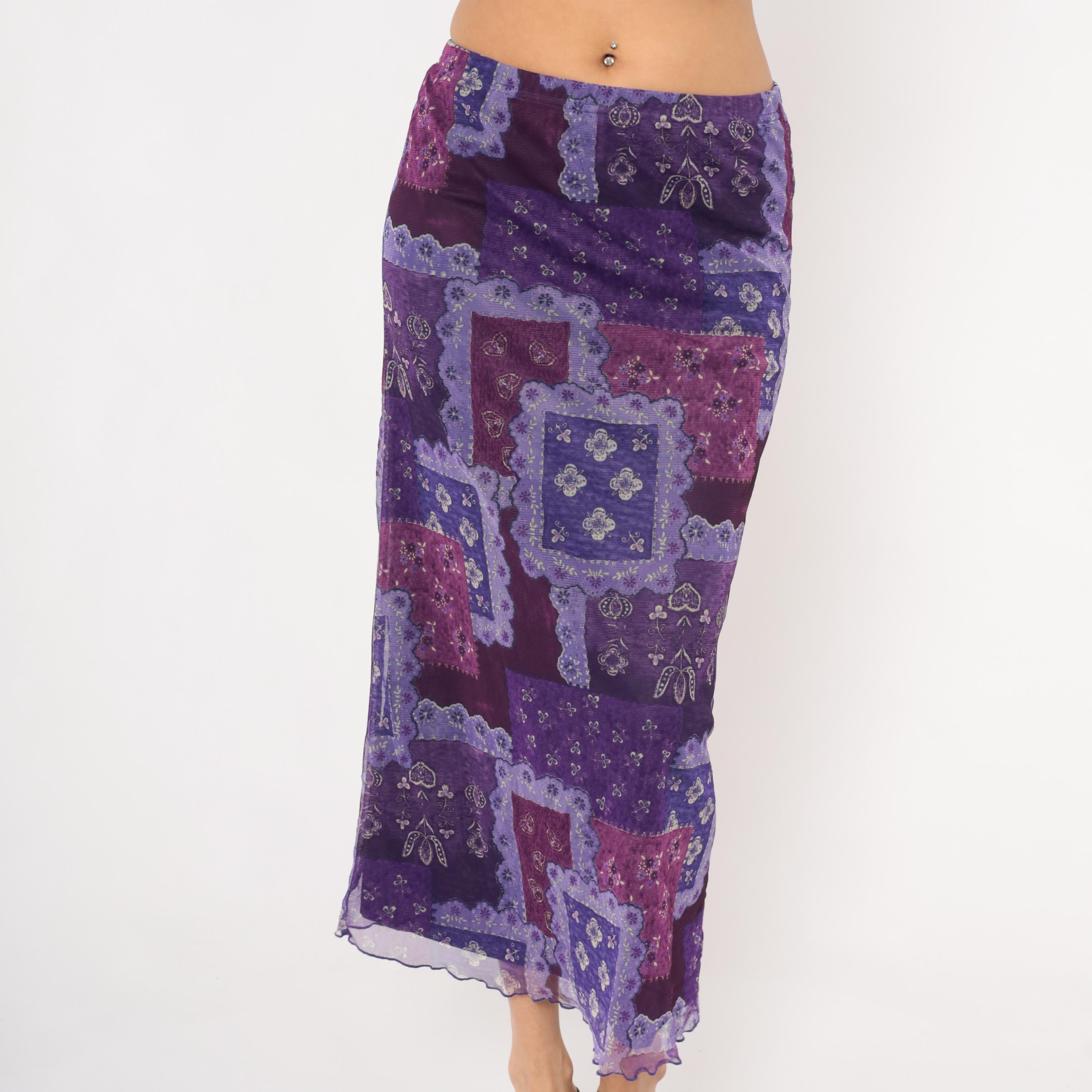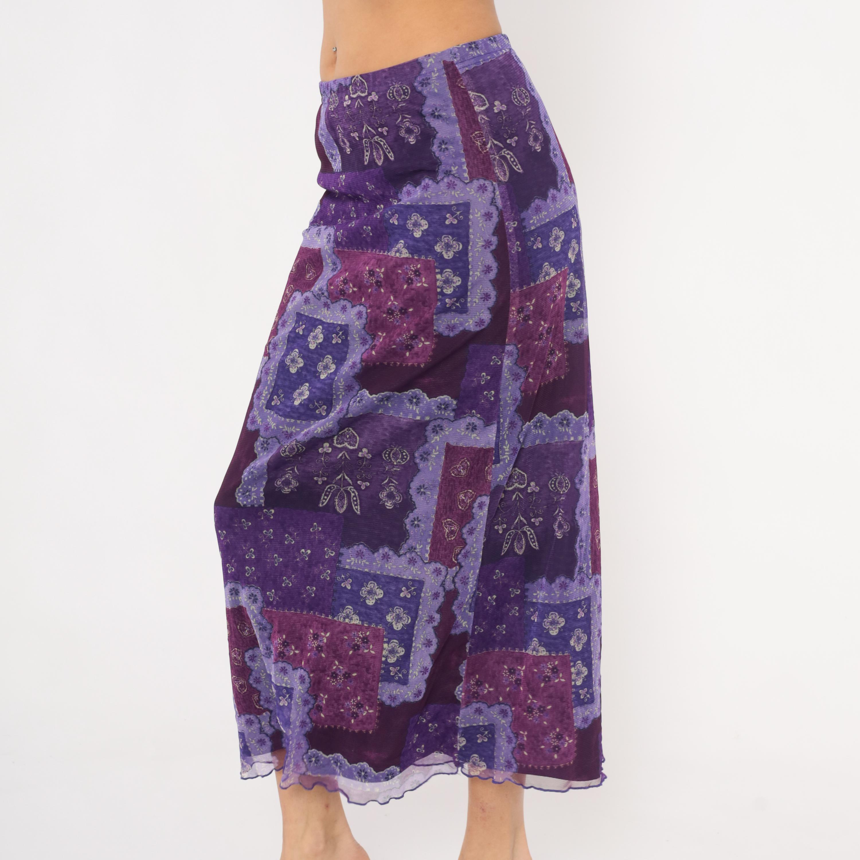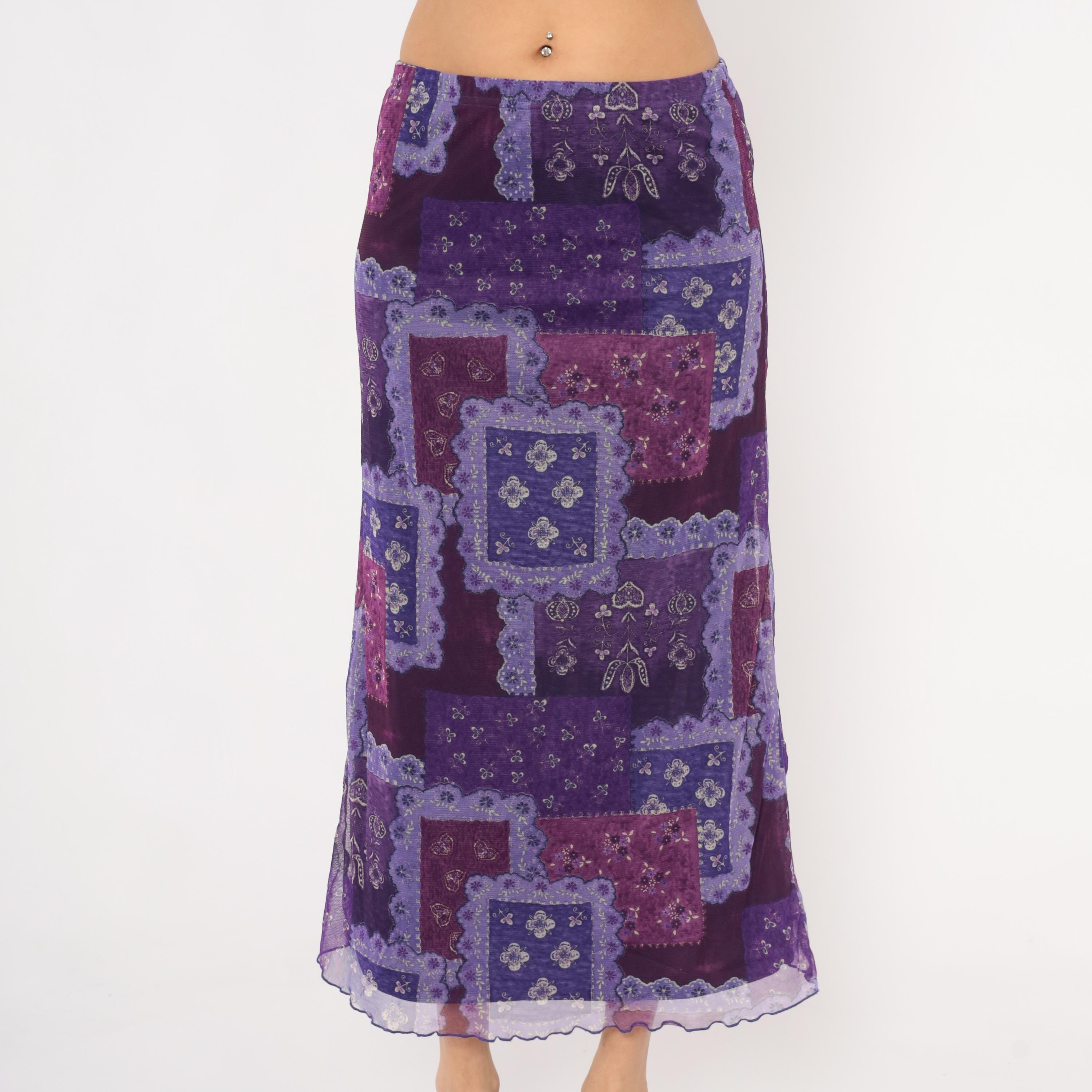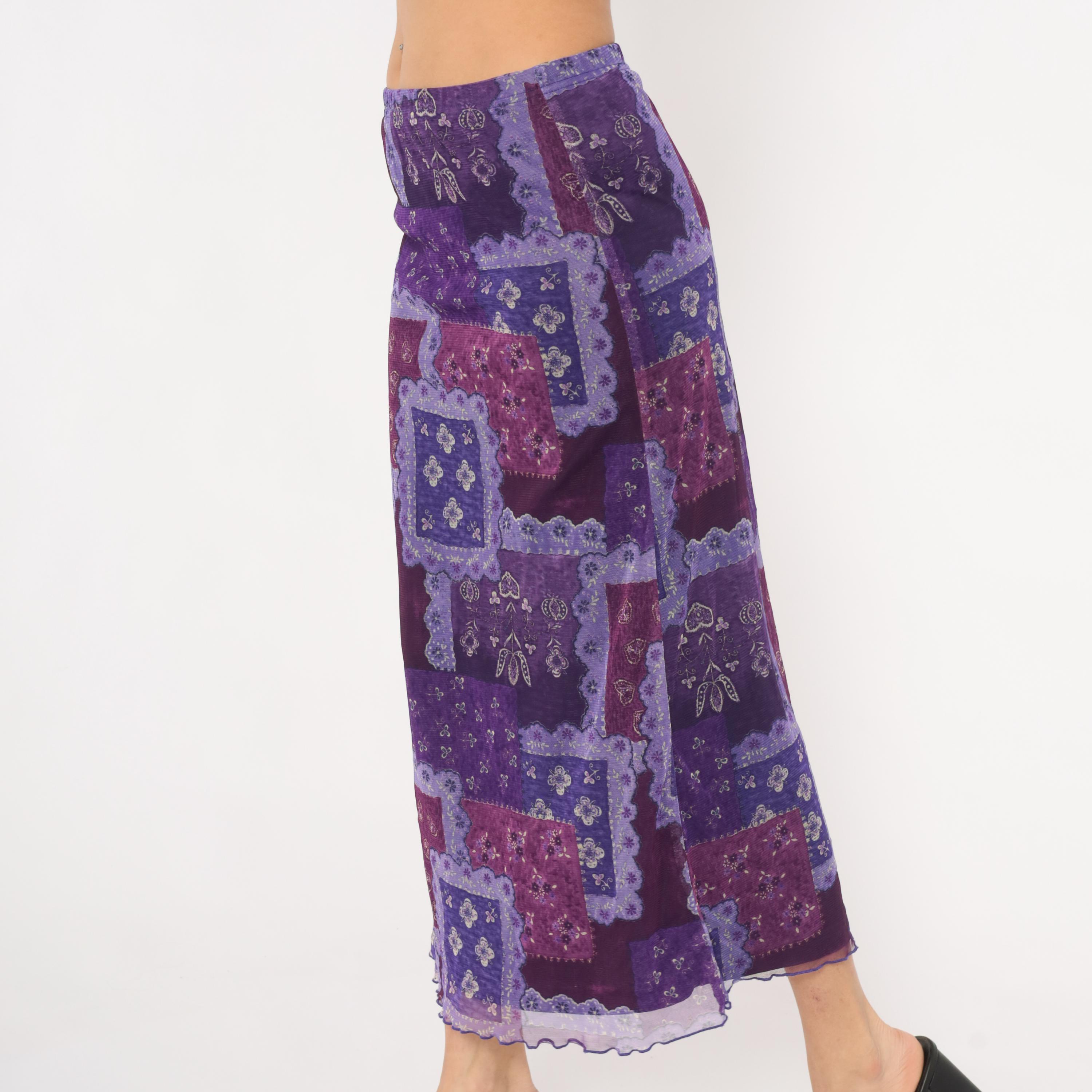90s purple patchwork-print maxi skirt from Zoey with a bandana-inspired pattern in layered shades of violet, lavender, plum, and magenta. Sheer mesh overlay with a lettuce-edge hem and elastic waistband.